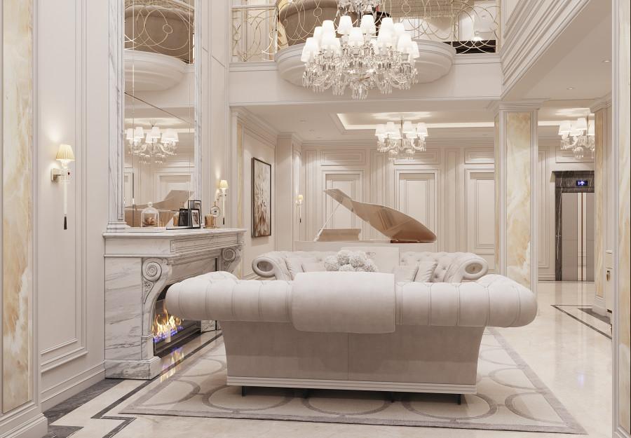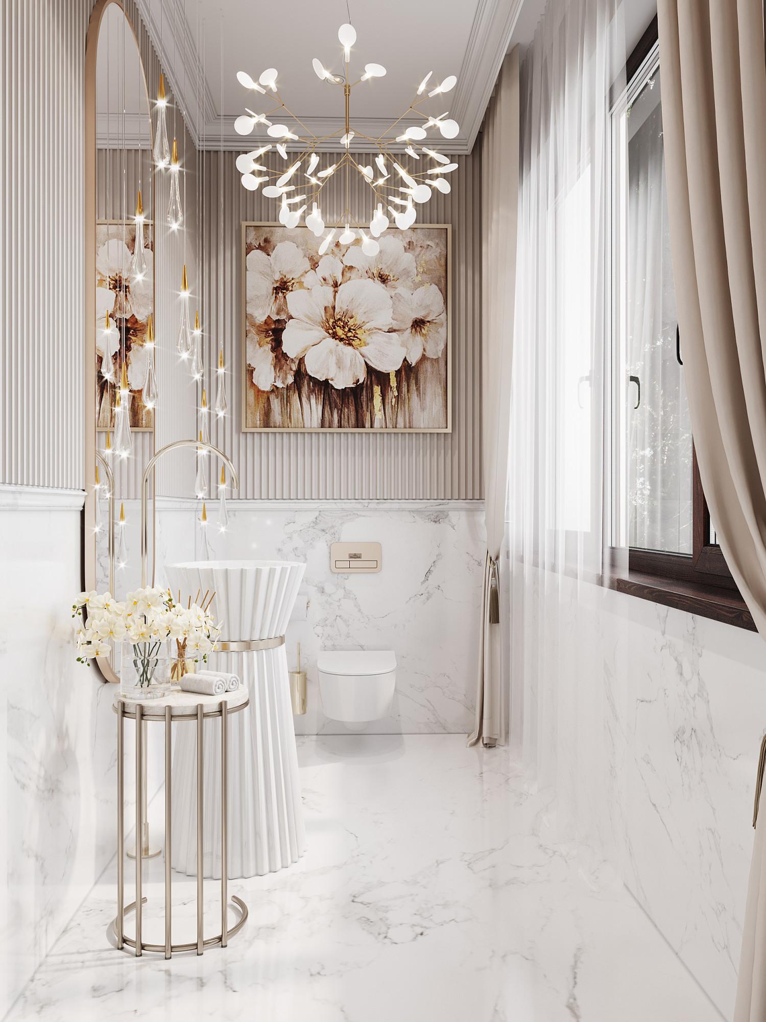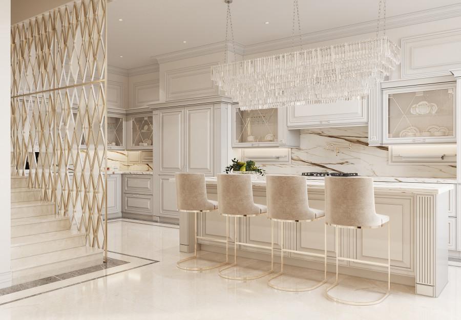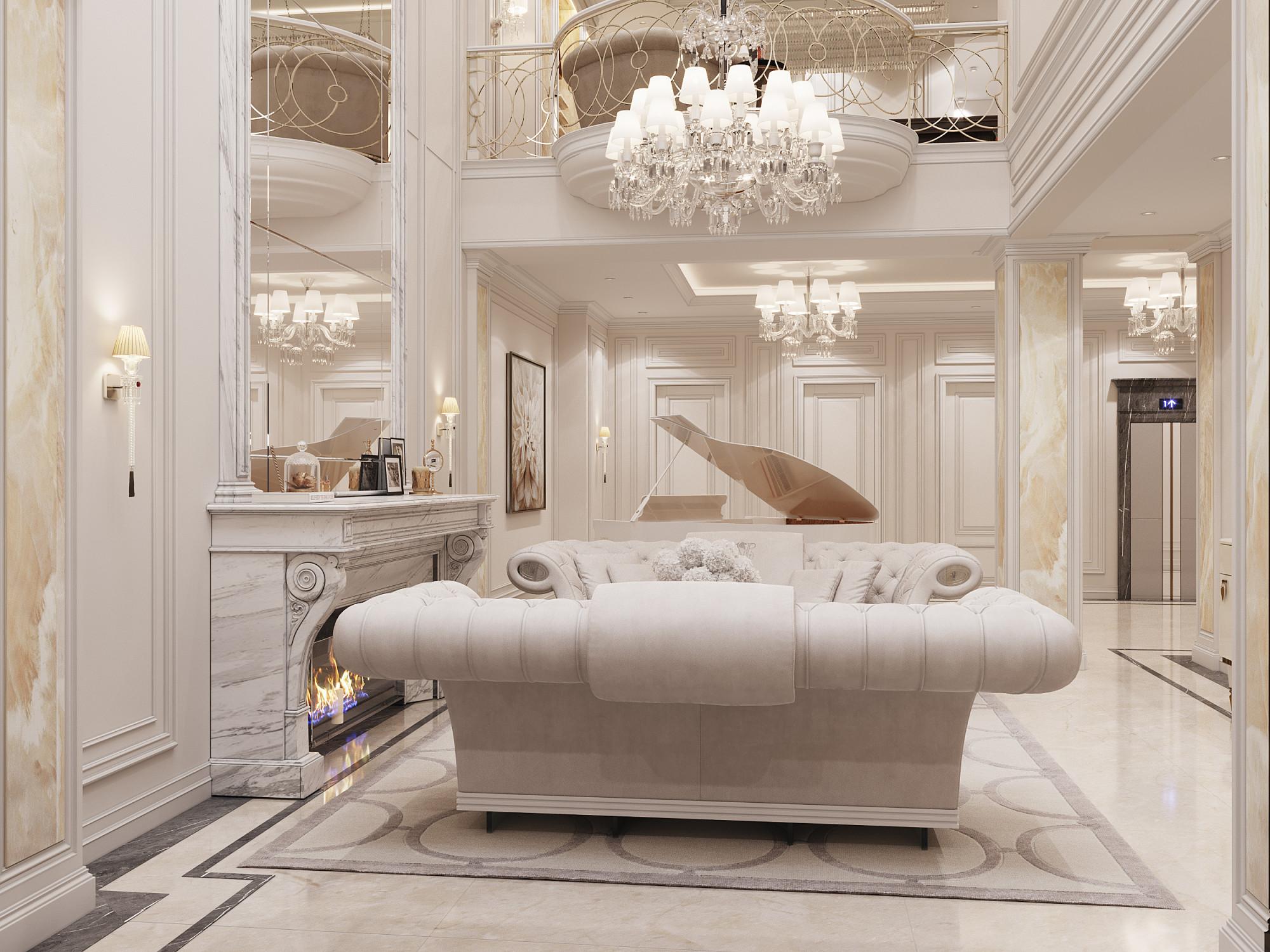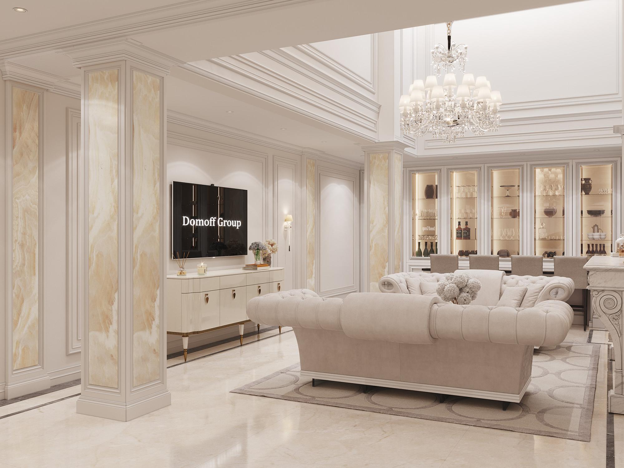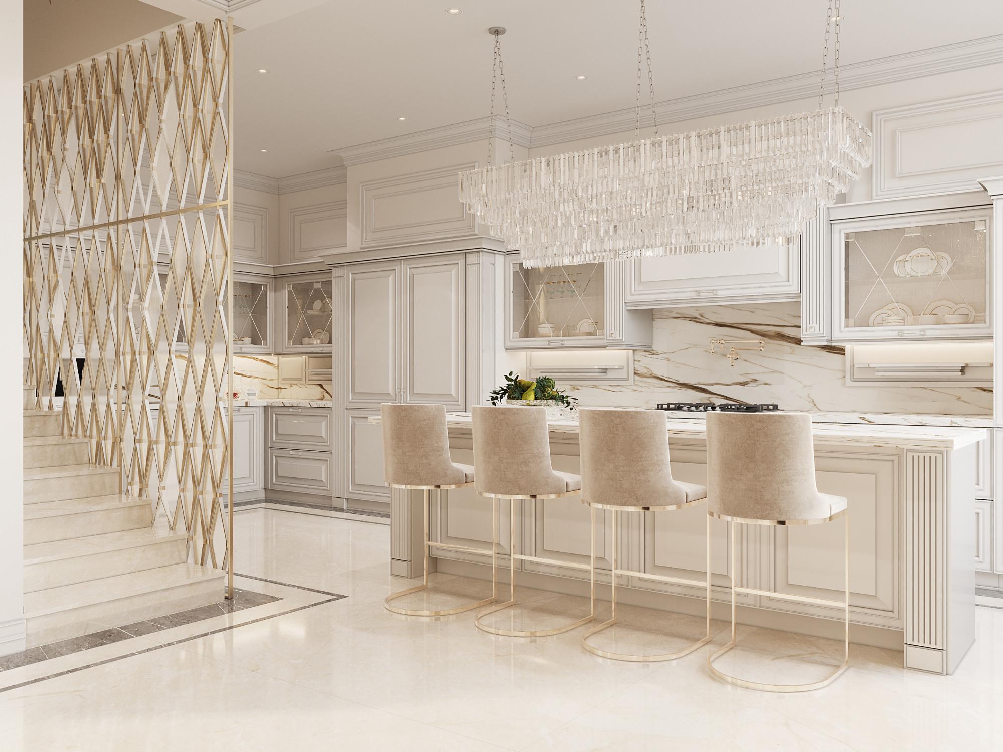Интерьер дома выполнен в стиле неоклассика, что видно по изысканным деталям и нейтральной цветовой гамме. Основные материалы включают мрамор, который используется для отделки стен и пола, создавая ощущение роскоши и элегантности. Мебель в светлых тонах с удобной посадкой обеспечивает комфорт, а декоративные подушки и текстиль добавляют уюта. Освещение в комнатах продумано до мелочей: настенные бра, люстры и торшеры сделали пространство еще более эффектным. Интерьер привлекает балансом между красотой и практичностью, а также способностью создавать атмосферу роскоши и уюта одновременно.