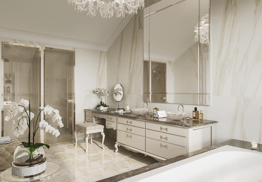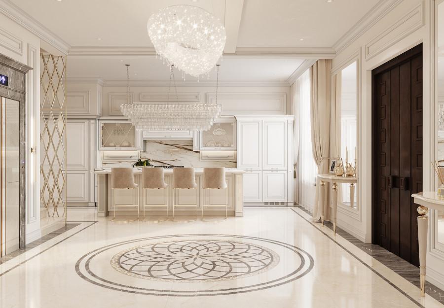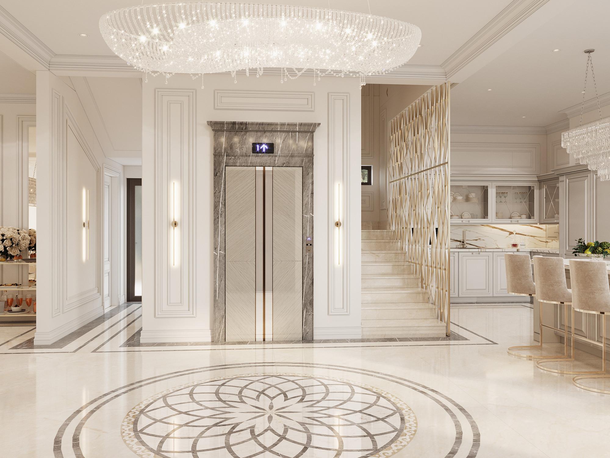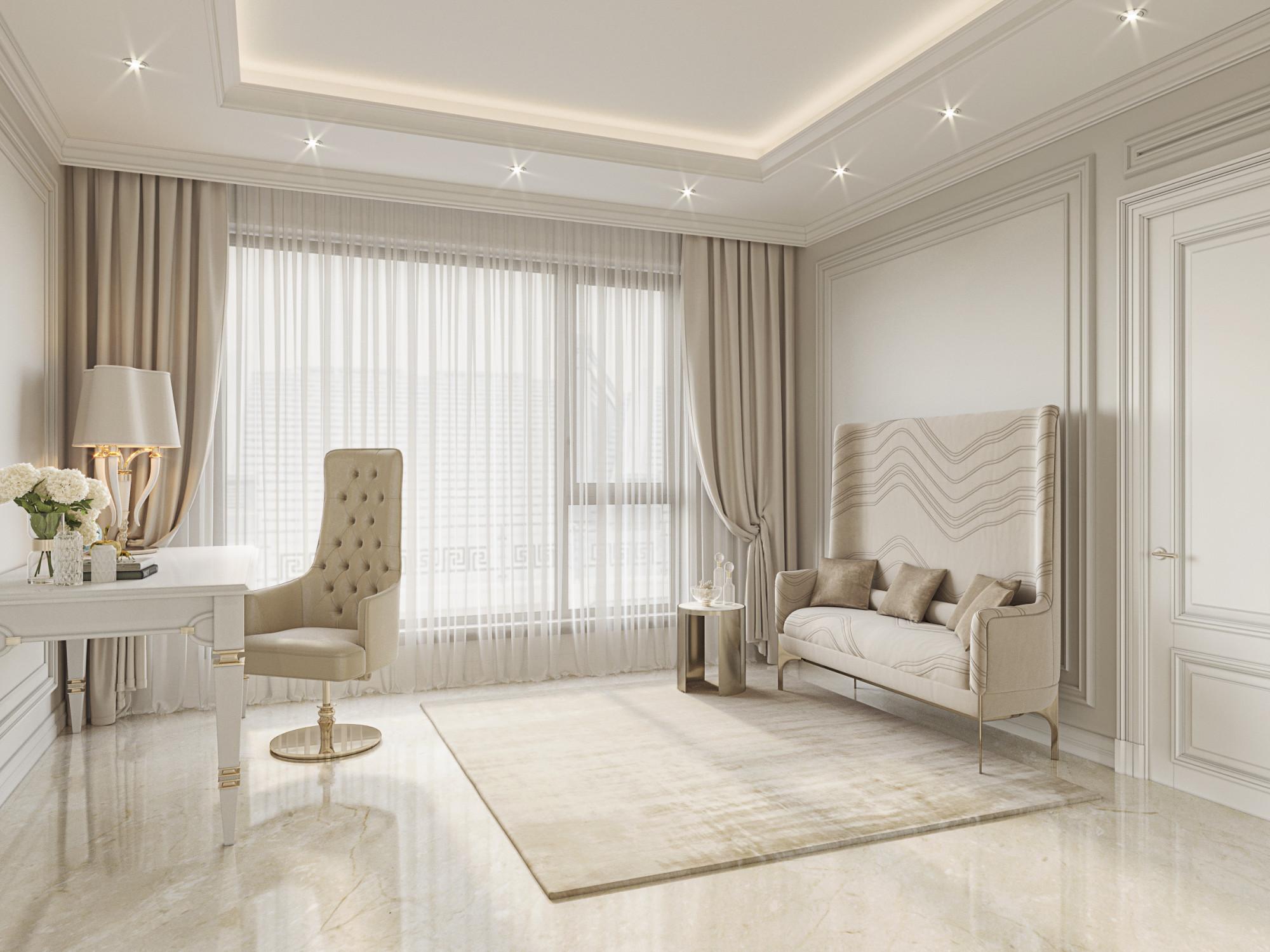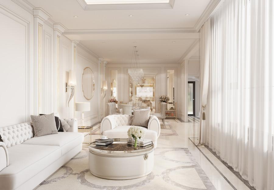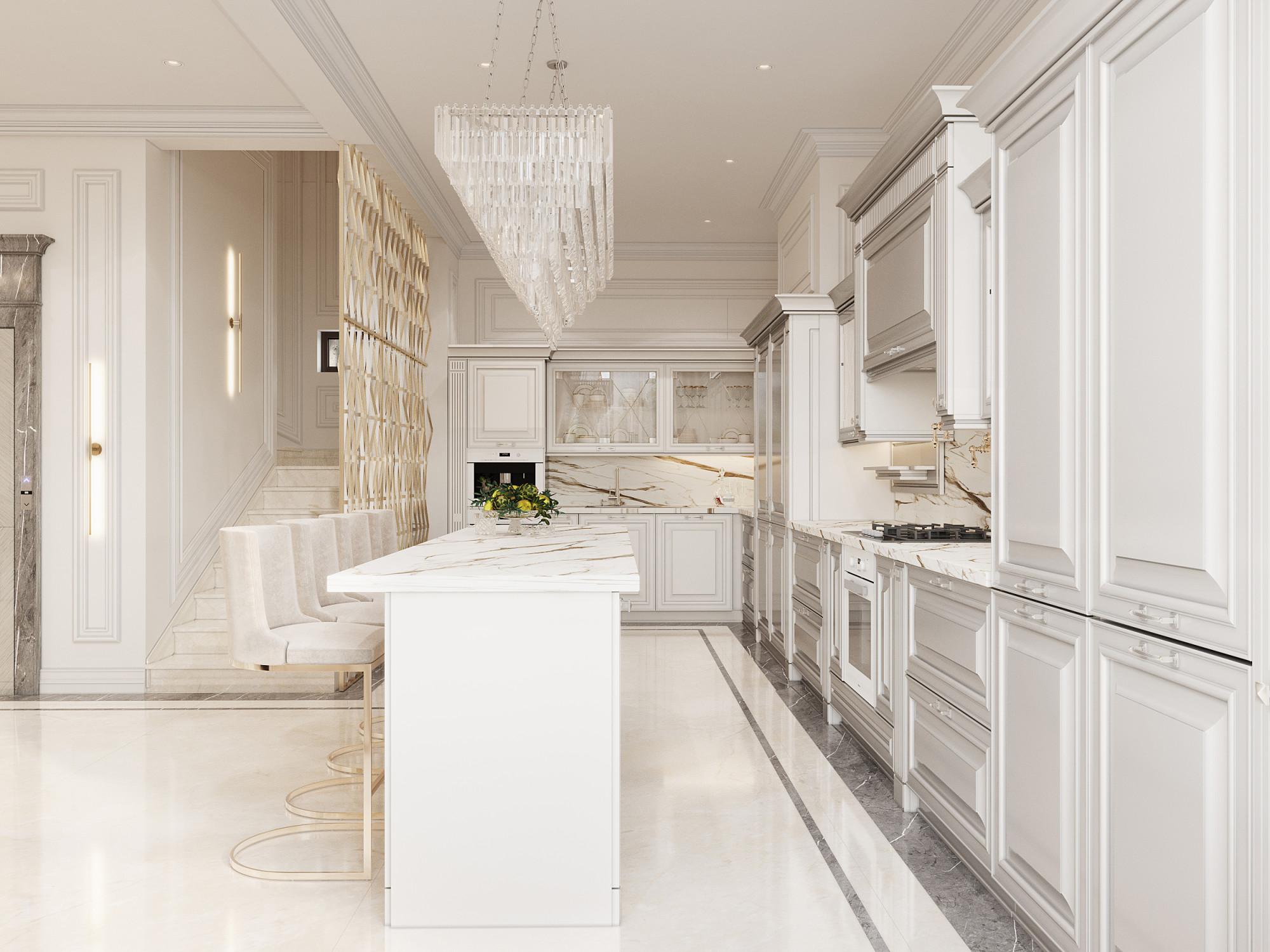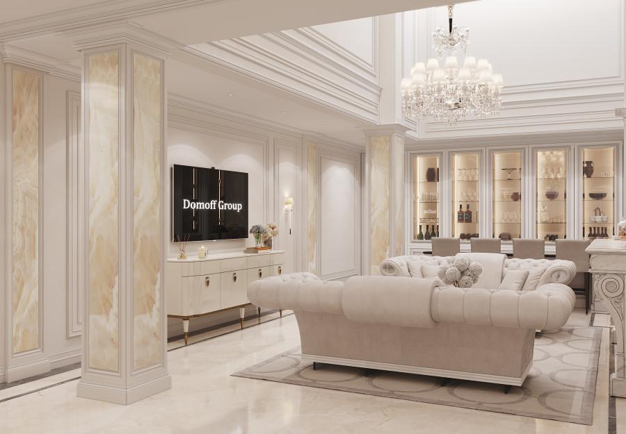 Интерьер дома выполнен в стиле неоклассика, что видно по изысканным деталям и нейтральной цветовой гамме. Основные материалы включают мрамор, который используется для отделки стен и пола, создавая ощущение роскоши и элегантности. Мебель в светлых тонах с удобной посадкой обеспечивает комфорт, а декоративные подушки и текстиль добавляют уюта. Освещение в комнатах продумано до мелочей: настенные бра, люстры и торшеры сделали пространство еще более эффектным. Интерьер привлекает балансом между красотой и практичностью, а также способностью создавать атмосферу роскоши и уюта одновременно.