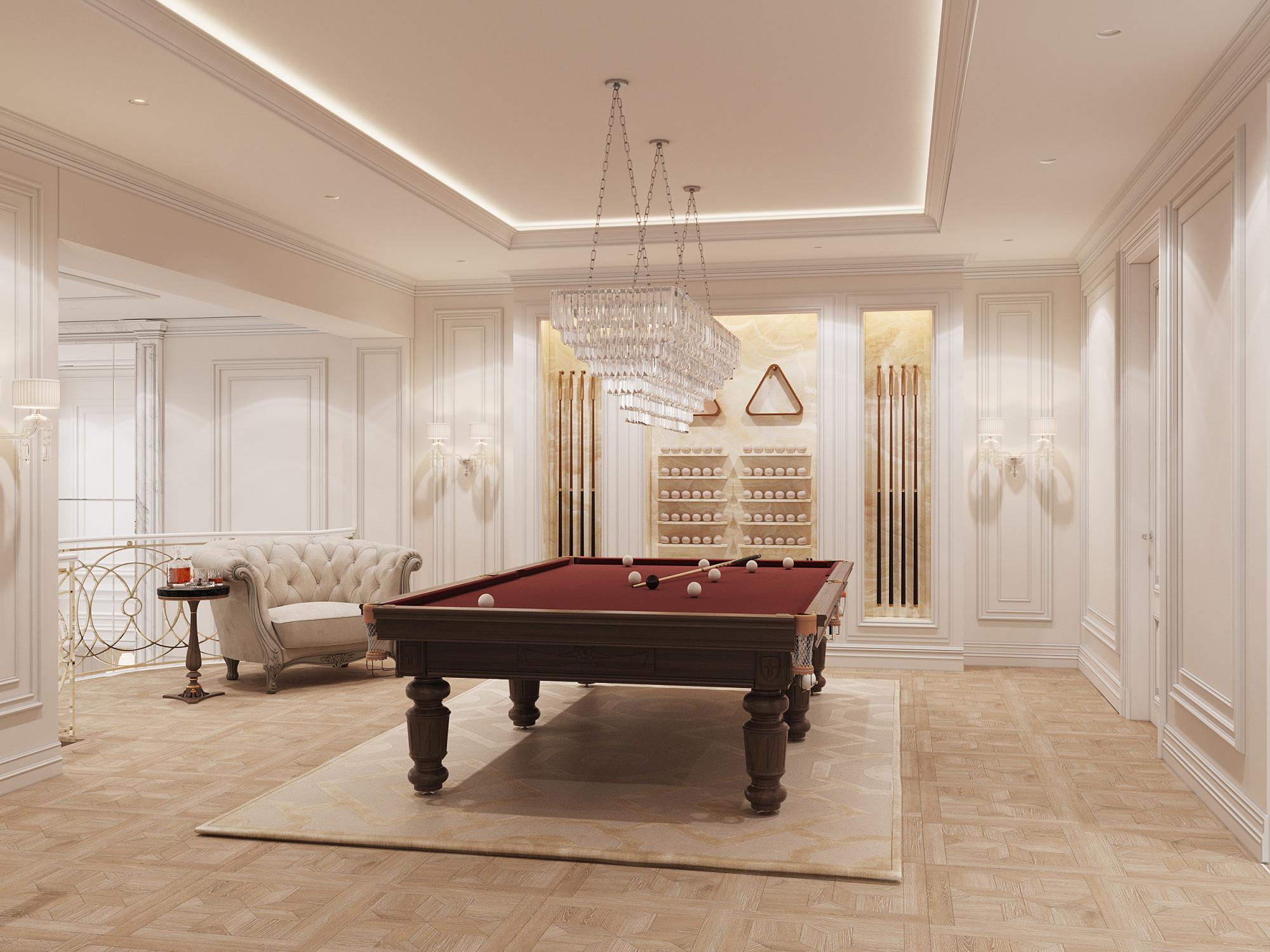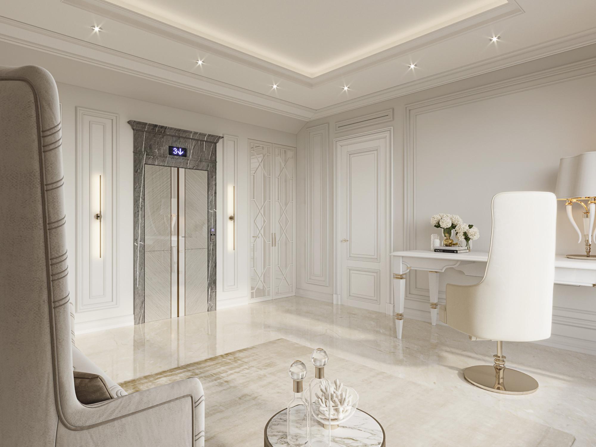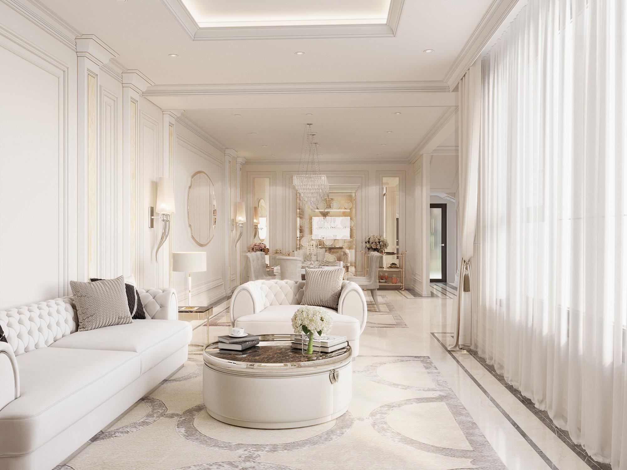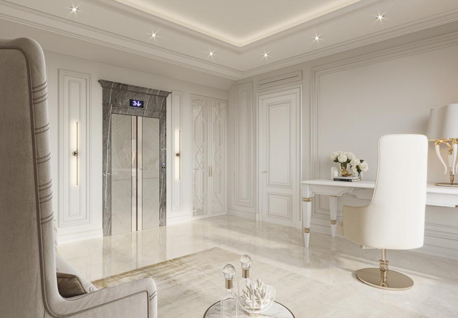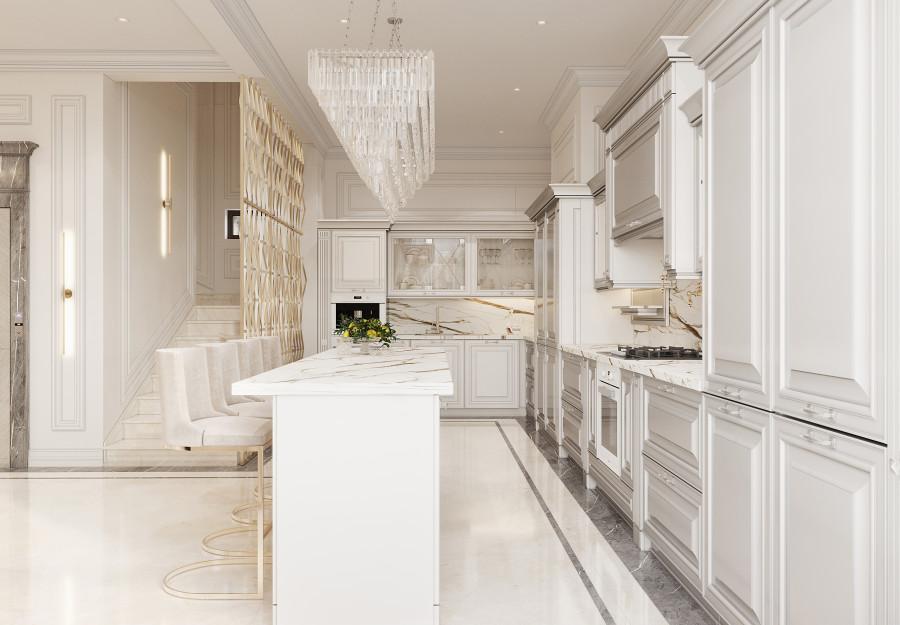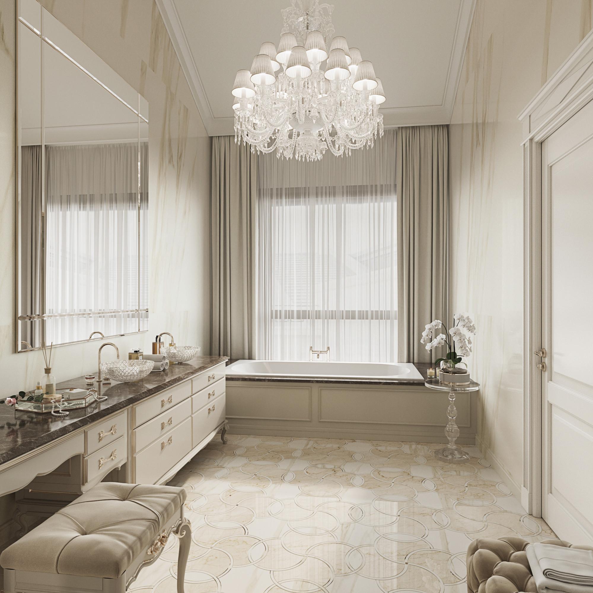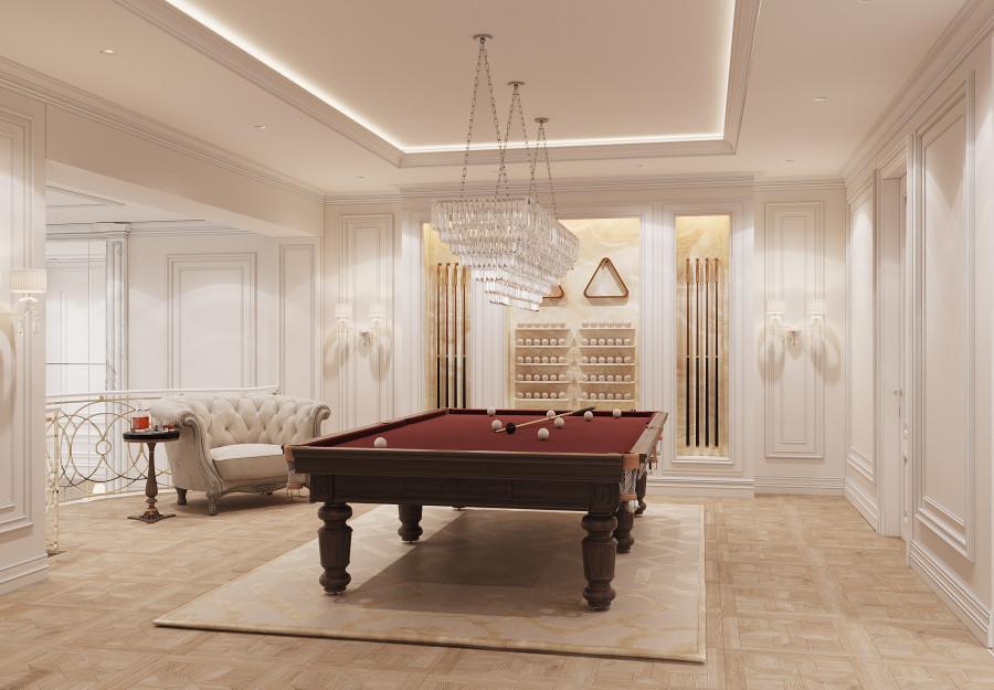 Интерьер дома выполнен в стиле неоклассика, что видно по изысканным деталям и нейтральной цветовой гамме. Основные материалы включают мрамор, который используется для отделки стен и пола, создавая ощущение роскоши и элегантности. Мебель в светлых тонах с удобной посадкой обеспечивает комфорт, а декоративные подушки и текстиль добавляют уюта. Освещение в комнатах продумано до мелочей: настенные бра, люстры и торшеры сделали пространство еще более эффектным. Интерьер привлекает балансом между красотой и практичностью, а также способностью создавать атмосферу роскоши и уюта одновременно.
