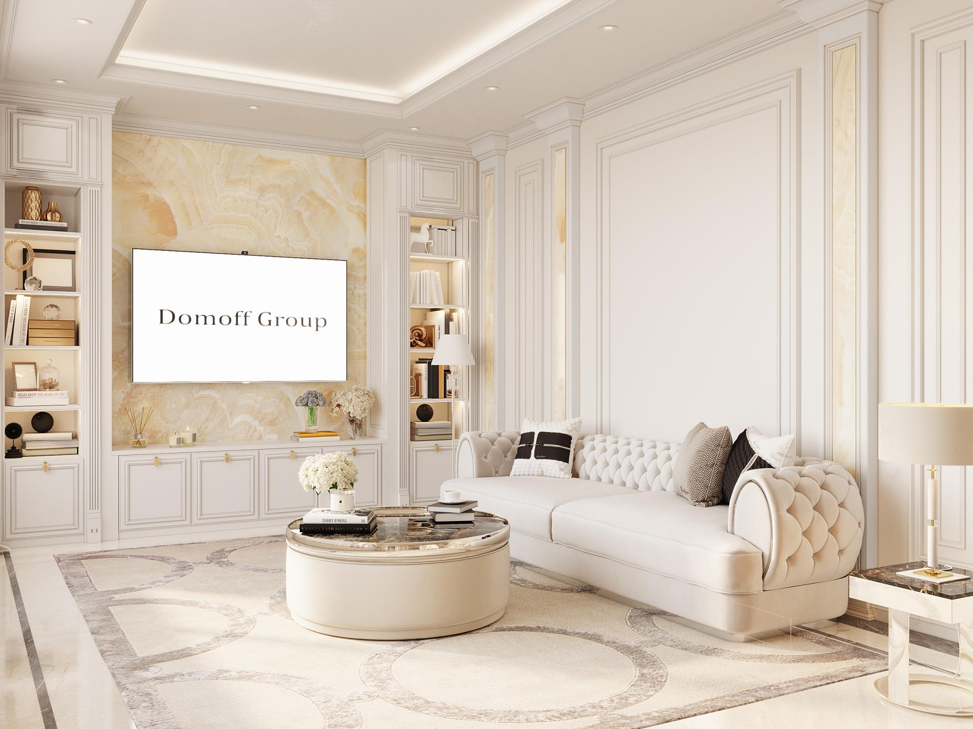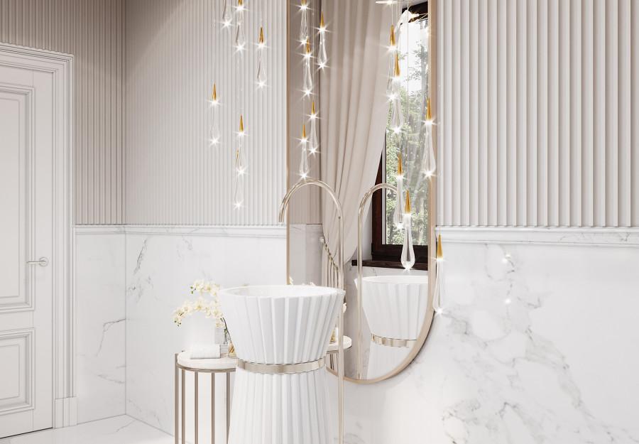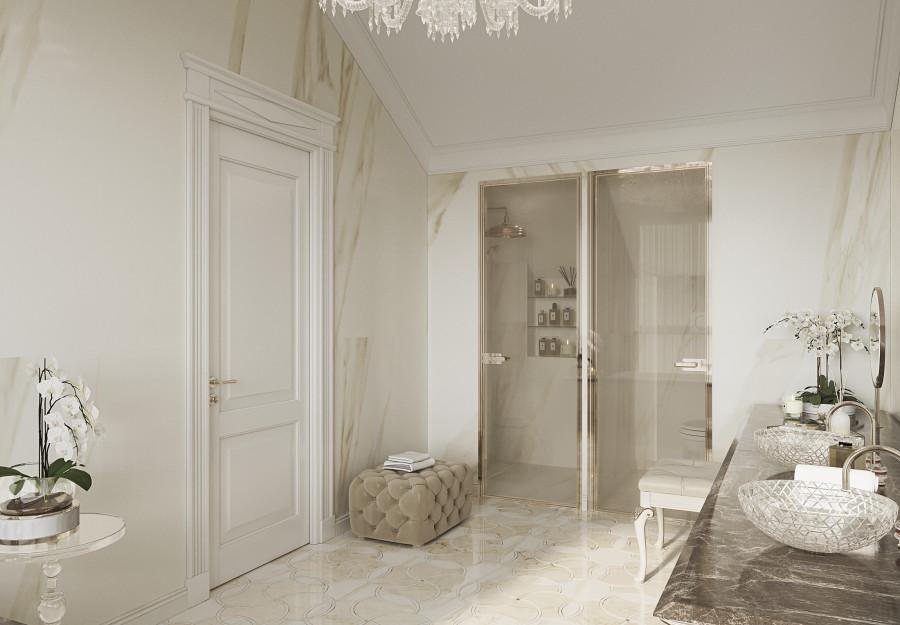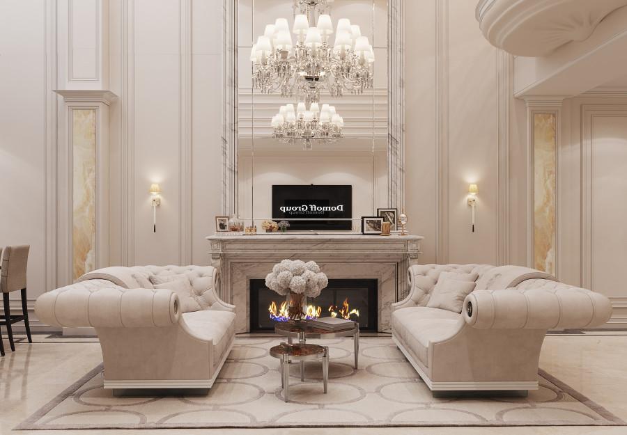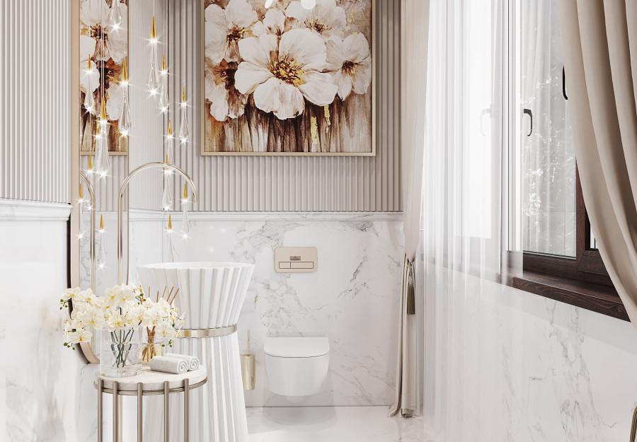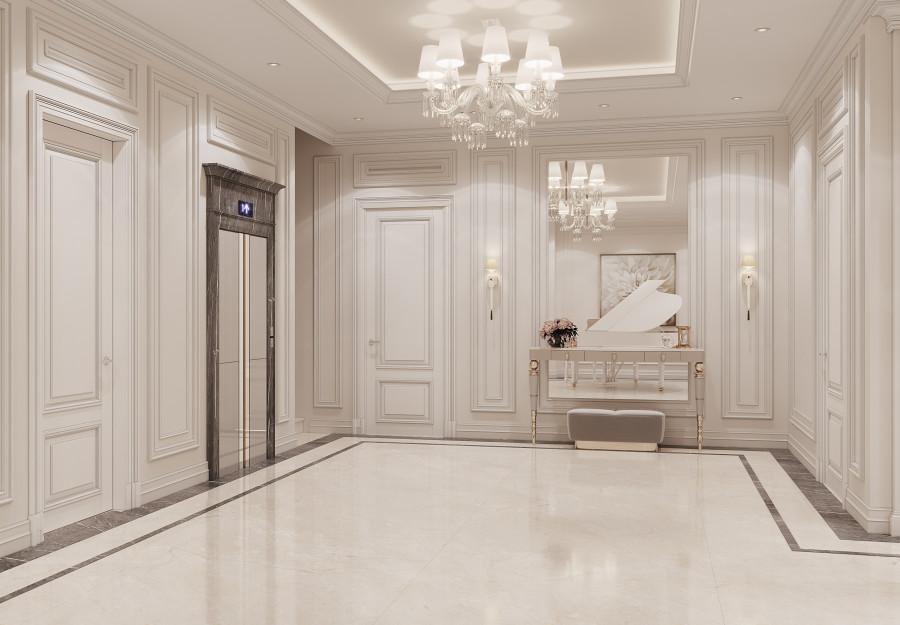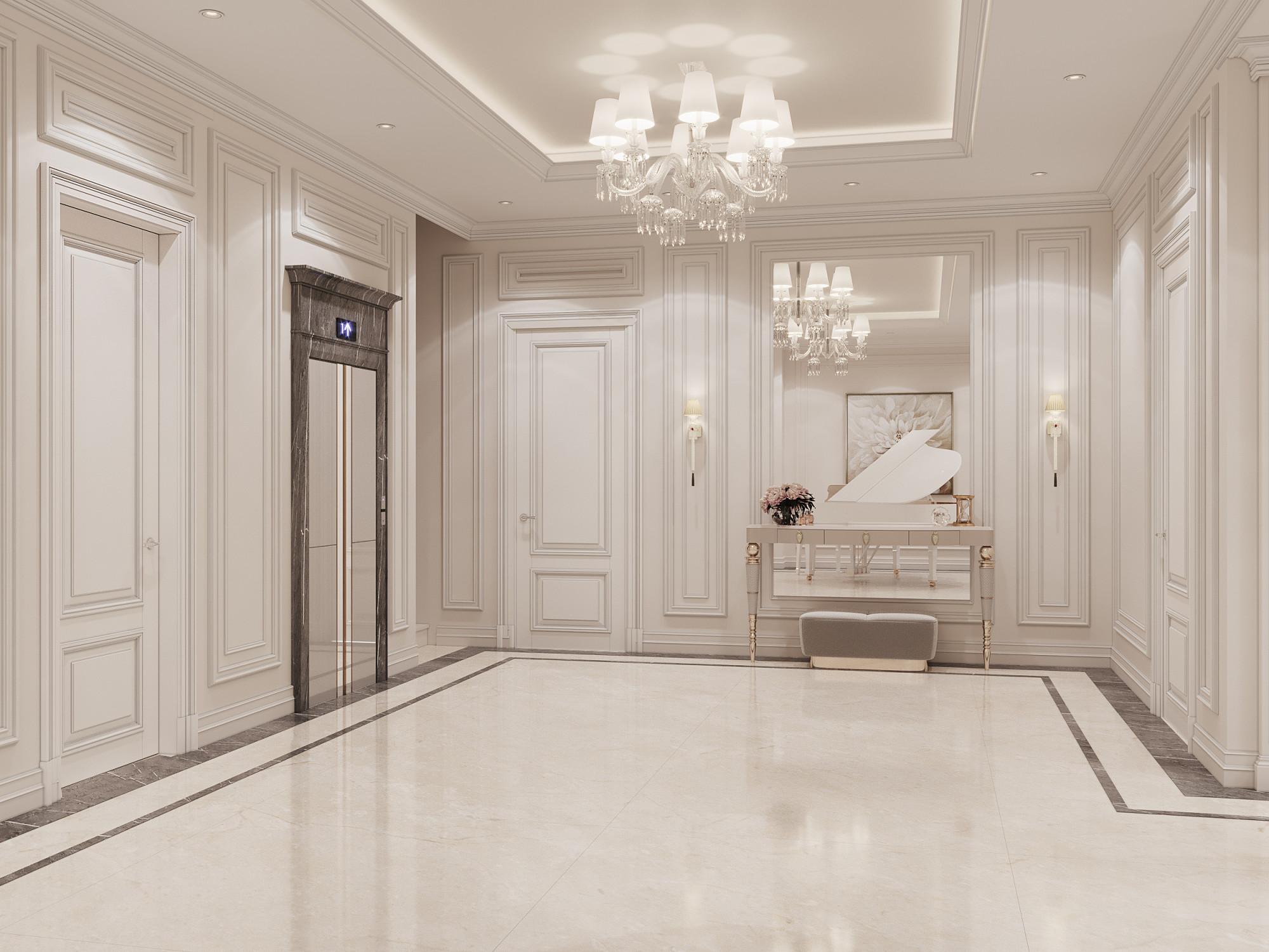 Интерьер дома выполнен в стиле неоклассика, что видно по изысканным деталям и нейтральной цветовой гамме. Основные материалы включают мрамор, который используется для отделки стен и пола, создавая ощущение роскоши и элегантности. Мебель в светлых тонах с удобной посадкой обеспечивает комфорт, а декоративные подушки и текстиль добавляют уюта. Освещение в комнатах продумано до мелочей: настенные бра, люстры и торшеры сделали пространство еще более эффектным. Интерьер привлекает балансом между красотой и практичностью, а также способностью создавать атмосферу роскоши и уюта одновременно.