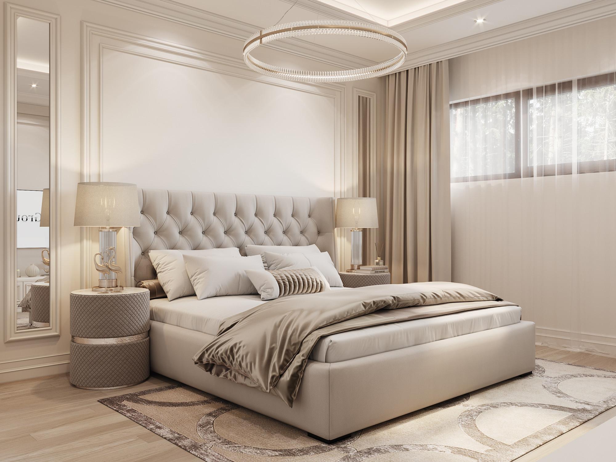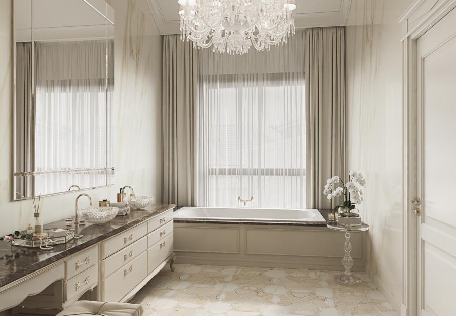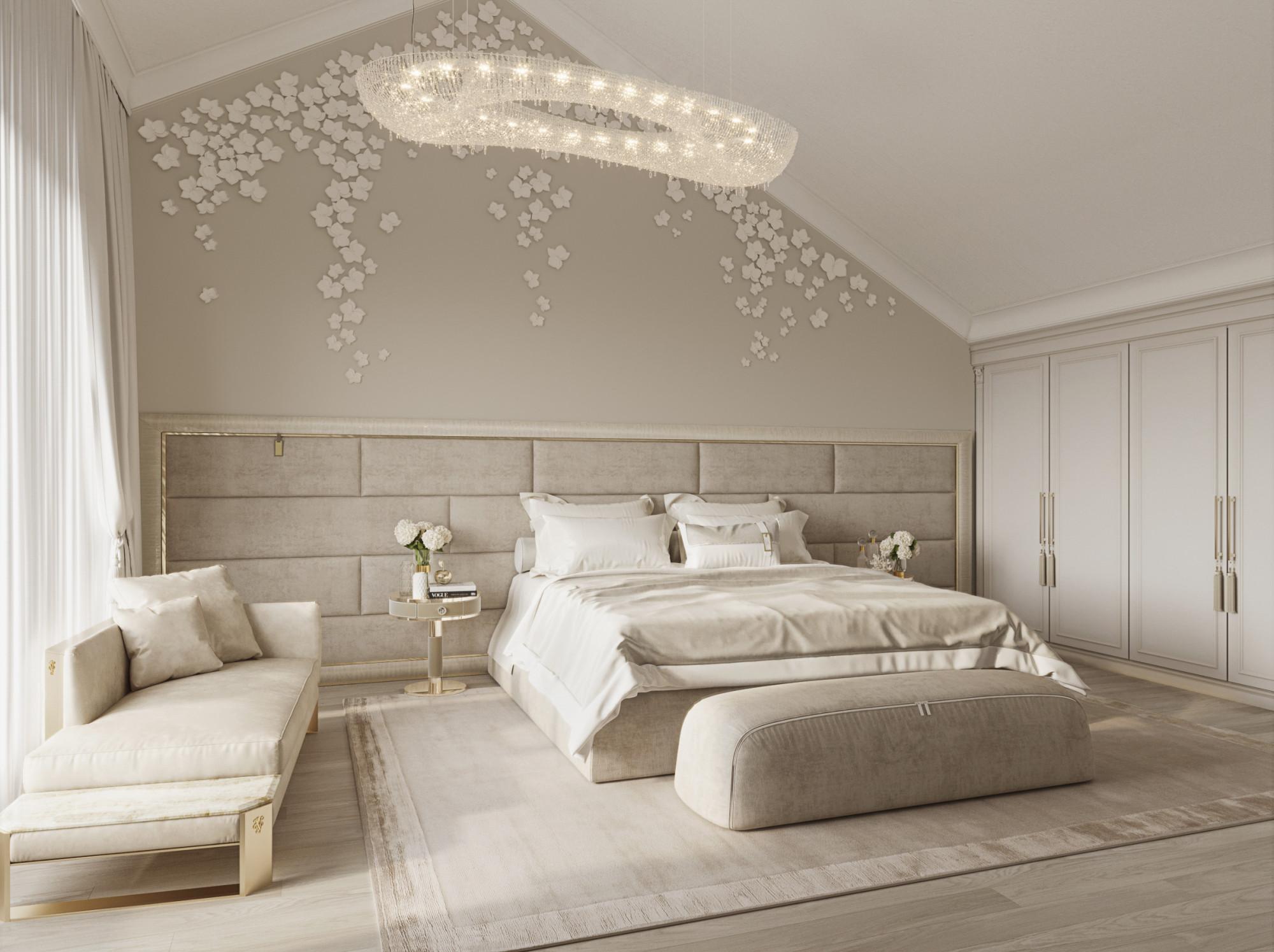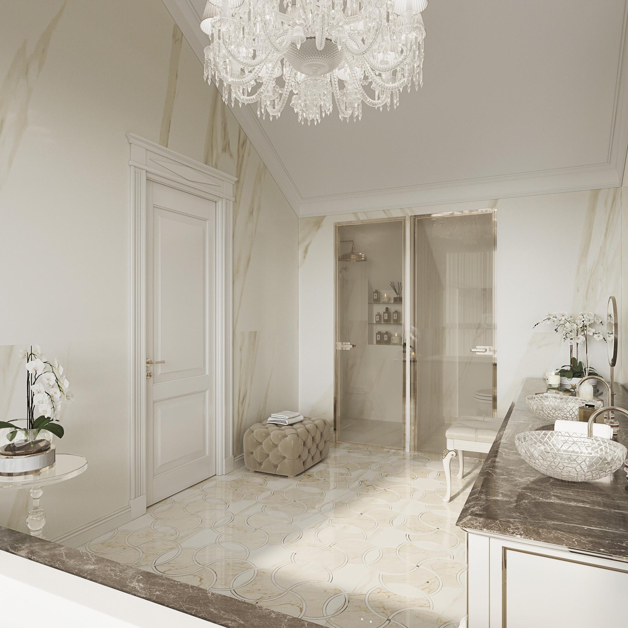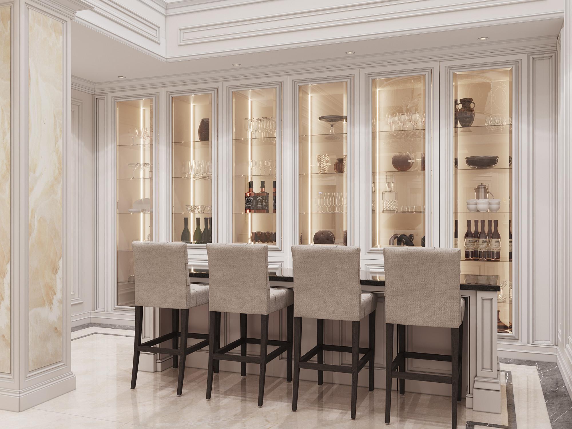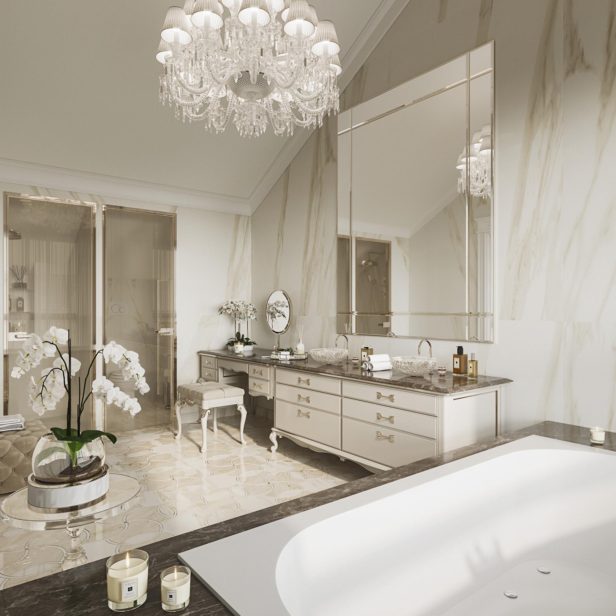 Интерьер дома выполнен в стиле неоклассика, что видно по изысканным деталям и нейтральной цветовой гамме. Основные материалы включают мрамор, который используется для отделки стен и пола, создавая ощущение роскоши и элегантности. Мебель в светлых тонах с удобной посадкой обеспечивает комфорт, а декоративные подушки и текстиль добавляют уюта. Освещение в комнатах продумано до мелочей: настенные бра, люстры и торшеры сделали пространство еще более эффектным. Интерьер привлекает балансом между красотой и практичностью, а также способностью создавать атмосферу роскоши и уюта одновременно.