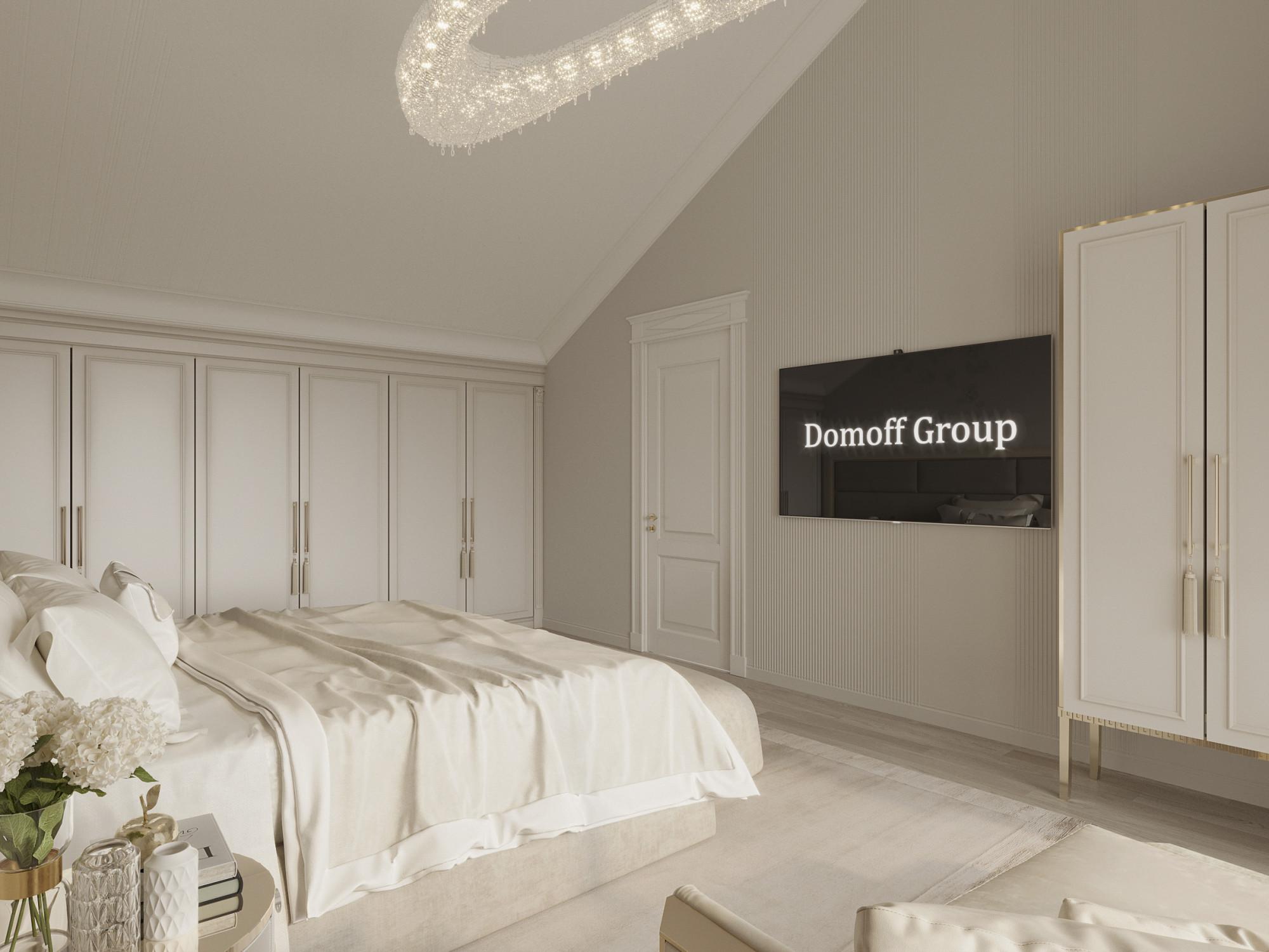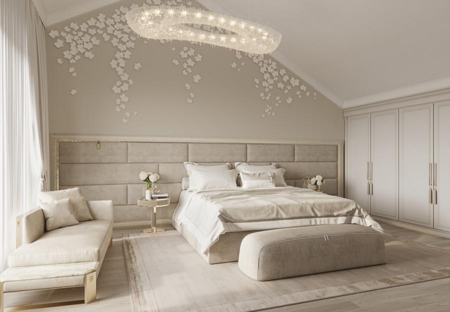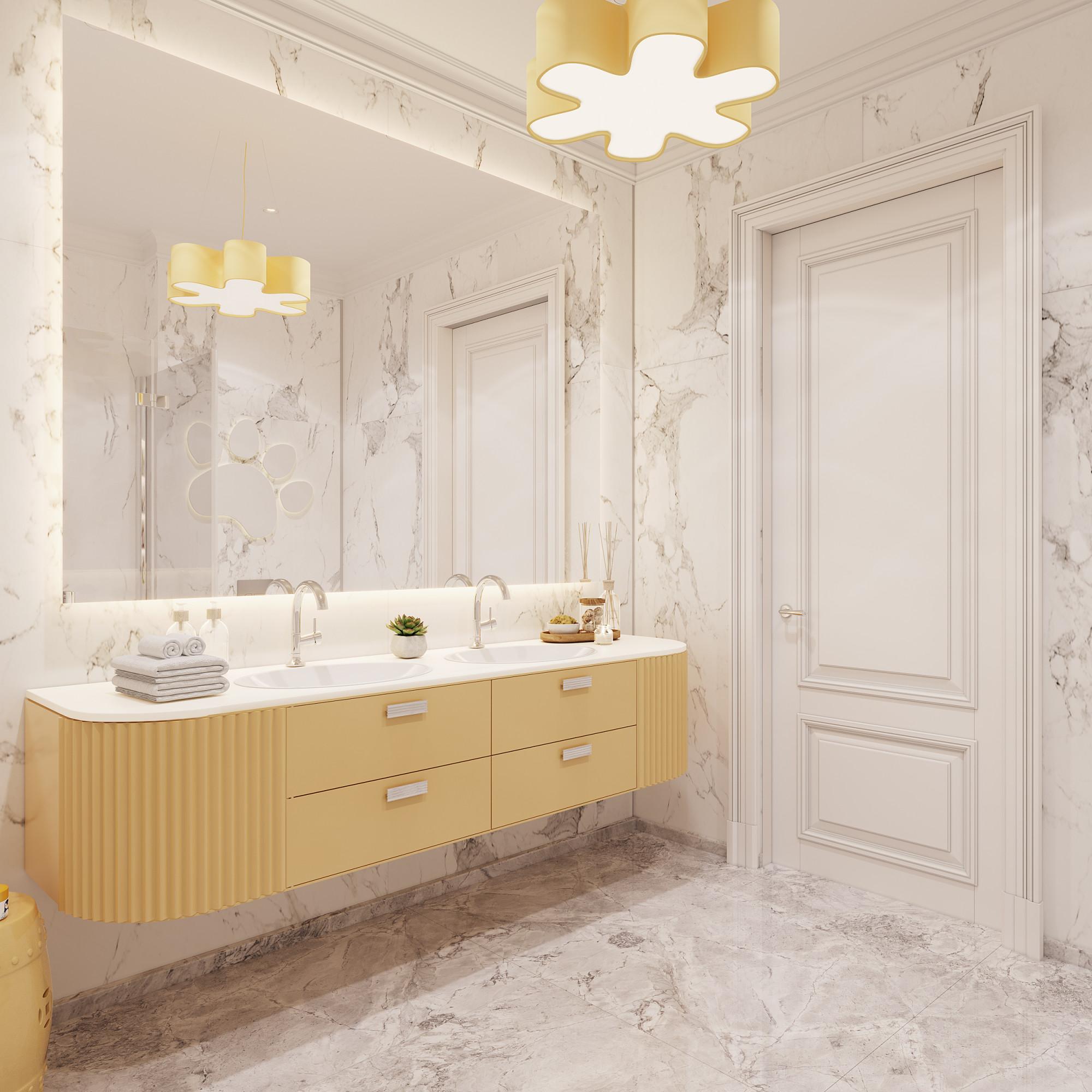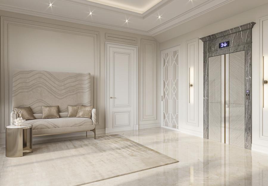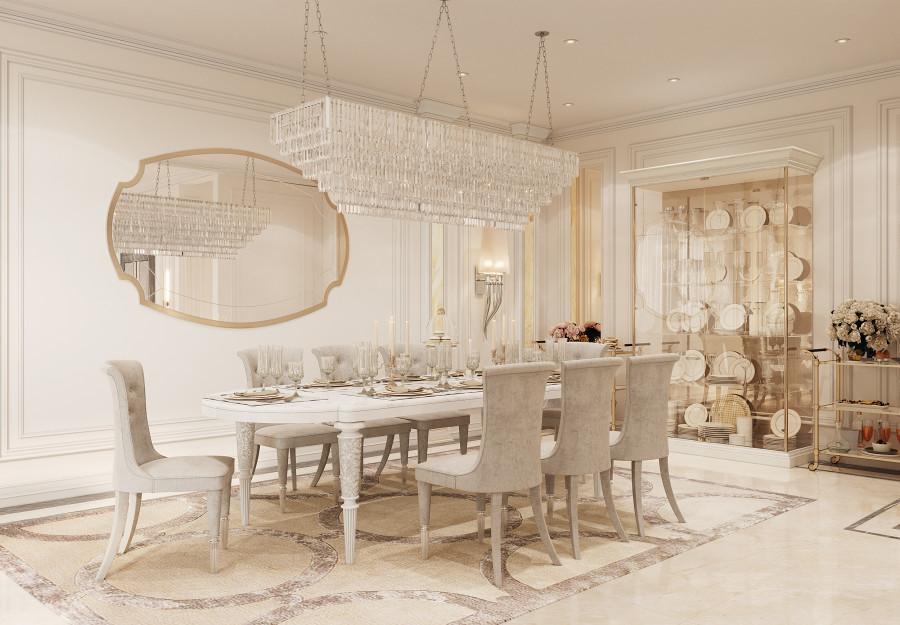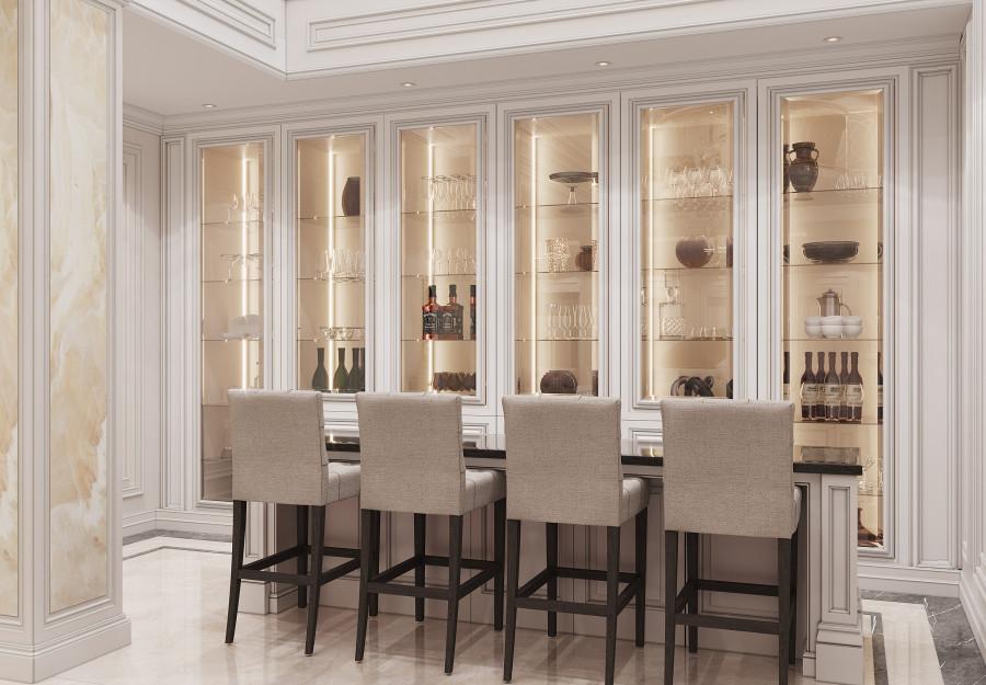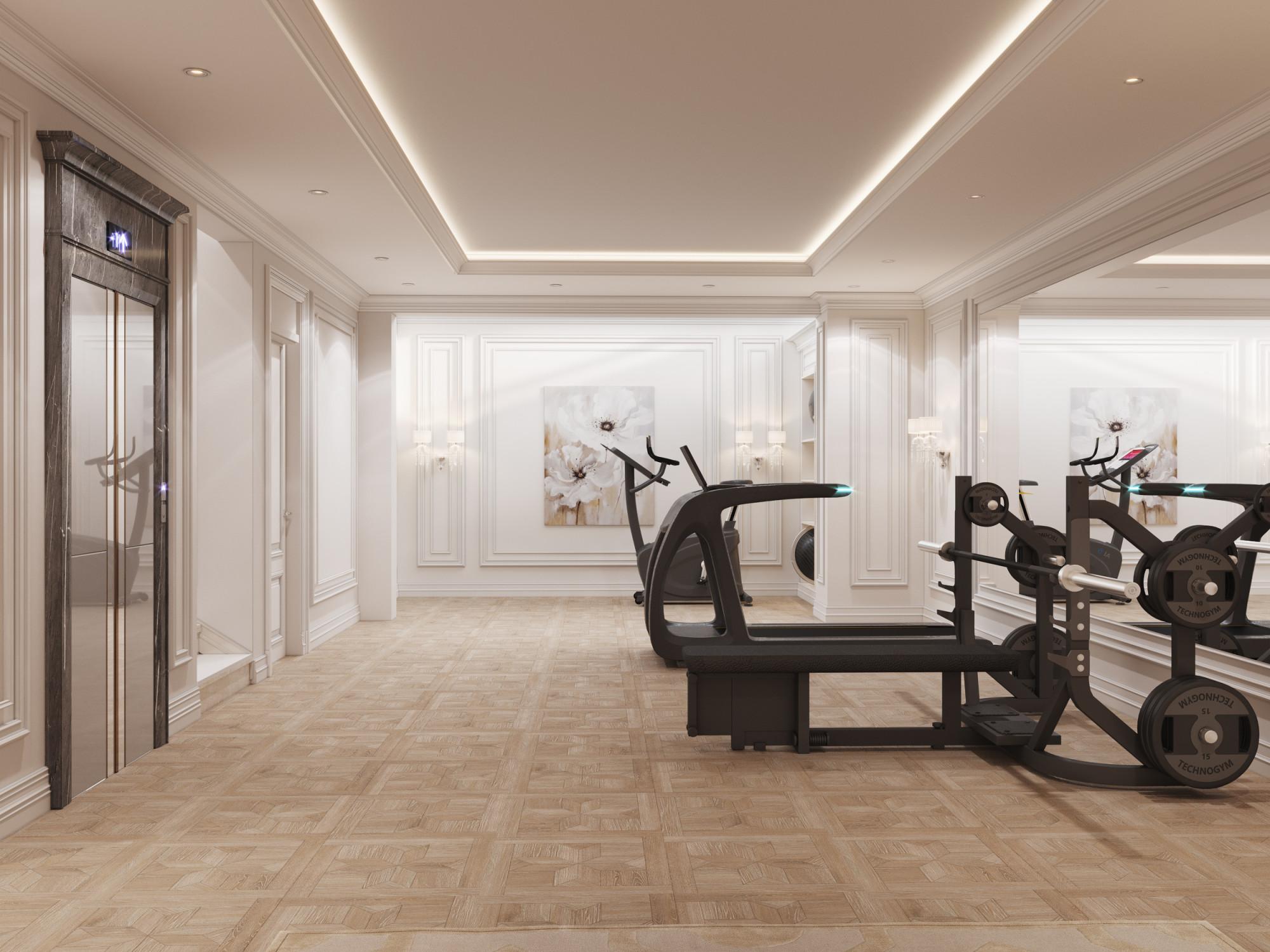 Интерьер дома выполнен в стиле неоклассика, что видно по изысканным деталям и нейтральной цветовой гамме. Основные материалы включают мрамор, который используется для отделки стен и пола, создавая ощущение роскоши и элегантности. Мебель в светлых тонах с удобной посадкой обеспечивает комфорт, а декоративные подушки и текстиль добавляют уюта. Освещение в комнатах продумано до мелочей: настенные бра, люстры и торшеры сделали пространство еще более эффектным. Интерьер привлекает балансом между красотой и практичностью, а также способностью создавать атмосферу роскоши и уюта одновременно.