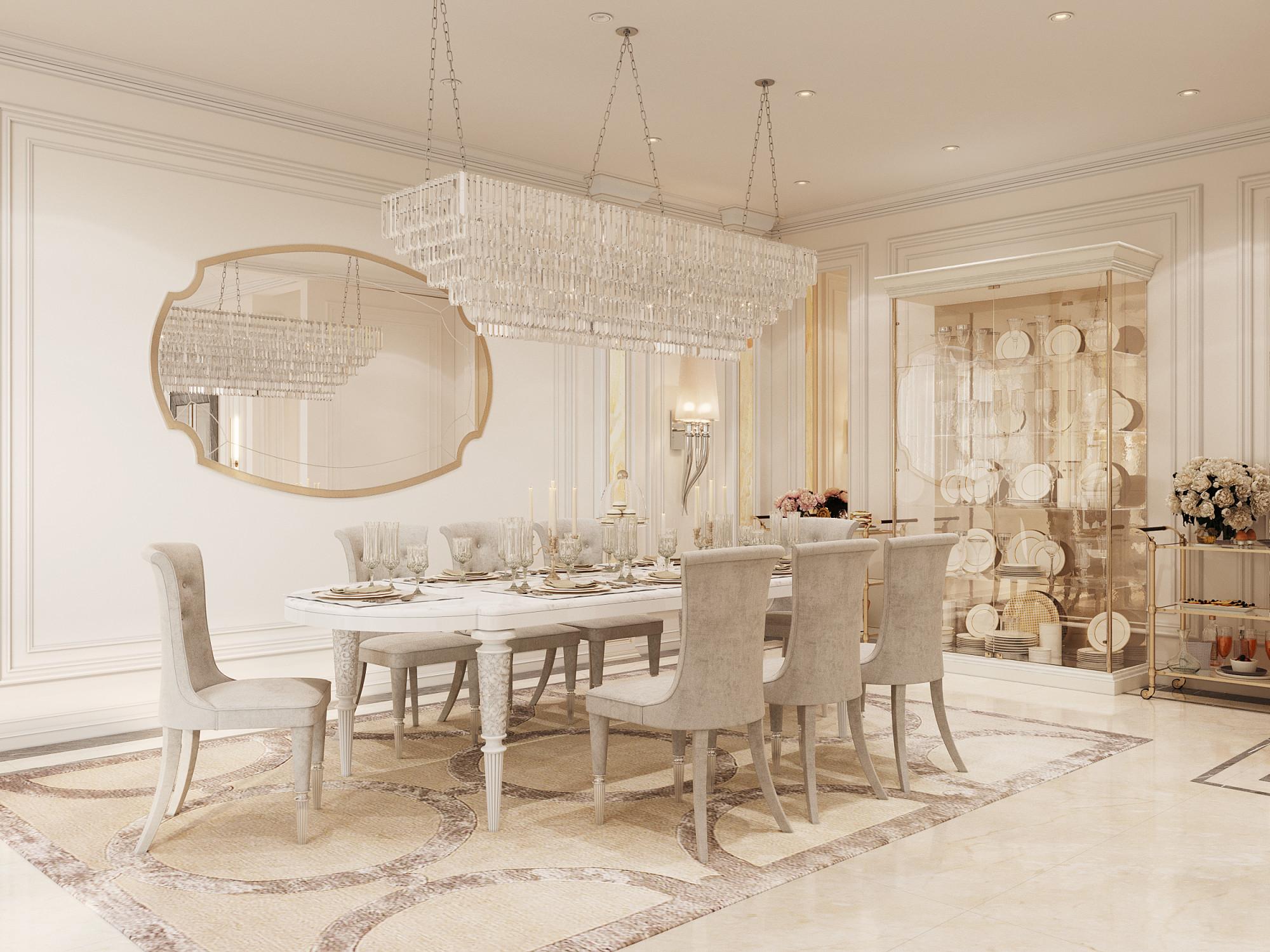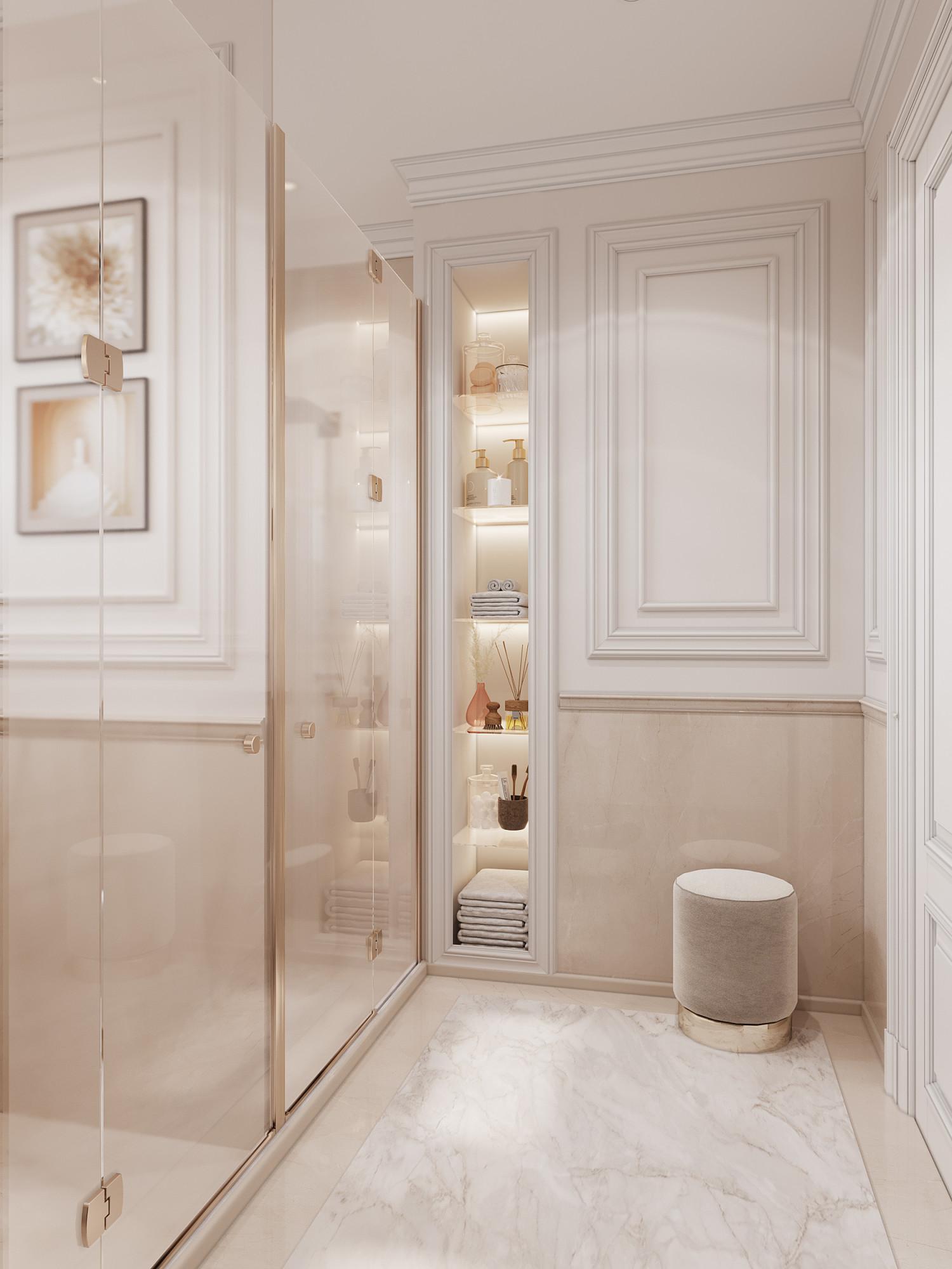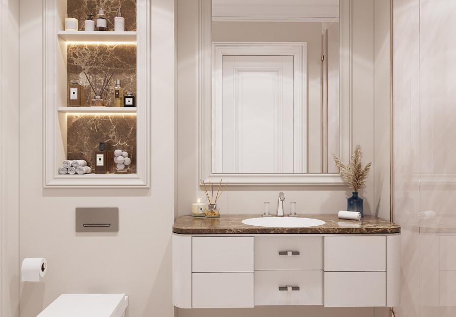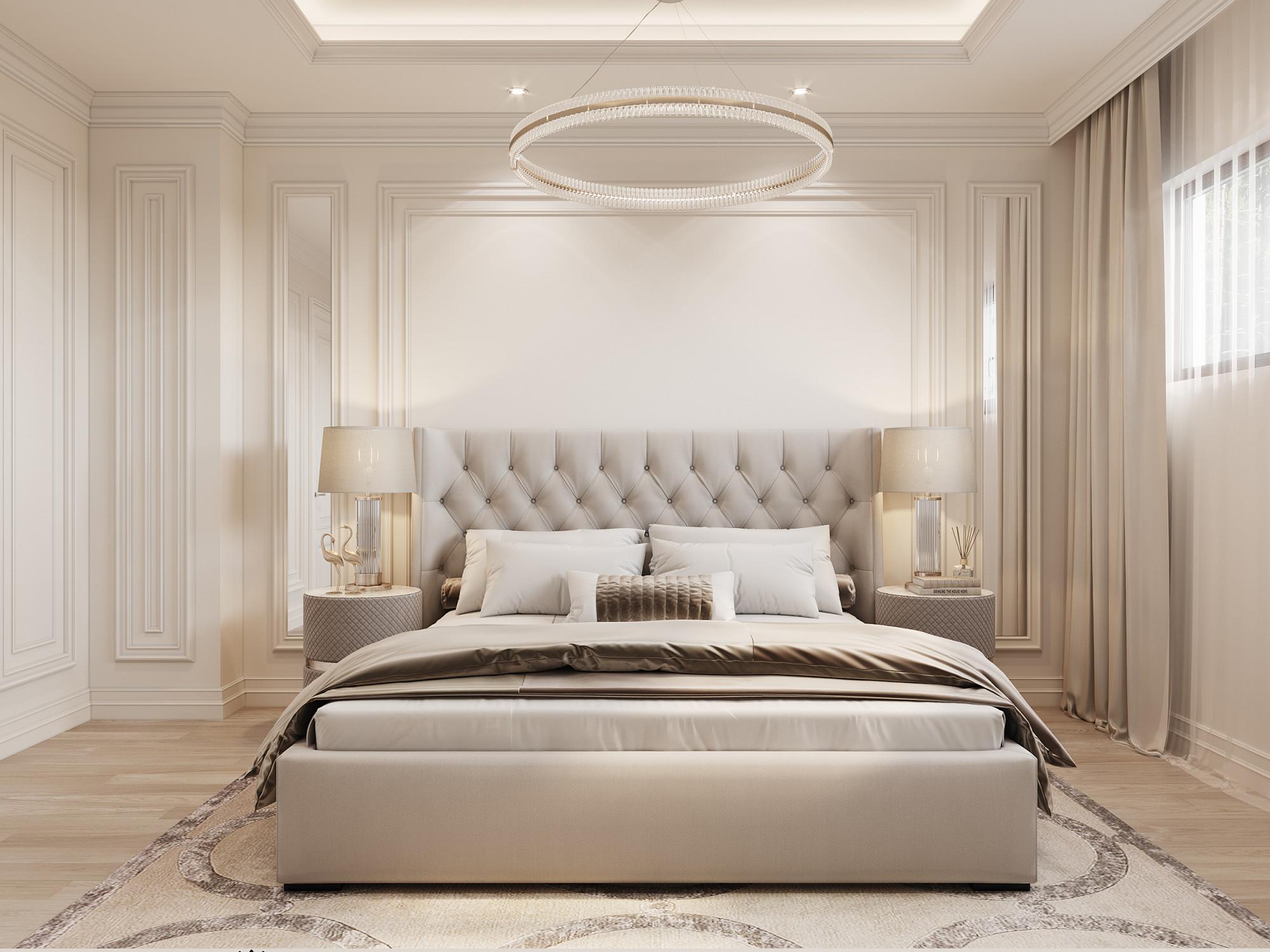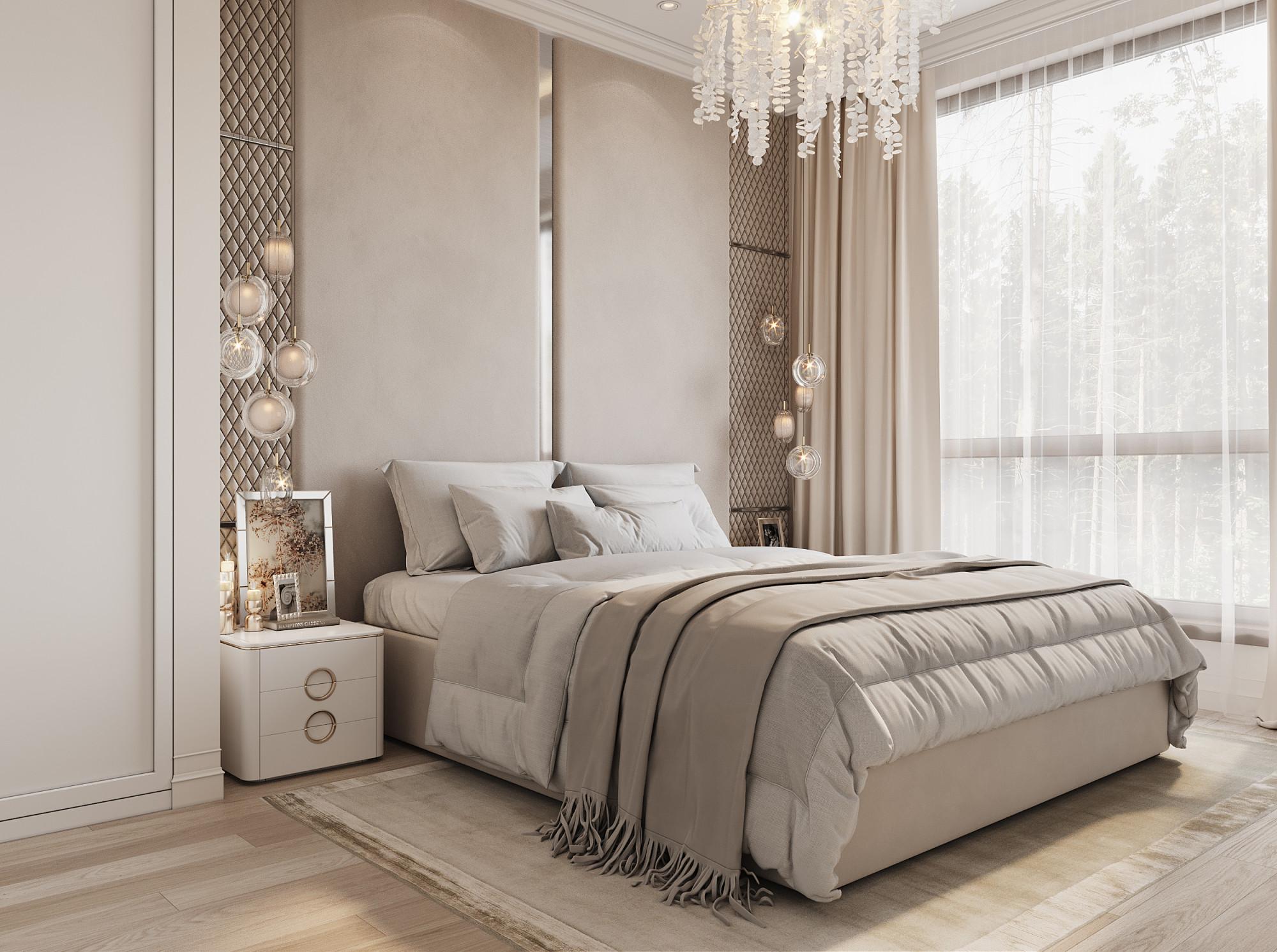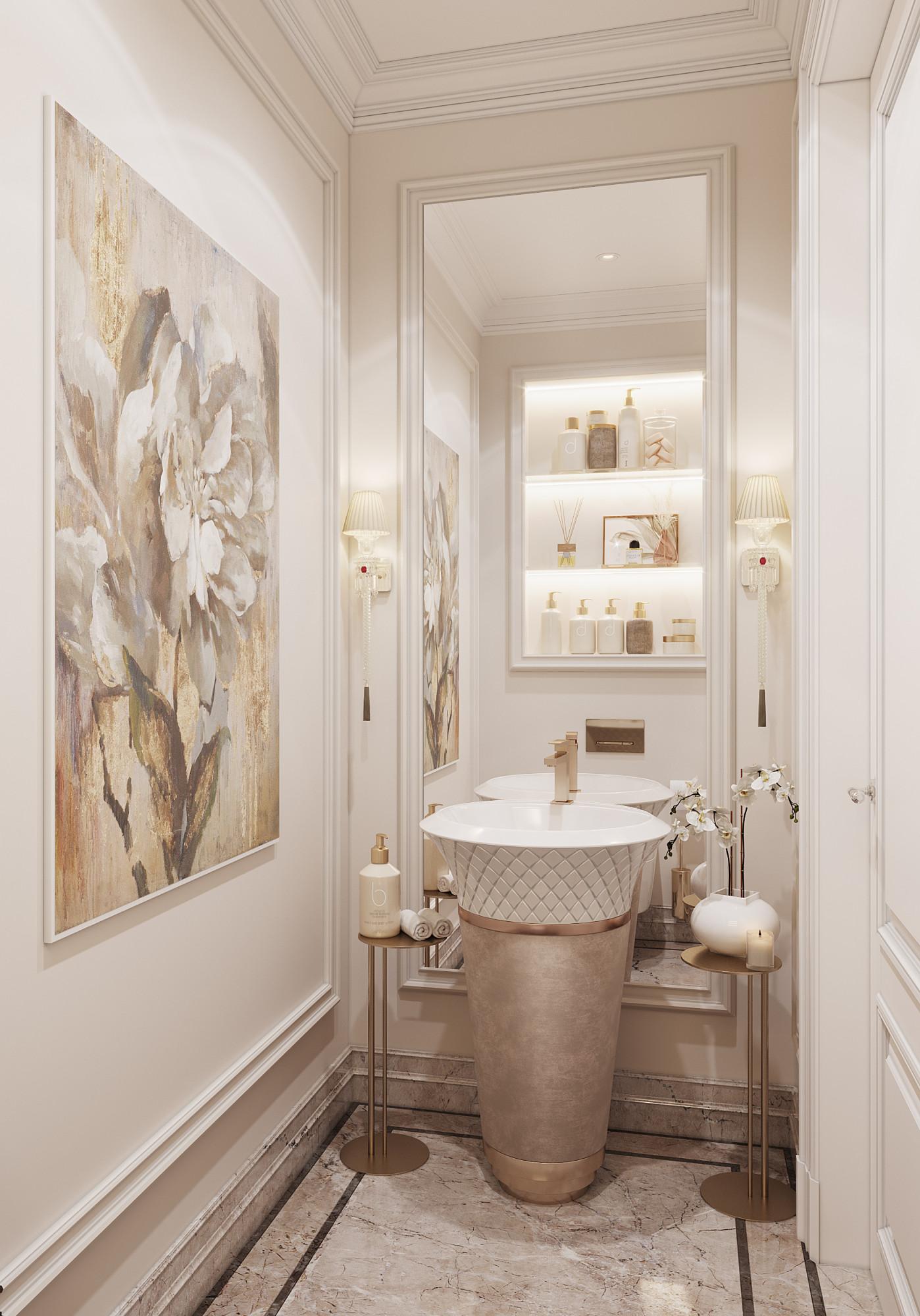 Интерьер дома выполнен в стиле неоклассика, что видно по изысканным деталям и нейтральной цветовой гамме. Основные материалы включают мрамор, который используется для отделки стен и пола, создавая ощущение роскоши и элегантности. Мебель в светлых тонах с удобной посадкой обеспечивает комфорт, а декоративные подушки и текстиль добавляют уюта. Освещение в комнатах продумано до мелочей: настенные бра, люстры и торшеры сделали пространство еще более эффектным. Интерьер привлекает балансом между красотой и практичностью, а также способностью создавать атмосферу роскоши и уюта одновременно.