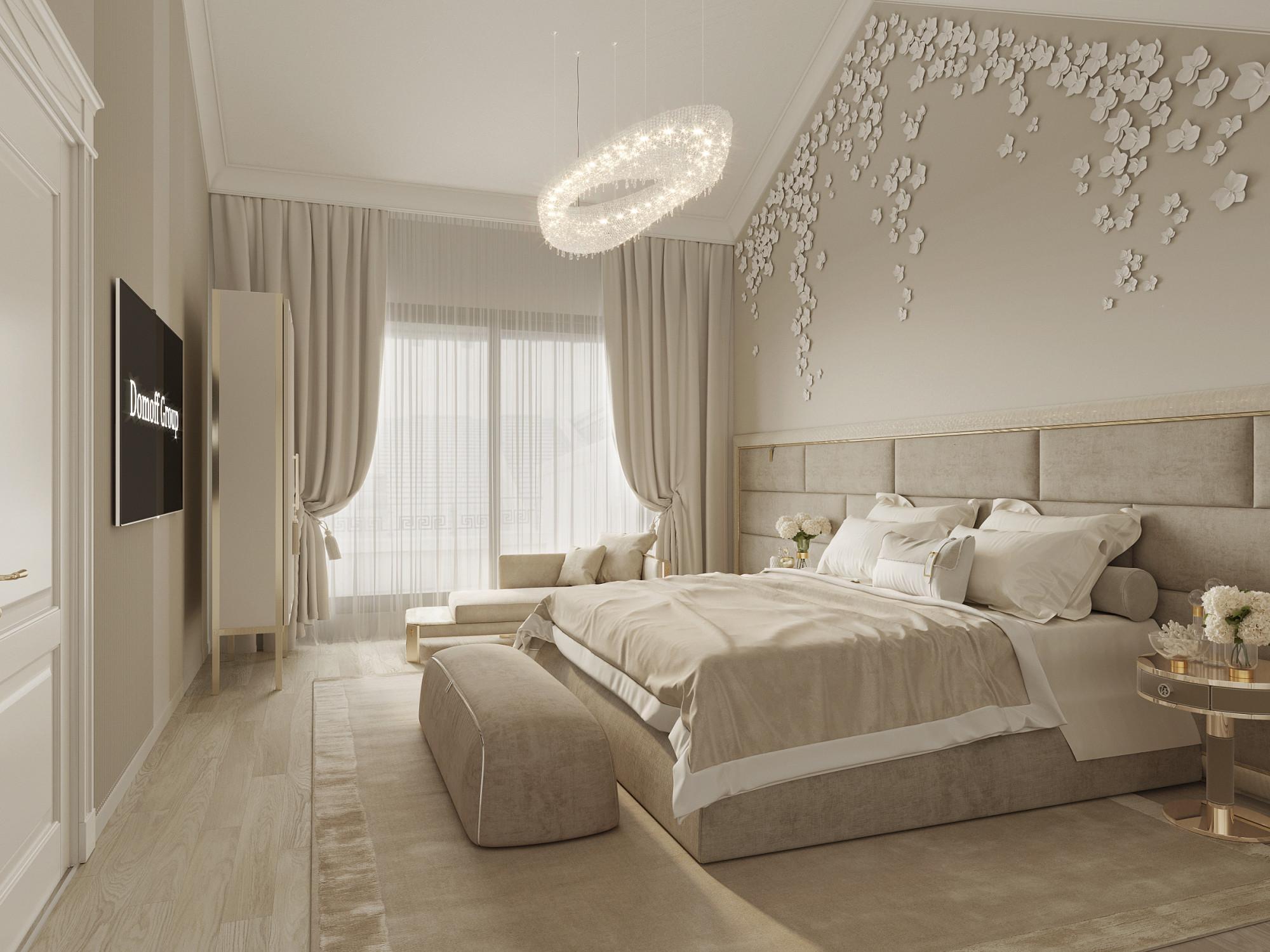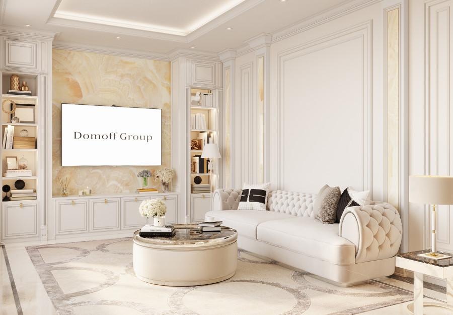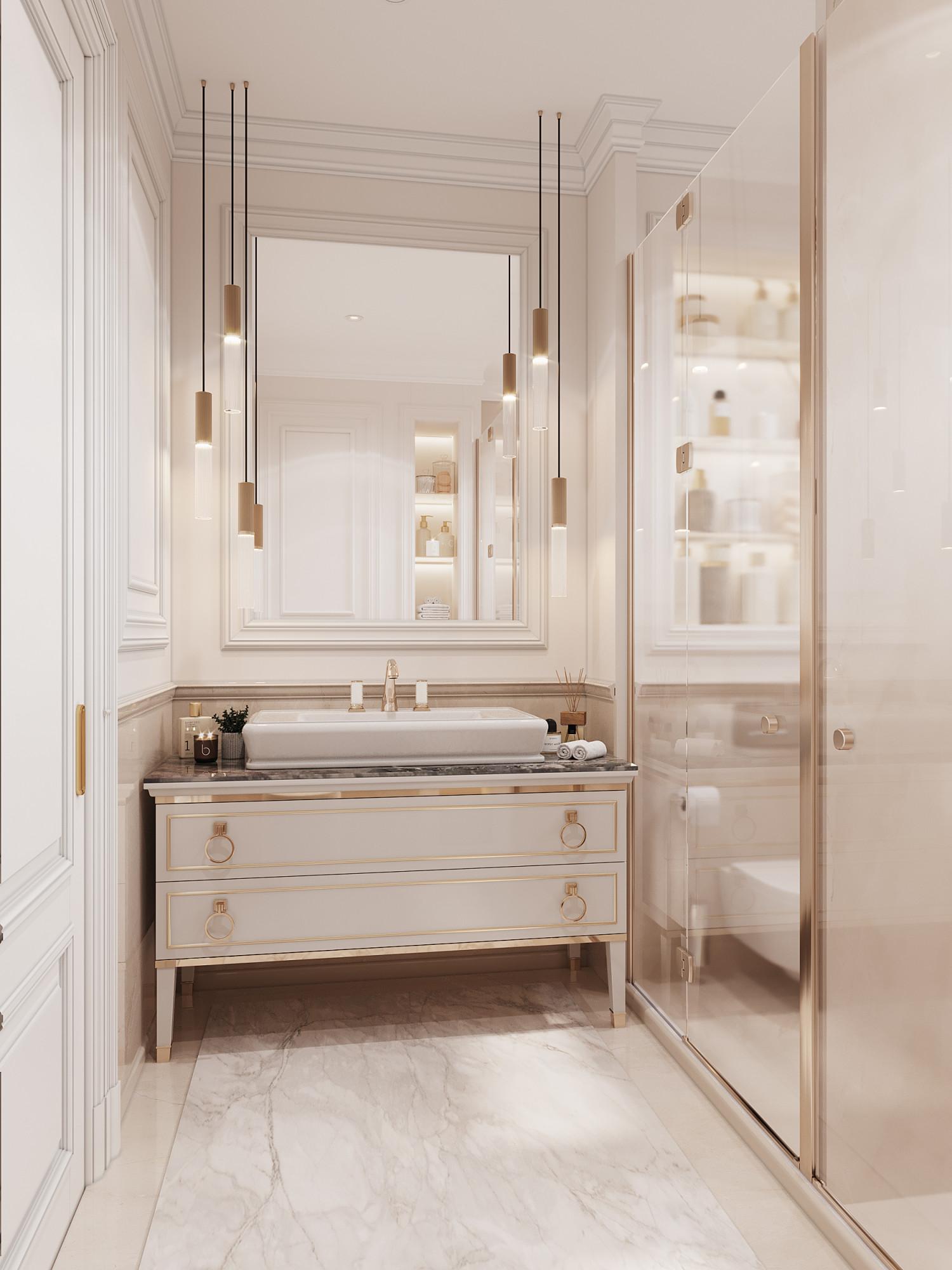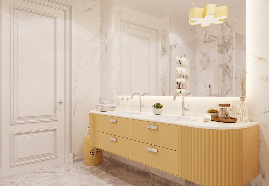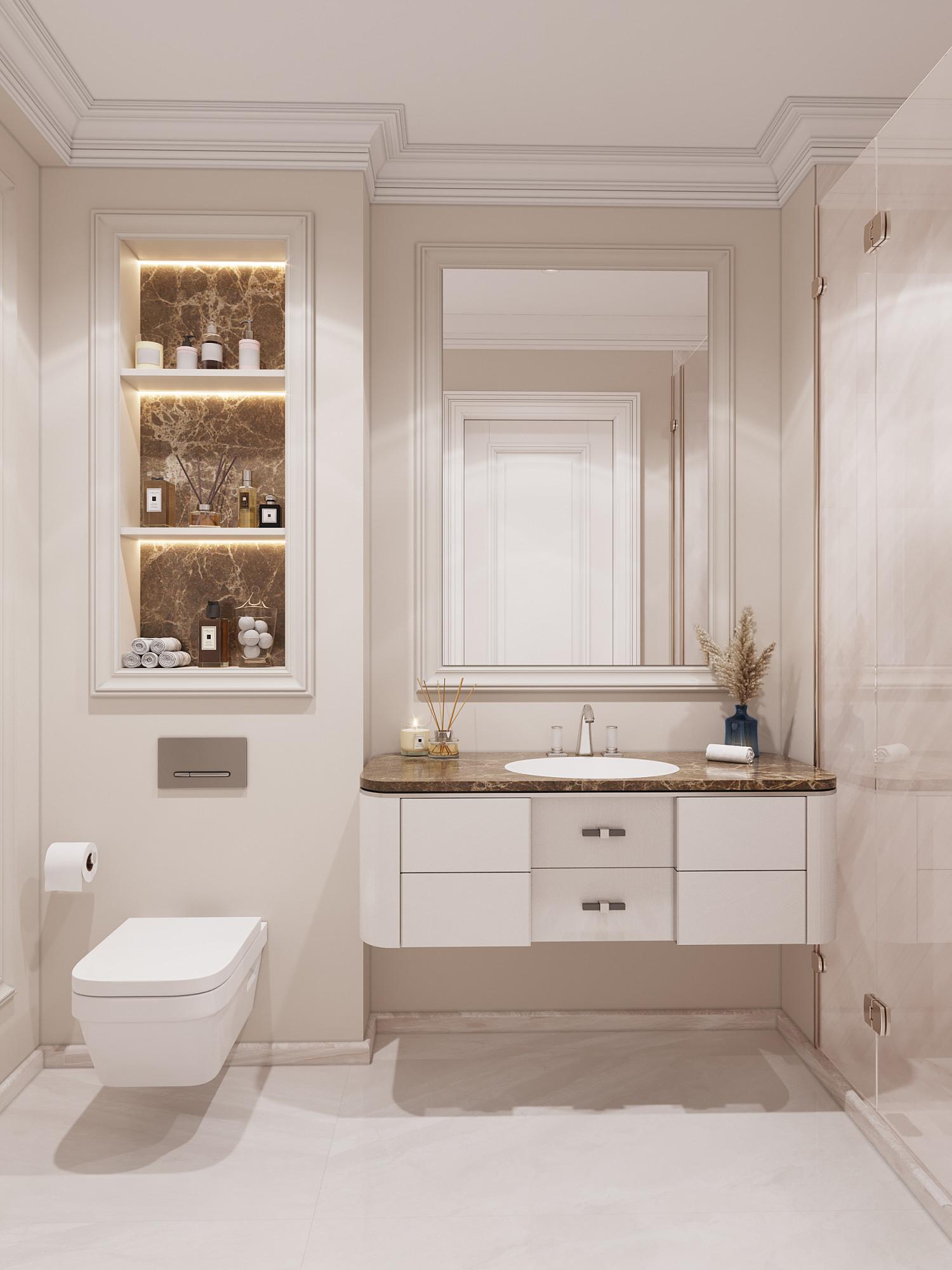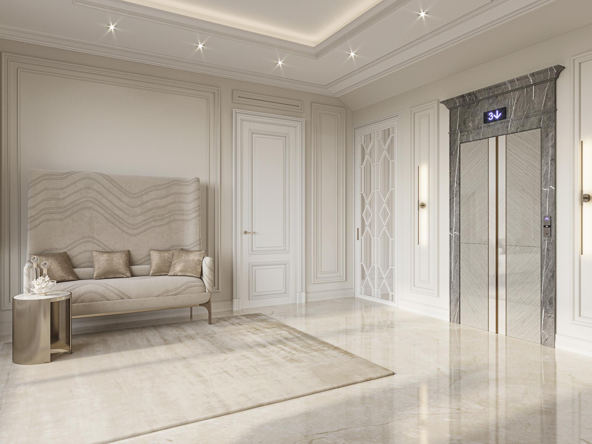 Интерьер дома выполнен в стиле неоклассика, что видно по изысканным деталям и нейтральной цветовой гамме. Основные материалы включают мрамор, который используется для отделки стен и пола, создавая ощущение роскоши и элегантности. Мебель в светлых тонах с удобной посадкой обеспечивает комфорт, а декоративные подушки и текстиль добавляют уюта. Освещение в комнатах продумано до мелочей: настенные бра, люстры и торшеры сделали пространство еще более эффектным. Интерьер привлекает балансом между красотой и практичностью, а также способностью создавать атмосферу роскоши и уюта одновременно.