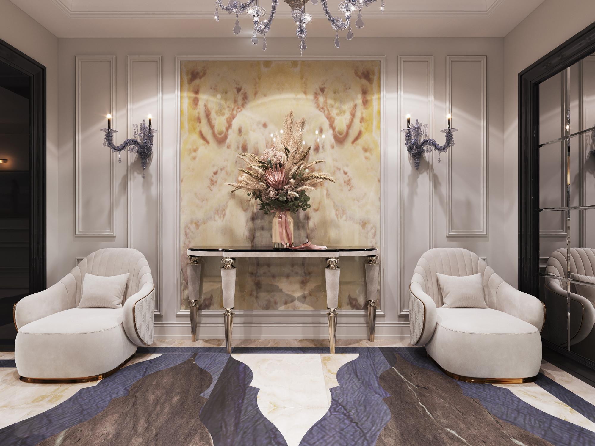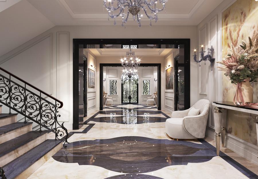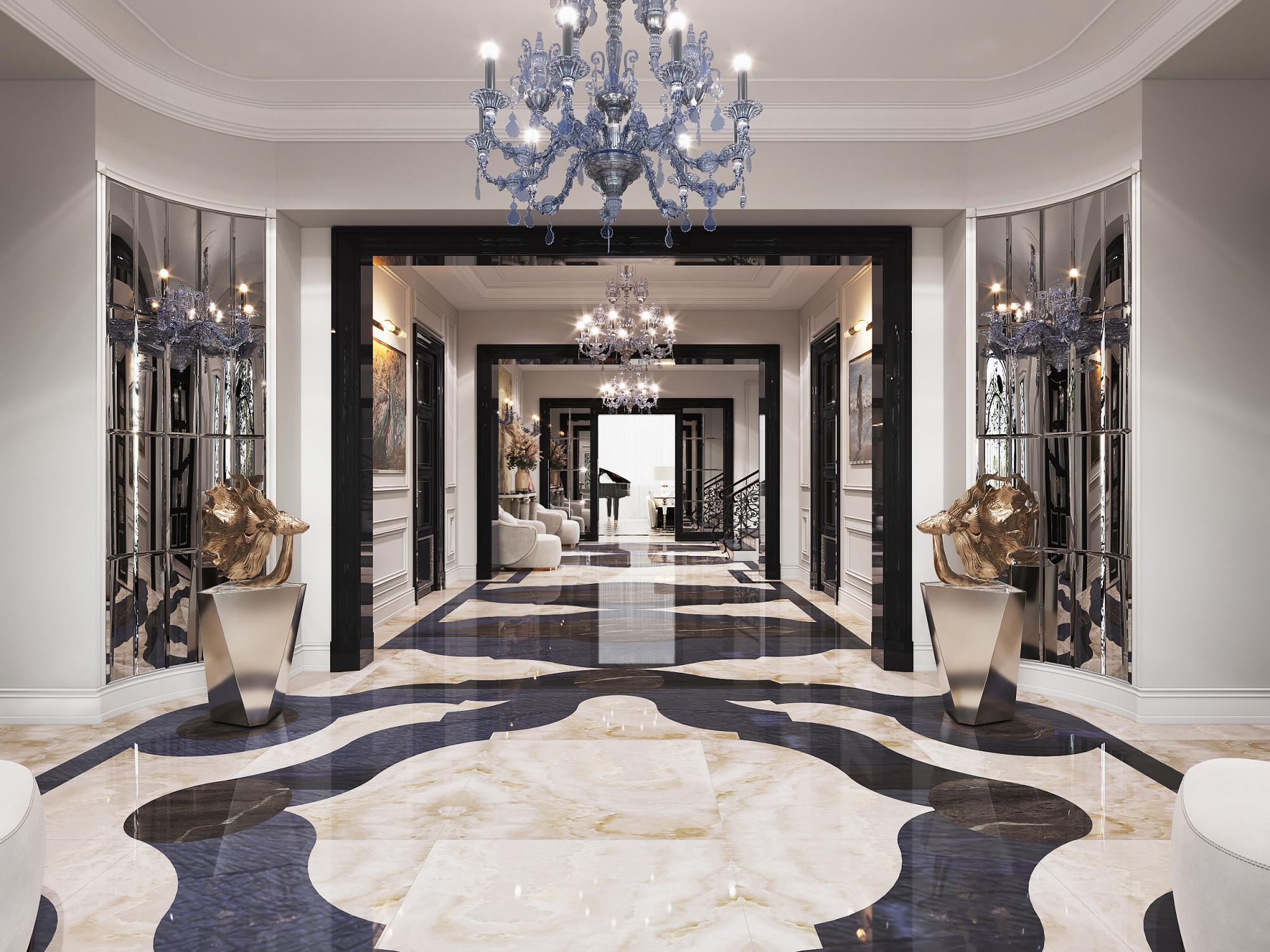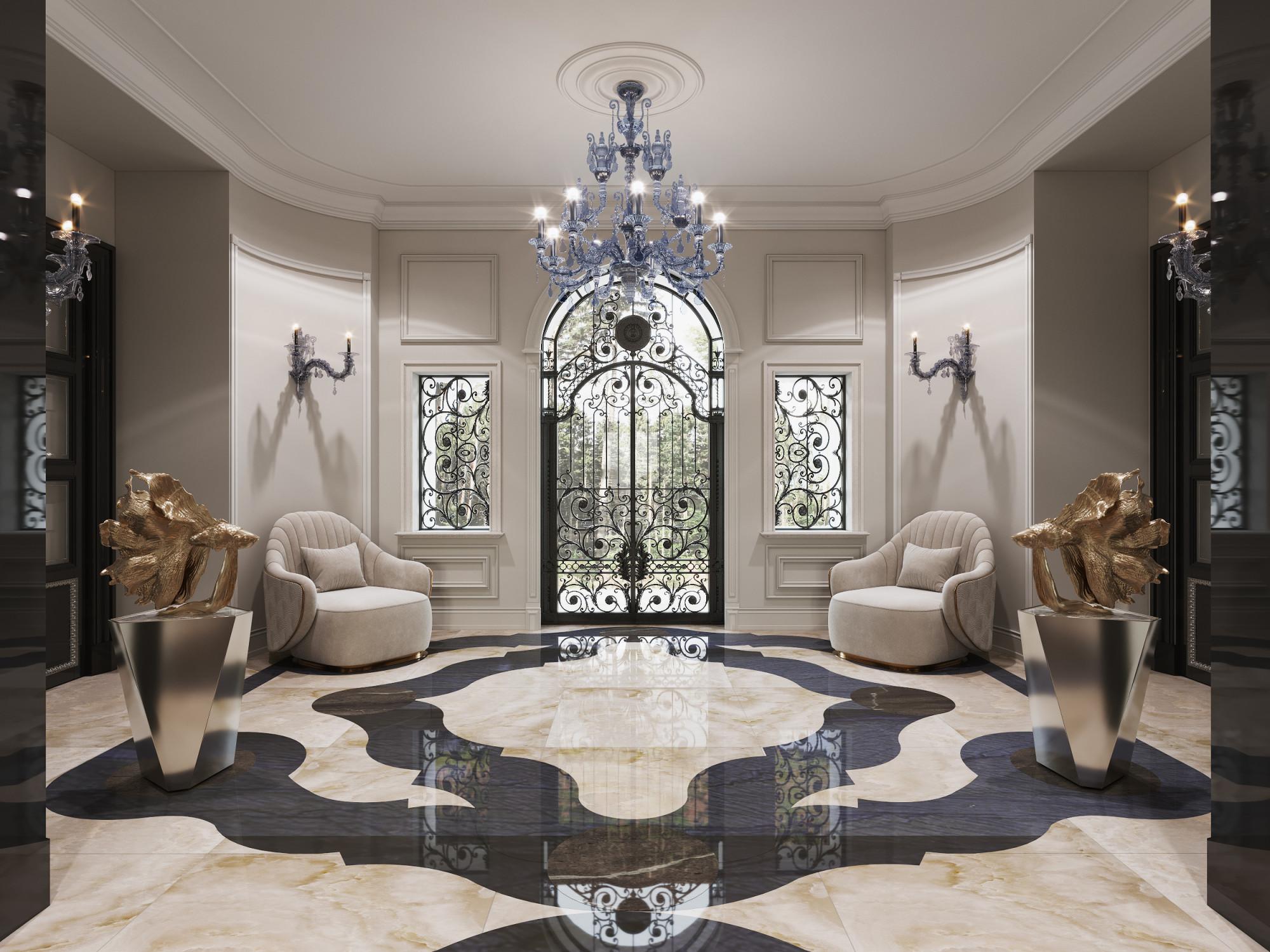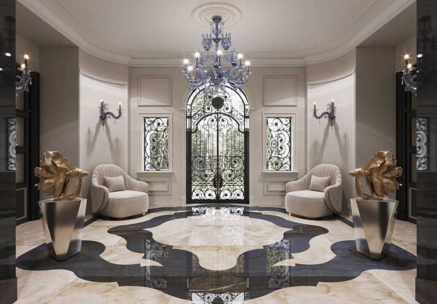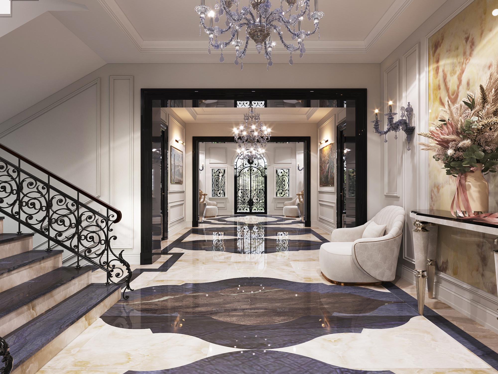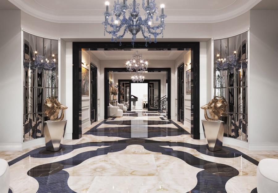 Интерьер дома выдержан в классическом стиле с элементами роскоши и предметами современного дизайна, что делает пространство одновременно элегантным и комфортным. Одним из главных хитов проекта является холл: здесь пол выполнен из мрамора с уникальным узором, где черные и белые элементы переплетаются, создавая эффект водной глади. Золотые скульптуры на пьедесталах добавляют интерьеру динамики и подчеркивают статусность. Они выполнены в виде животных, что придает пространству нотку экзотики. Цветовая палитра в основном светлая, за счет чего комнаты смотрятся просторнее. Бонус: две террасы с уютной зоной отдыха.