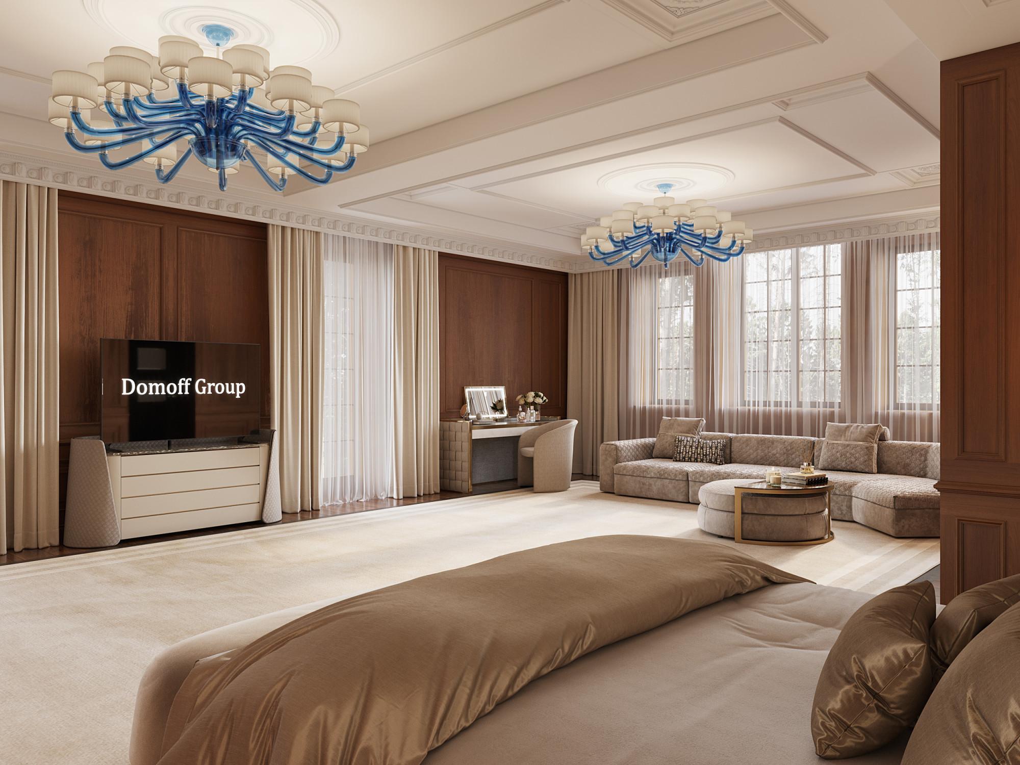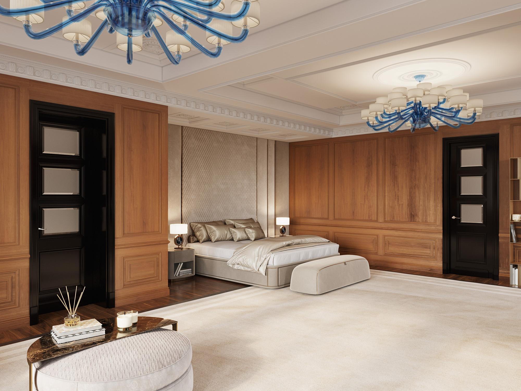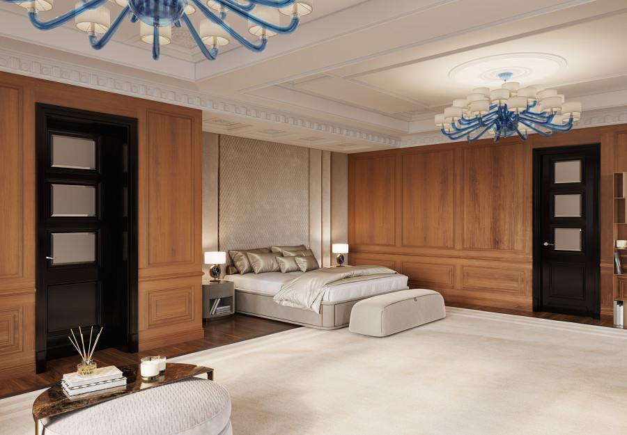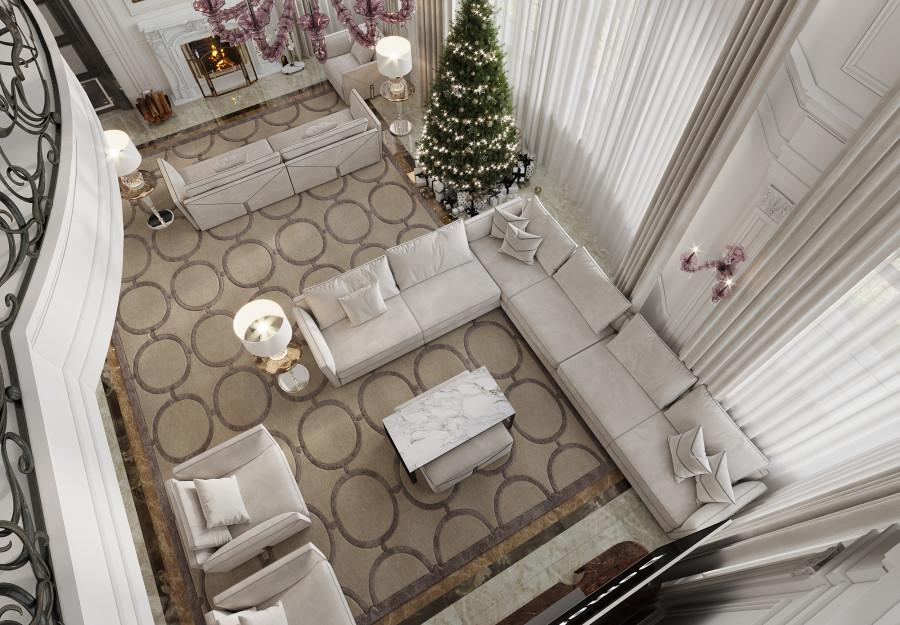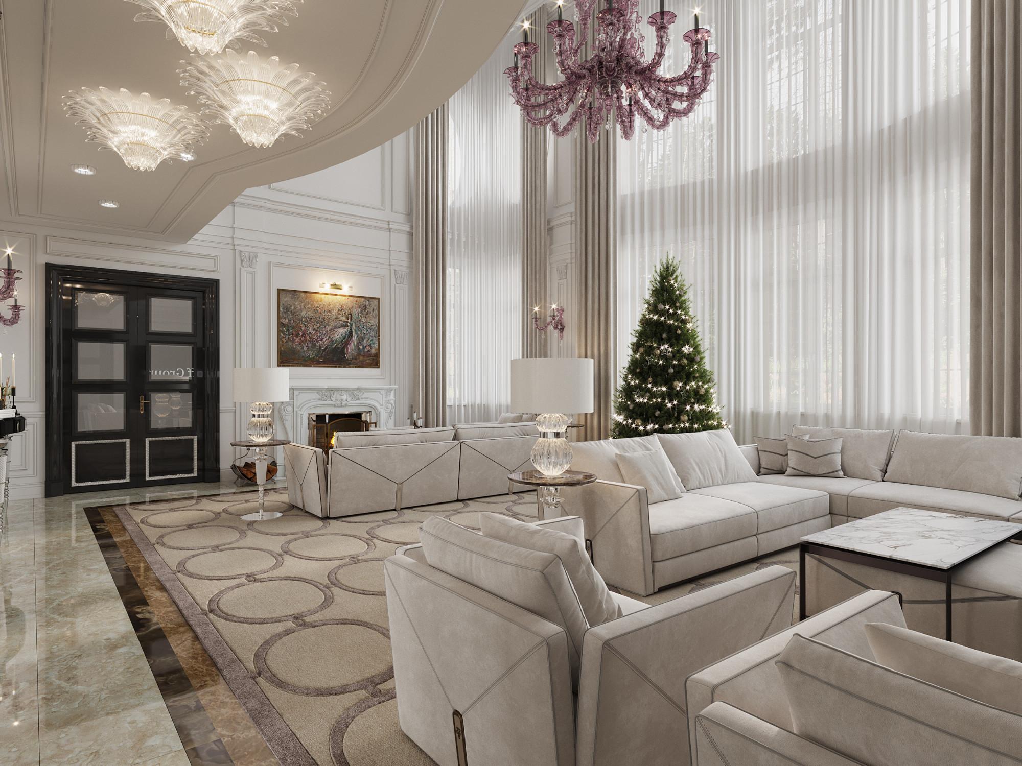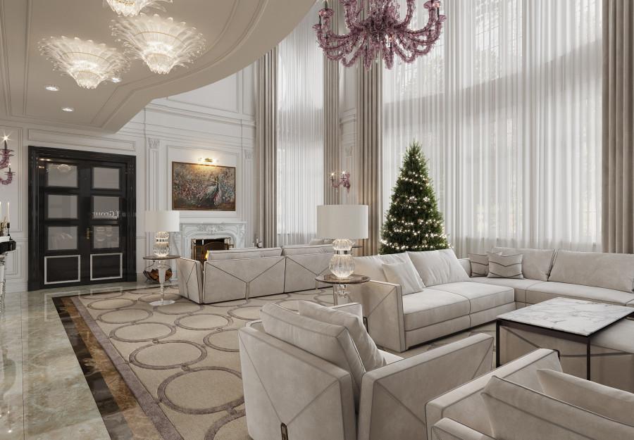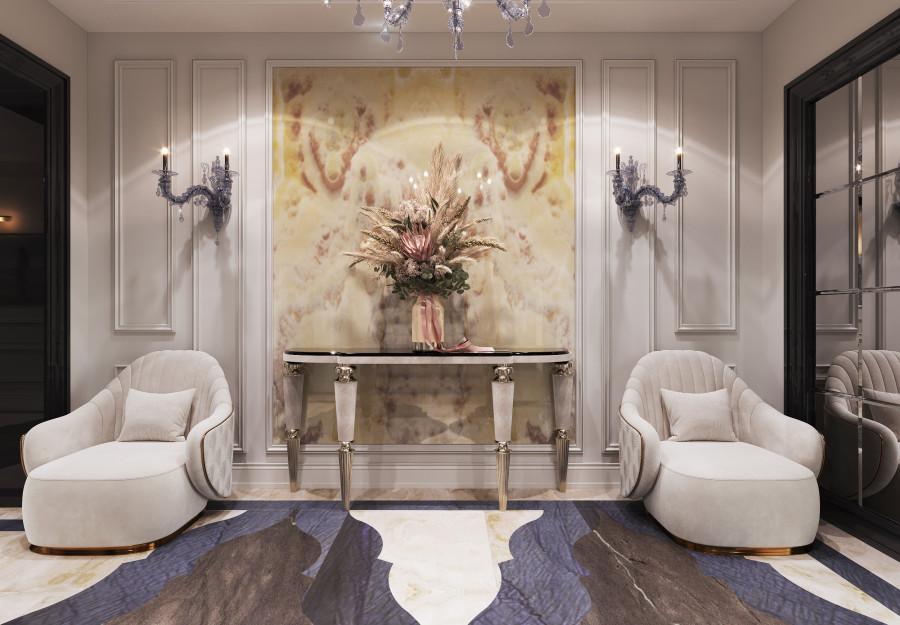 Интерьер дома выдержан в классическом стиле с элементами роскоши и предметами современного дизайна, что делает пространство одновременно элегантным и комфортным. Одним из главных хитов проекта является холл: здесь пол выполнен из мрамора с уникальным узором, где черные и белые элементы переплетаются, создавая эффект водной глади. Золотые скульптуры на пьедесталах добавляют интерьеру динамики и подчеркивают статусность. Они выполнены в виде животных, что придает пространству нотку экзотики. Цветовая палитра в основном светлая, за счет чего комнаты смотрятся просторнее. Бонус: две террасы с уютной зоной отдыха.