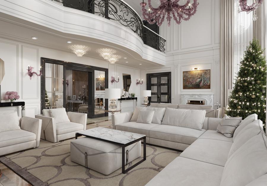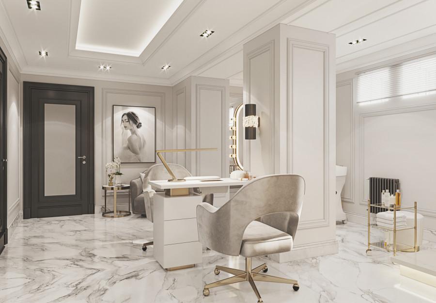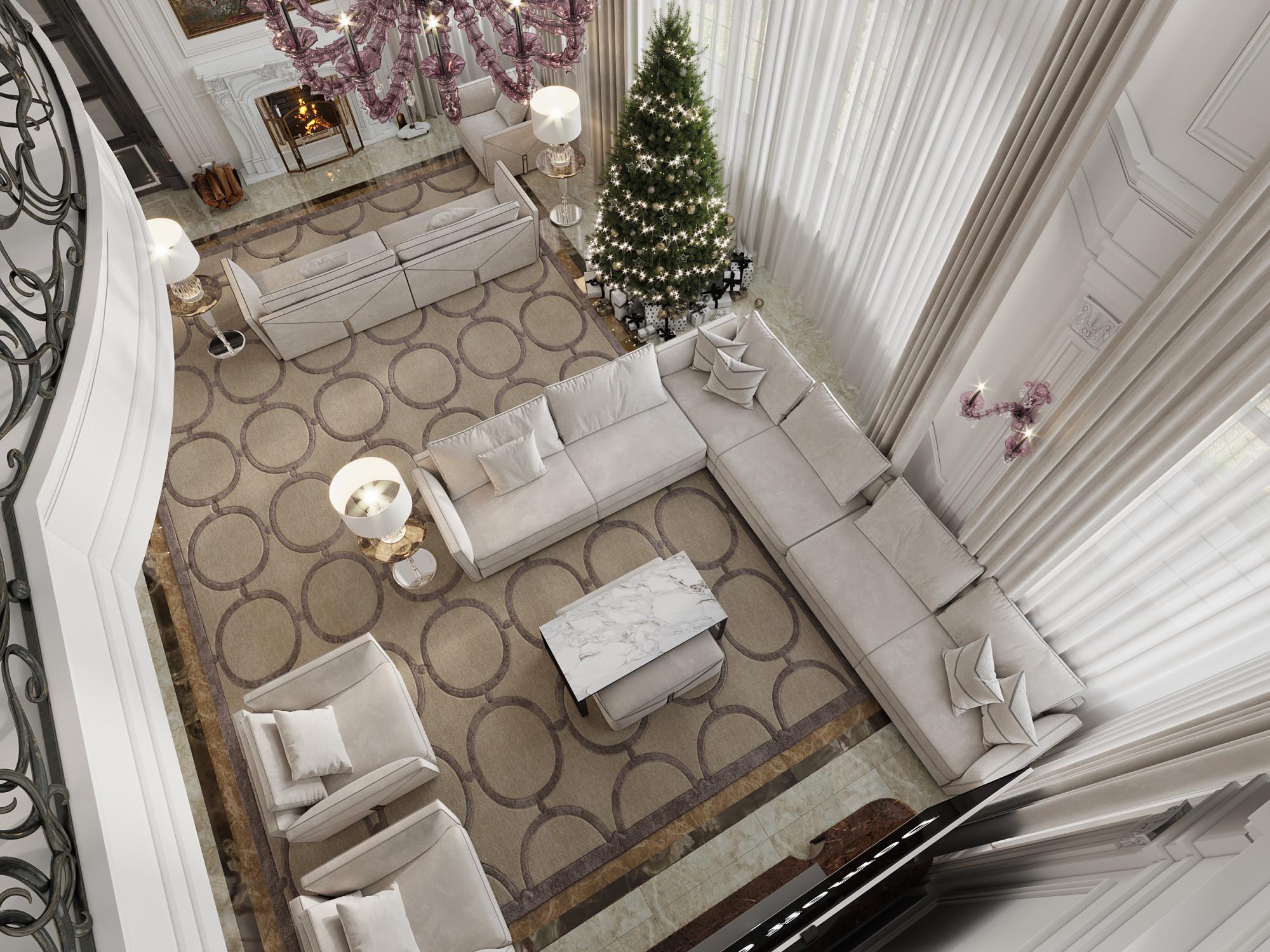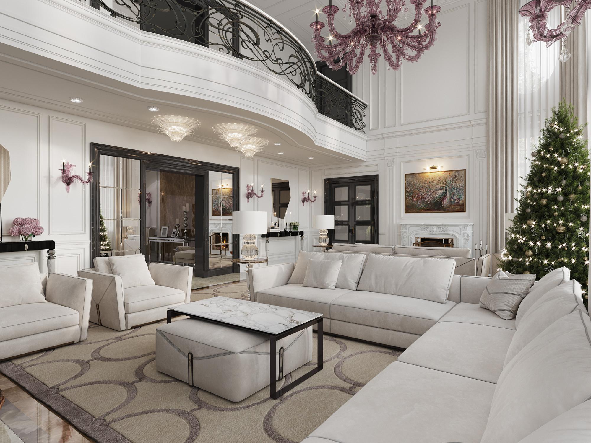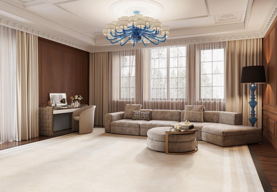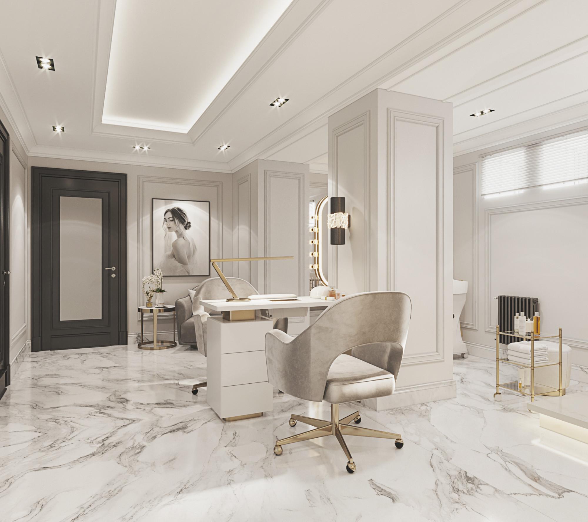 Интерьер дома выдержан в классическом стиле с элементами роскоши и предметами современного дизайна, что делает пространство одновременно элегантным и комфортным. Одним из главных хитов проекта является холл: здесь пол выполнен из мрамора с уникальным узором, где черные и белые элементы переплетаются, создавая эффект водной глади. Золотые скульптуры на пьедесталах добавляют интерьеру динамики и подчеркивают статусность. Они выполнены в виде животных, что придает пространству нотку экзотики. Цветовая палитра в основном светлая, за счет чего комнаты смотрятся просторнее. Бонус: две террасы с уютной зоной отдыха.