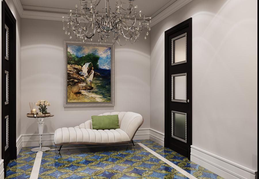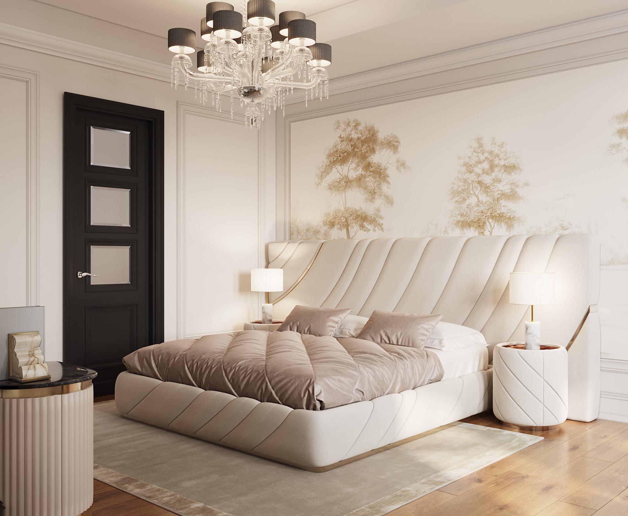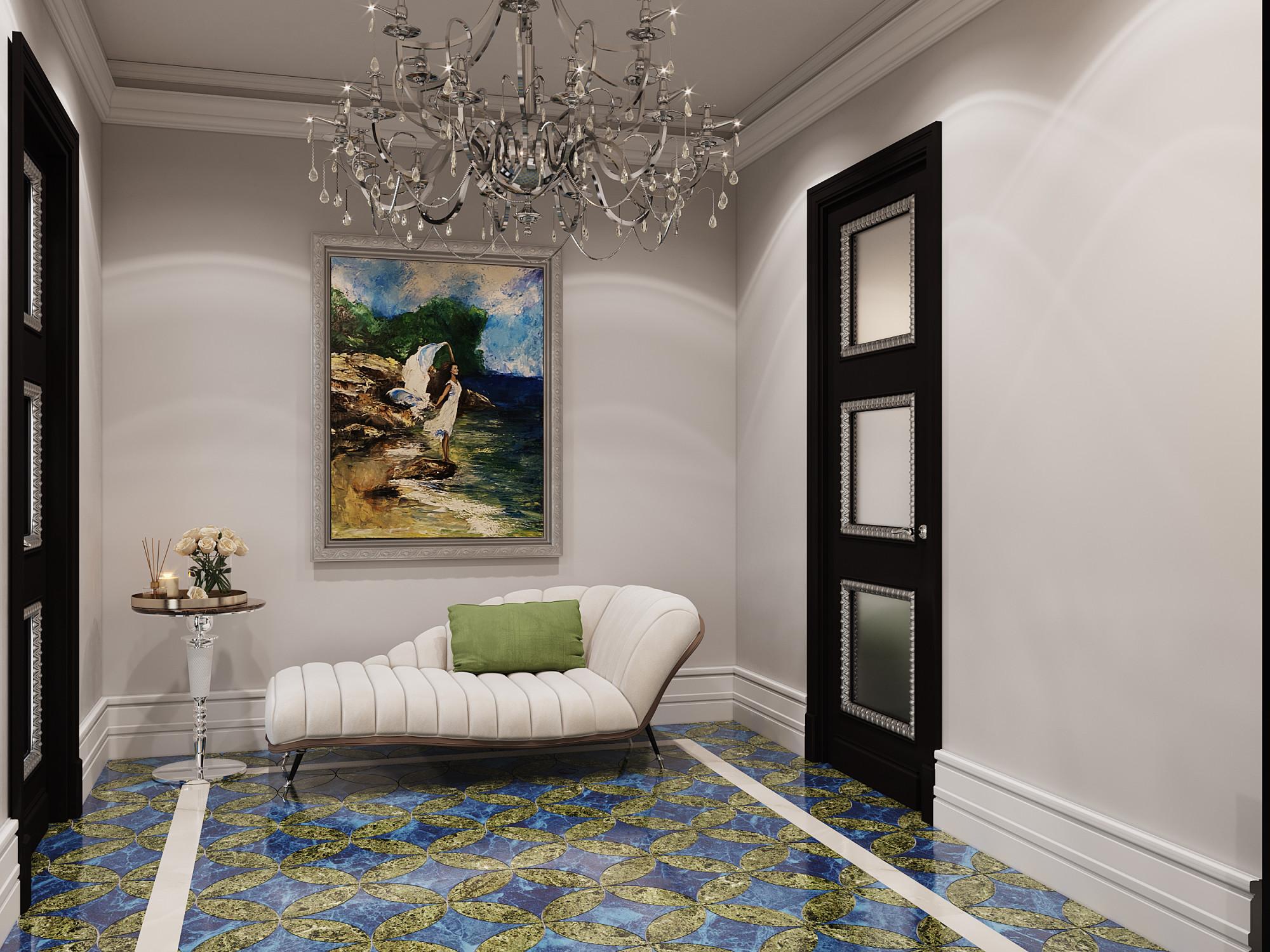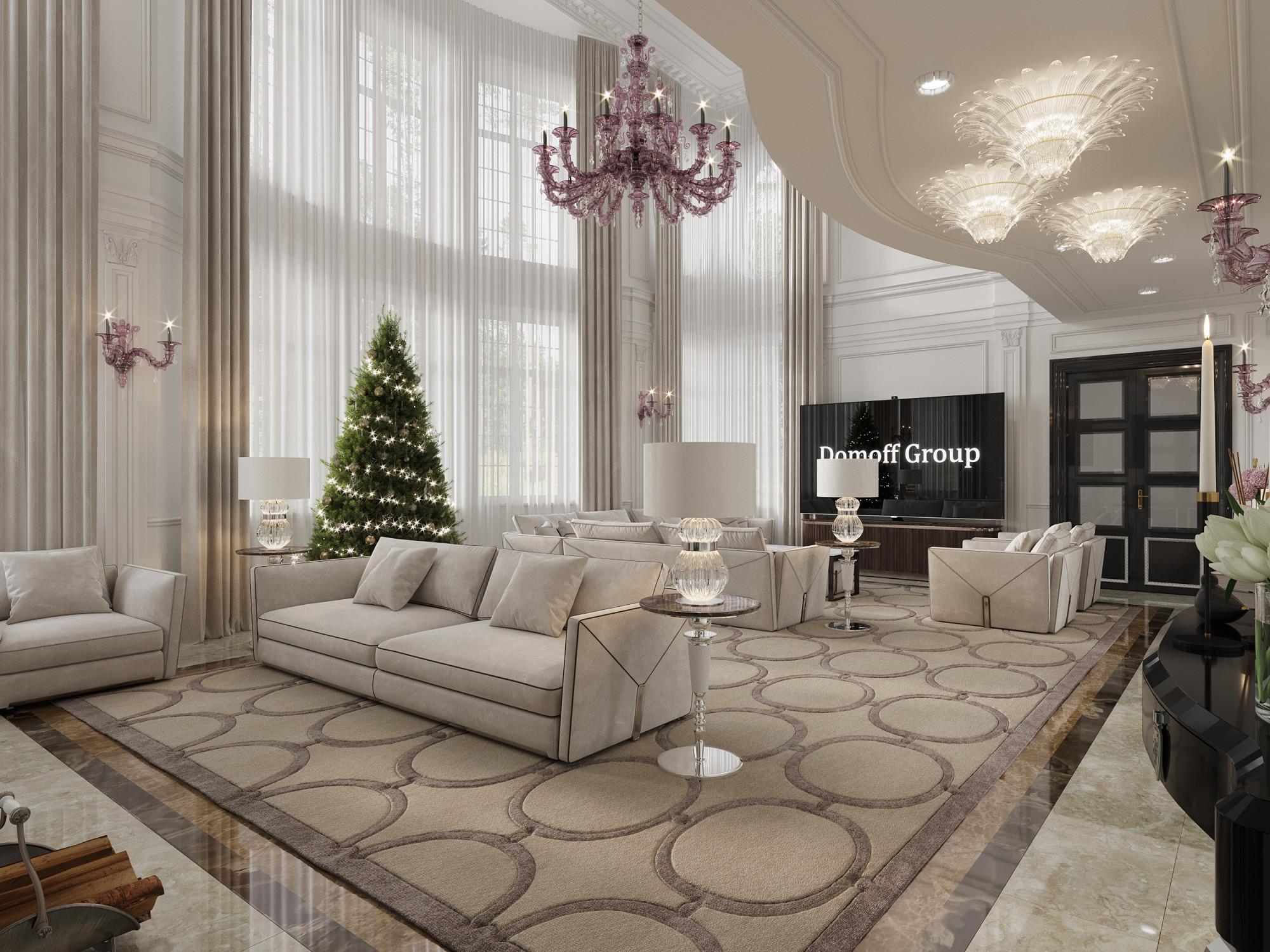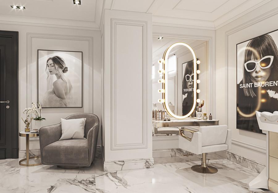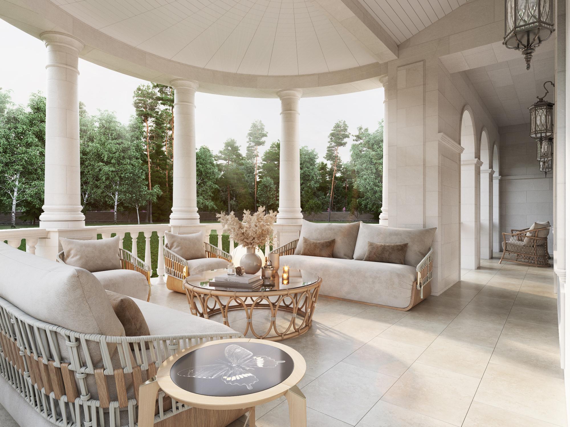 Интерьер дома выдержан в классическом стиле с элементами роскоши и предметами современного дизайна, что делает пространство одновременно элегантным и комфортным. Одним из главных хитов проекта является холл: здесь пол выполнен из мрамора с уникальным узором, где черные и белые элементы переплетаются, создавая эффект водной глади. Золотые скульптуры на пьедесталах добавляют интерьеру динамики и подчеркивают статусность. Они выполнены в виде животных, что придает пространству нотку экзотики. Цветовая палитра в основном светлая, за счет чего комнаты смотрятся просторнее. Бонус: две террасы с уютной зоной отдыха.