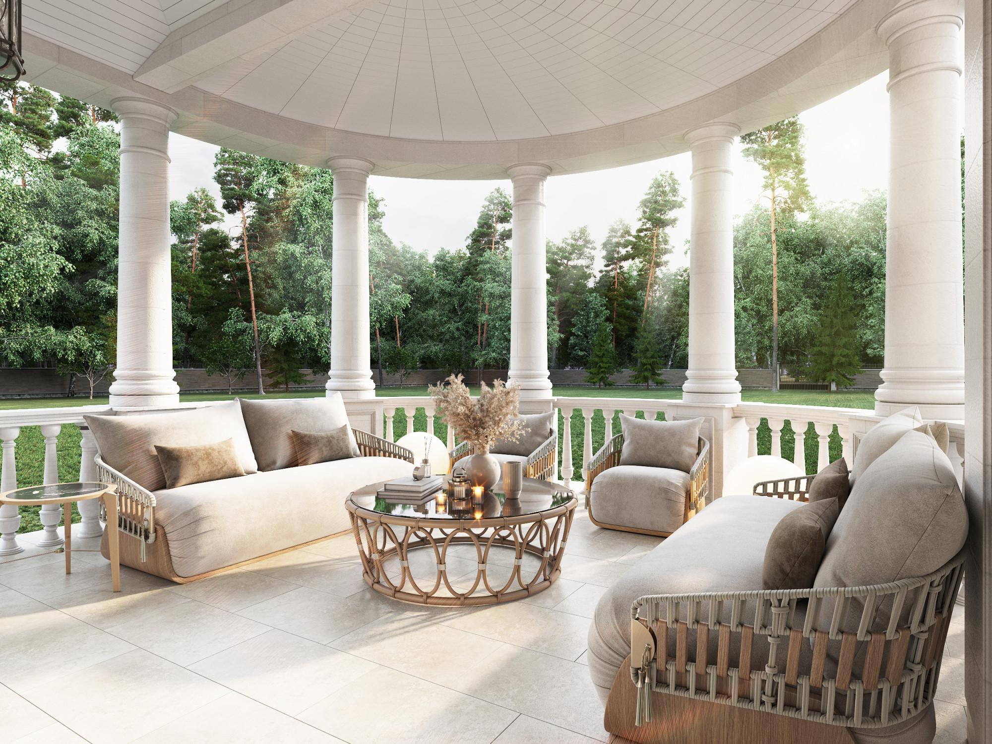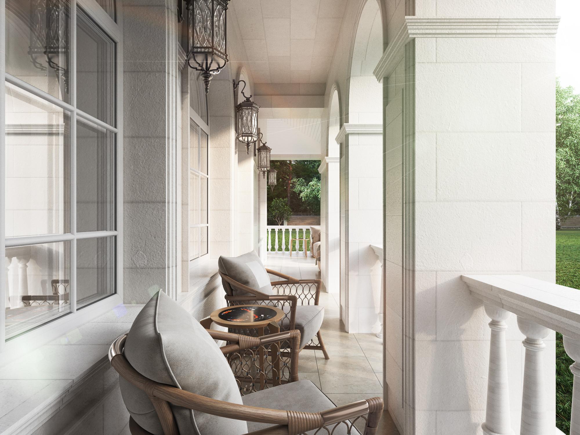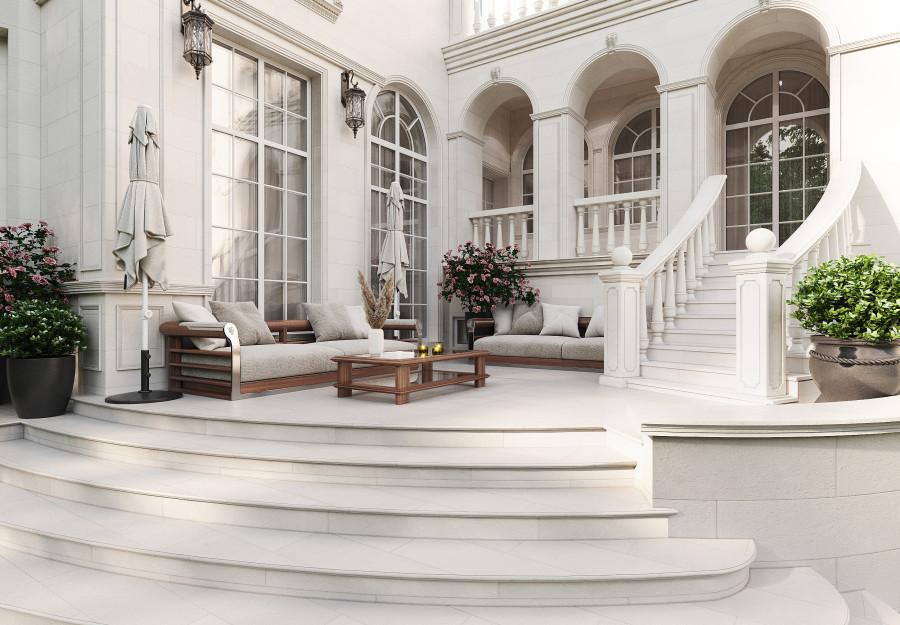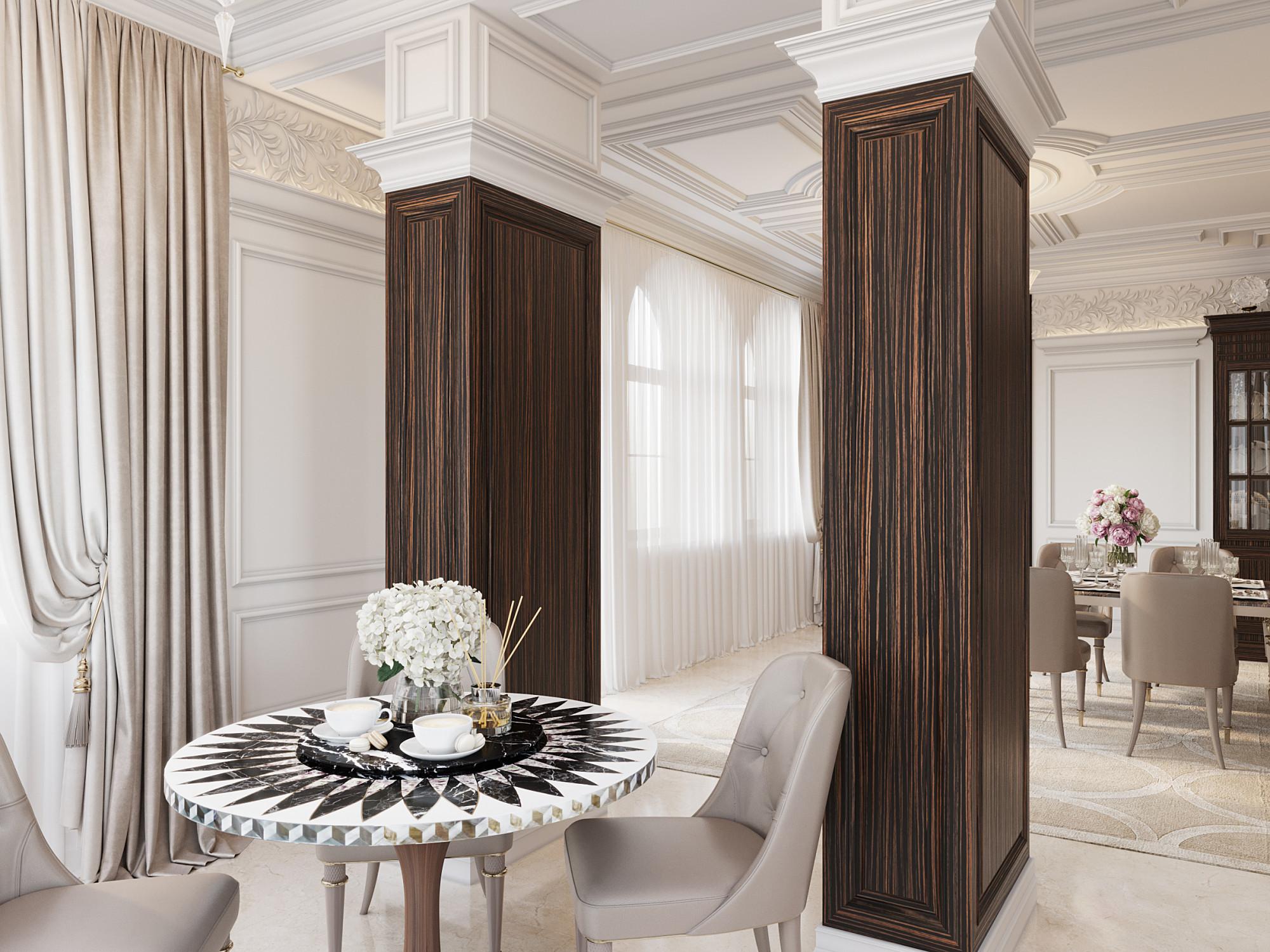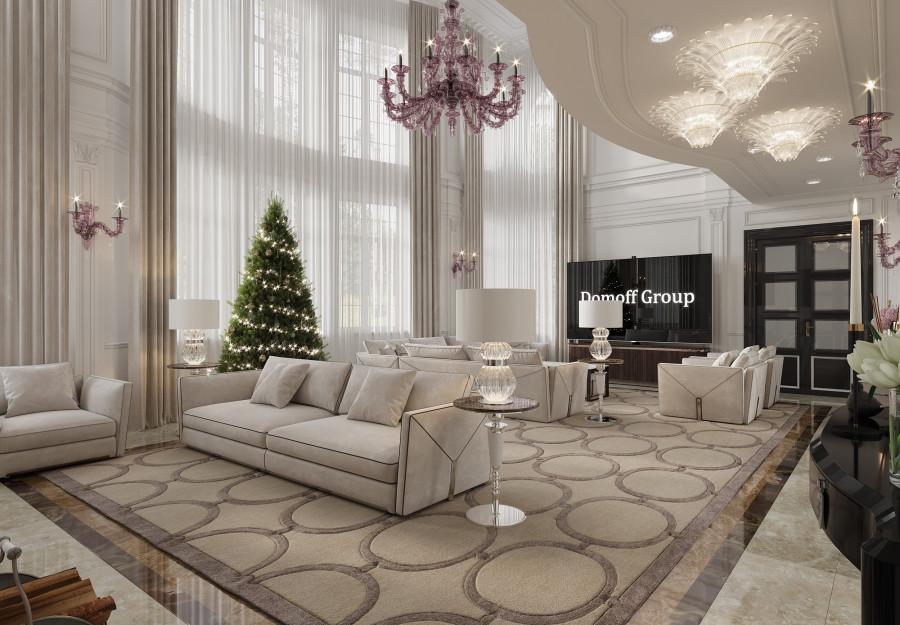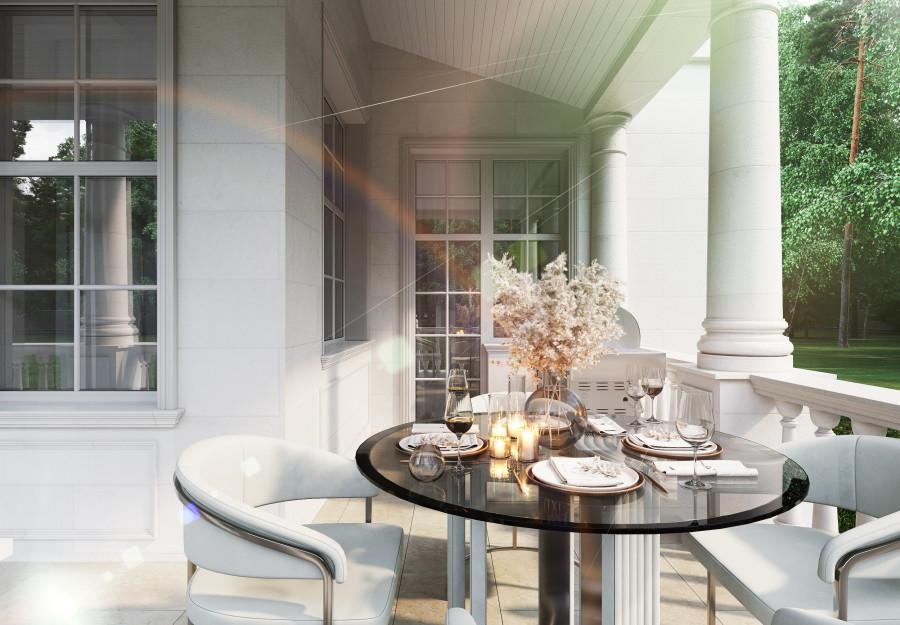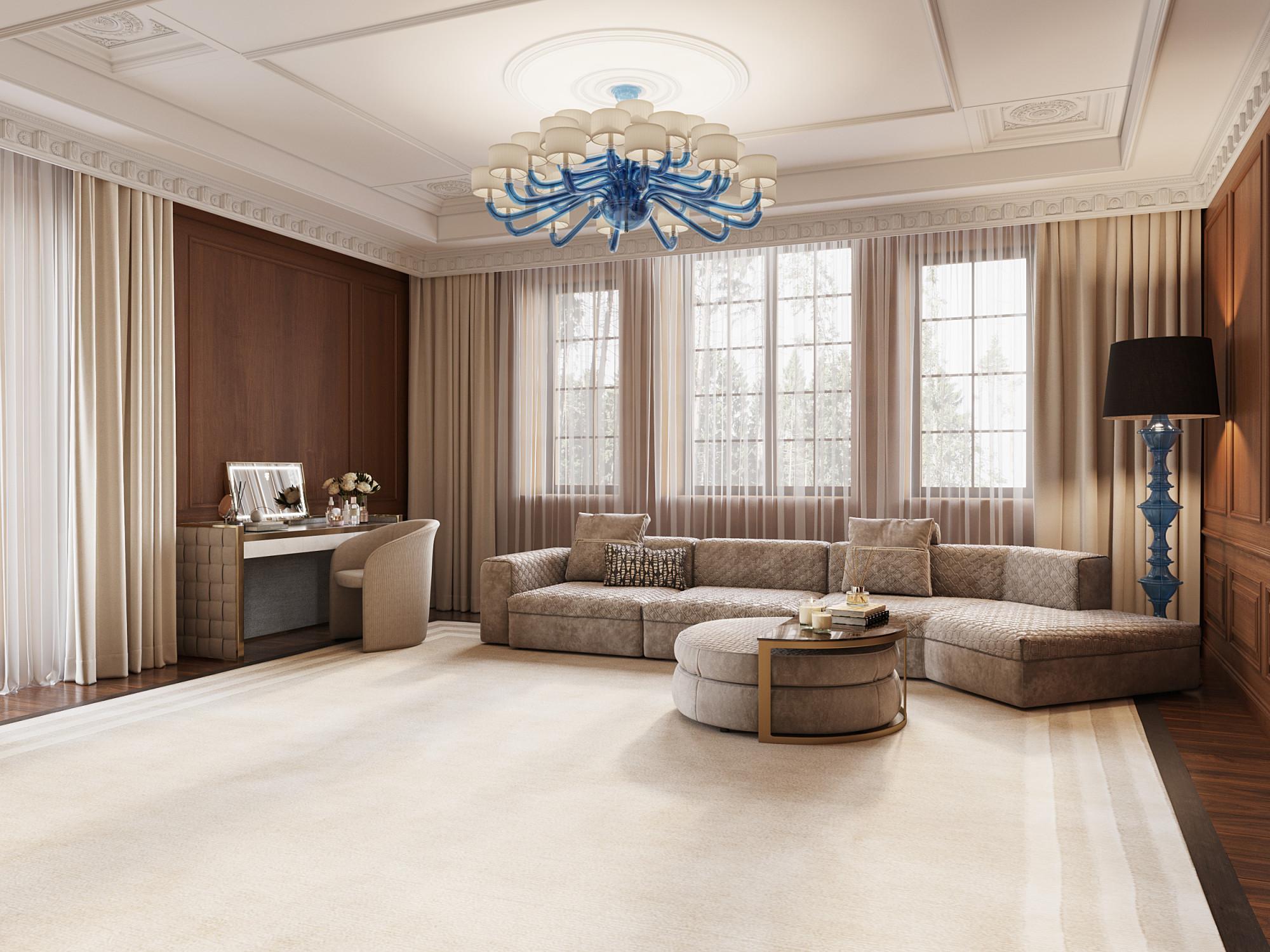Интерьер дома выдержан в классическом стиле с элементами роскоши и предметами современного дизайна, что делает пространство одновременно элегантным и комфортным. Одним из главных хитов проекта является холл: здесь пол выполнен из мрамора с уникальным узором, где черные и белые элементы переплетаются, создавая эффект водной глади. Золотые скульптуры на пьедесталах добавляют интерьеру динамики и подчеркивают статусность. Они выполнены в виде животных, что придает пространству нотку экзотики. Цветовая палитра в основном светлая, за счет чего комнаты смотрятся просторнее. Бонус: две террасы с уютной зоной отдыха.