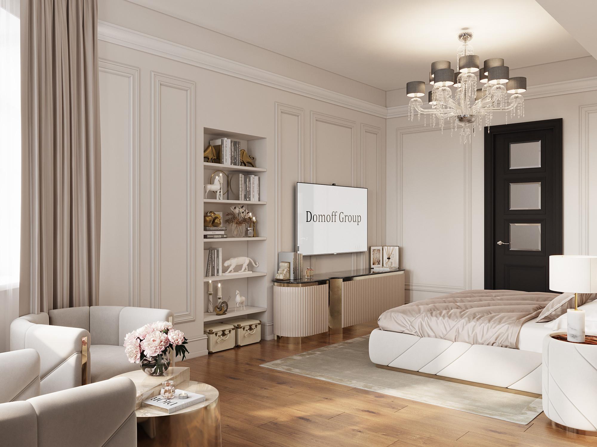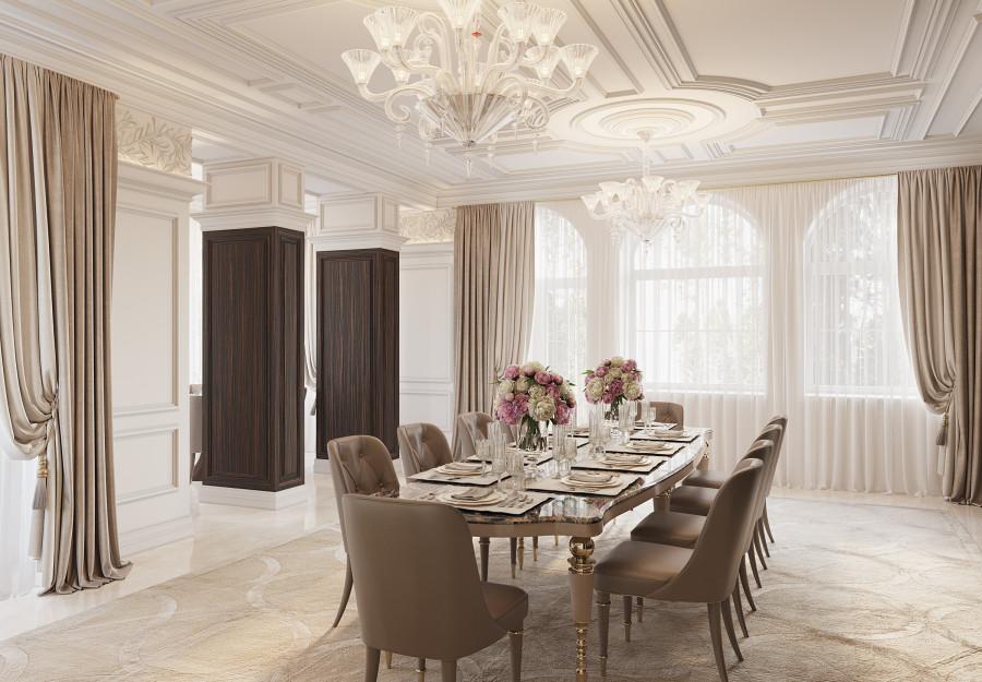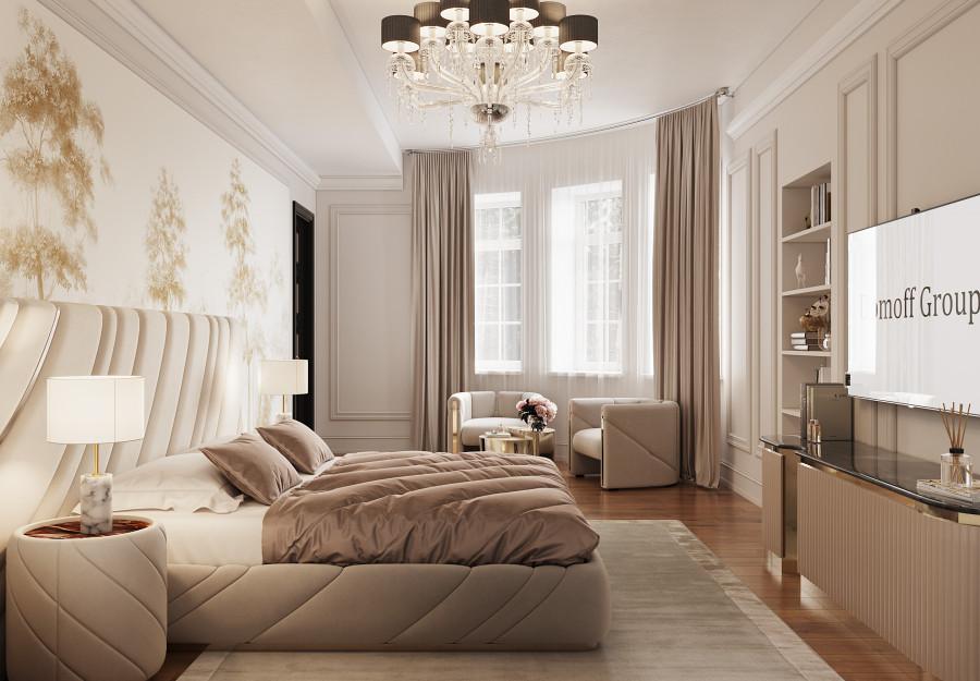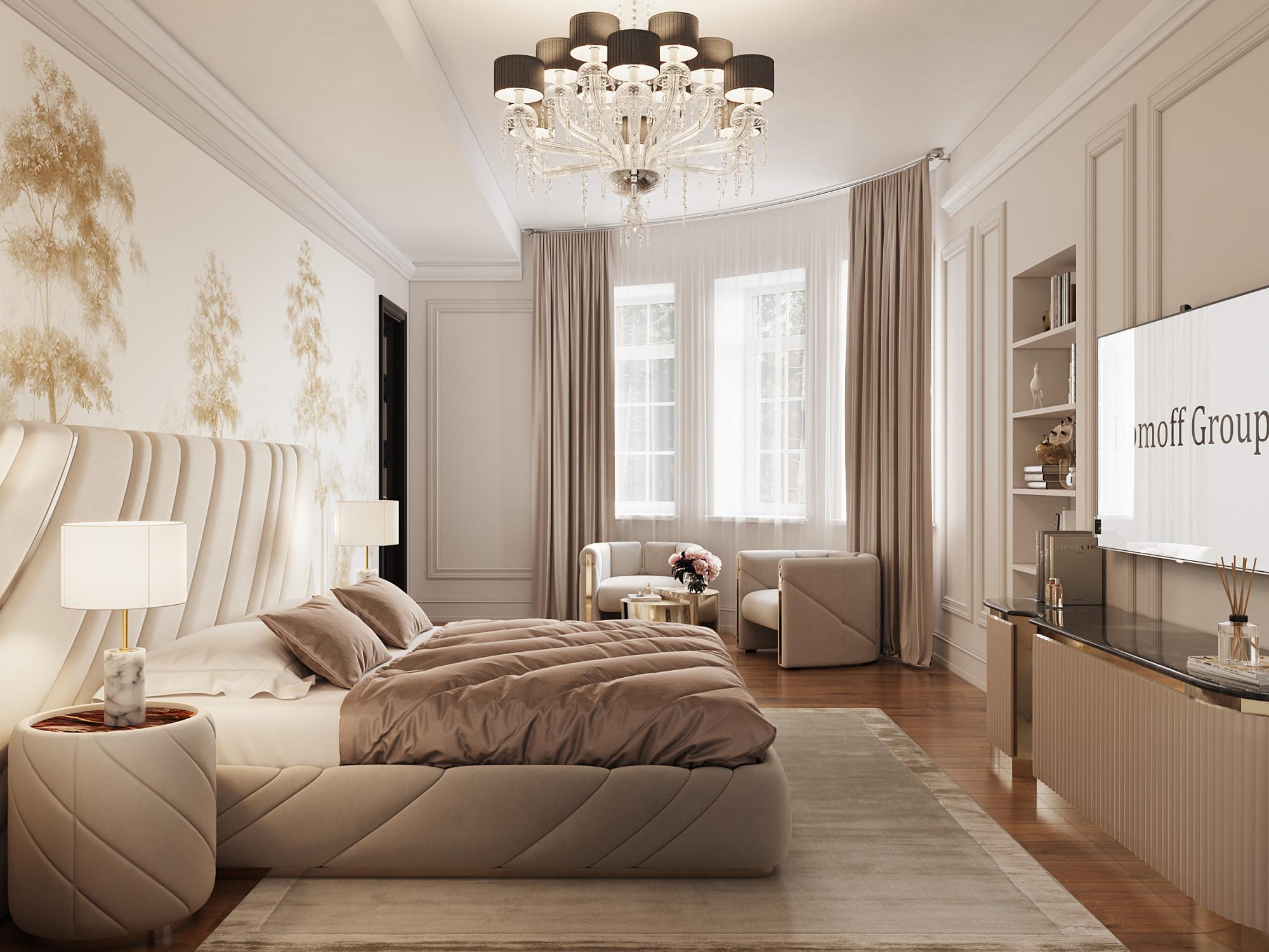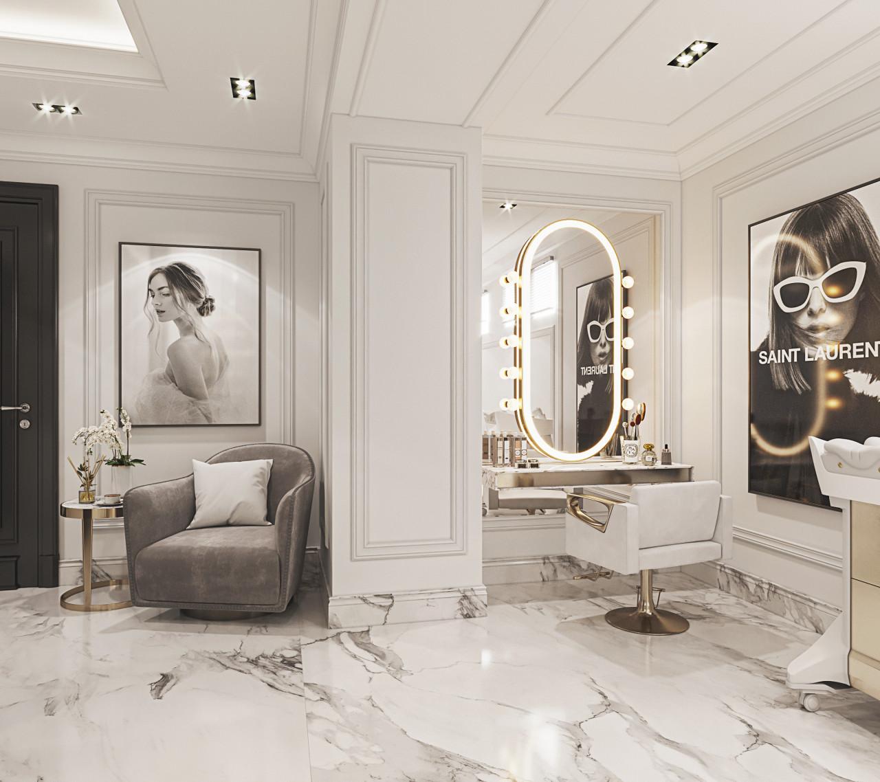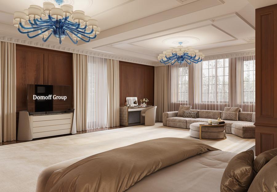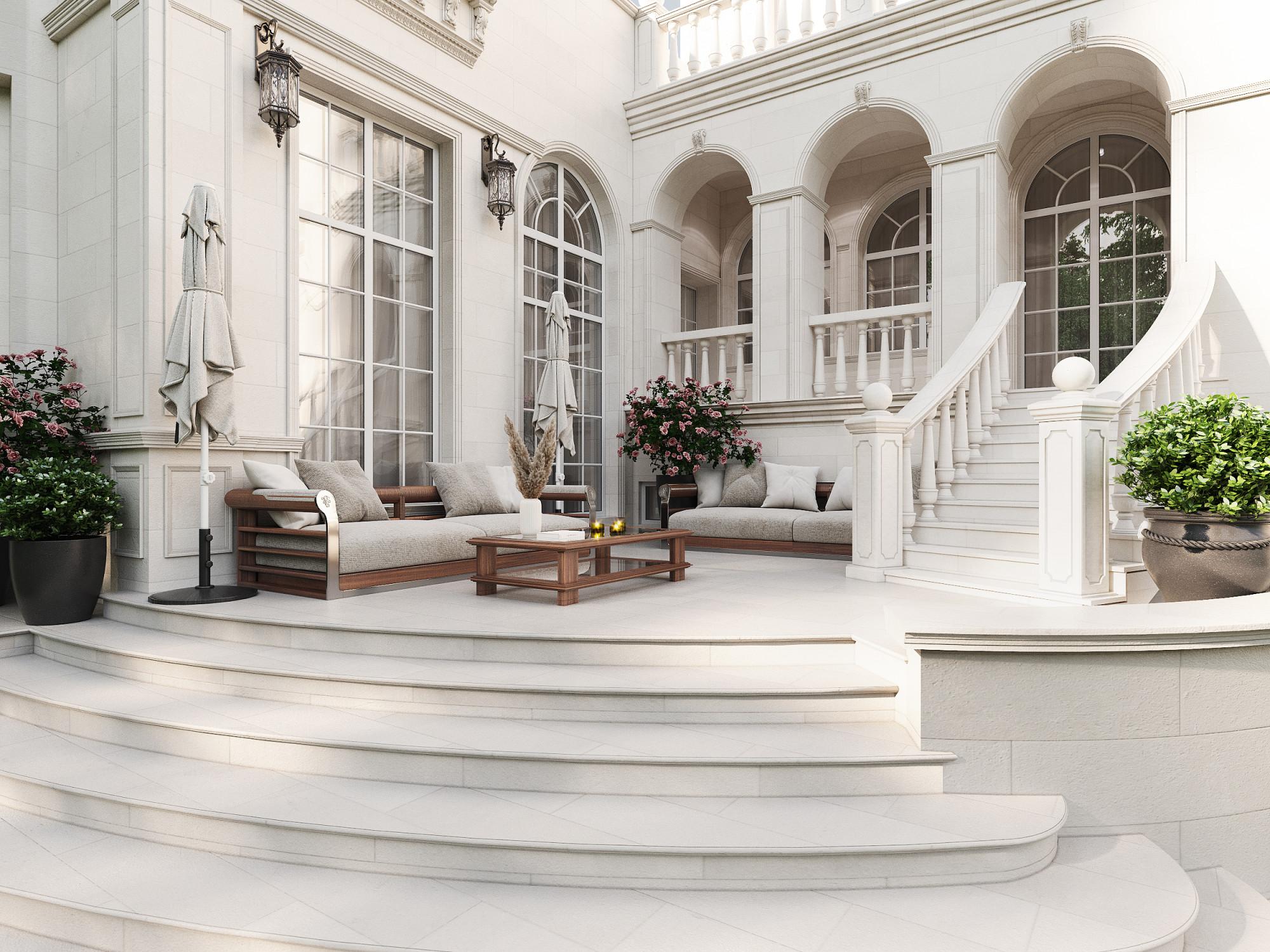 Интерьер дома выдержан в классическом стиле с элементами роскоши и предметами современного дизайна, что делает пространство одновременно элегантным и комфортным. Одним из главных хитов проекта является холл: здесь пол выполнен из мрамора с уникальным узором, где черные и белые элементы переплетаются, создавая эффект водной глади. Золотые скульптуры на пьедесталах добавляют интерьеру динамики и подчеркивают статусность. Они выполнены в виде животных, что придает пространству нотку экзотики. Цветовая палитра в основном светлая, за счет чего комнаты смотрятся просторнее. Бонус: две террасы с уютной зоной отдыха.