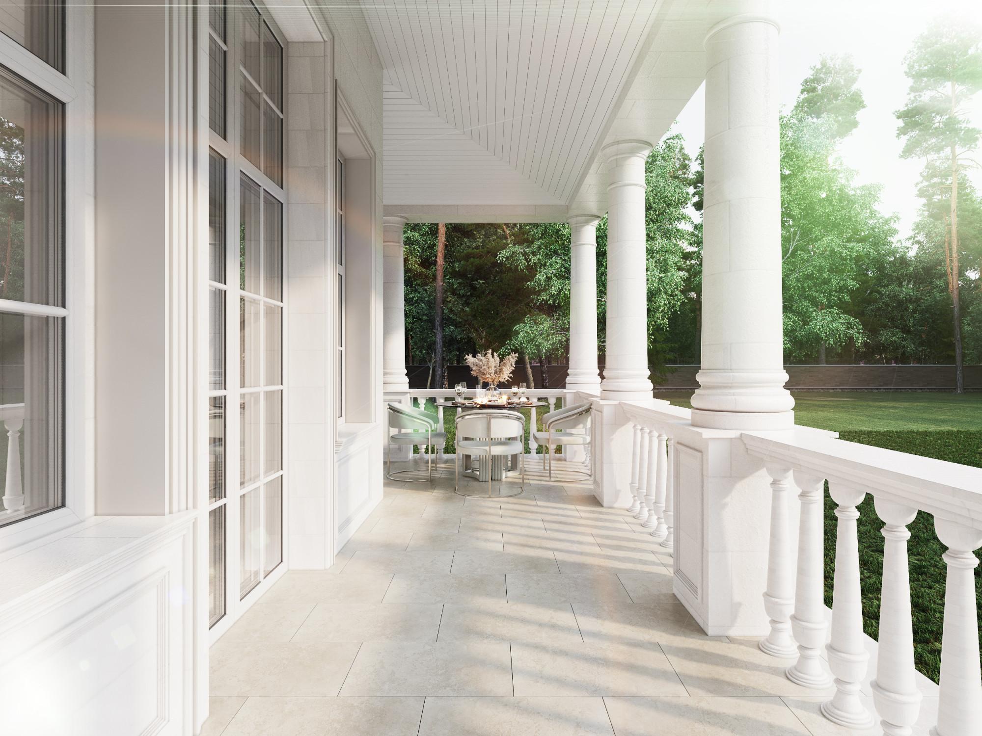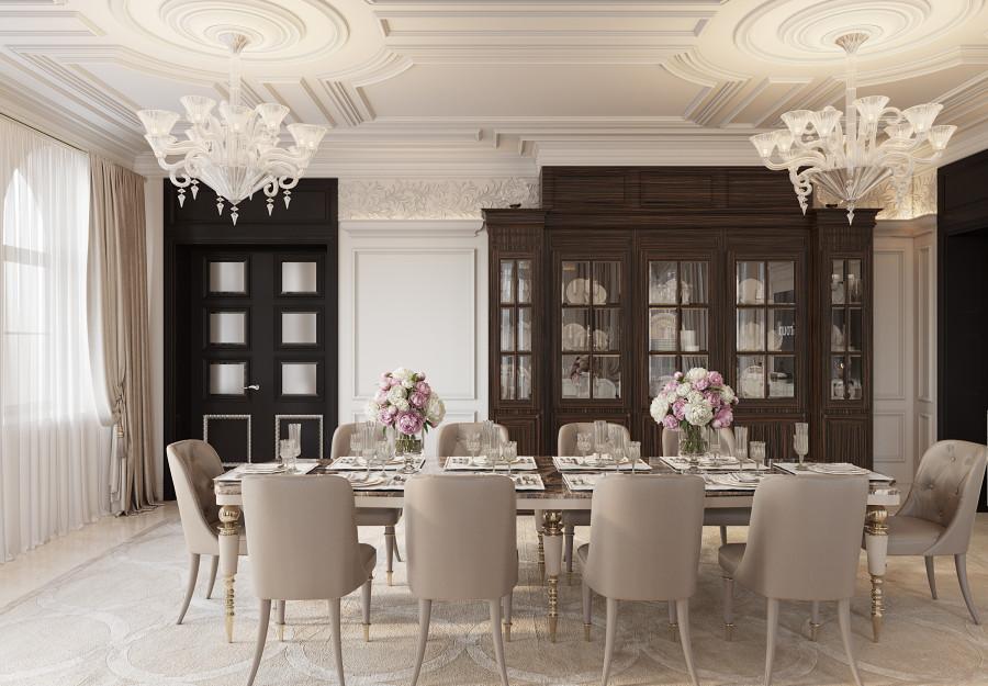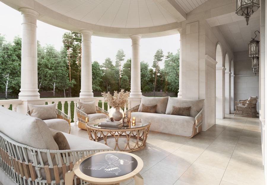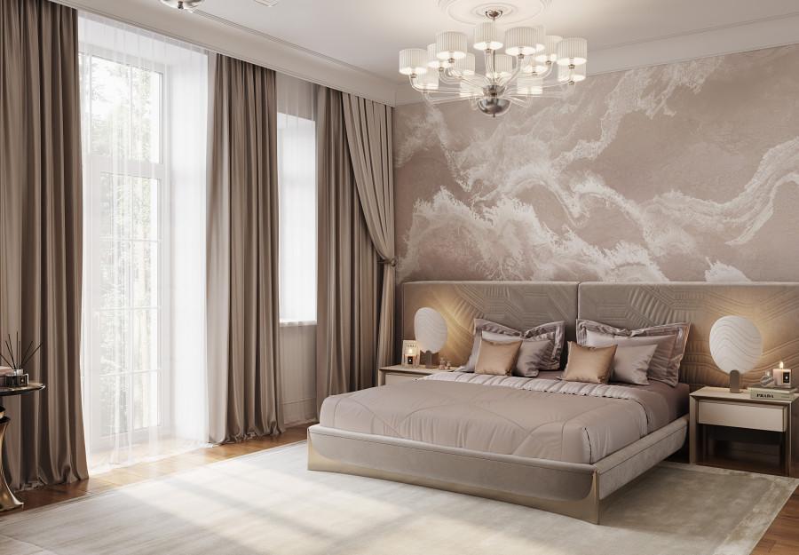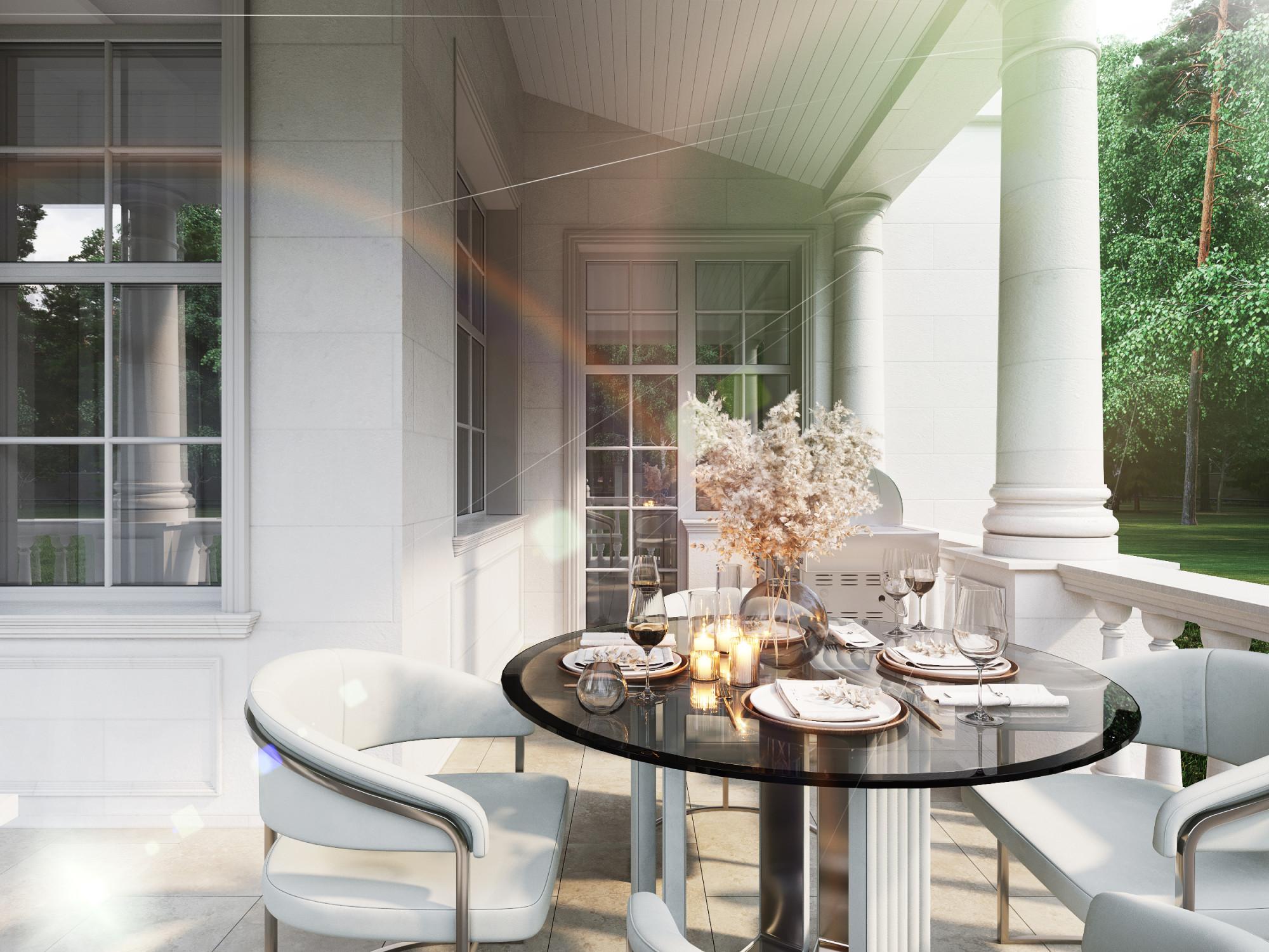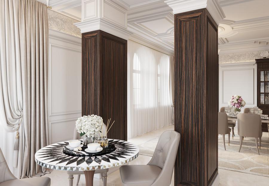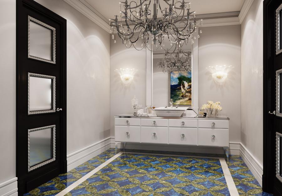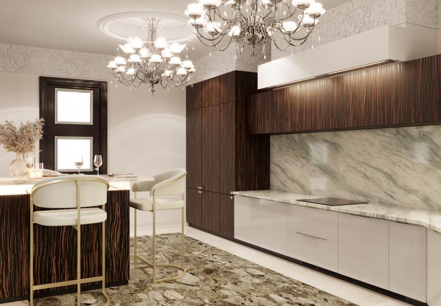 Интерьер дома выдержан в классическом стиле с элементами роскоши и предметами современного дизайна, что делает пространство одновременно элегантным и комфортным. Одним из главных хитов проекта является холл: здесь пол выполнен из мрамора с уникальным узором, где черные и белые элементы переплетаются, создавая эффект водной глади. Золотые скульптуры на пьедесталах добавляют интерьеру динамики и подчеркивают статусность. Они выполнены в виде животных, что придает пространству нотку экзотики. Цветовая палитра в основном светлая, за счет чего комнаты смотрятся просторнее. Бонус: две террасы с уютной зоной отдыха.