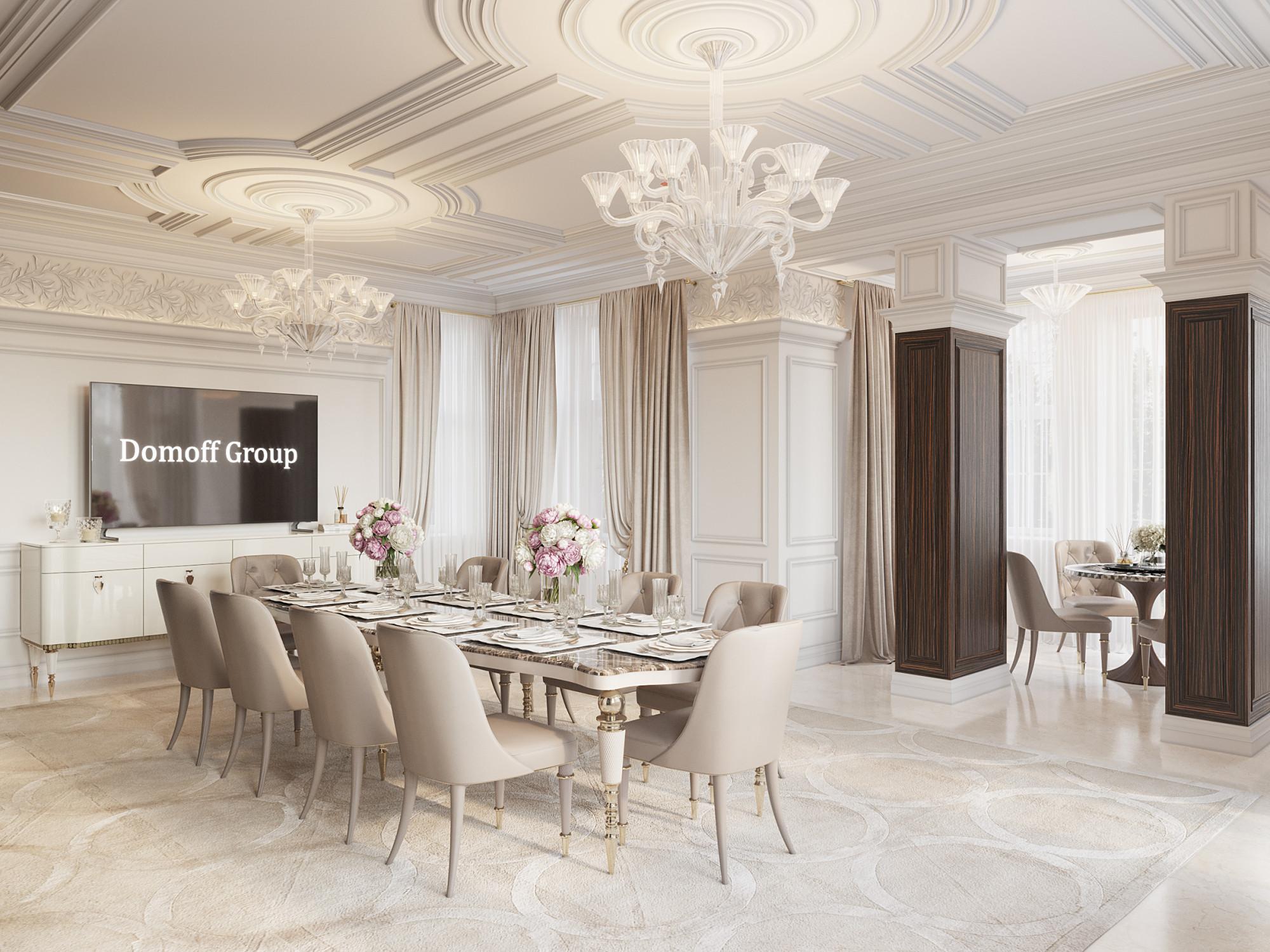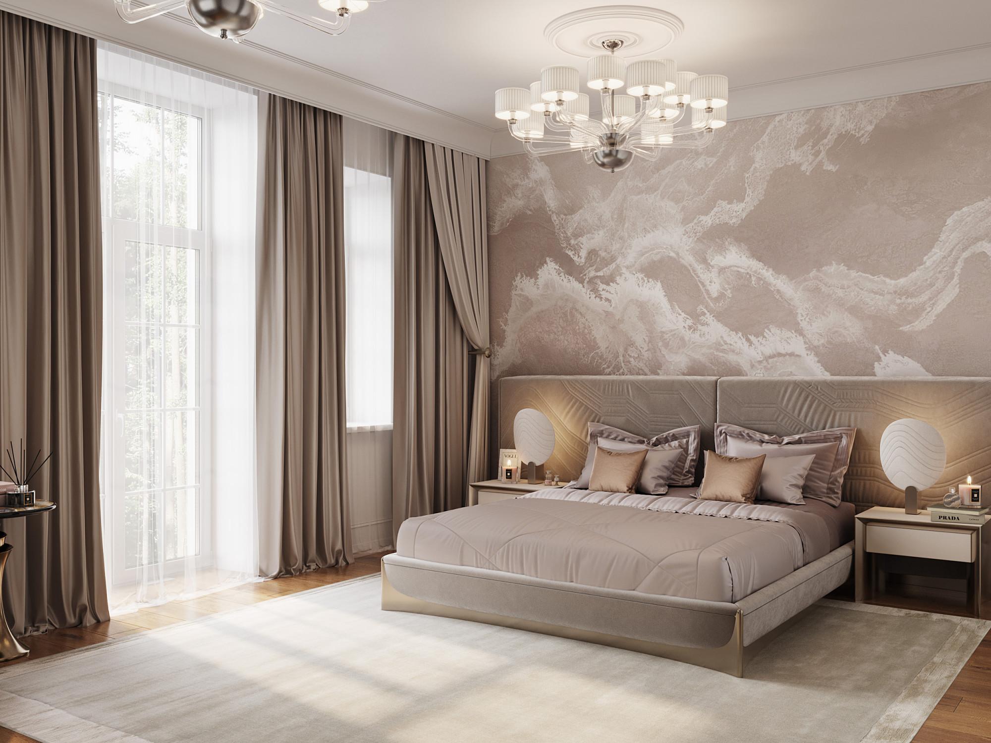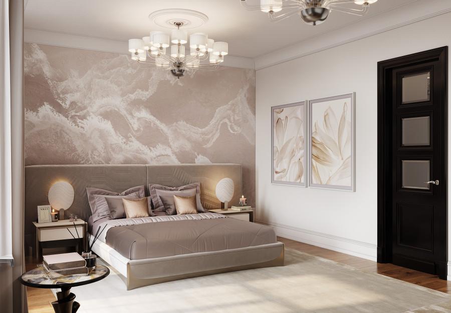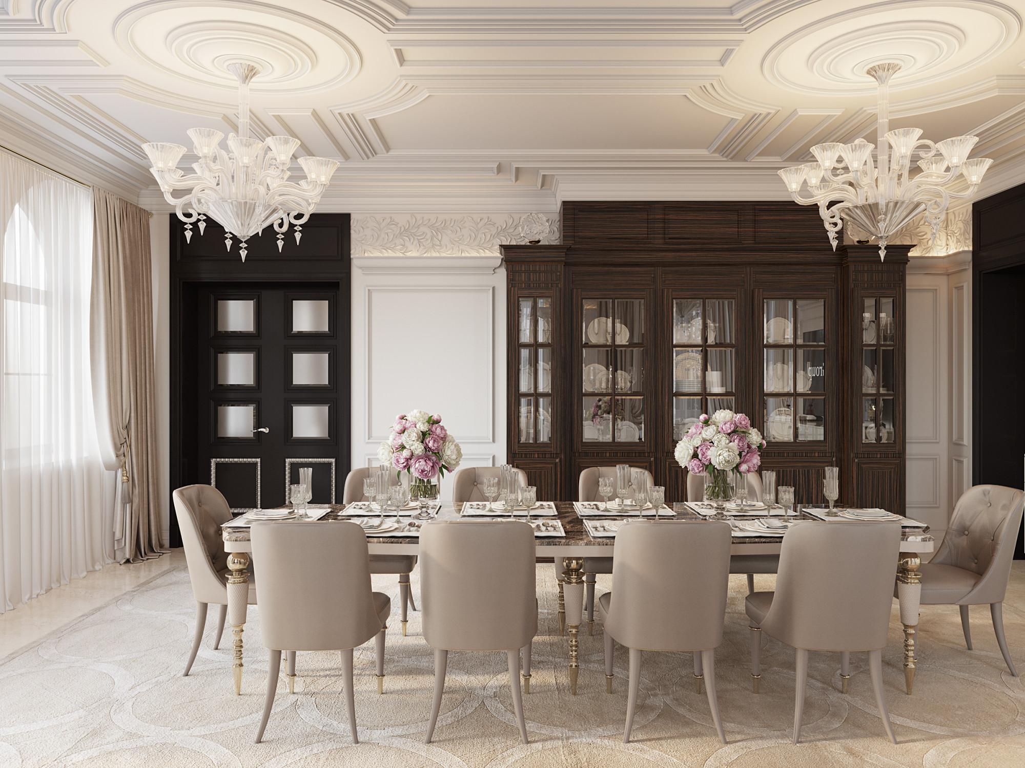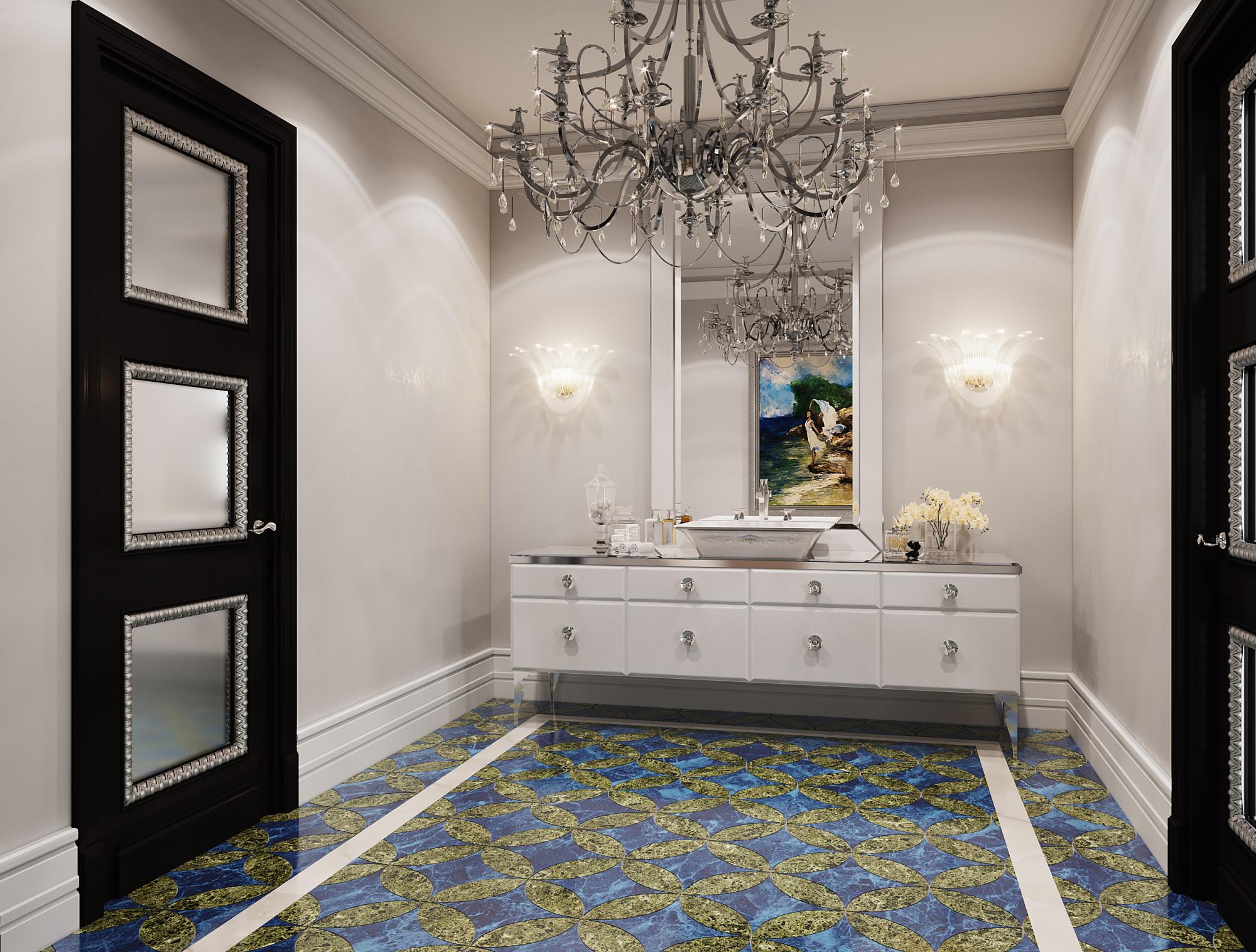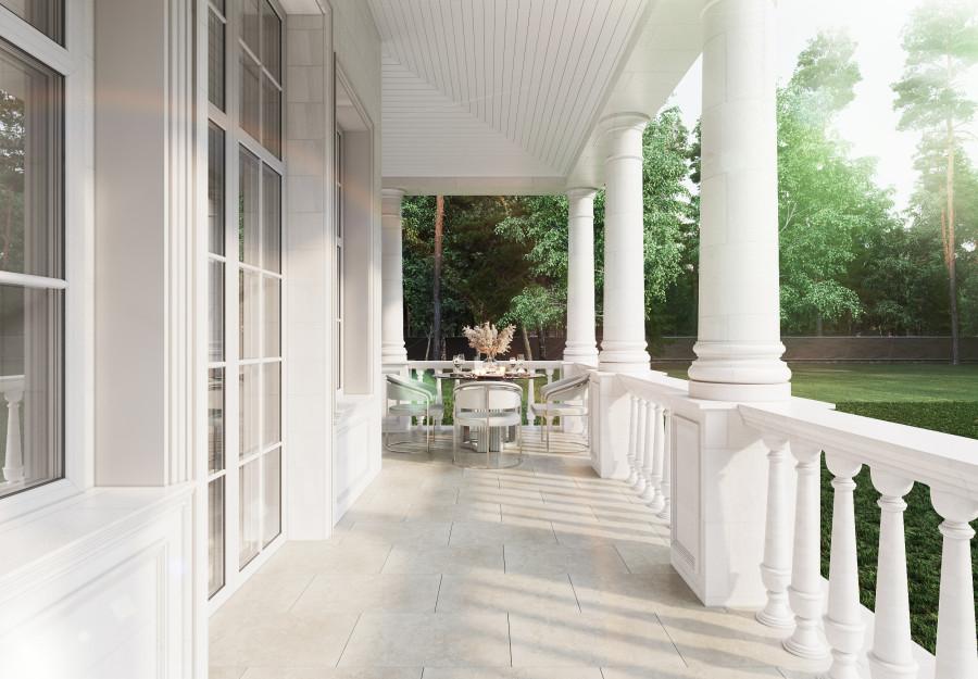 Интерьер дома выдержан в классическом стиле с элементами роскоши и предметами современного дизайна, что делает пространство одновременно элегантным и комфортным. Одним из главных хитов проекта является холл: здесь пол выполнен из мрамора с уникальным узором, где черные и белые элементы переплетаются, создавая эффект водной глади. Золотые скульптуры на пьедесталах добавляют интерьеру динамики и подчеркивают статусность. Они выполнены в виде животных, что придает пространству нотку экзотики. Цветовая палитра в основном светлая, за счет чего комнаты смотрятся просторнее. Бонус: две террасы с уютной зоной отдыха.