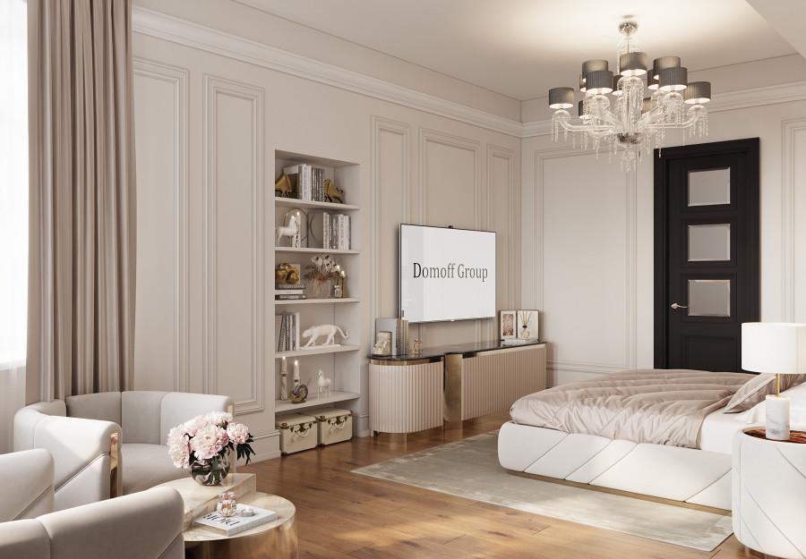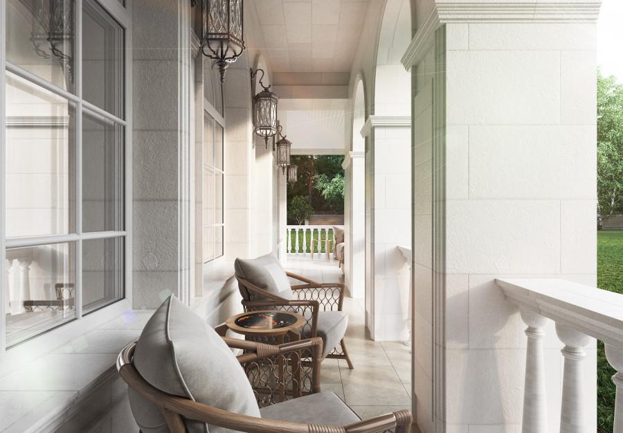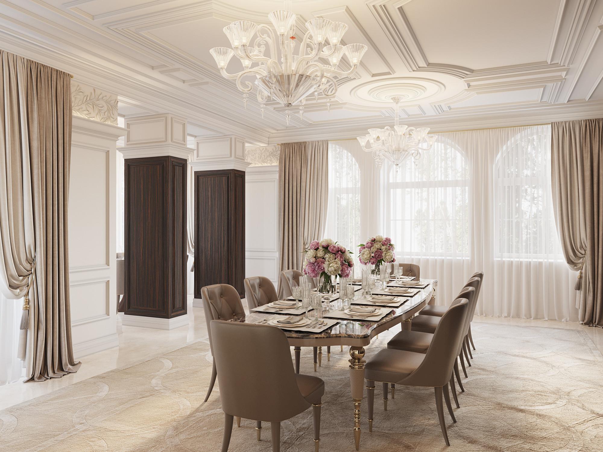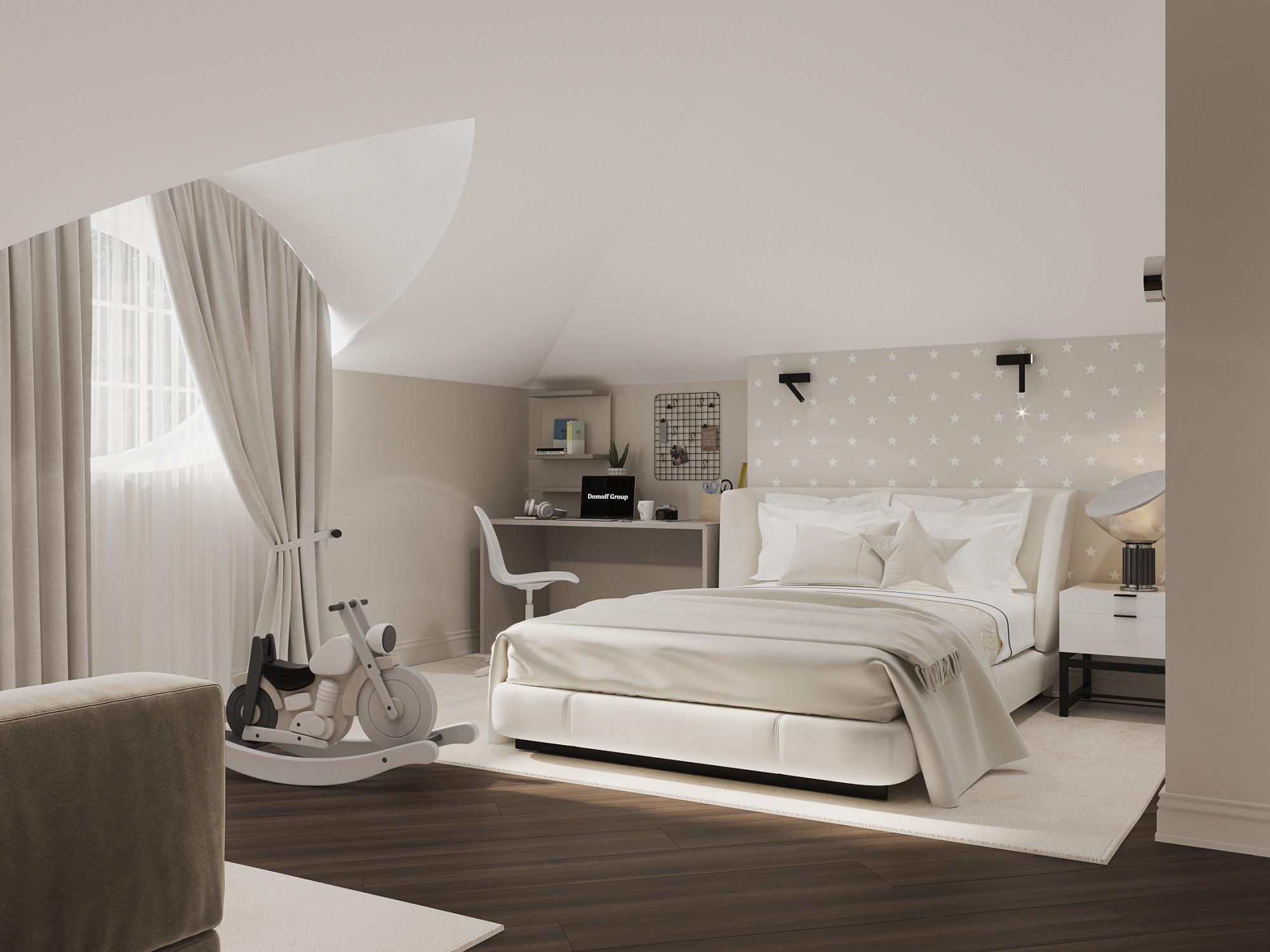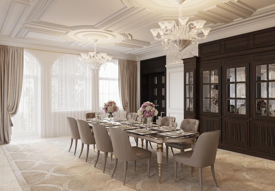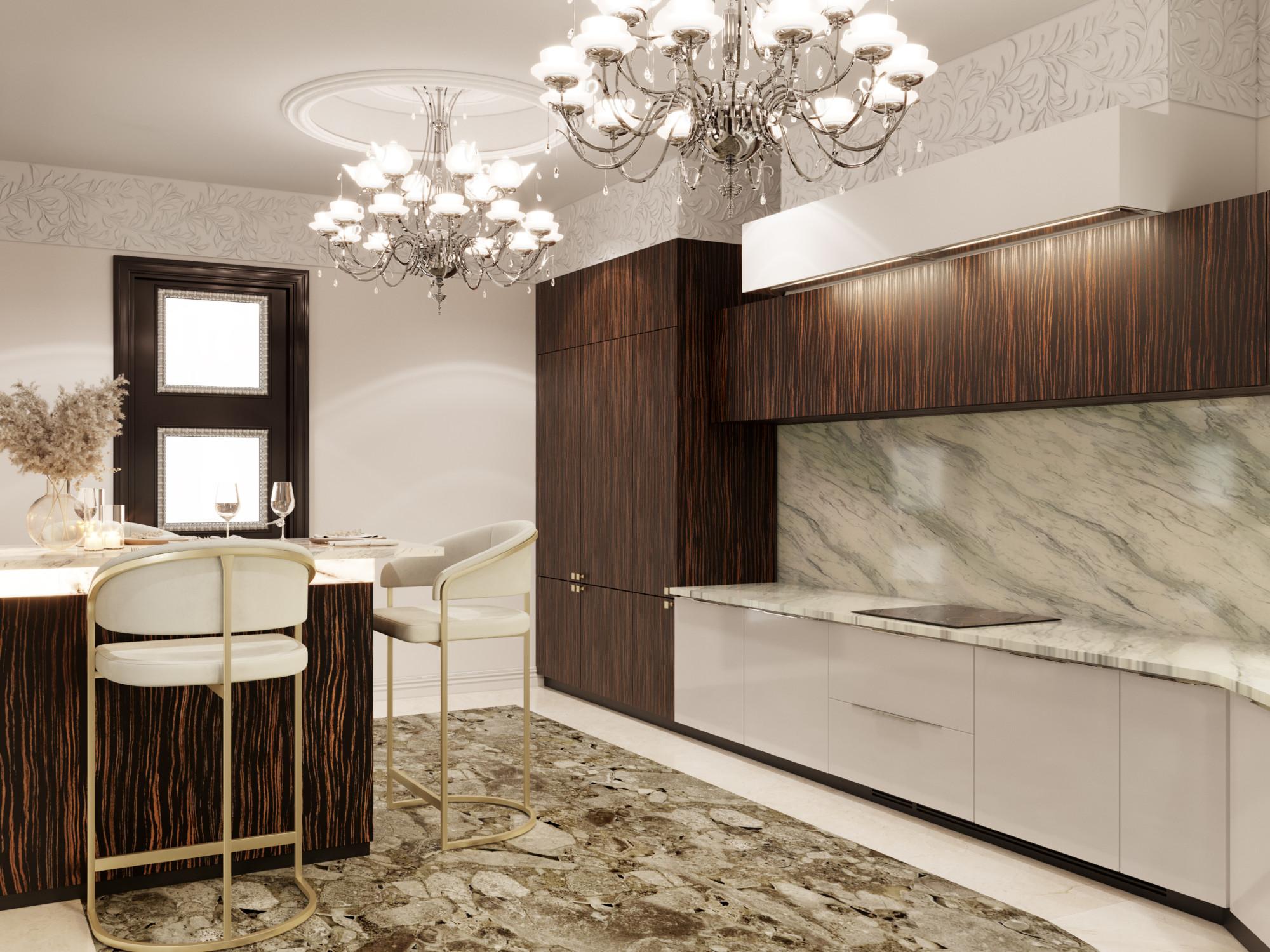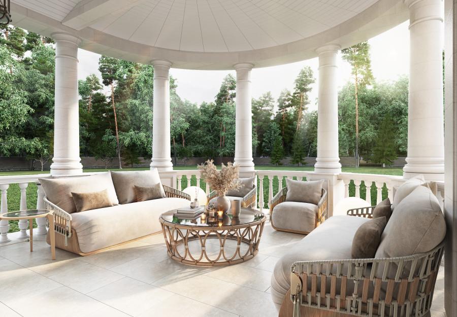 Интерьер дома выдержан в классическом стиле с элементами роскоши и предметами современного дизайна, что делает пространство одновременно элегантным и комфортным. Одним из главных хитов проекта является холл: здесь пол выполнен из мрамора с уникальным узором, где черные и белые элементы переплетаются, создавая эффект водной глади. Золотые скульптуры на пьедесталах добавляют интерьеру динамики и подчеркивают статусность. Они выполнены в виде животных, что придает пространству нотку экзотики. Цветовая палитра в основном светлая, за счет чего комнаты смотрятся просторнее. Бонус: две террасы с уютной зоной отдыха.