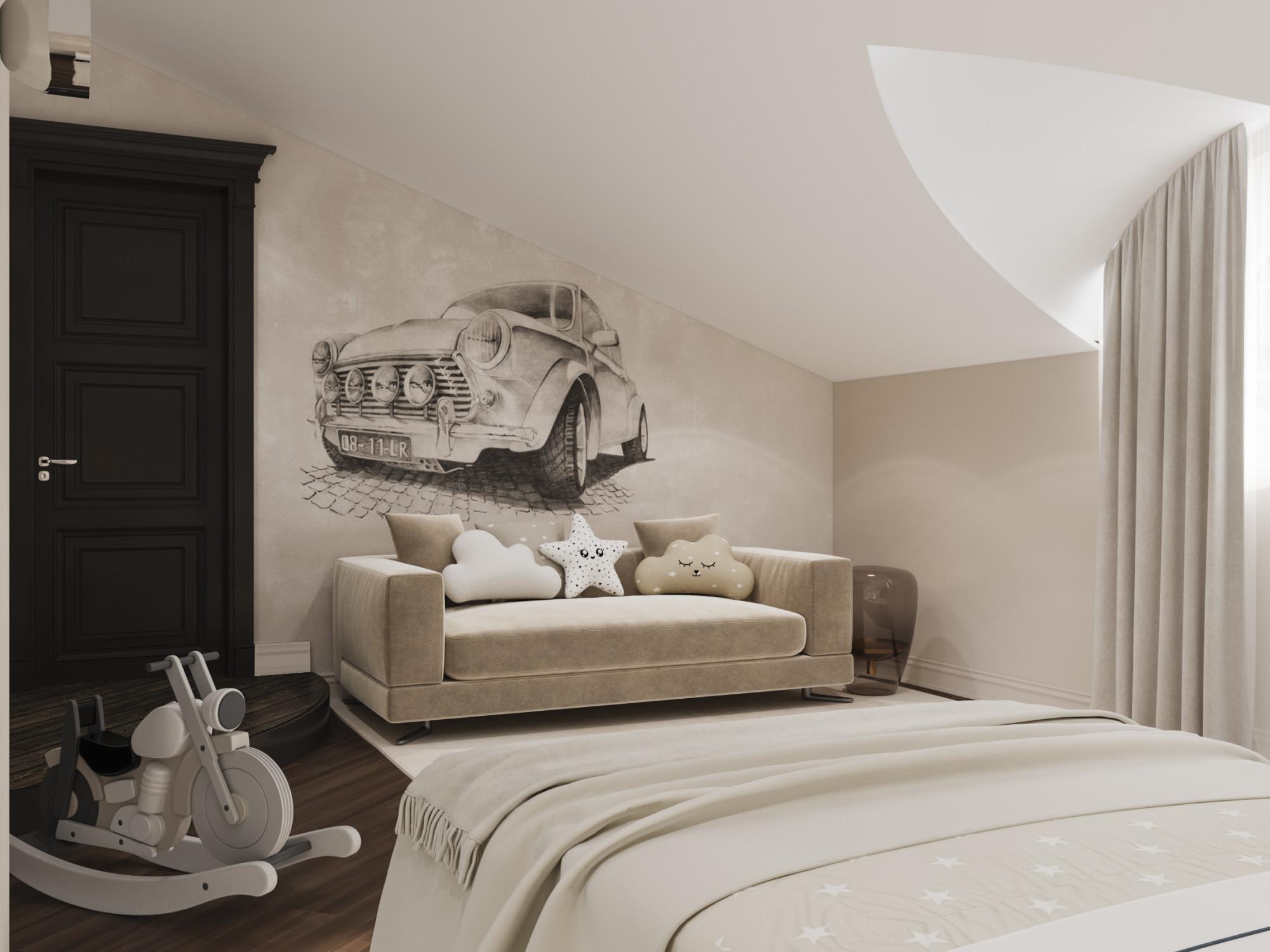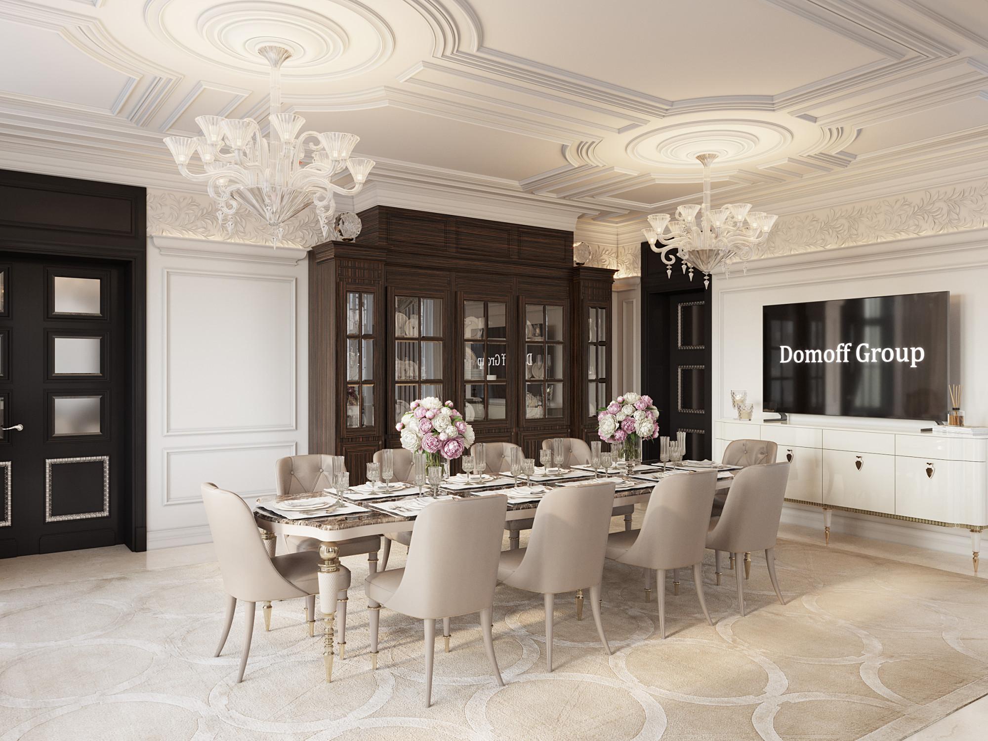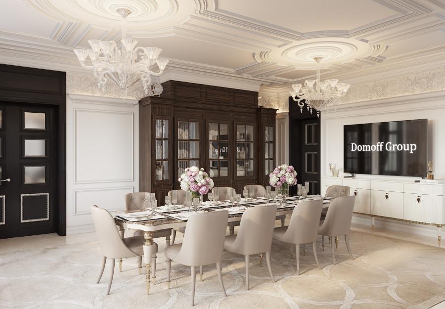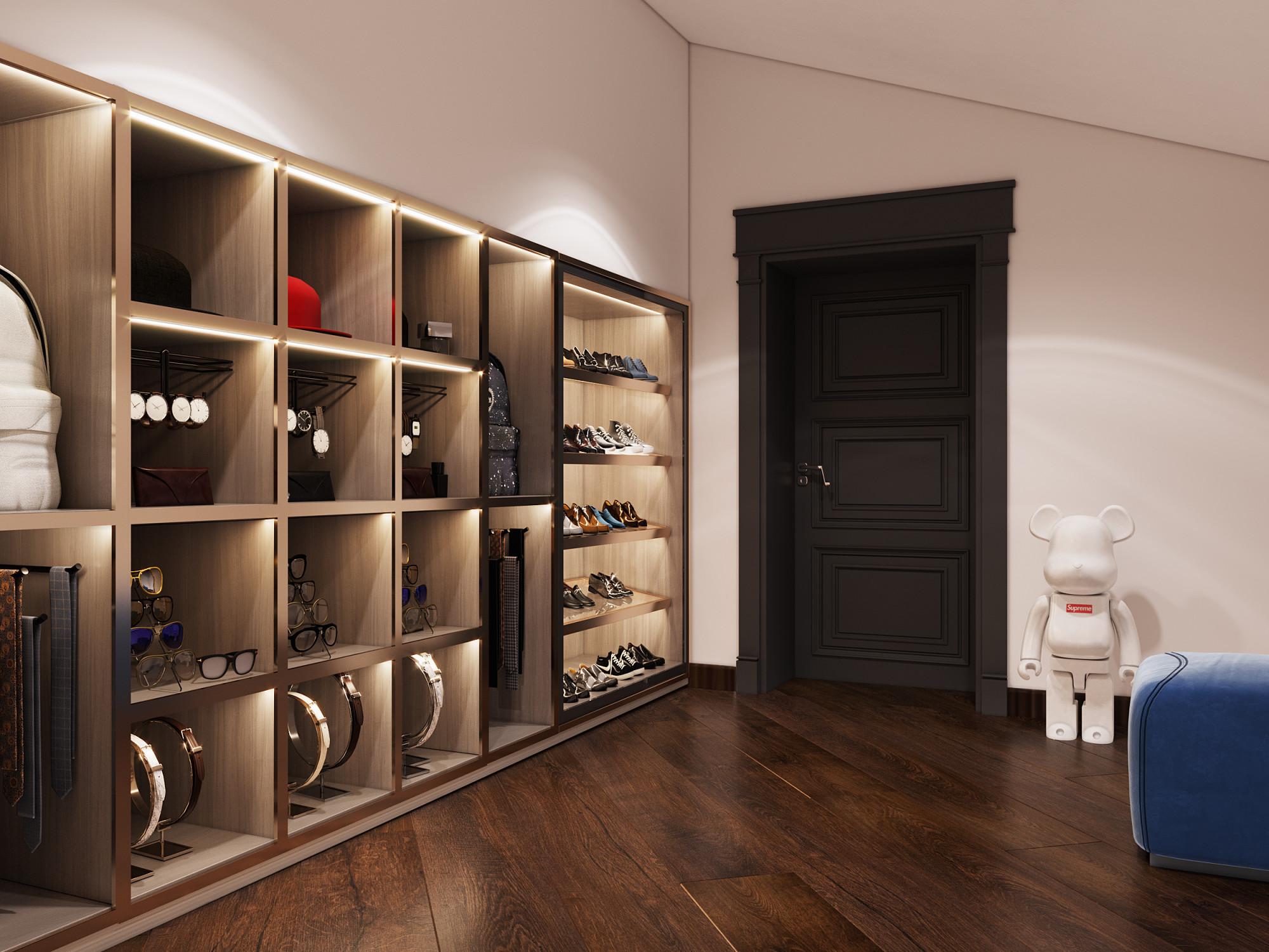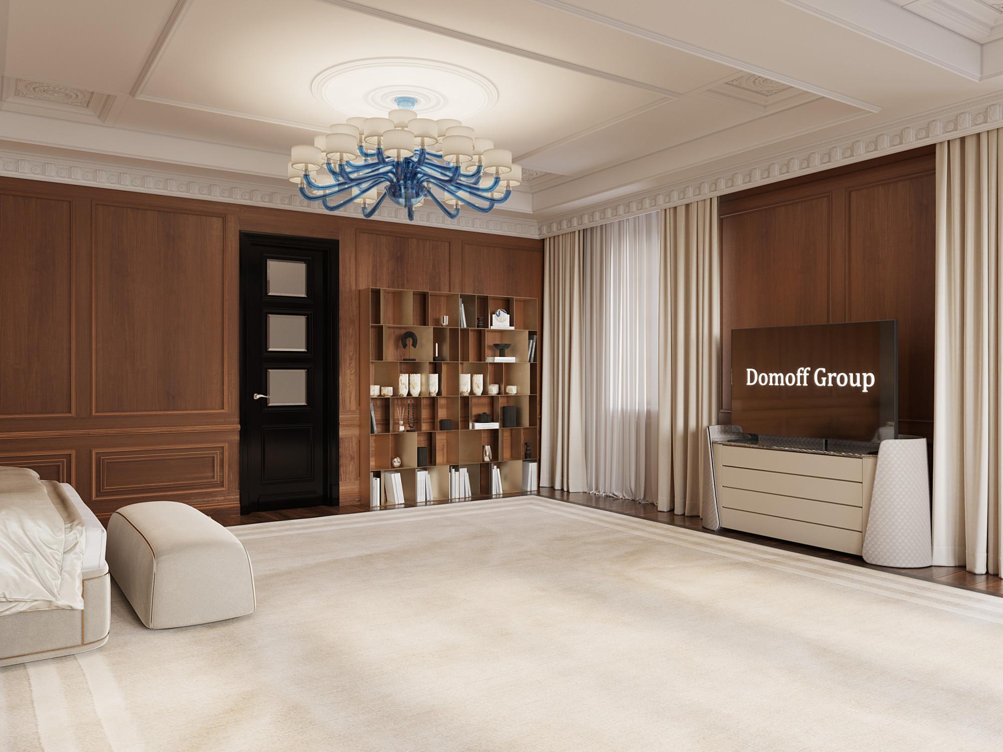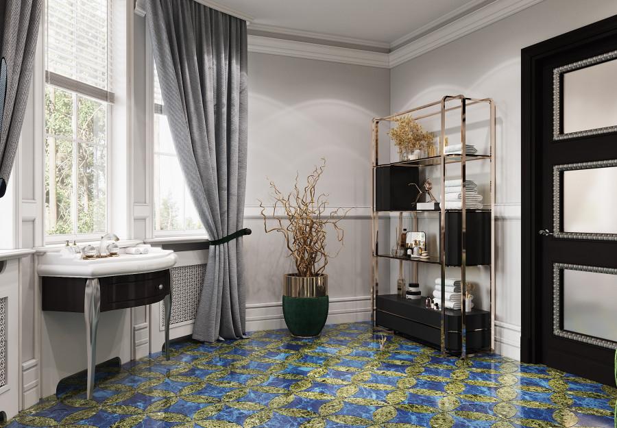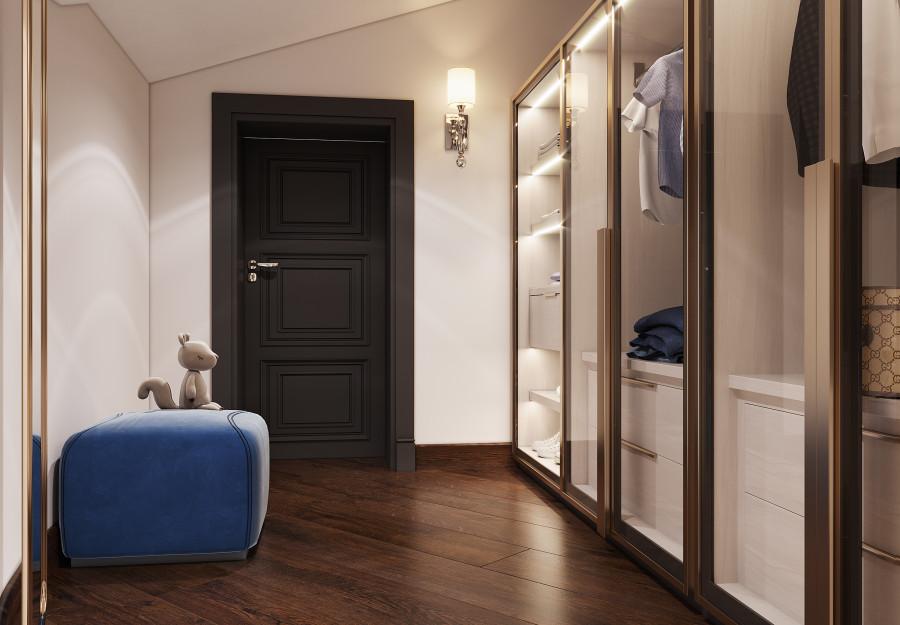 Интерьер дома выдержан в классическом стиле с элементами роскоши и предметами современного дизайна, что делает пространство одновременно элегантным и комфортным. Одним из главных хитов проекта является холл: здесь пол выполнен из мрамора с уникальным узором, где черные и белые элементы переплетаются, создавая эффект водной глади. Золотые скульптуры на пьедесталах добавляют интерьеру динамики и подчеркивают статусность. Они выполнены в виде животных, что придает пространству нотку экзотики. Цветовая палитра в основном светлая, за счет чего комнаты смотрятся просторнее. Бонус: две террасы с уютной зоной отдыха.