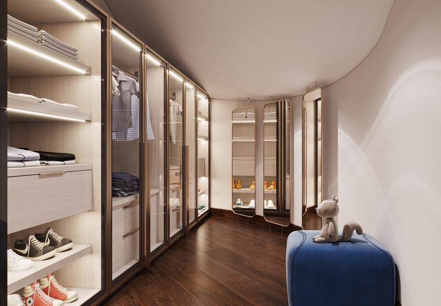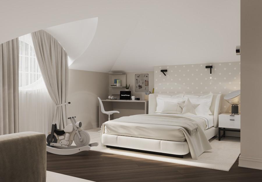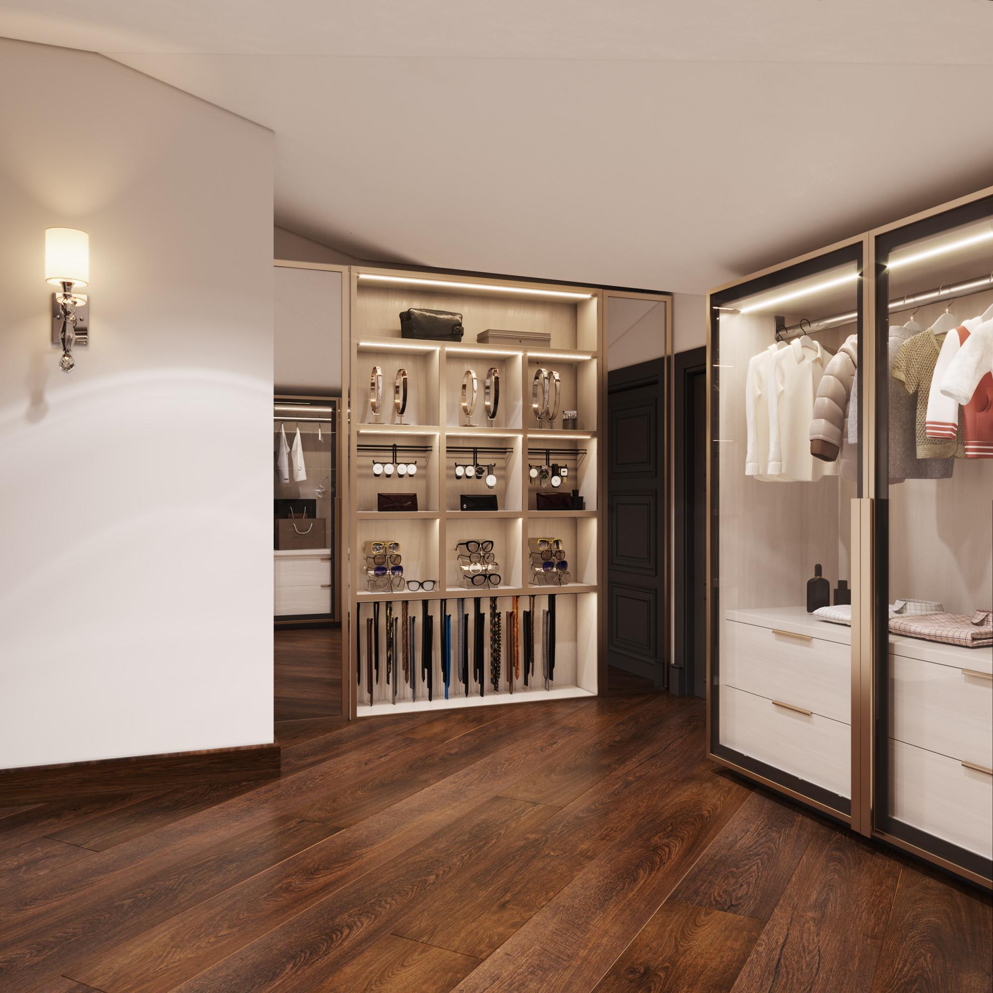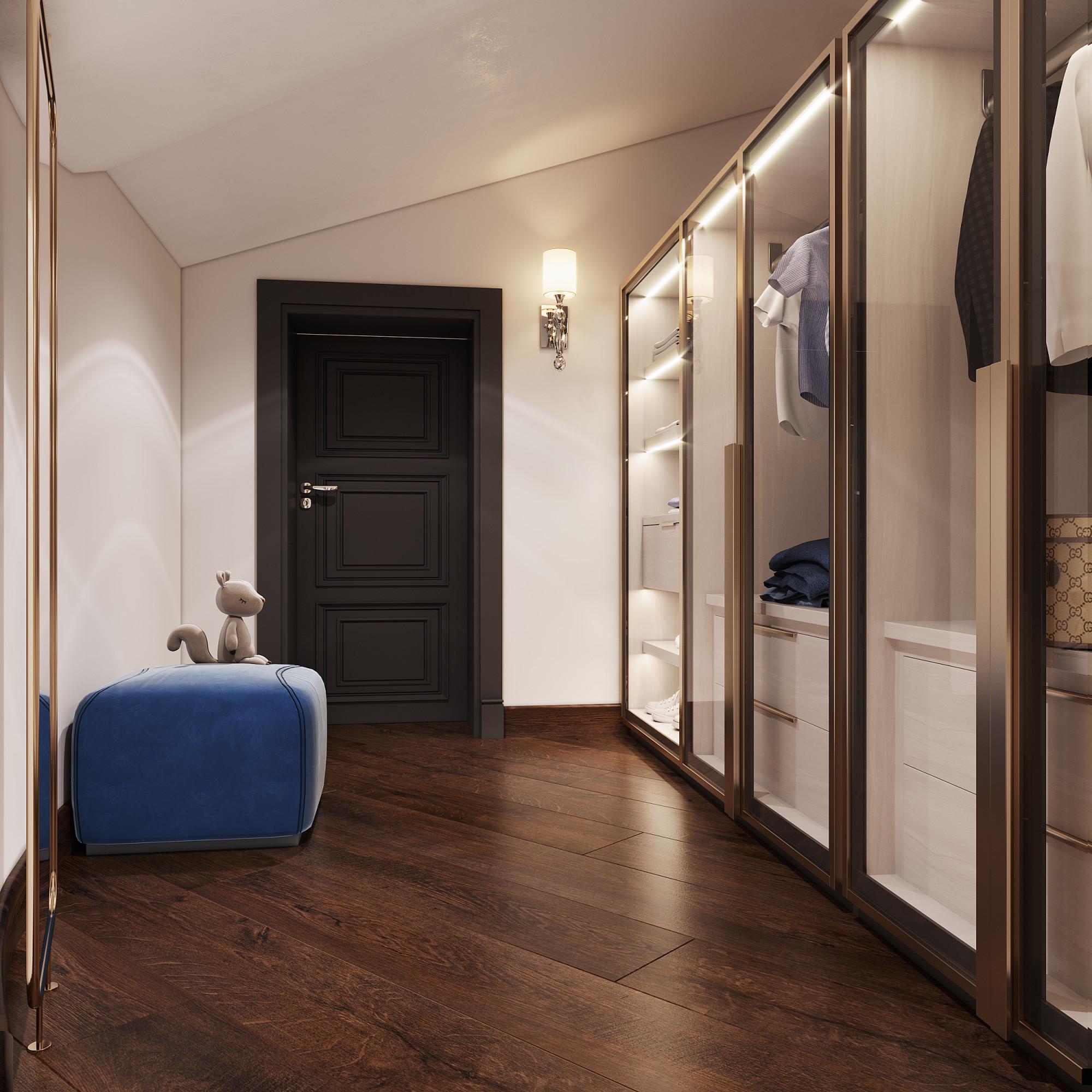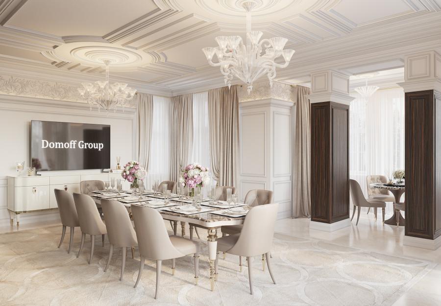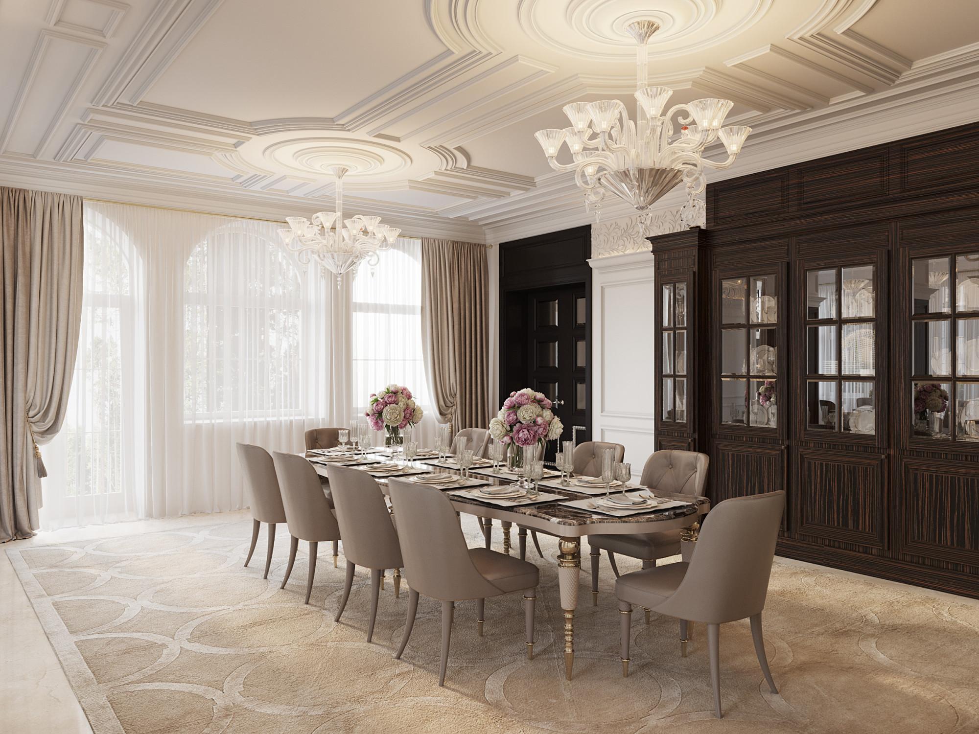 Интерьер дома выдержан в классическом стиле с элементами роскоши и предметами современного дизайна, что делает пространство одновременно элегантным и комфортным. Одним из главных хитов проекта является холл: здесь пол выполнен из мрамора с уникальным узором, где черные и белые элементы переплетаются, создавая эффект водной глади. Золотые скульптуры на пьедесталах добавляют интерьеру динамики и подчеркивают статусность. Они выполнены в виде животных, что придает пространству нотку экзотики. Цветовая палитра в основном светлая, за счет чего комнаты смотрятся просторнее. Бонус: две террасы с уютной зоной отдыха.