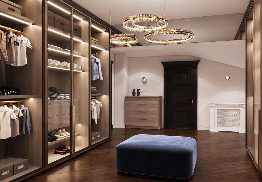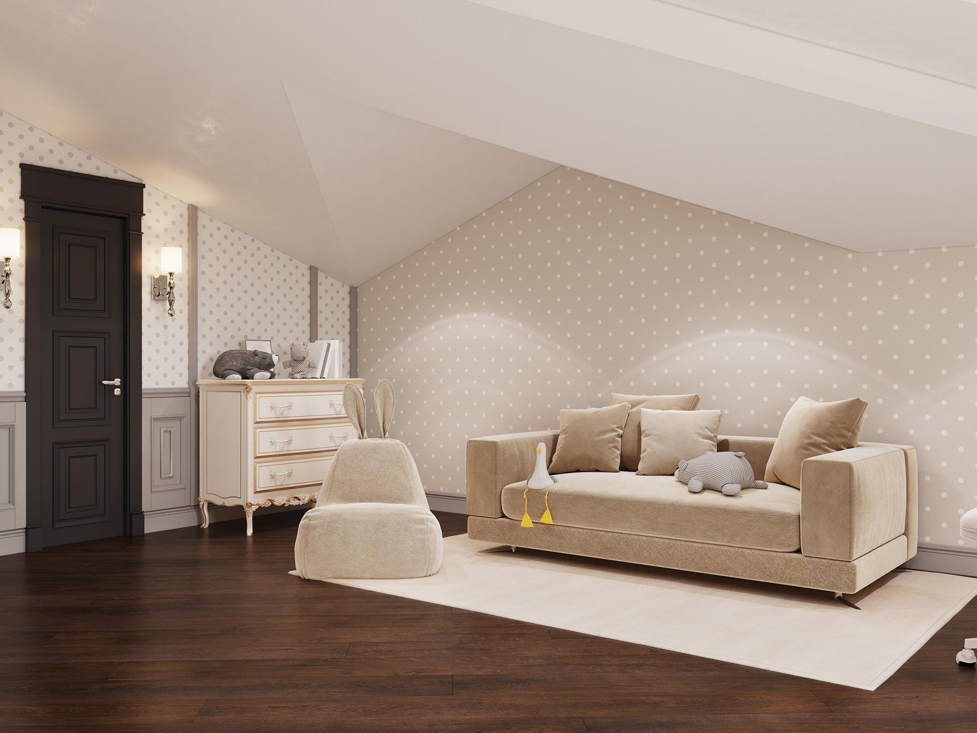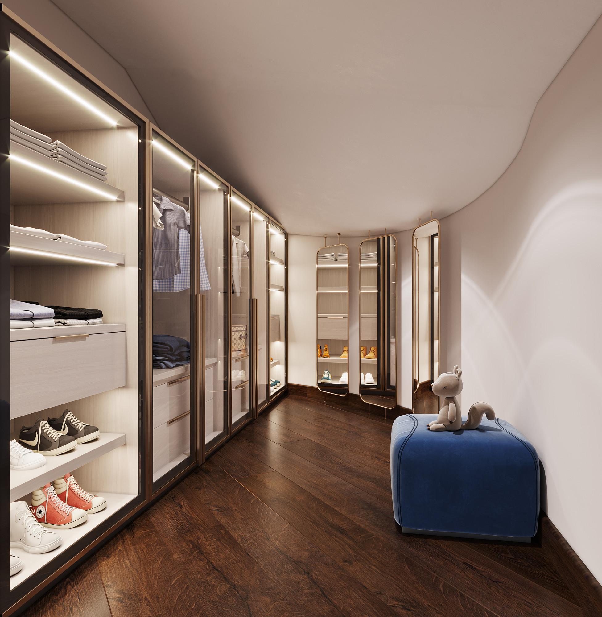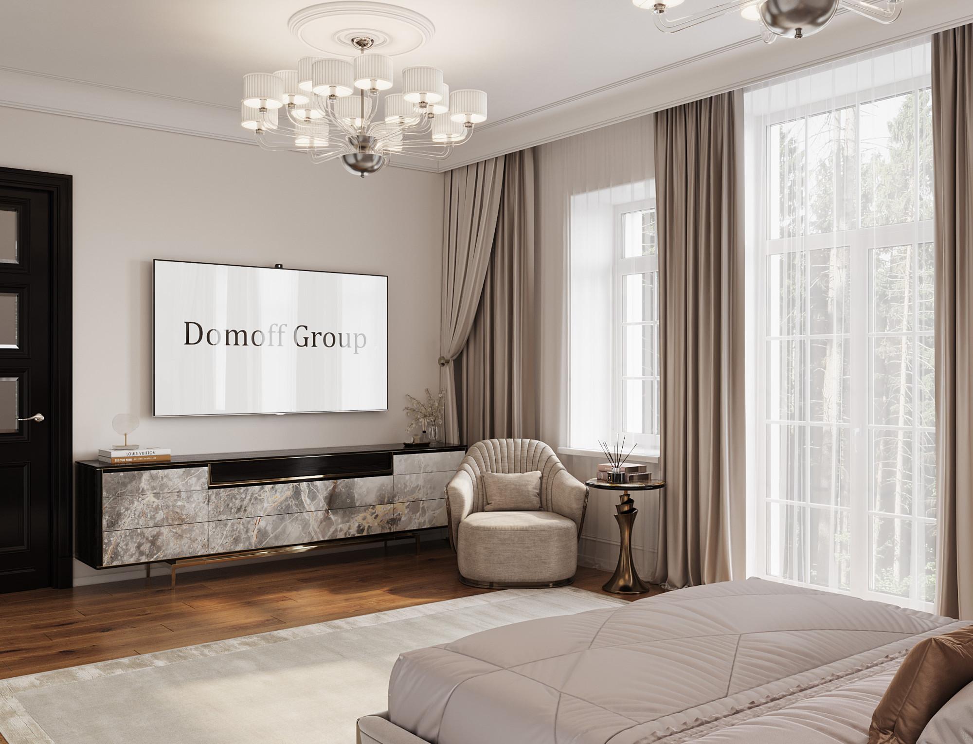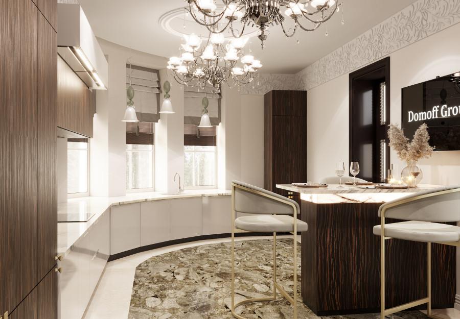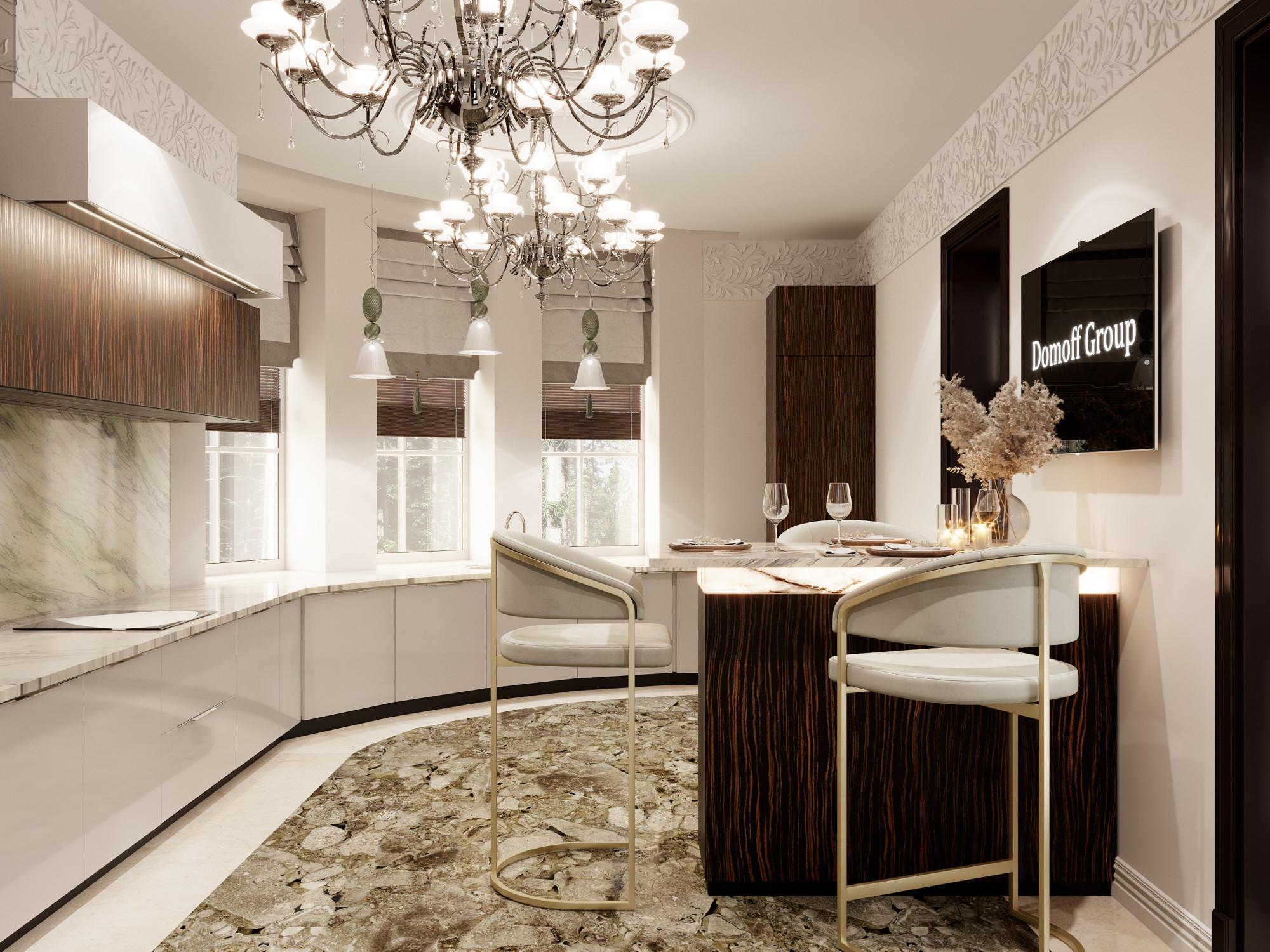 Интерьер дома выдержан в классическом стиле с элементами роскоши и предметами современного дизайна, что делает пространство одновременно элегантным и комфортным. Одним из главных хитов проекта является холл: здесь пол выполнен из мрамора с уникальным узором, где черные и белые элементы переплетаются, создавая эффект водной глади. Золотые скульптуры на пьедесталах добавляют интерьеру динамики и подчеркивают статусность. Они выполнены в виде животных, что придает пространству нотку экзотики. Цветовая палитра в основном светлая, за счет чего комнаты смотрятся просторнее. Бонус: две террасы с уютной зоной отдыха.
