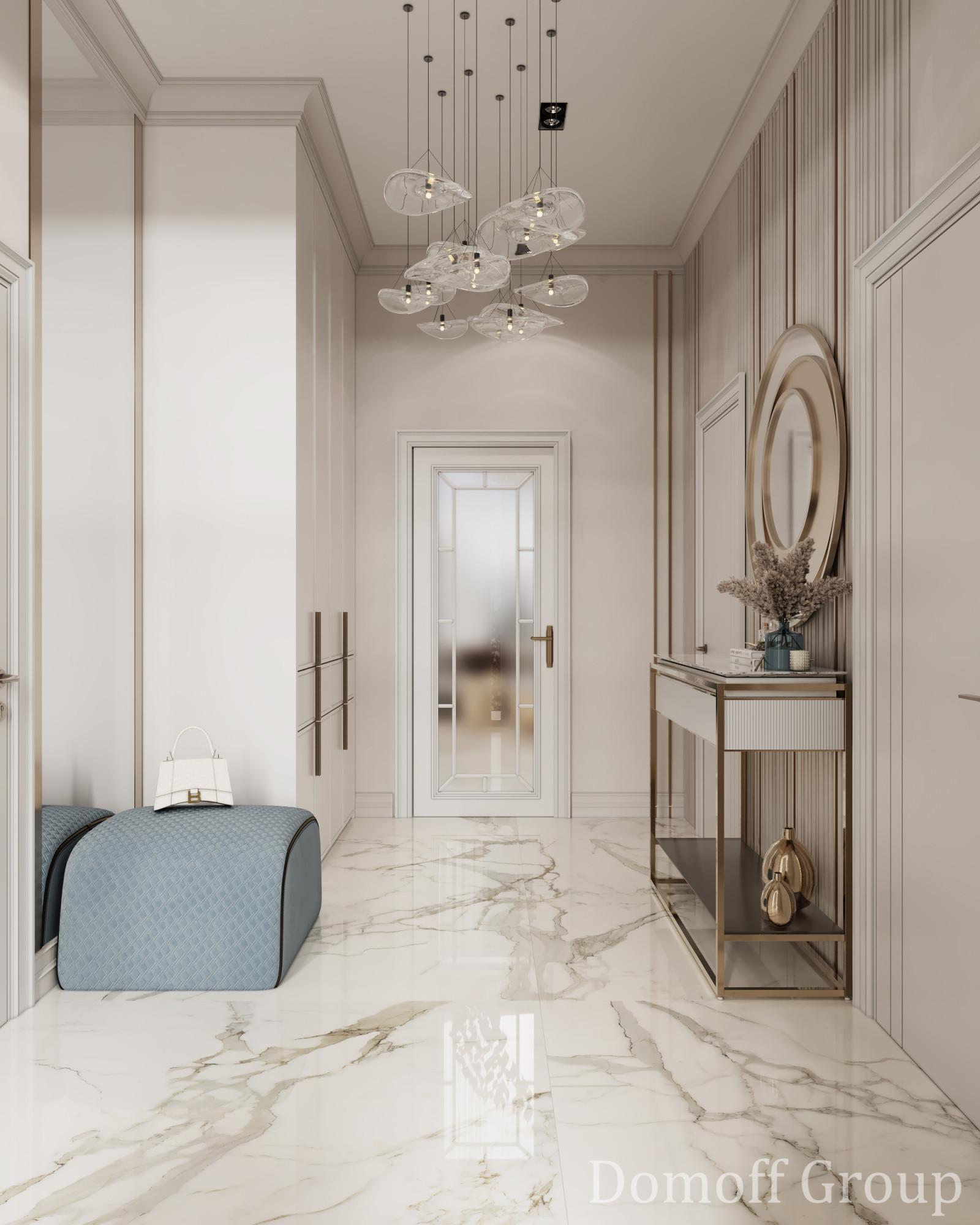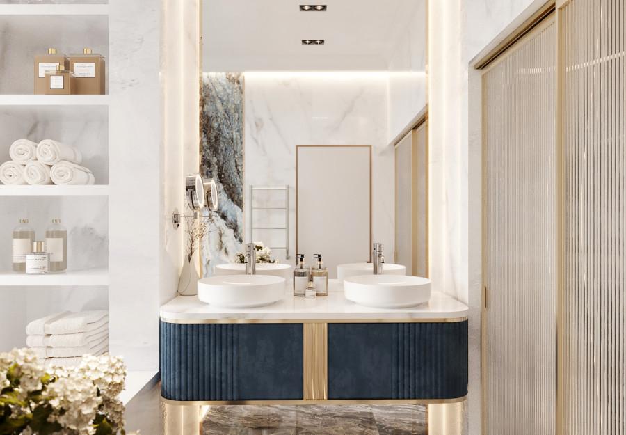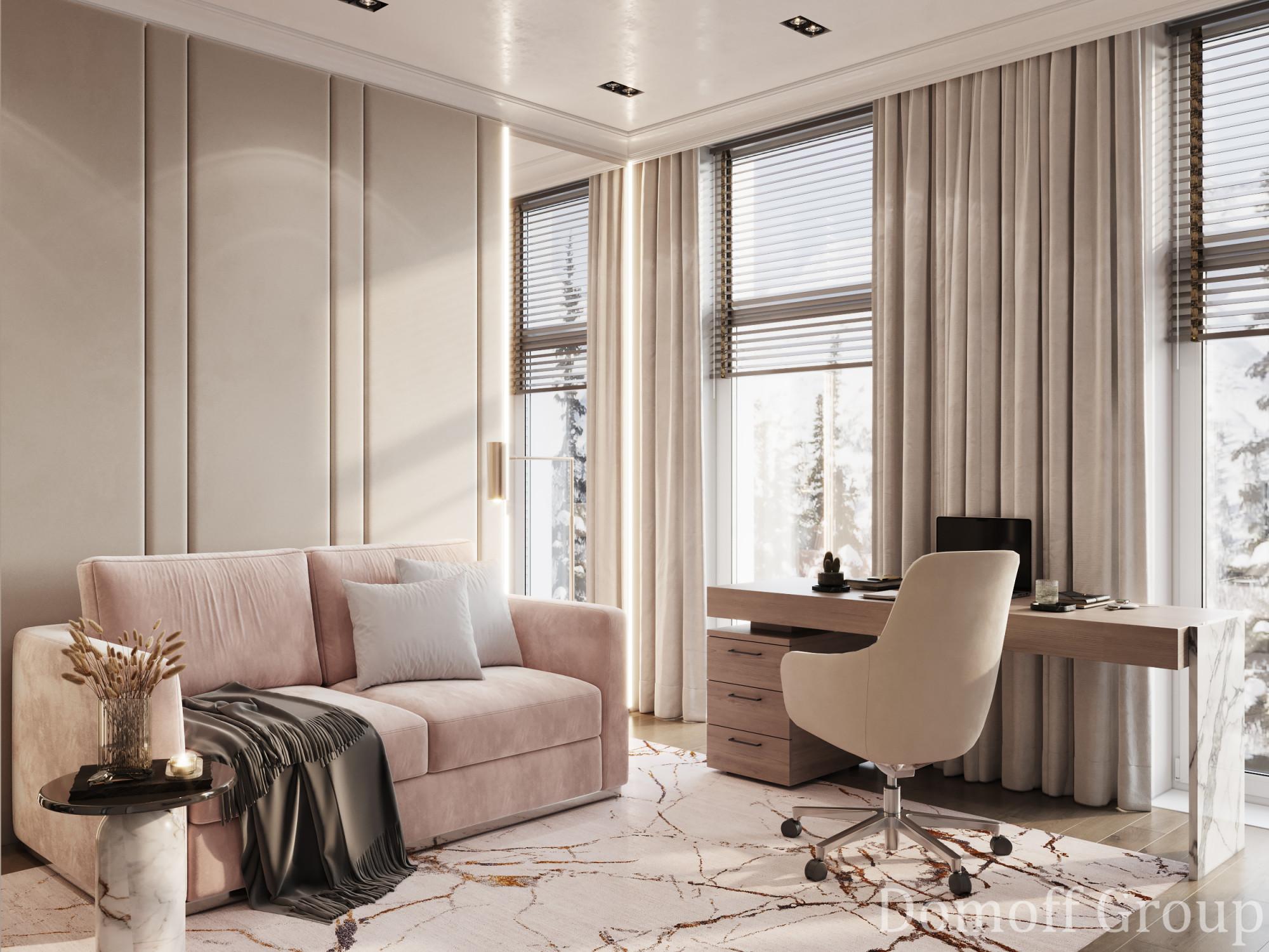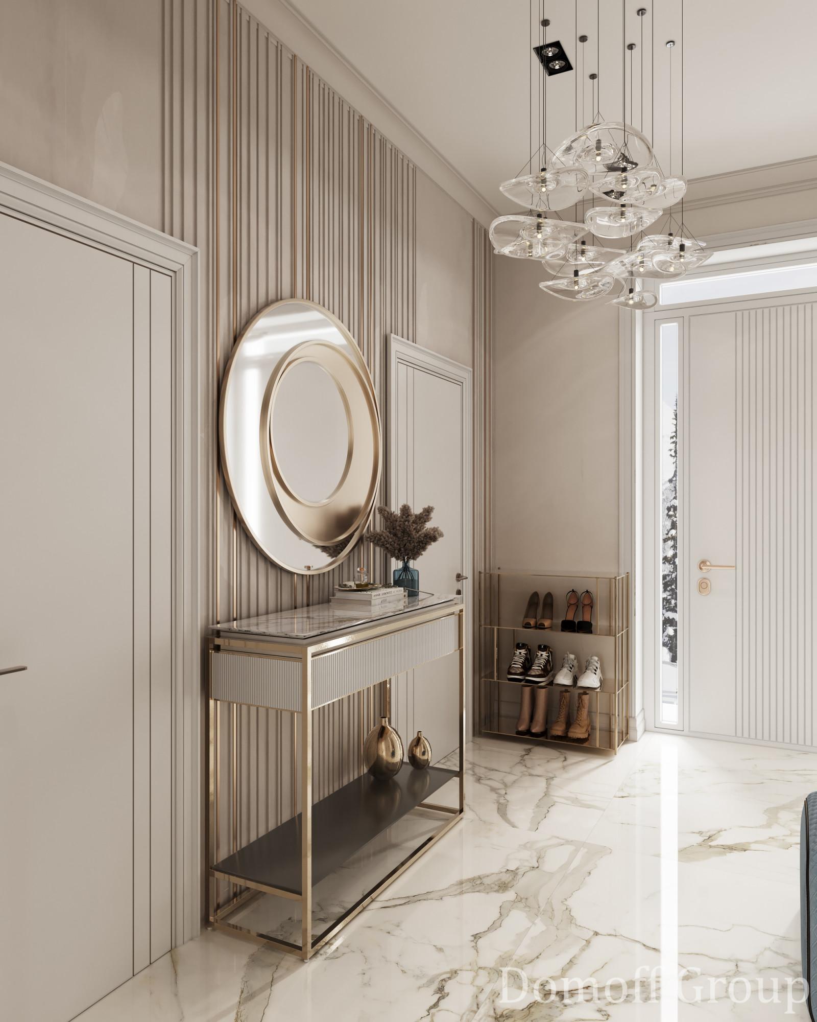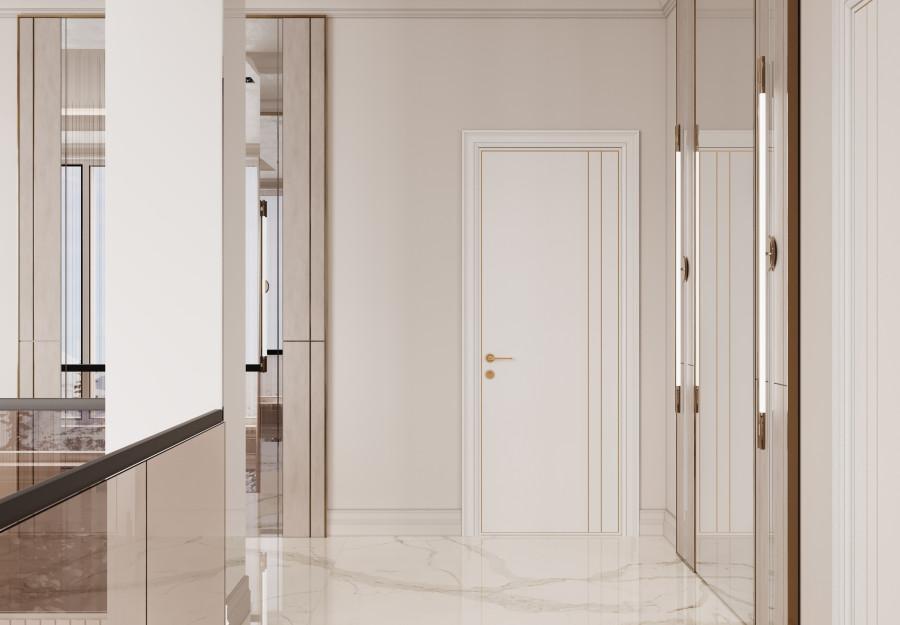Интерьер этого дома - настоящее воплощение современного минимализма с элементами классики. Панорамные окна наполняют пространство светом и создают ощущение простора. Они также делают природу частью интерьера, что добавляет уюта. Цветовая палитра выдержана в нейтральных тонах, которые создают атмосферу чистоты и спокойствия, а золотистые акценты в декоративных элементах добавляют изысканности и тепла. Такой интерьер идеально подойдет для тех, кто ценит комфорт, стиль и гармонию.