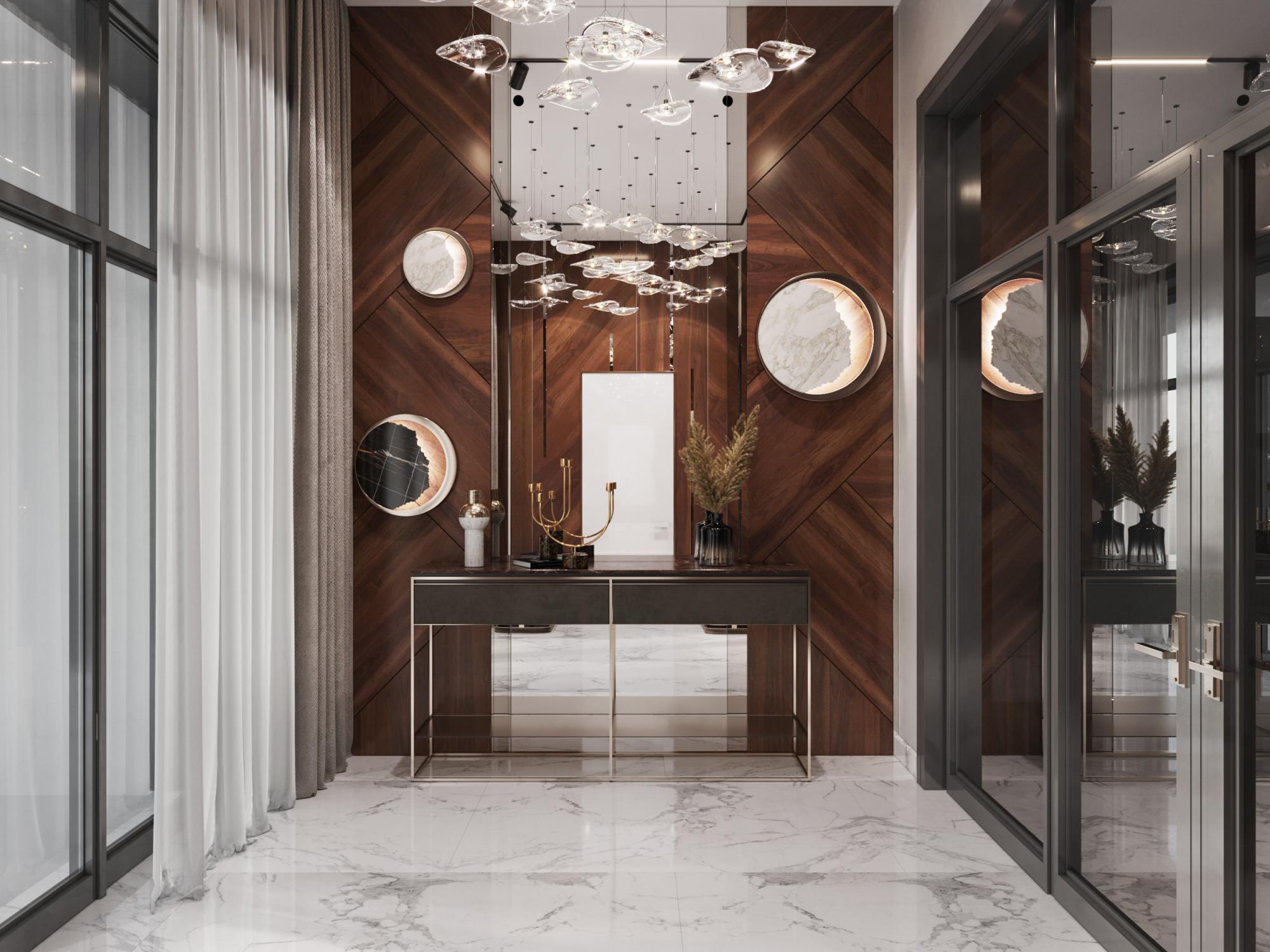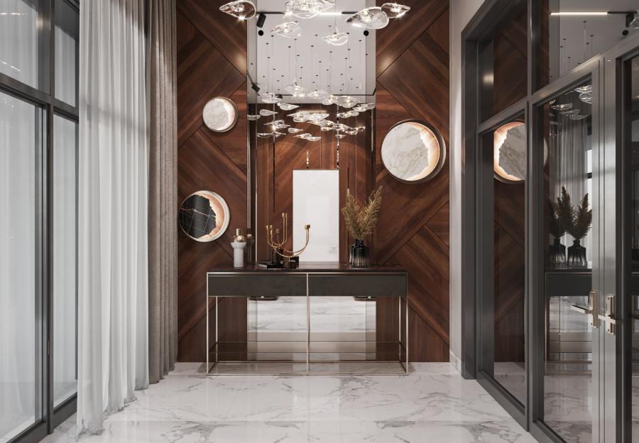 Дом оформлен в современном стиле с элементами минимализма и роскоши. Основной акцент сделан на сочетании натуральных и современных материалов, что создает гармоничный и стильный интерьер. Цветовая гамма комнаты выдержана в нейтральных тонах: бежевом, сером и коричневом. Эти оттенки создают ощущение уюта и спокойствия. В отделке использованы натуральные материалы: мрамор для камина и столешницы, дерево для пола и мебели. Металлические элементы, такие как золотистые акценты на мебели и светильниках, добавляют пространству. Разнообразный текстиль служит идеальным завершением общей композиции.
