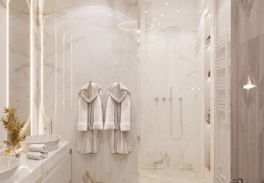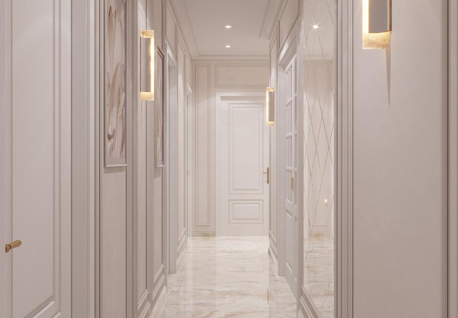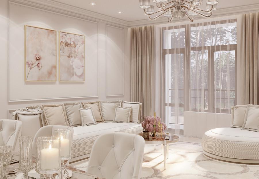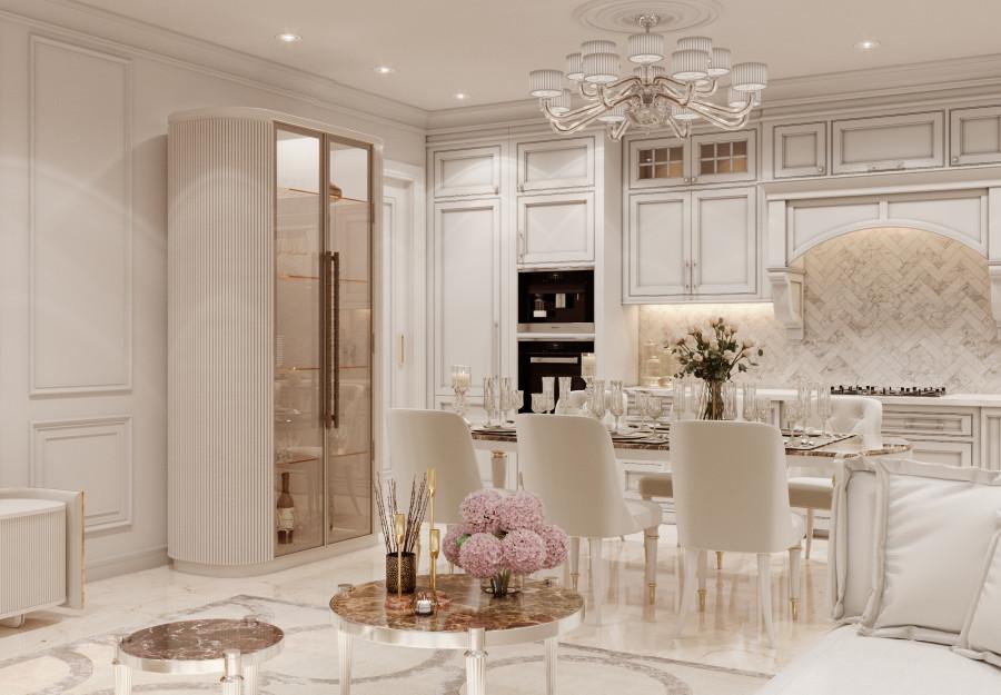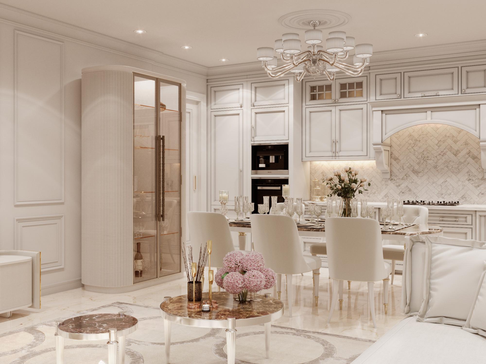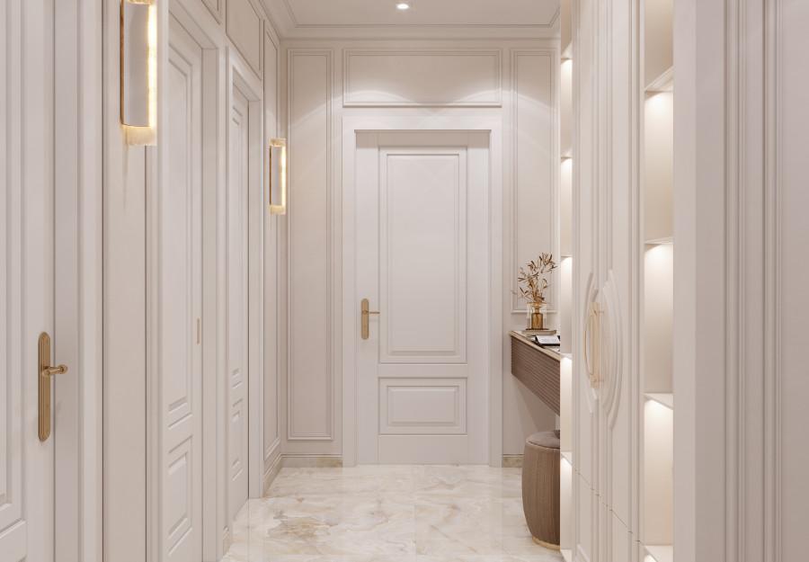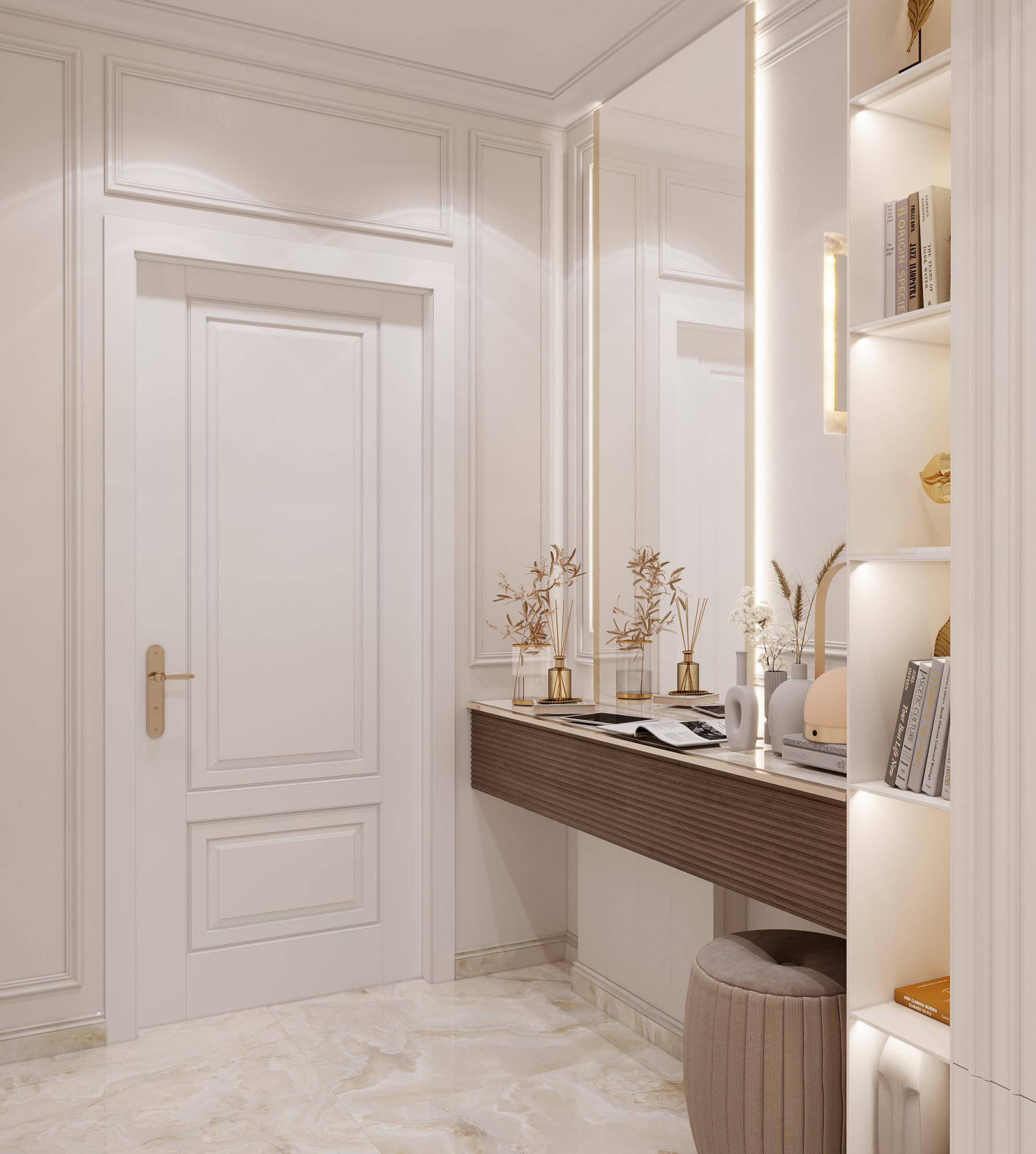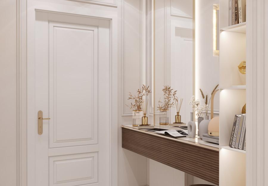 Интерьер квартиры выполнен в стиле неоклассика, который сочетает в себе классический дизайн и современные элементы. Цветовая гамма сосредоточена на светлых оттенках, где главенствуют белый, бежевый и кремовый, которые помогли создать уютную атмосферу и ощущение простора. Золотистые акценты добавляют нотку роскоши подчеркивают элегантность пространства. Мебель и декор сочетают себе два важных качества, таких как функциональность и эстетика. Материалы подчеркивают статусность помещения: для отделки использованы натуральное дерево, мрамор и текстиль высокого качества.