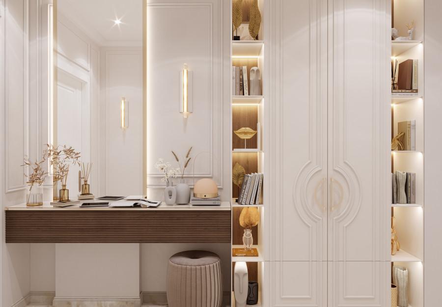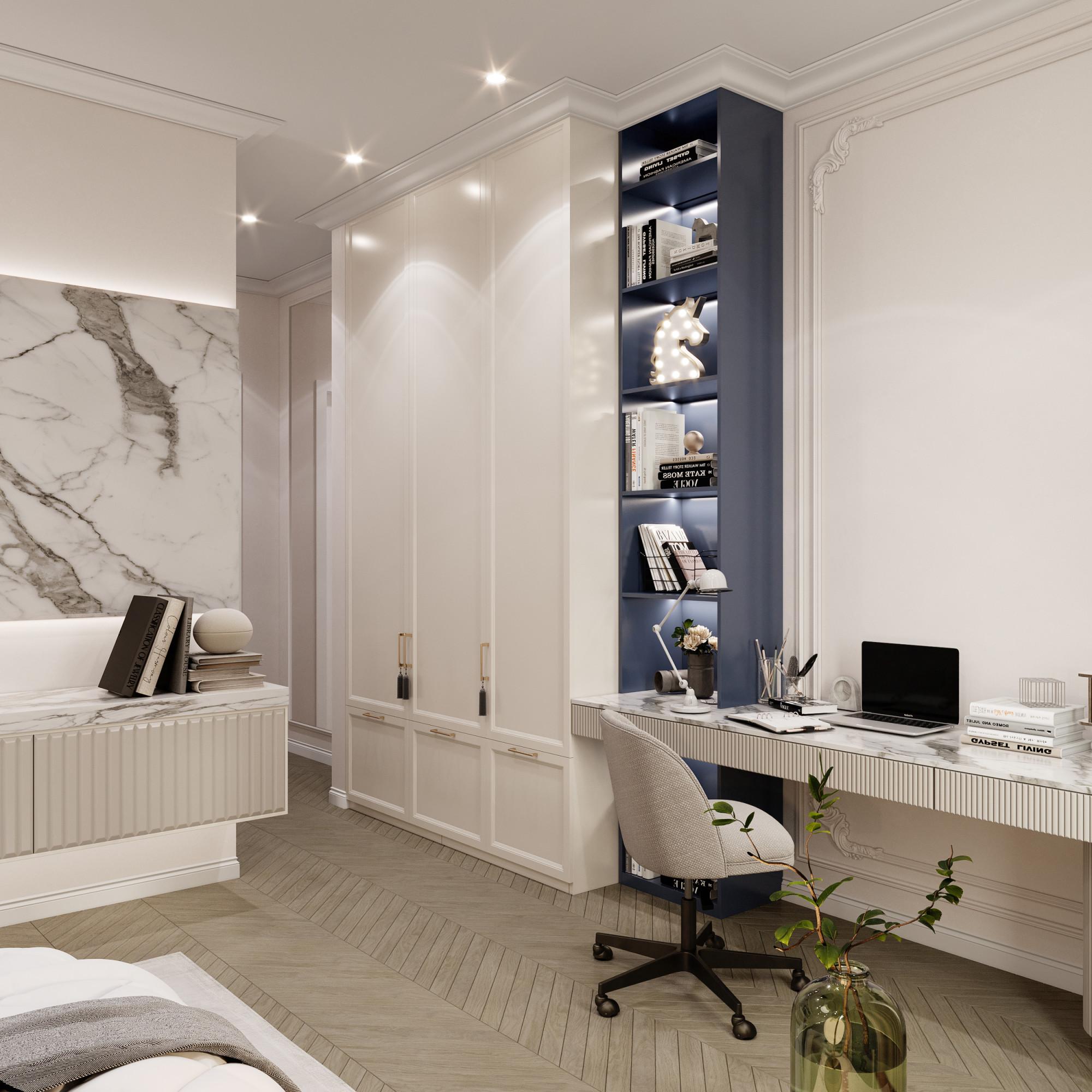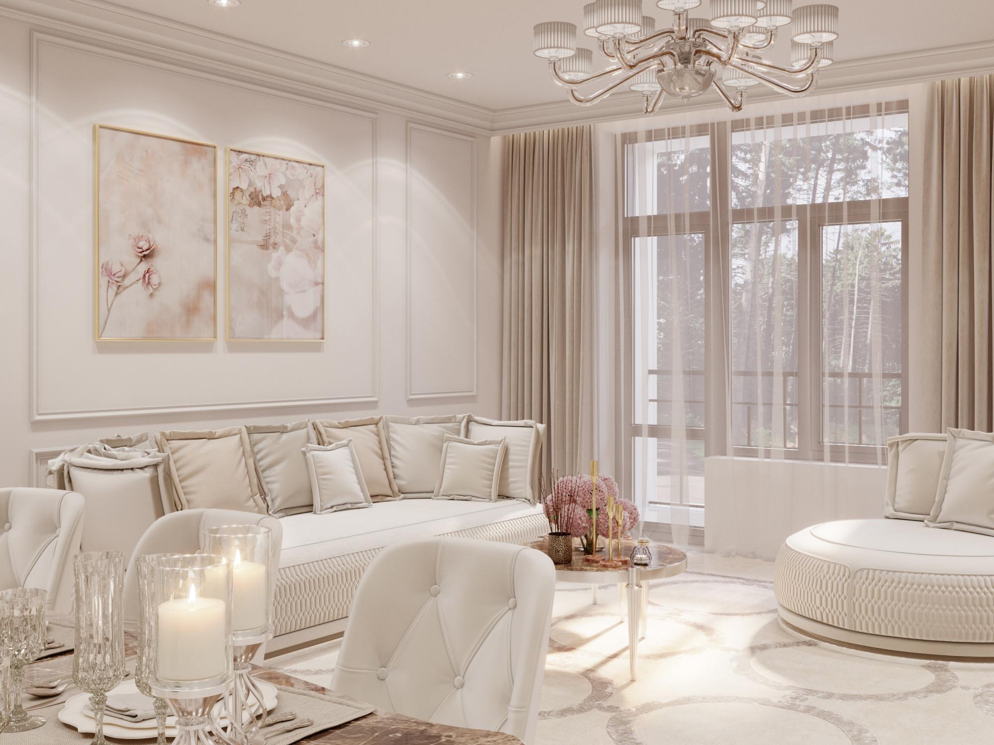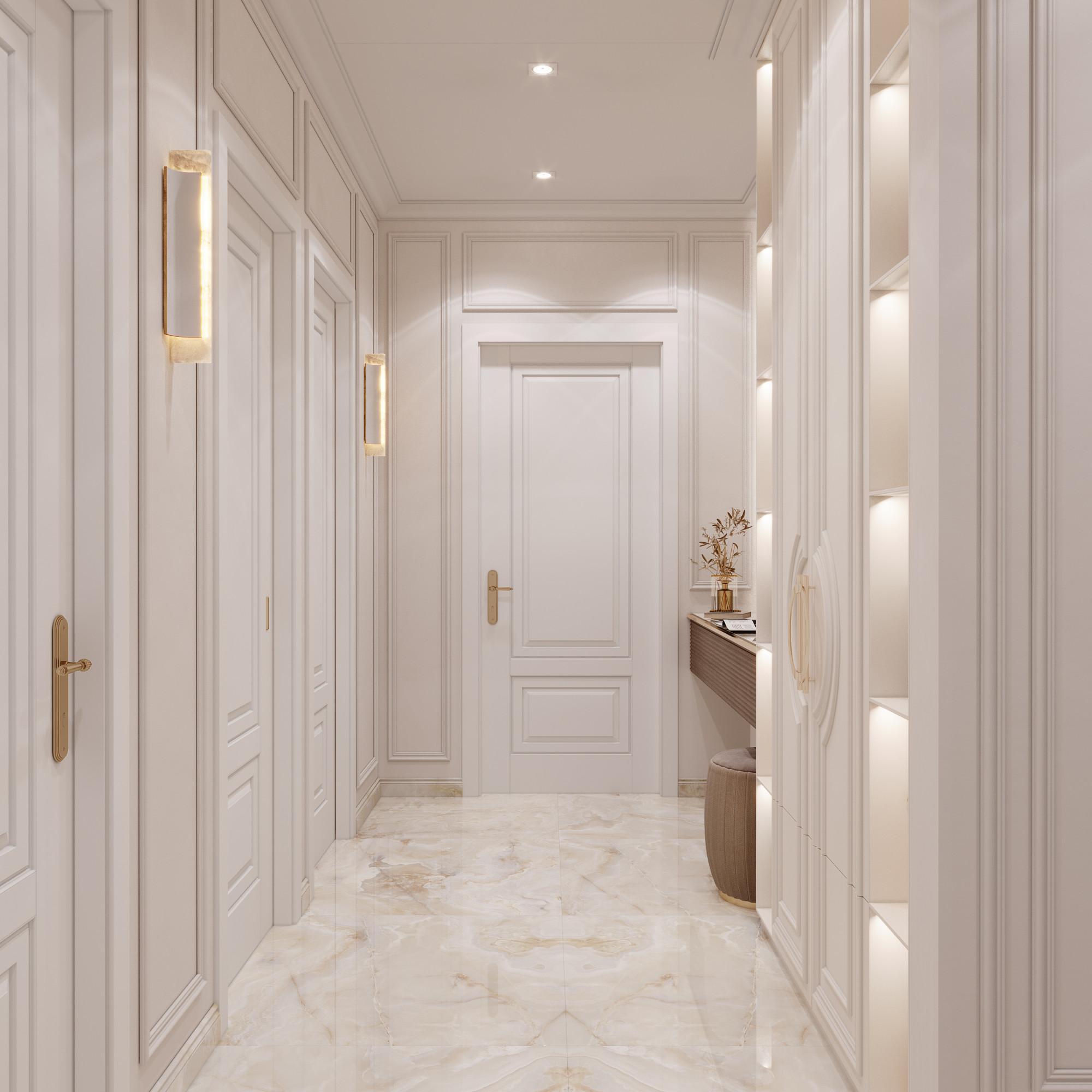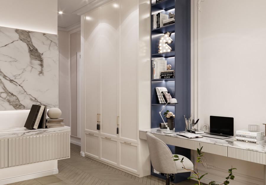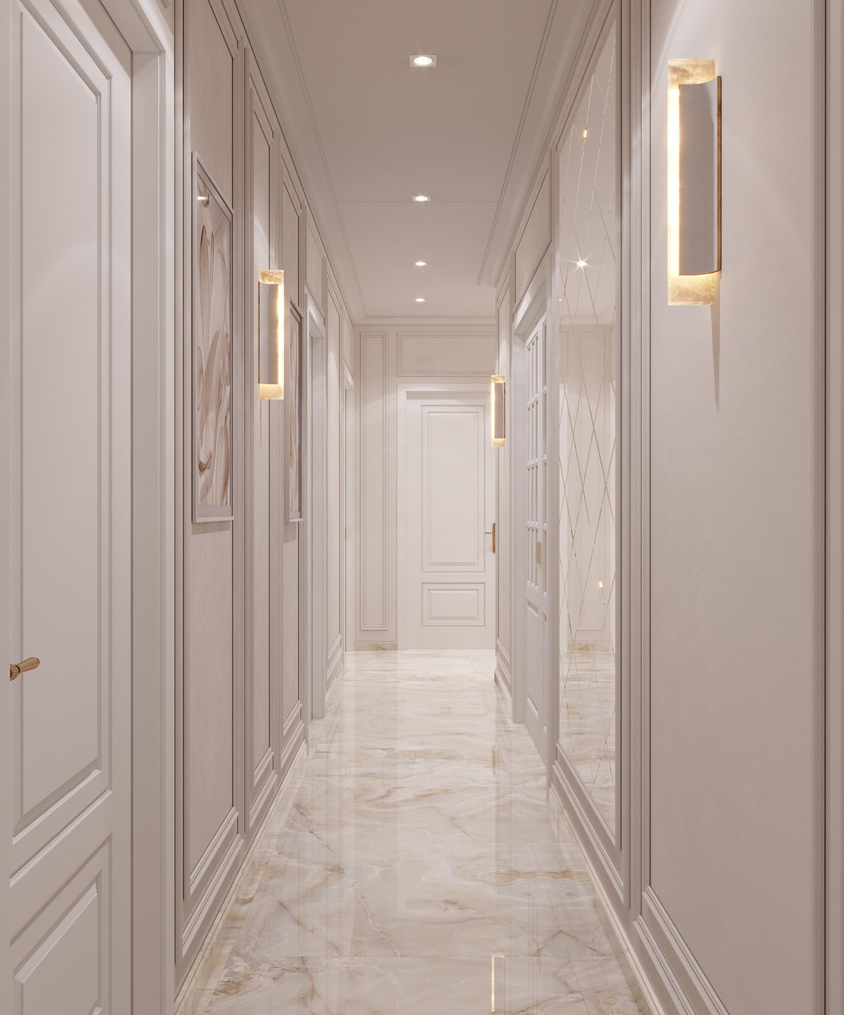 Интерьер квартиры выполнен в стиле неоклассика, который сочетает в себе классический дизайн и современные элементы. Цветовая гамма сосредоточена на светлых оттенках, где главенствуют белый, бежевый и кремовый, которые помогли создать уютную атмосферу и ощущение простора. Золотистые акценты добавляют нотку роскоши подчеркивают элегантность пространства. Мебель и декор сочетают себе два важных качества, таких как функциональность и эстетика. Материалы подчеркивают статусность помещения: для отделки использованы натуральное дерево, мрамор и текстиль высокого качества.