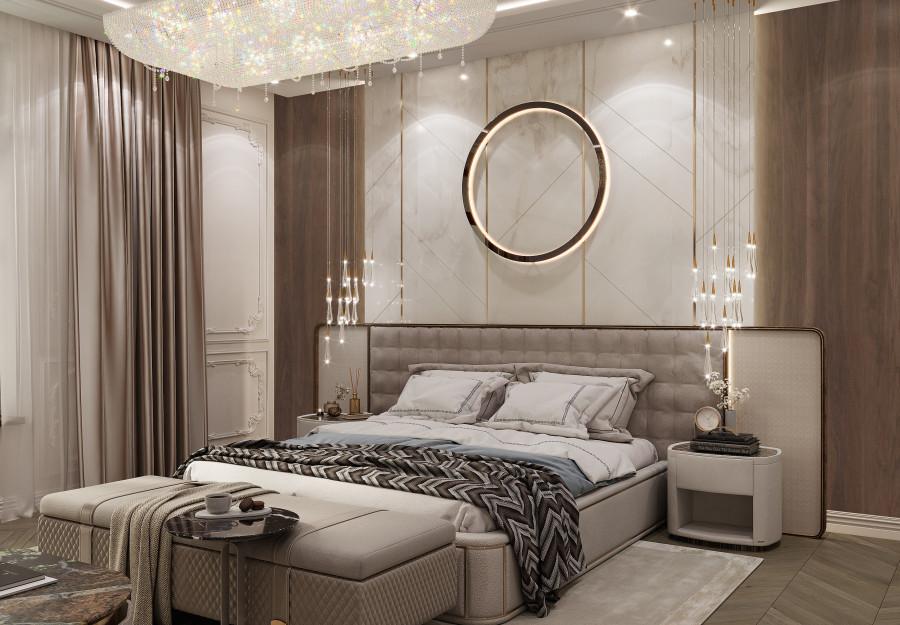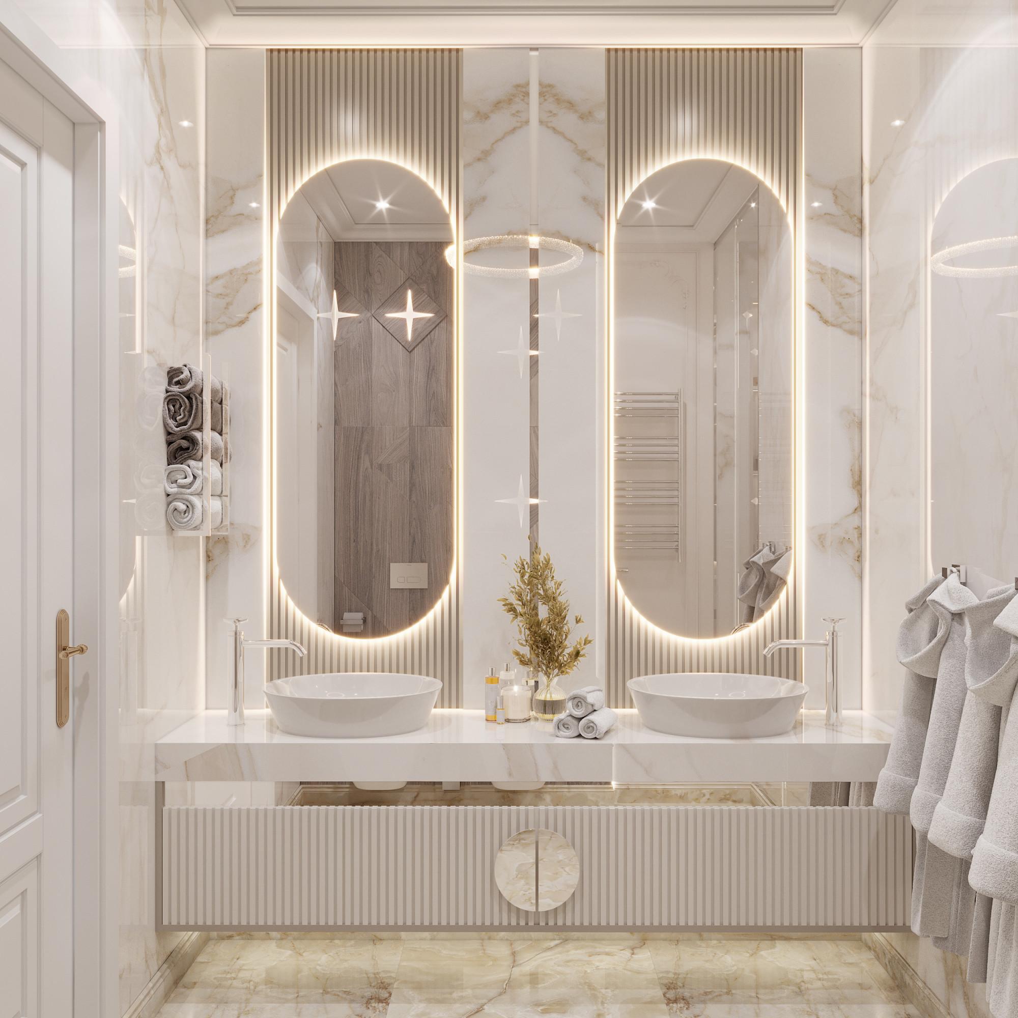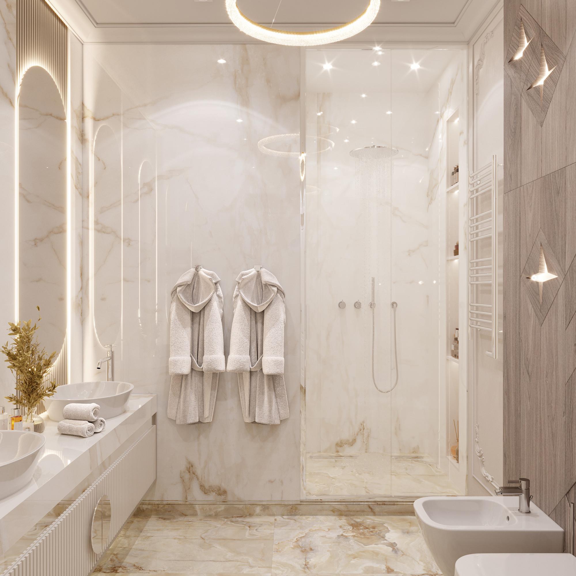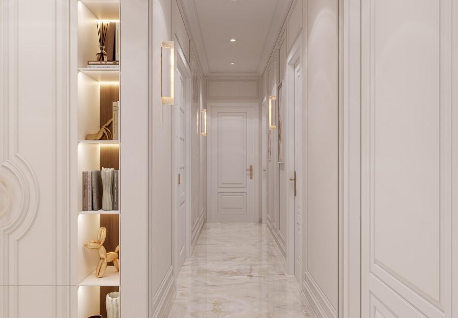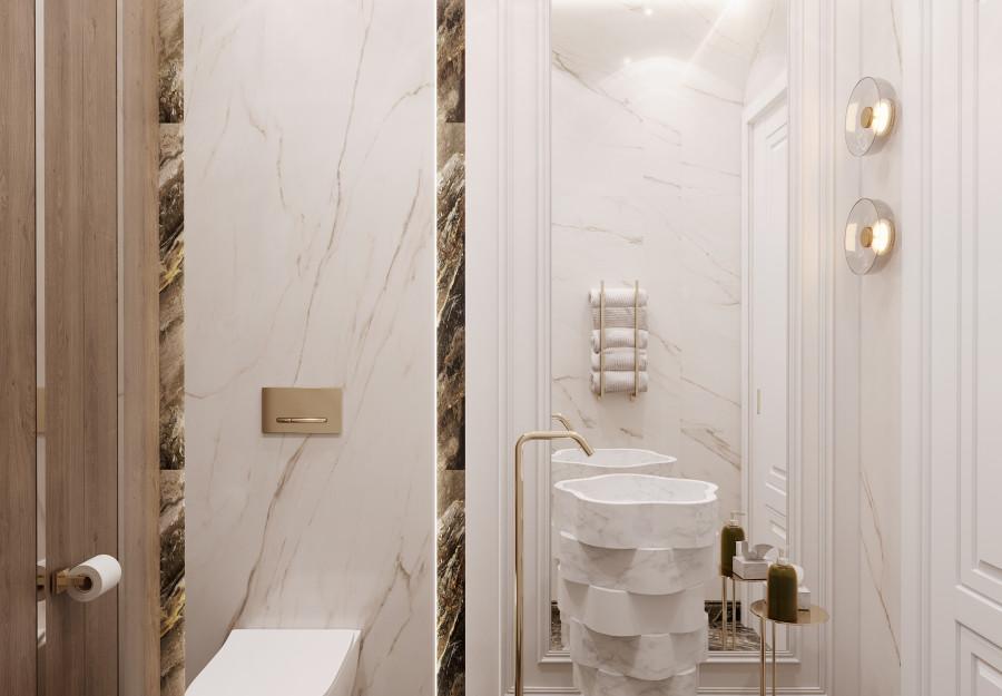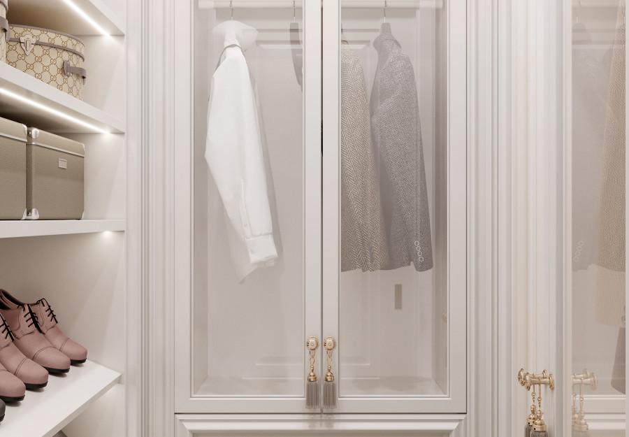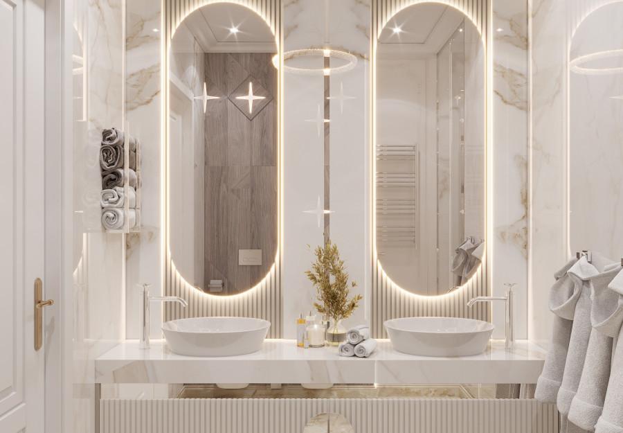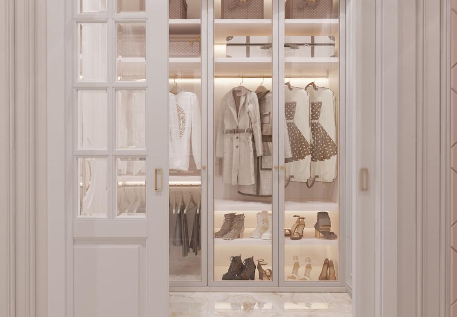 Интерьер квартиры выполнен в стиле неоклассика, который сочетает в себе классический дизайн и современные элементы. Цветовая гамма сосредоточена на светлых оттенках, где главенствуют белый, бежевый и кремовый, которые помогли создать уютную атмосферу и ощущение простора. Золотистые акценты добавляют нотку роскоши подчеркивают элегантность пространства. Мебель и декор сочетают себе два важных качества, таких как функциональность и эстетика. Материалы подчеркивают статусность помещения: для отделки использованы натуральное дерево, мрамор и текстиль высокого качества.