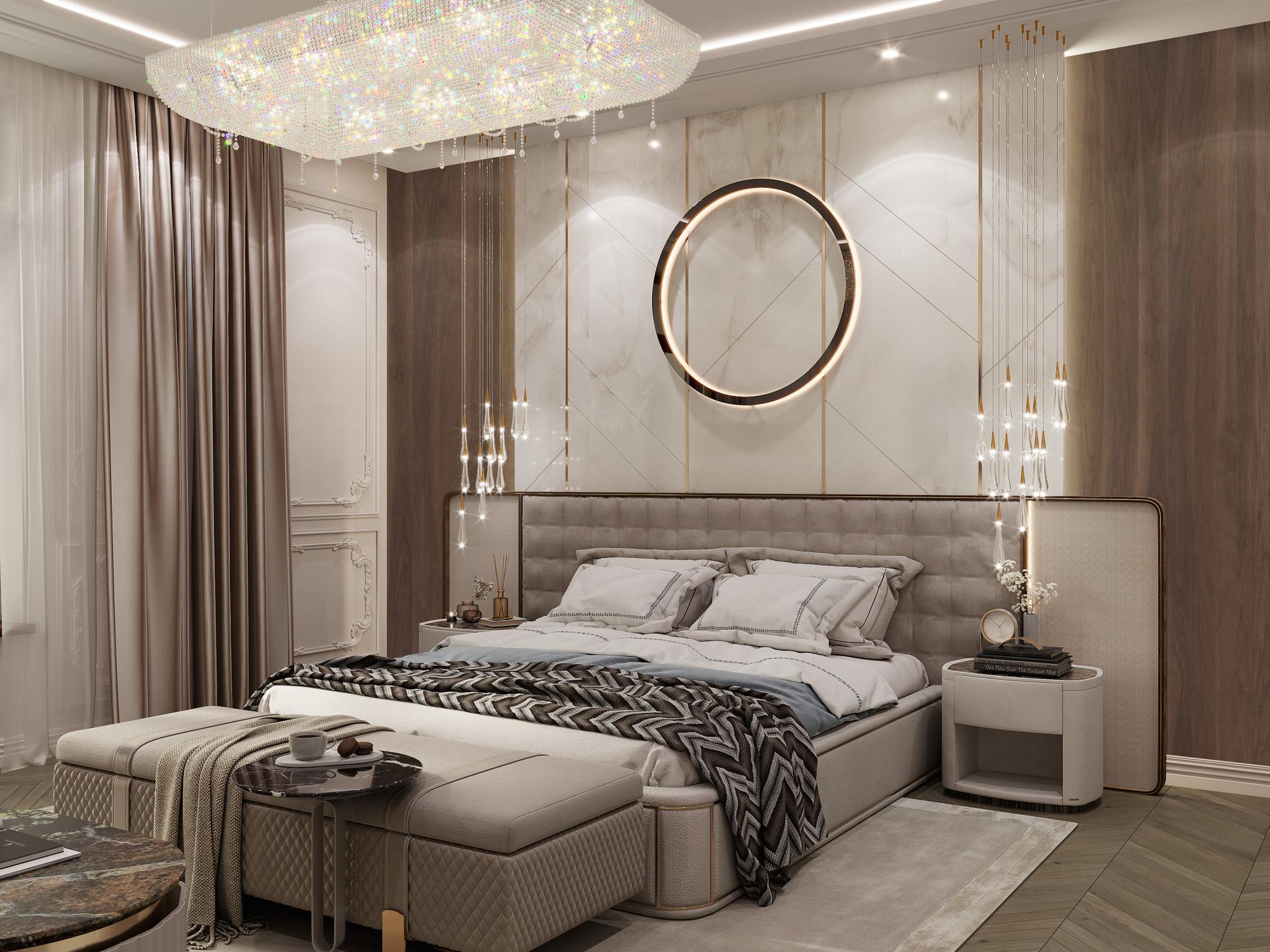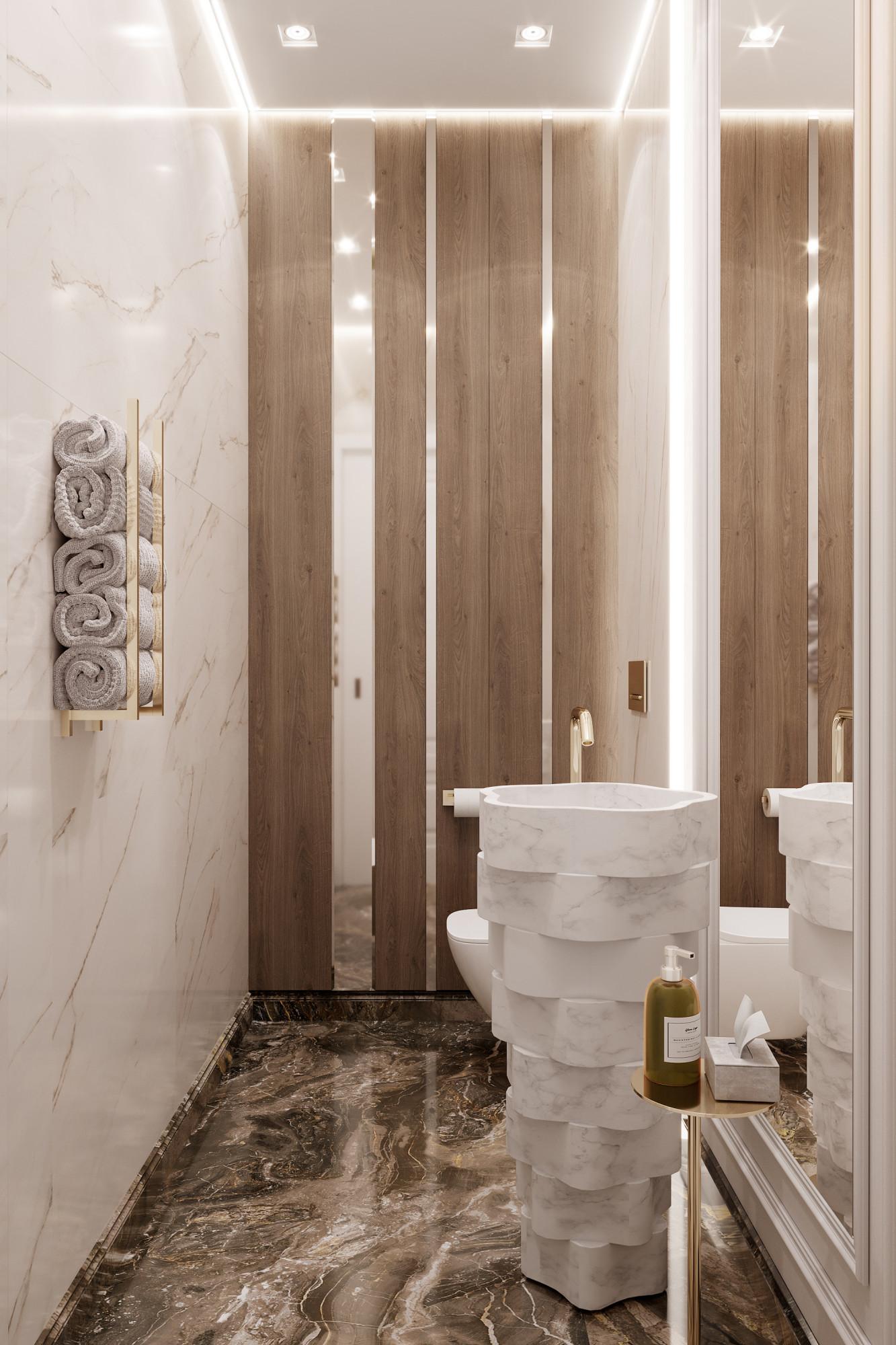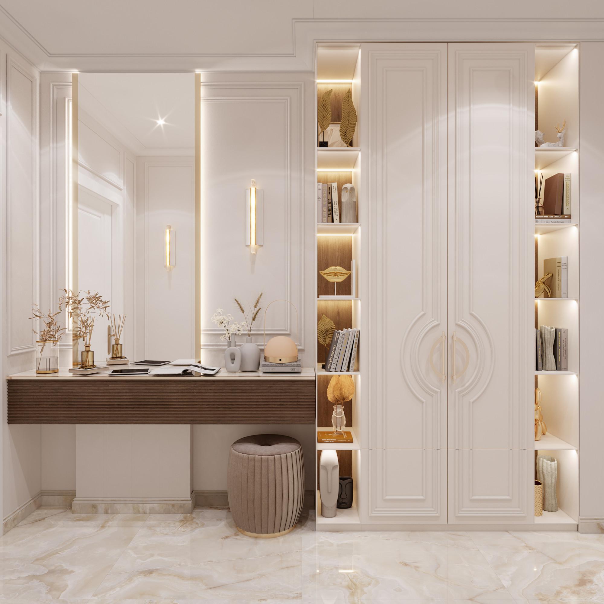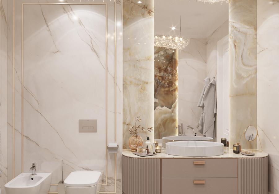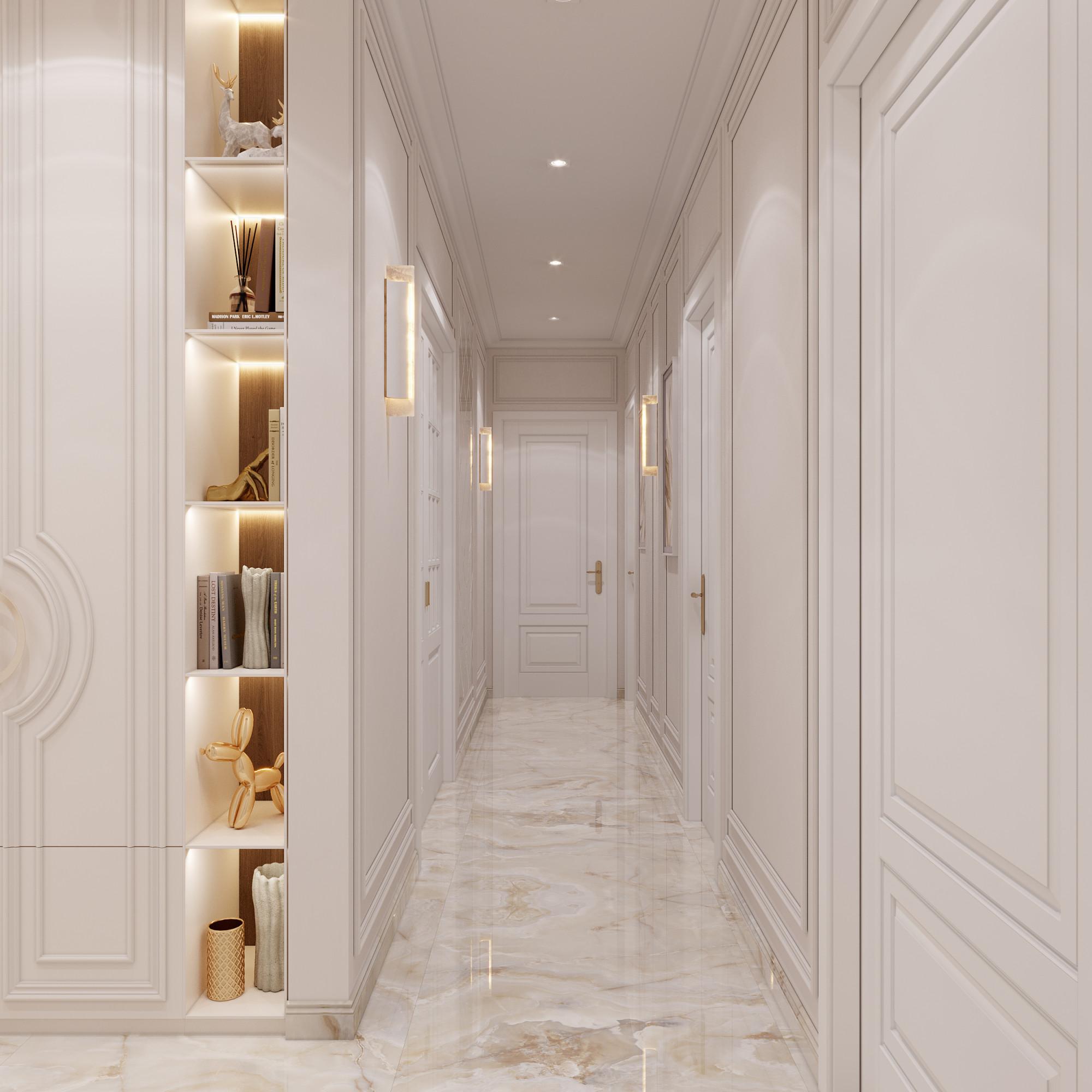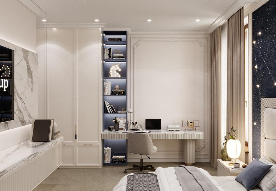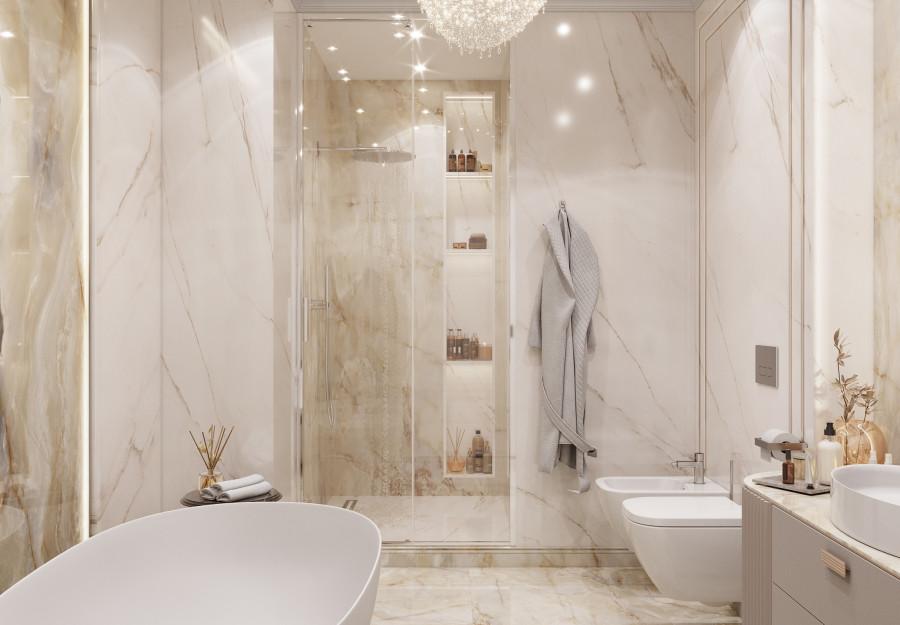 Интерьер квартиры выполнен в стиле неоклассика, который сочетает в себе классический дизайн и современные элементы. Цветовая гамма сосредоточена на светлых оттенках, где главенствуют белый, бежевый и кремовый, которые помогли создать уютную атмосферу и ощущение простора. Золотистые акценты добавляют нотку роскоши подчеркивают элегантность пространства. Мебель и декор сочетают себе два важных качества, таких как функциональность и эстетика. Материалы подчеркивают статусность помещения: для отделки использованы натуральное дерево, мрамор и текстиль высокого качества.