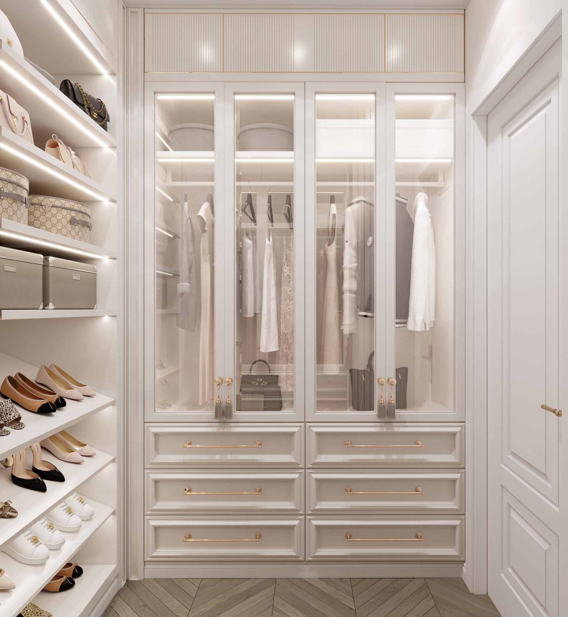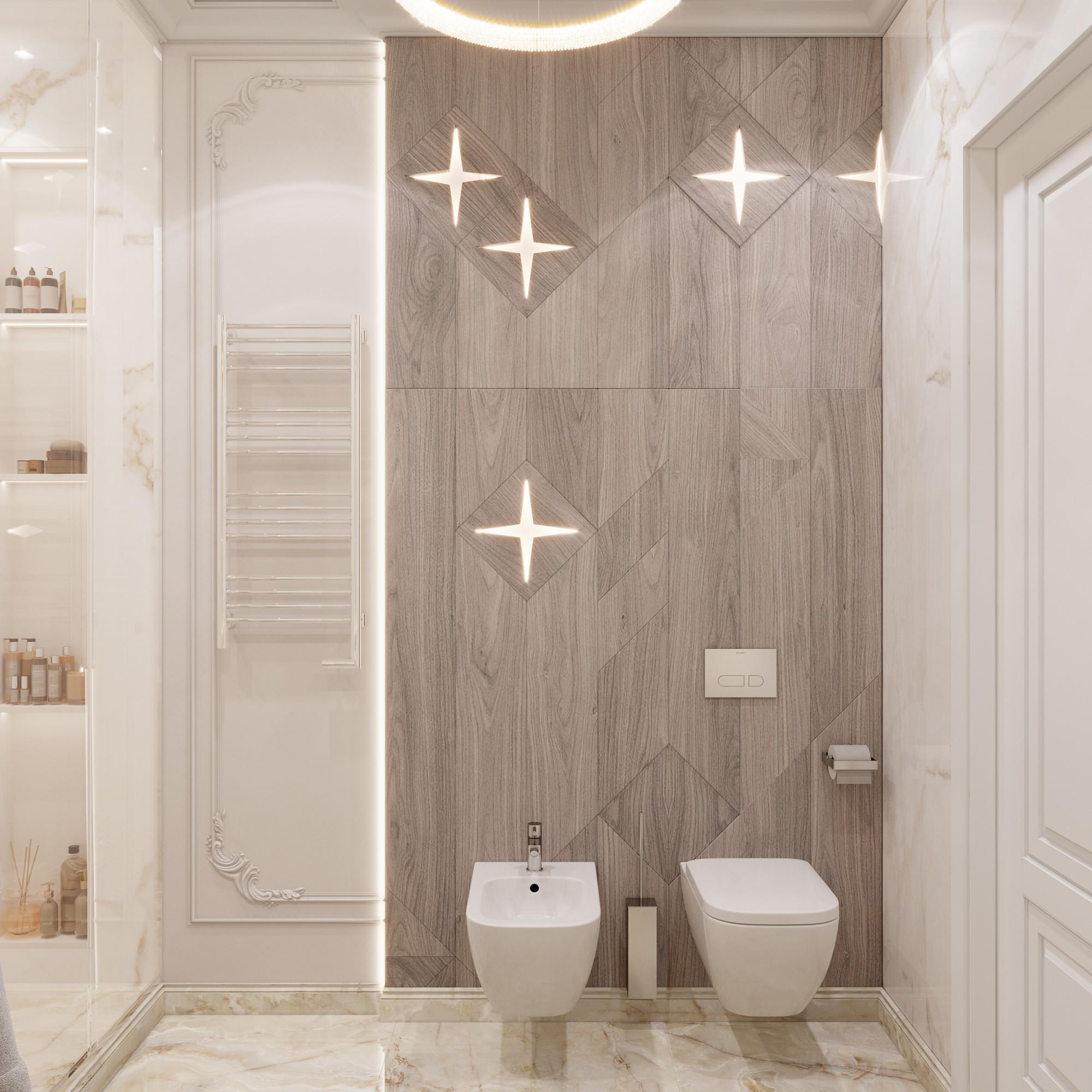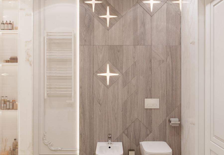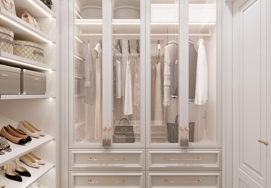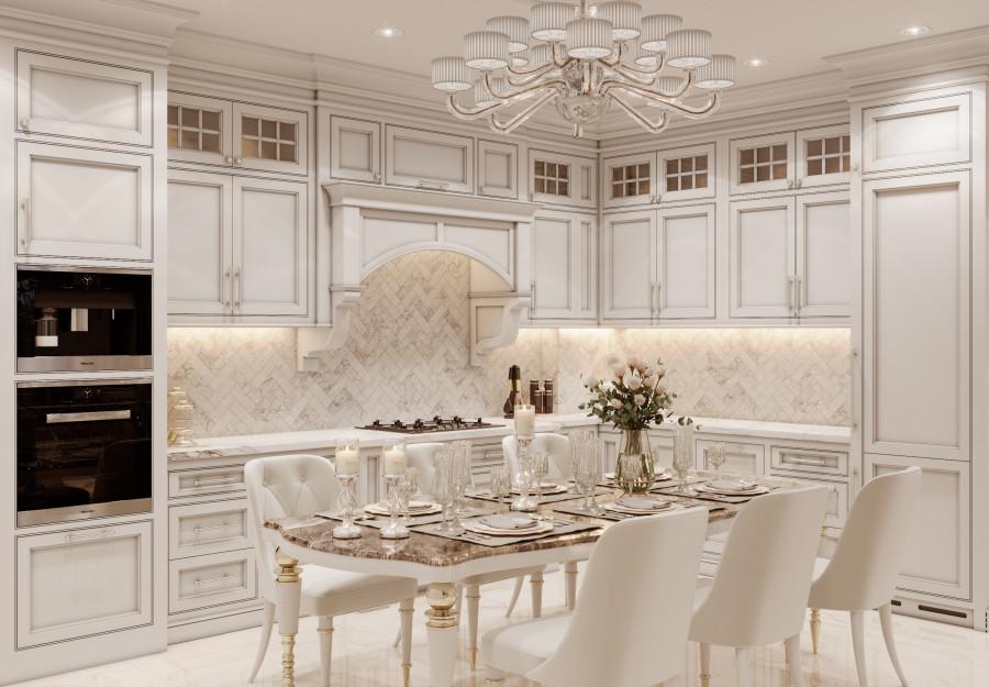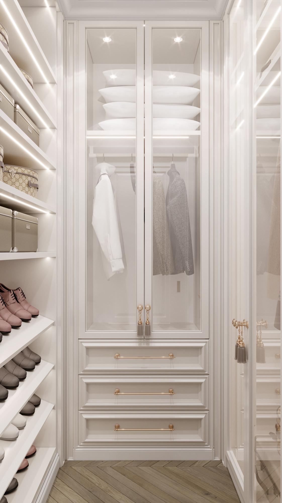 Интерьер квартиры выполнен в стиле неоклассика, который сочетает в себе классический дизайн и современные элементы. Цветовая гамма сосредоточена на светлых оттенках, где главенствуют белый, бежевый и кремовый, которые помогли создать уютную атмосферу и ощущение простора. Золотистые акценты добавляют нотку роскоши подчеркивают элегантность пространства. Мебель и декор сочетают себе два важных качества, таких как функциональность и эстетика. Материалы подчеркивают статусность помещения: для отделки использованы натуральное дерево, мрамор и текстиль высокого качества.