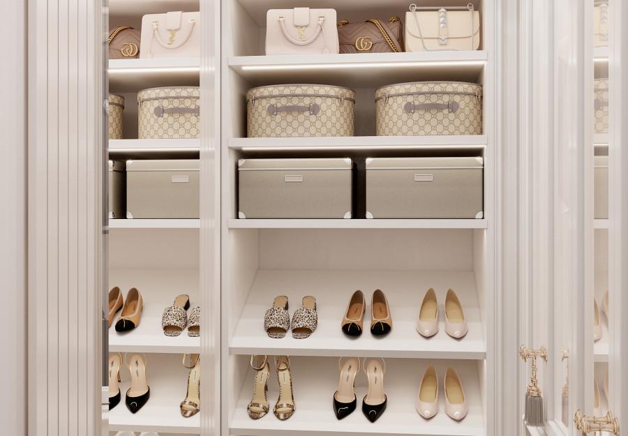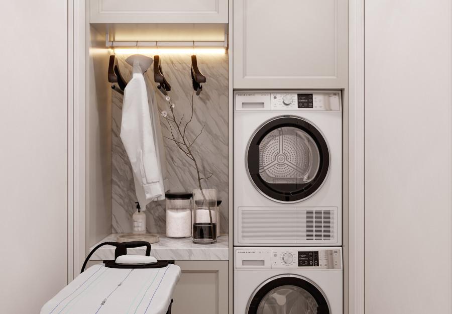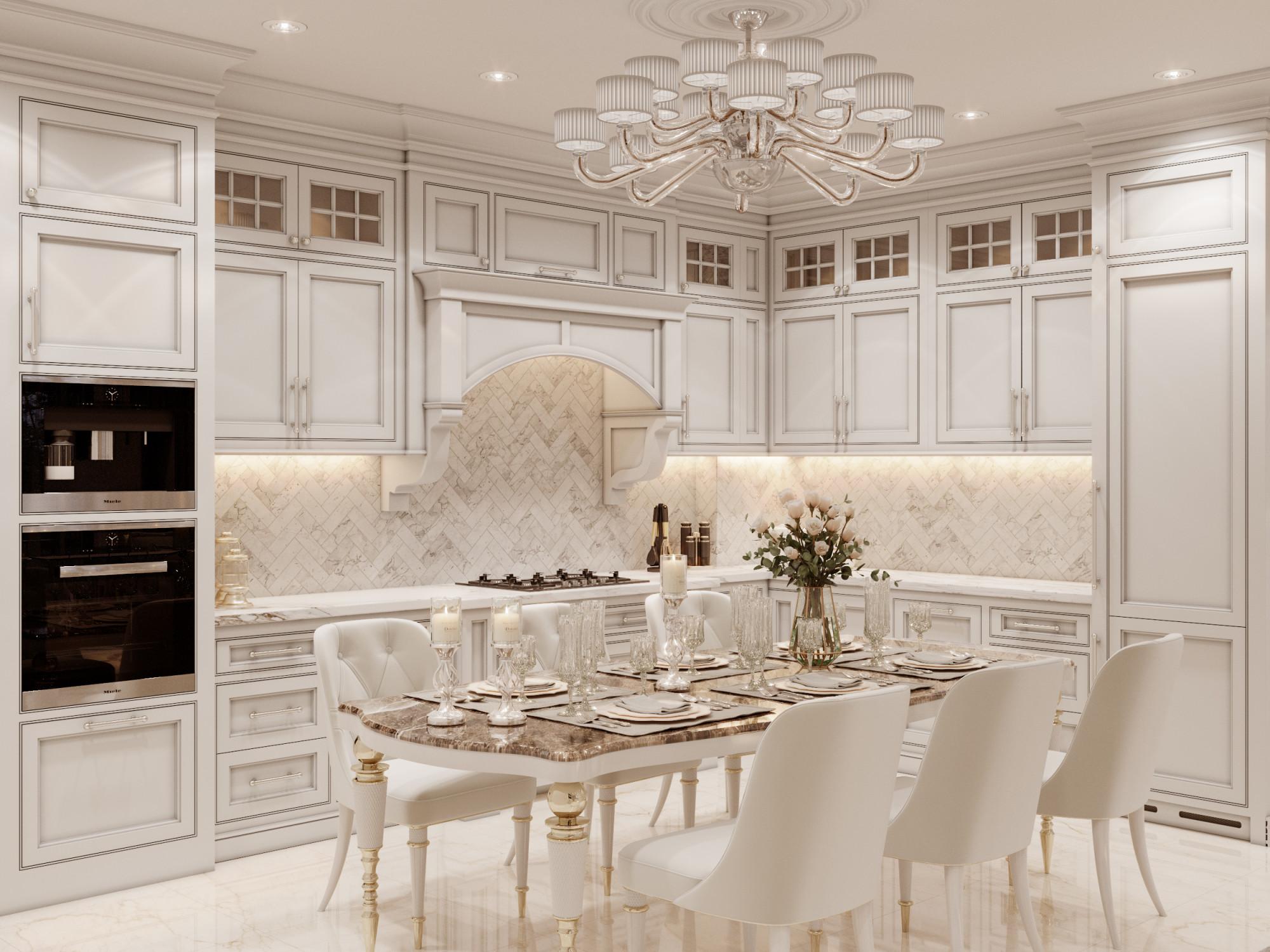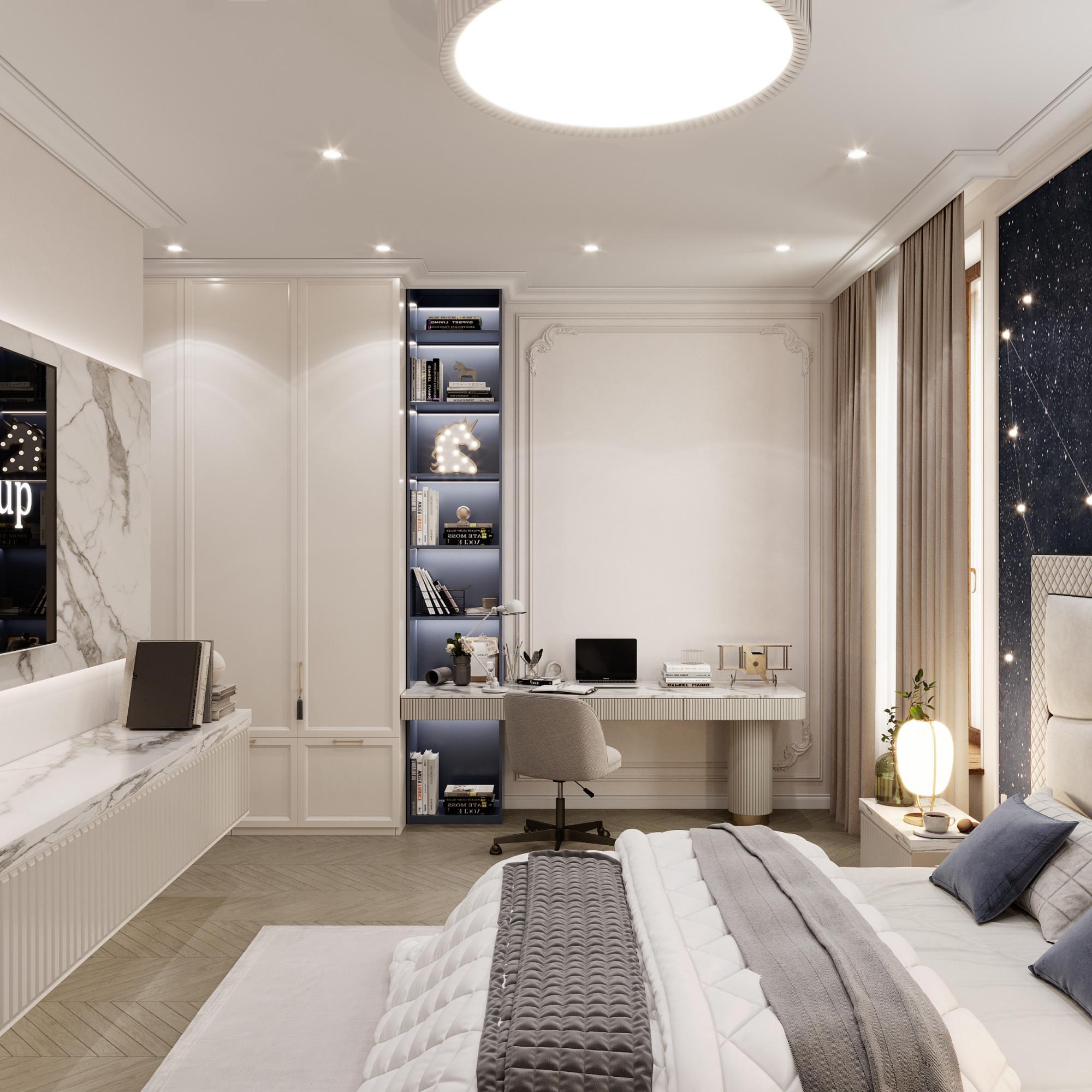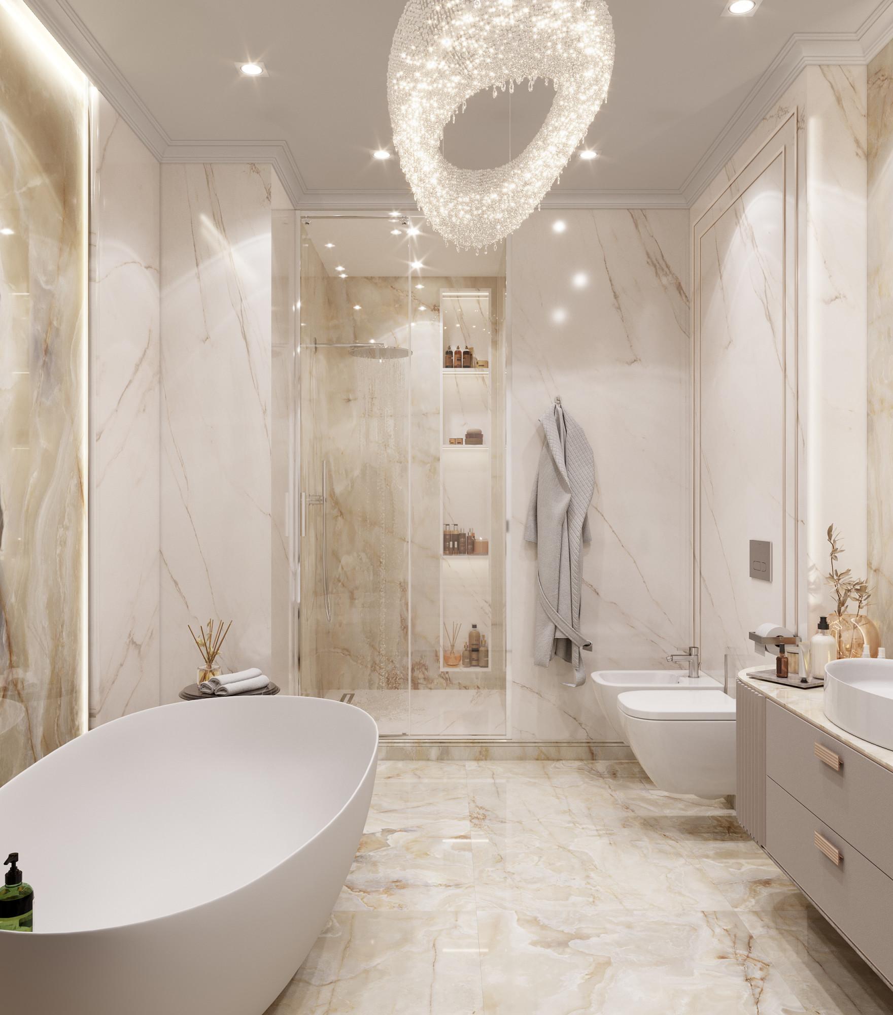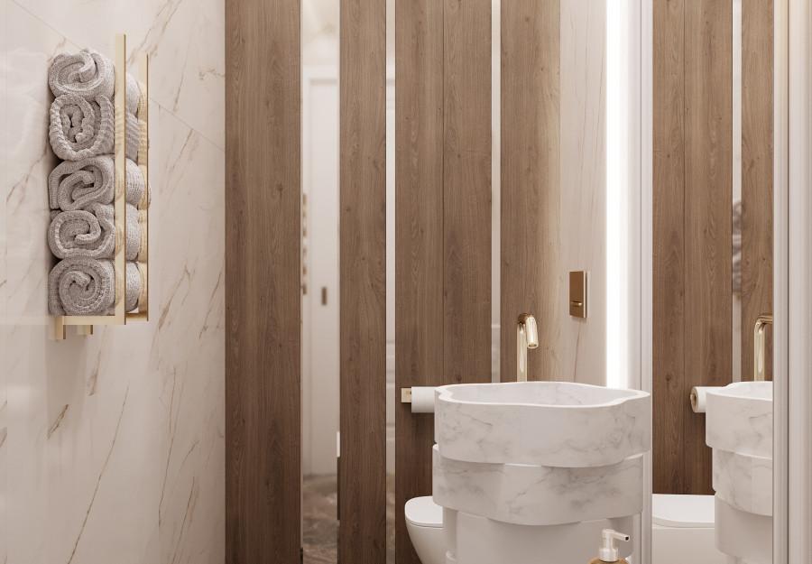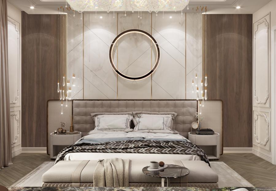 Интерьер квартиры выполнен в стиле неоклассика, который сочетает в себе классический дизайн и современные элементы. Цветовая гамма сосредоточена на светлых оттенках, где главенствуют белый, бежевый и кремовый, которые помогли создать уютную атмосферу и ощущение простора. Золотистые акценты добавляют нотку роскоши подчеркивают элегантность пространства. Мебель и декор сочетают себе два важных качества, таких как функциональность и эстетика. Материалы подчеркивают статусность помещения: для отделки использованы натуральное дерево, мрамор и текстиль высокого качества.