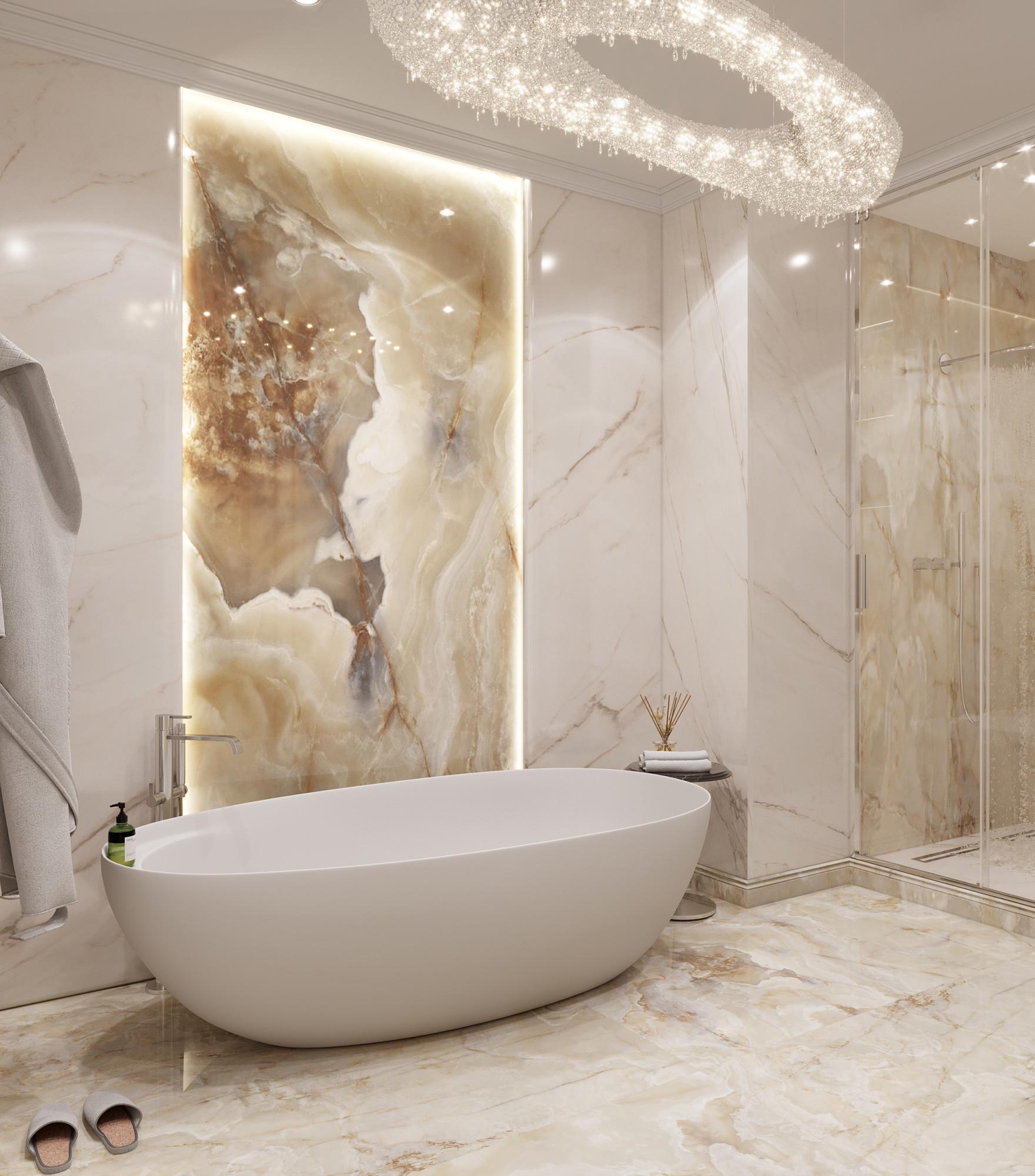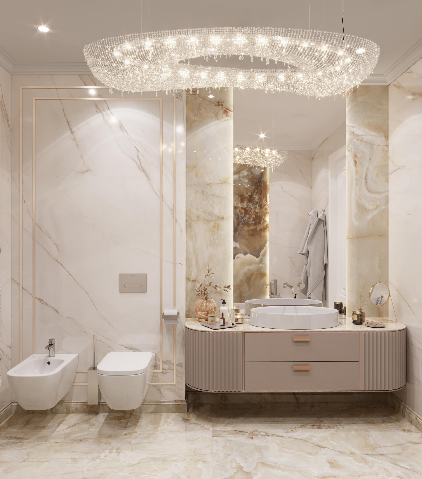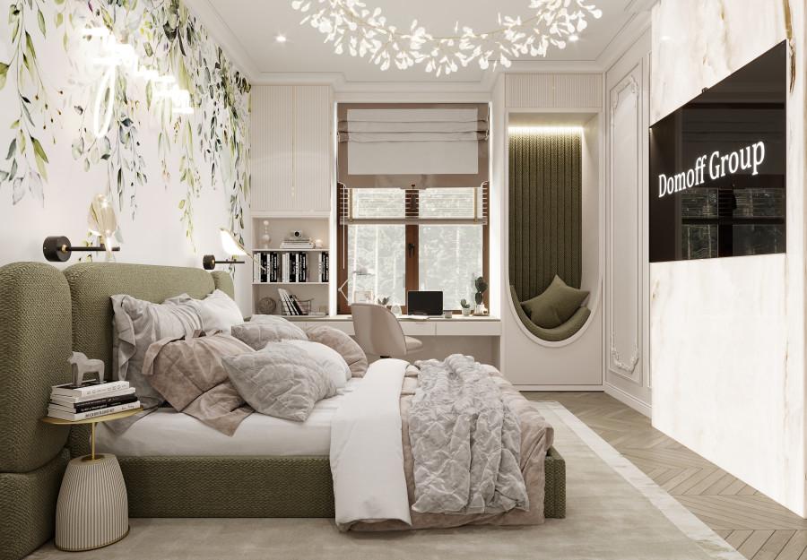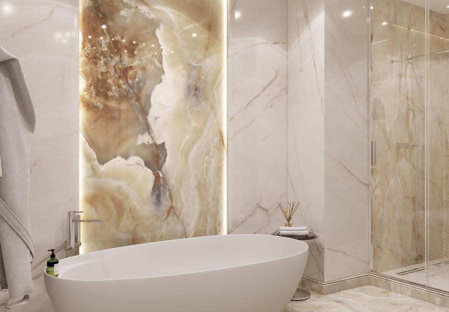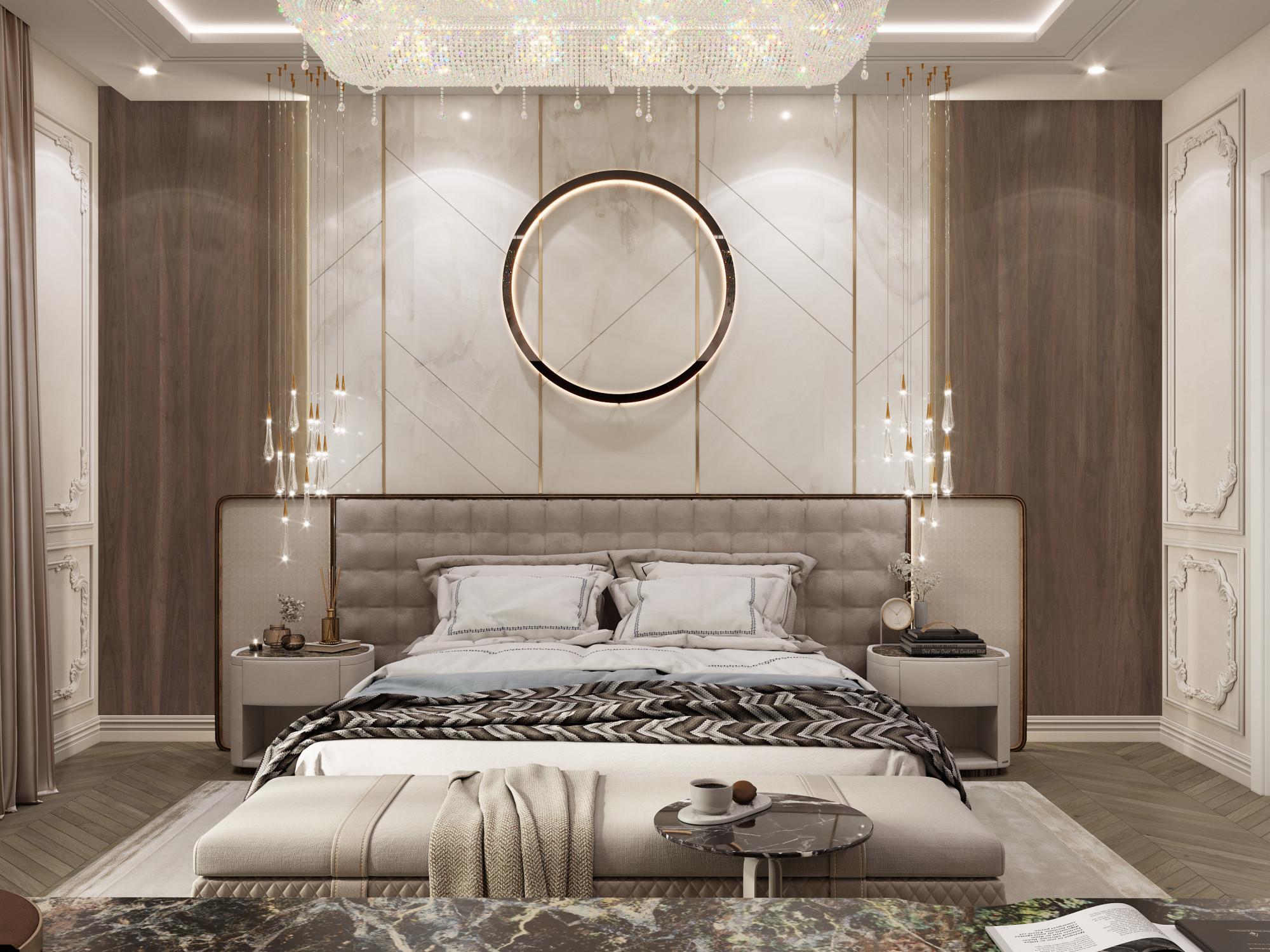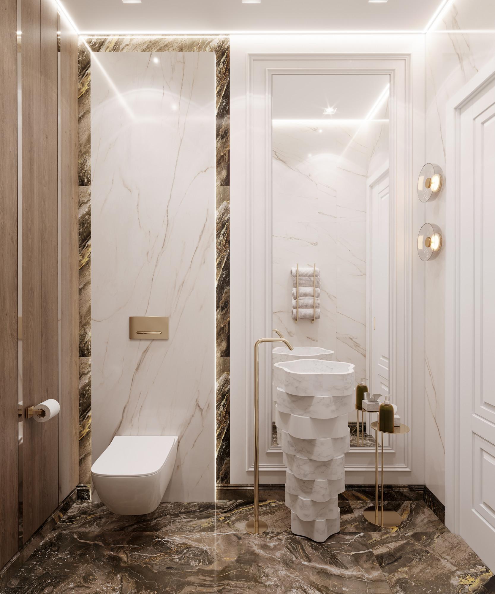 Интерьер квартиры выполнен в стиле неоклассика, который сочетает в себе классический дизайн и современные элементы. Цветовая гамма сосредоточена на светлых оттенках, где главенствуют белый, бежевый и кремовый, которые помогли создать уютную атмосферу и ощущение простора. Золотистые акценты добавляют нотку роскоши подчеркивают элегантность пространства. Мебель и декор сочетают себе два важных качества, таких как функциональность и эстетика. Материалы подчеркивают статусность помещения: для отделки использованы натуральное дерево, мрамор и текстиль высокого качества.