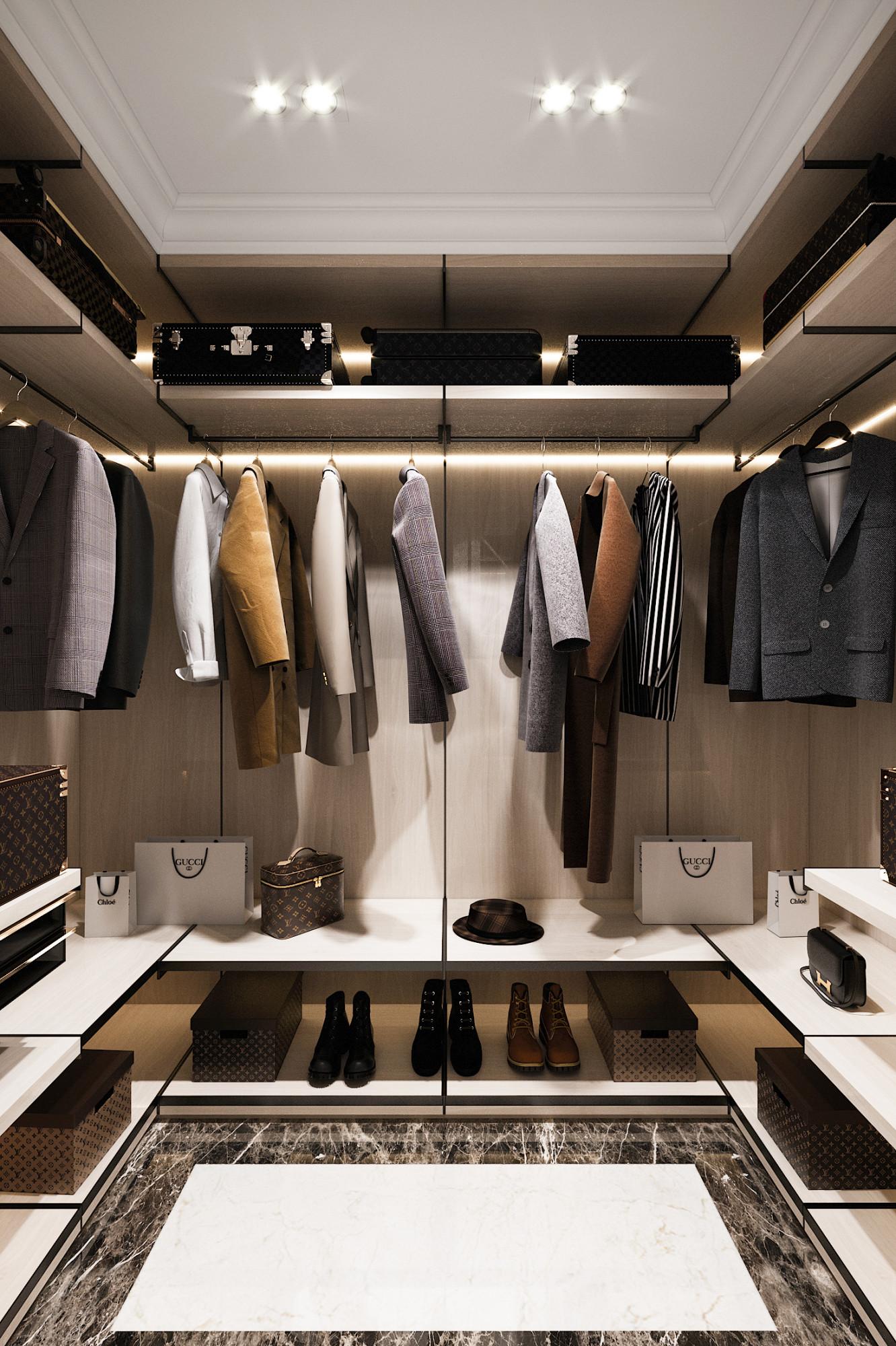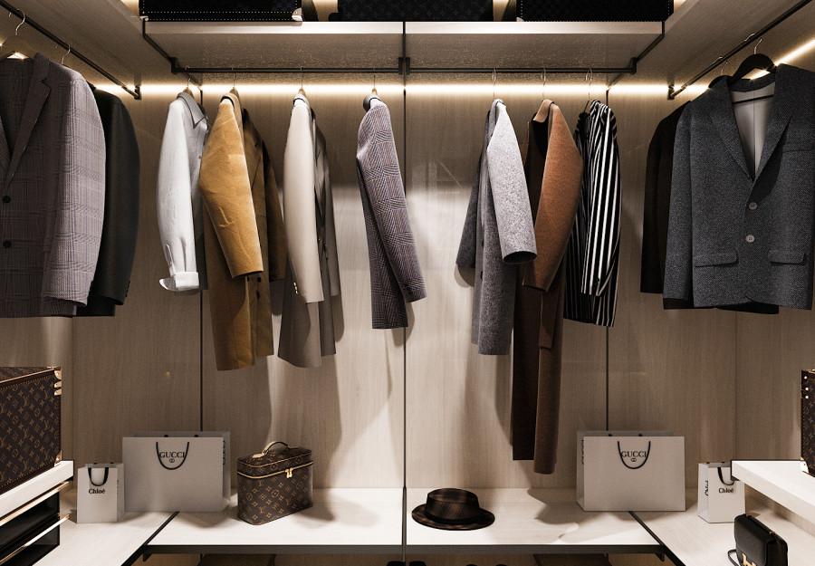 Интерьер выполнен в современном стиле с элементами роскоши и минимализма, что проявляется в чистых линиях мебели и изысканных деталях освещения. Основные материалы - мягкая тканевая обивка дивана и кресла в коричневых тонах, глянцевые фасады кухни в бежевой гамме, а также мраморные поверхности столов и пола, придающие элегантность пространству. Цветовая палитра выдержана в нейтральных оттенках: коричневый, бежевый, кремовый и золотистые акценты в элементах декора и освещения создают уютную атмосферу, дополненную современными арт-объектами и мягким текстилем.