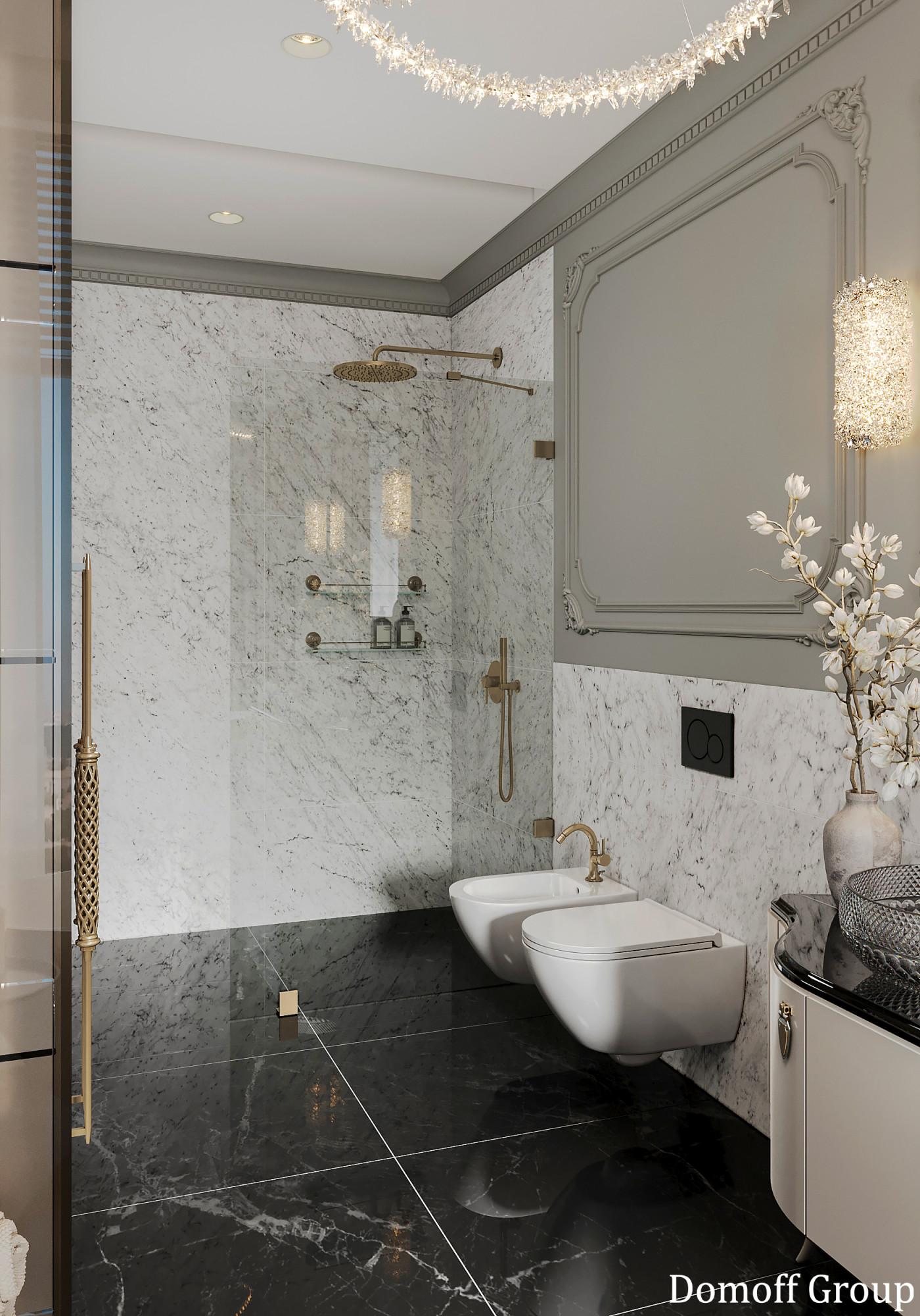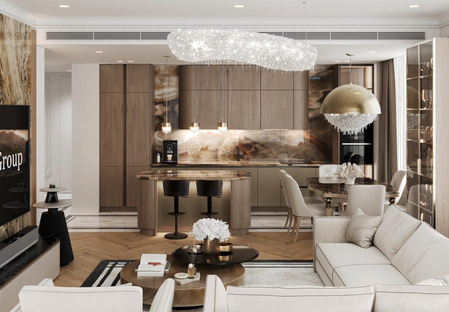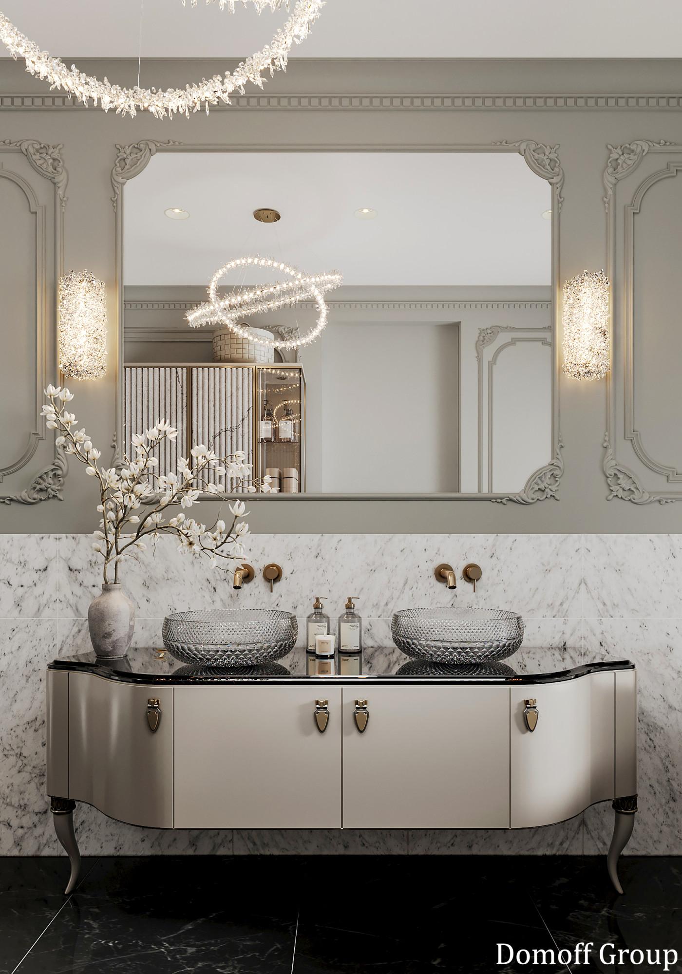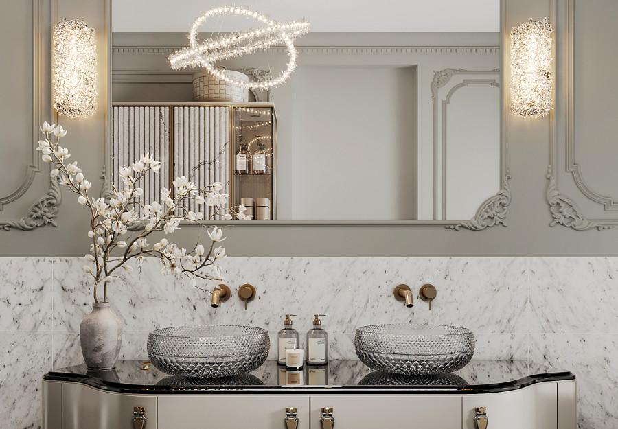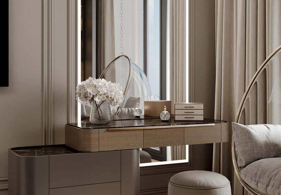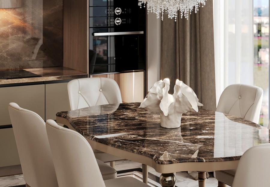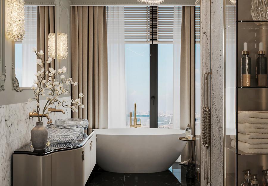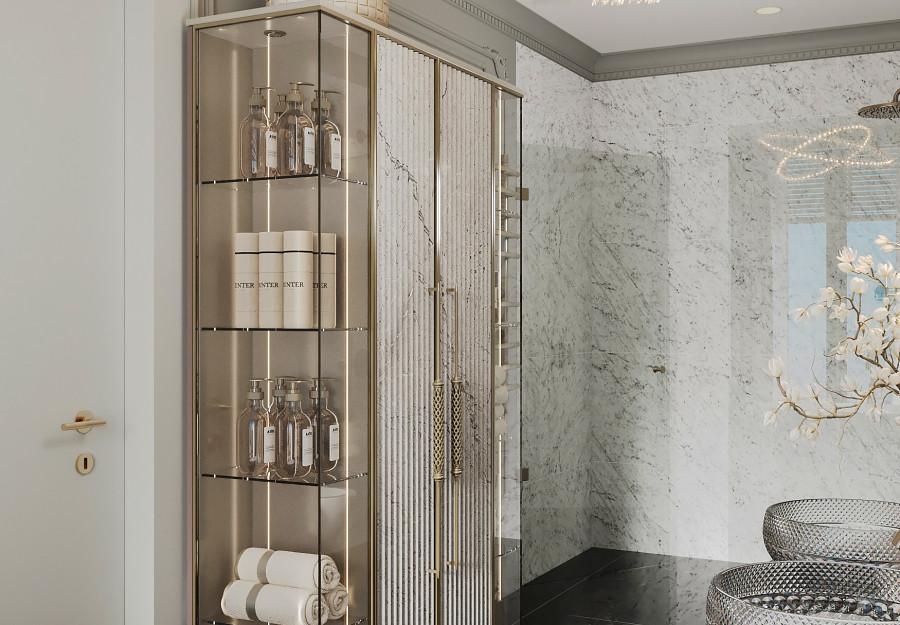 Интерьер выполнен в современном стиле с элементами классики. Минималистичный подход к декору с акцентом на натуральные материалы и текстуры делает его стильным и функциональным. Использование мрамора на стенах и в декоре придает элегантность. Светлые тона визуально расширяют пространство, а лаконичные формы мебели подчеркивают принадлежность стилю “вне времени”.