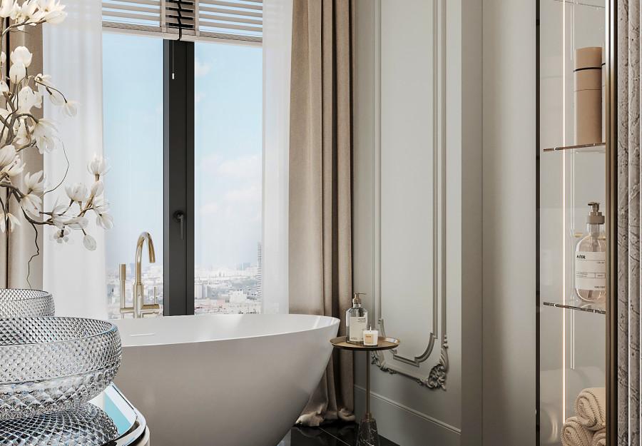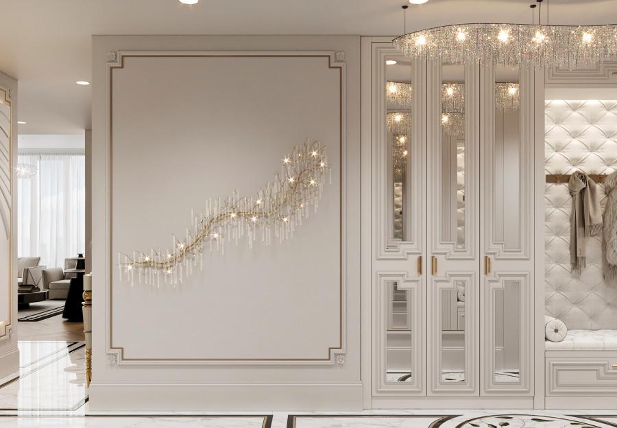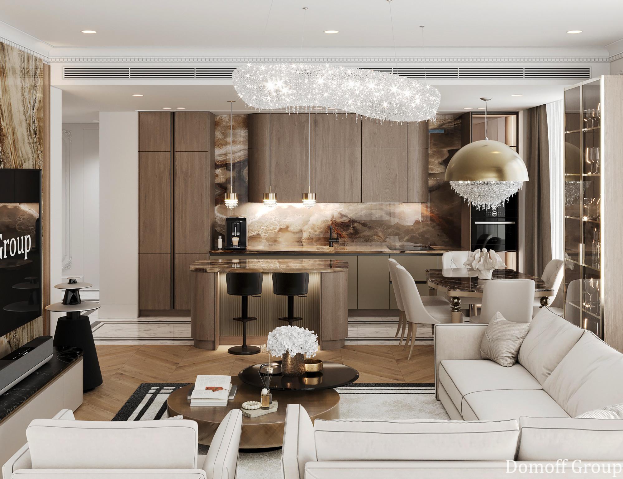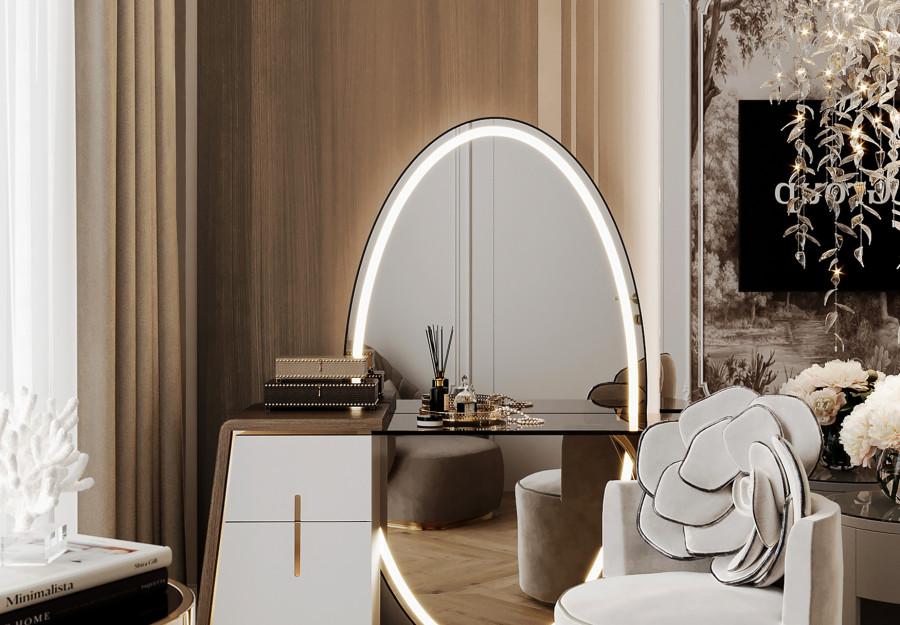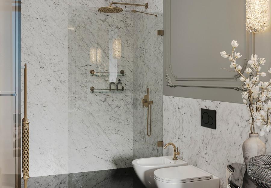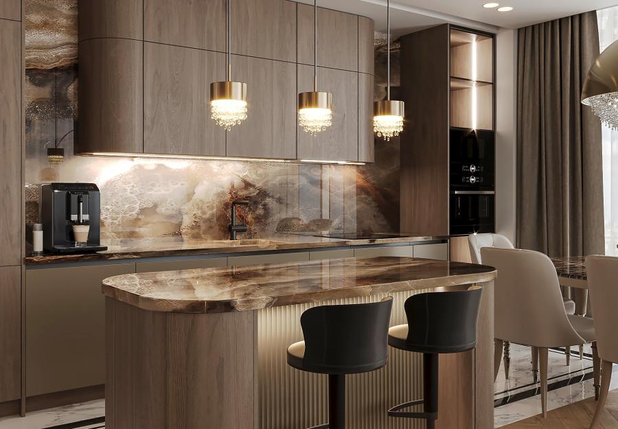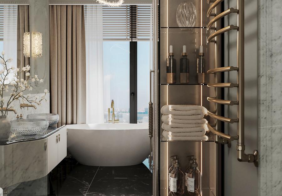 Интерьер выполнен в современном стиле с элементами классики. Минималистичный подход к декору с акцентом на натуральные материалы и текстуры делает его стильным и функциональным. Использование мрамора на стенах и в декоре придает элегантность. Светлые тона визуально расширяют пространство, а лаконичные формы мебели подчеркивают принадлежность стилю “вне времени”.