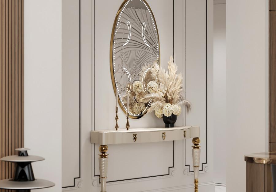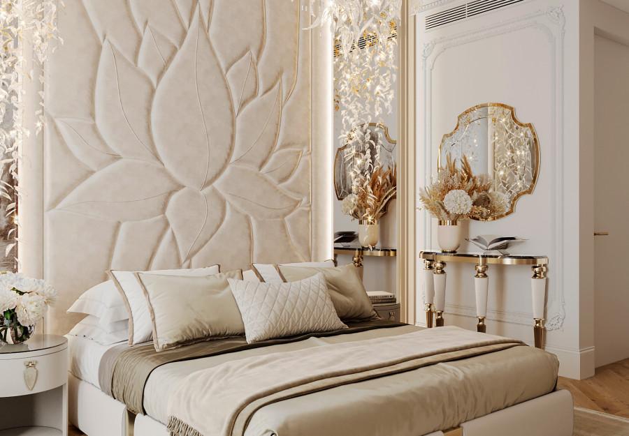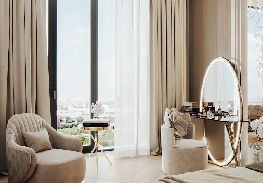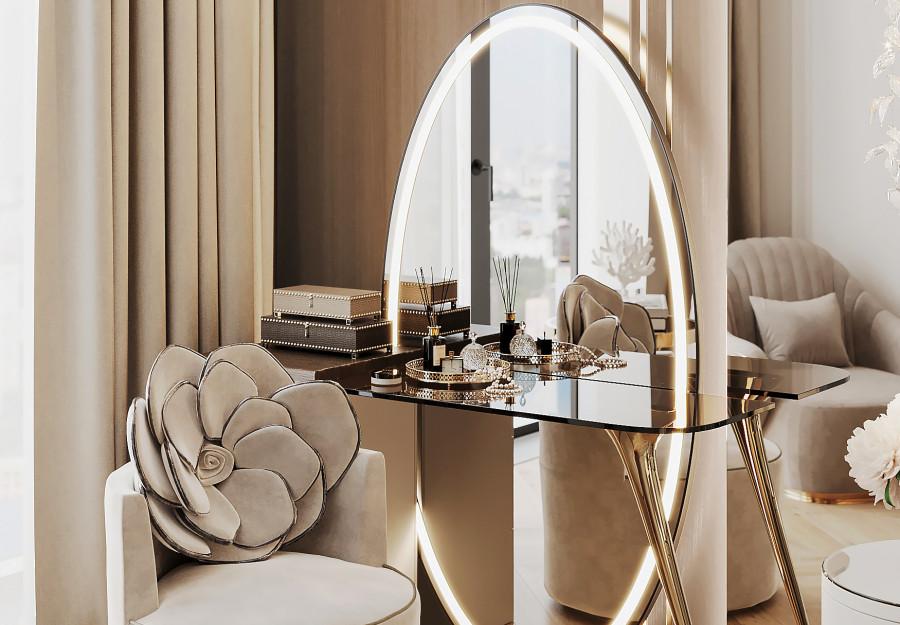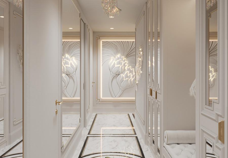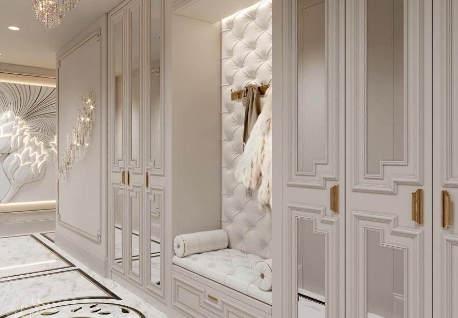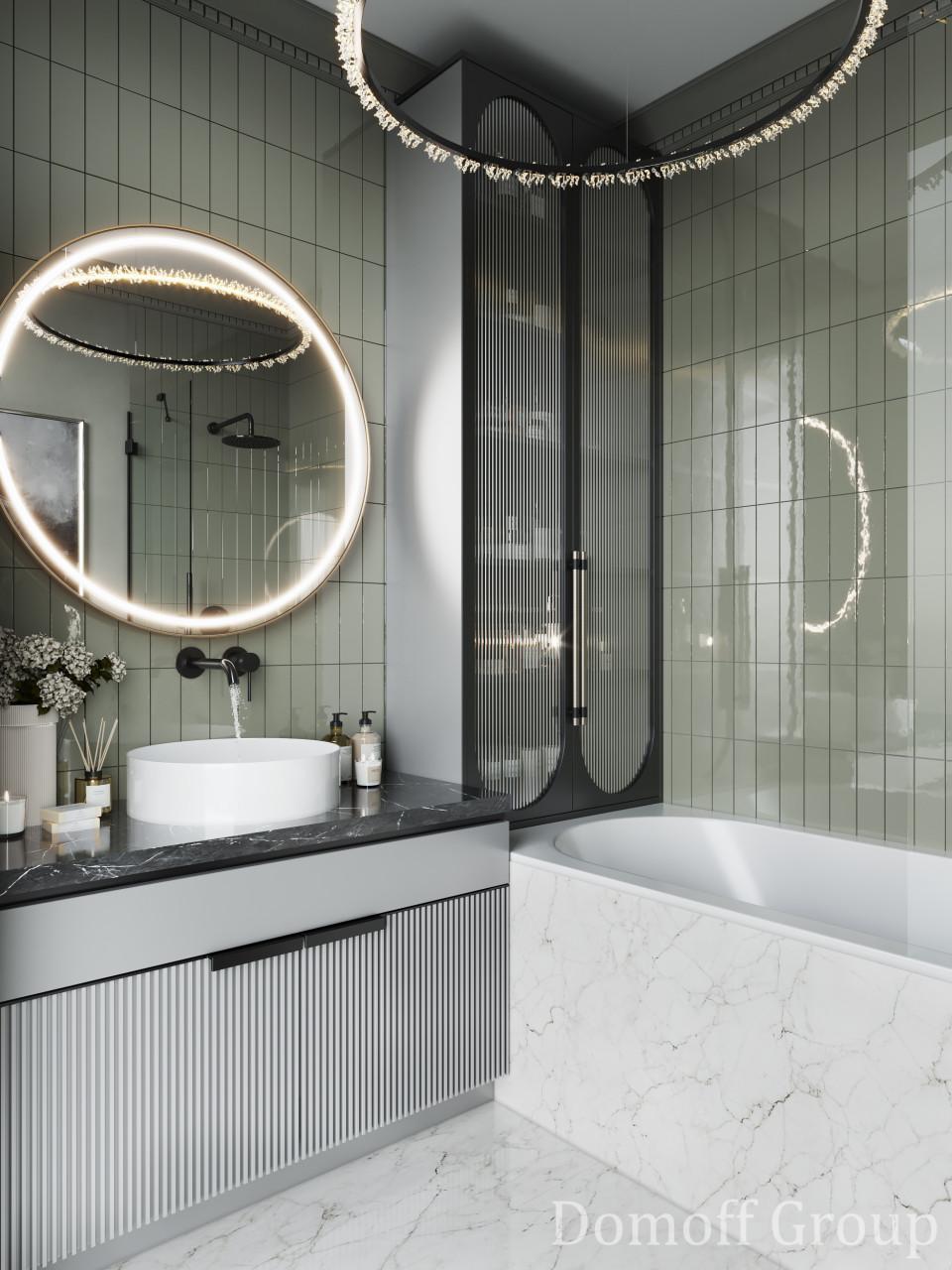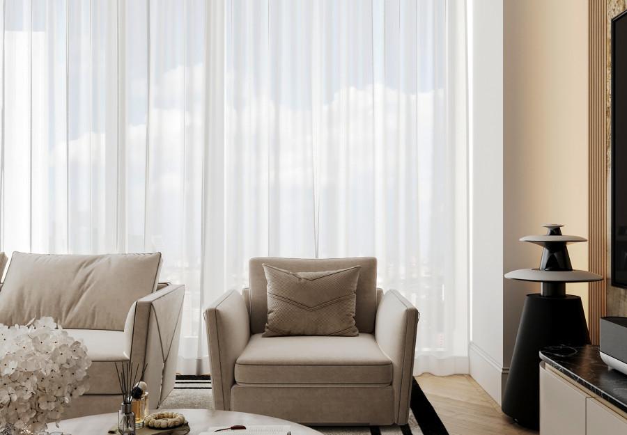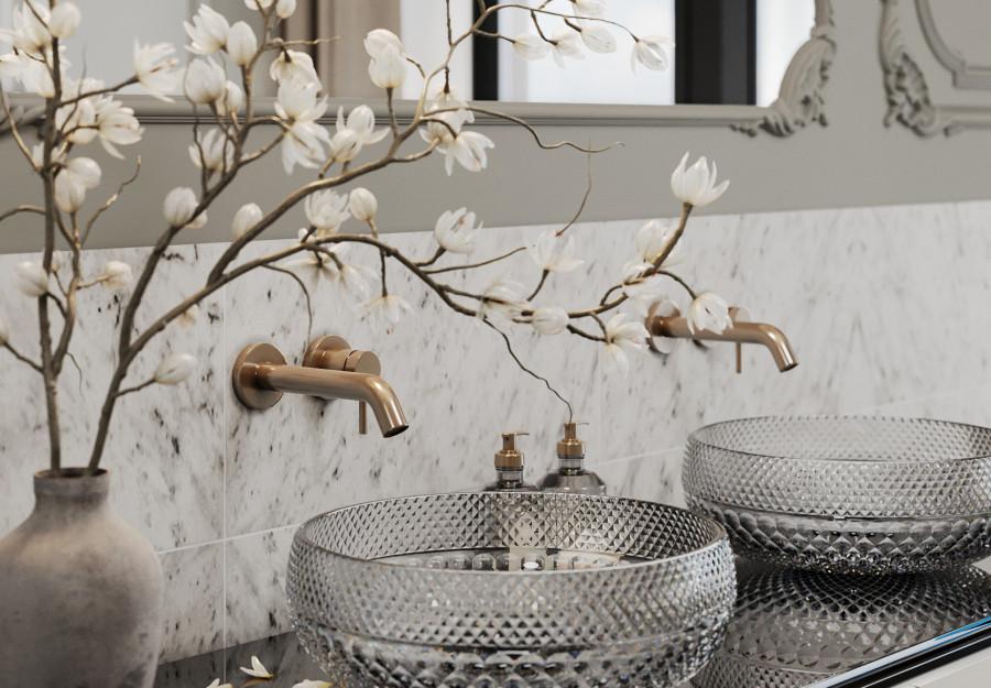 Интерьер выполнен в современном стиле с элементами классики. Минималистичный подход к декору с акцентом на натуральные материалы и текстуры делает его стильным и функциональным. Использование мрамора на стенах и в декоре придает элегантность. Светлые тона визуально расширяют пространство, а лаконичные формы мебели подчеркивают принадлежность стилю “вне времени”.