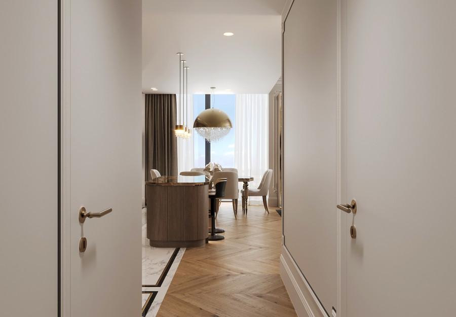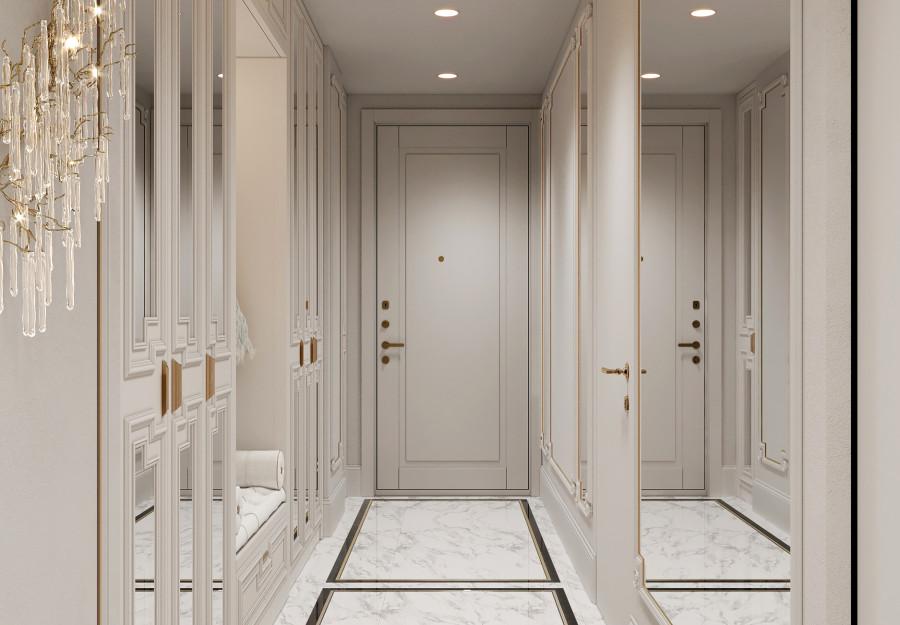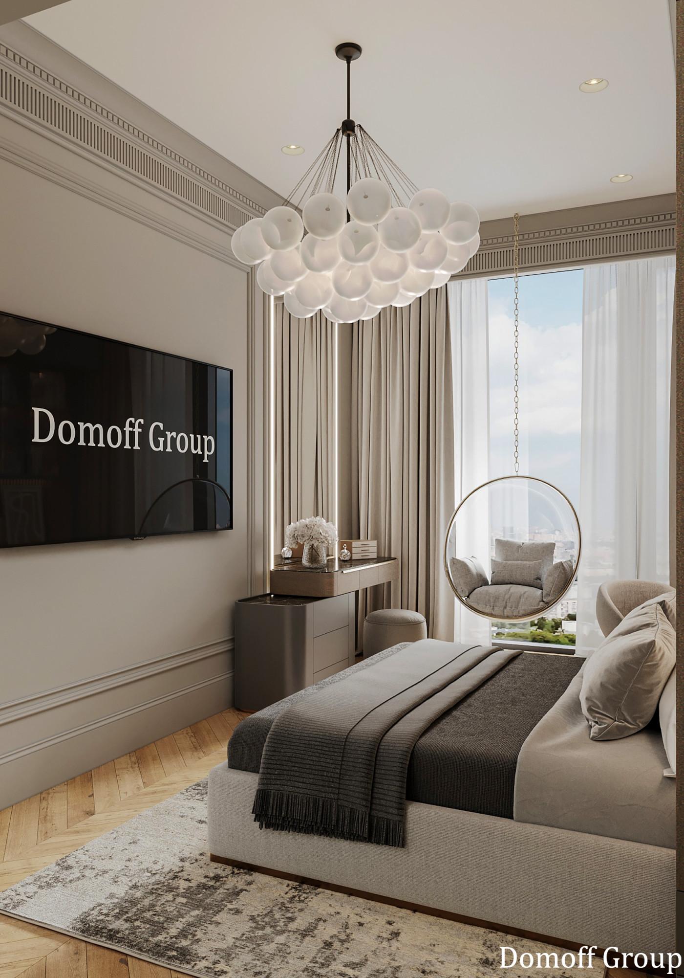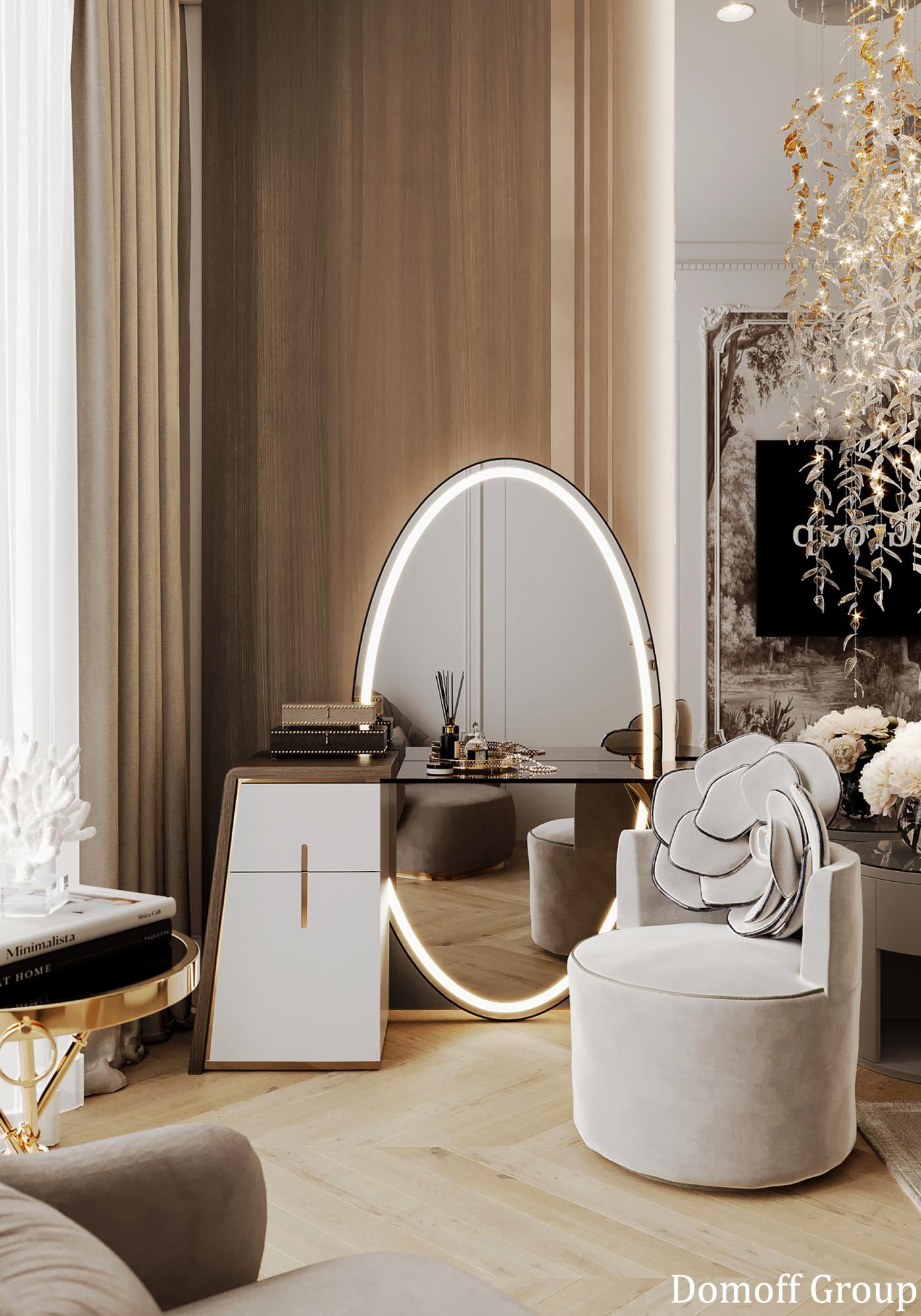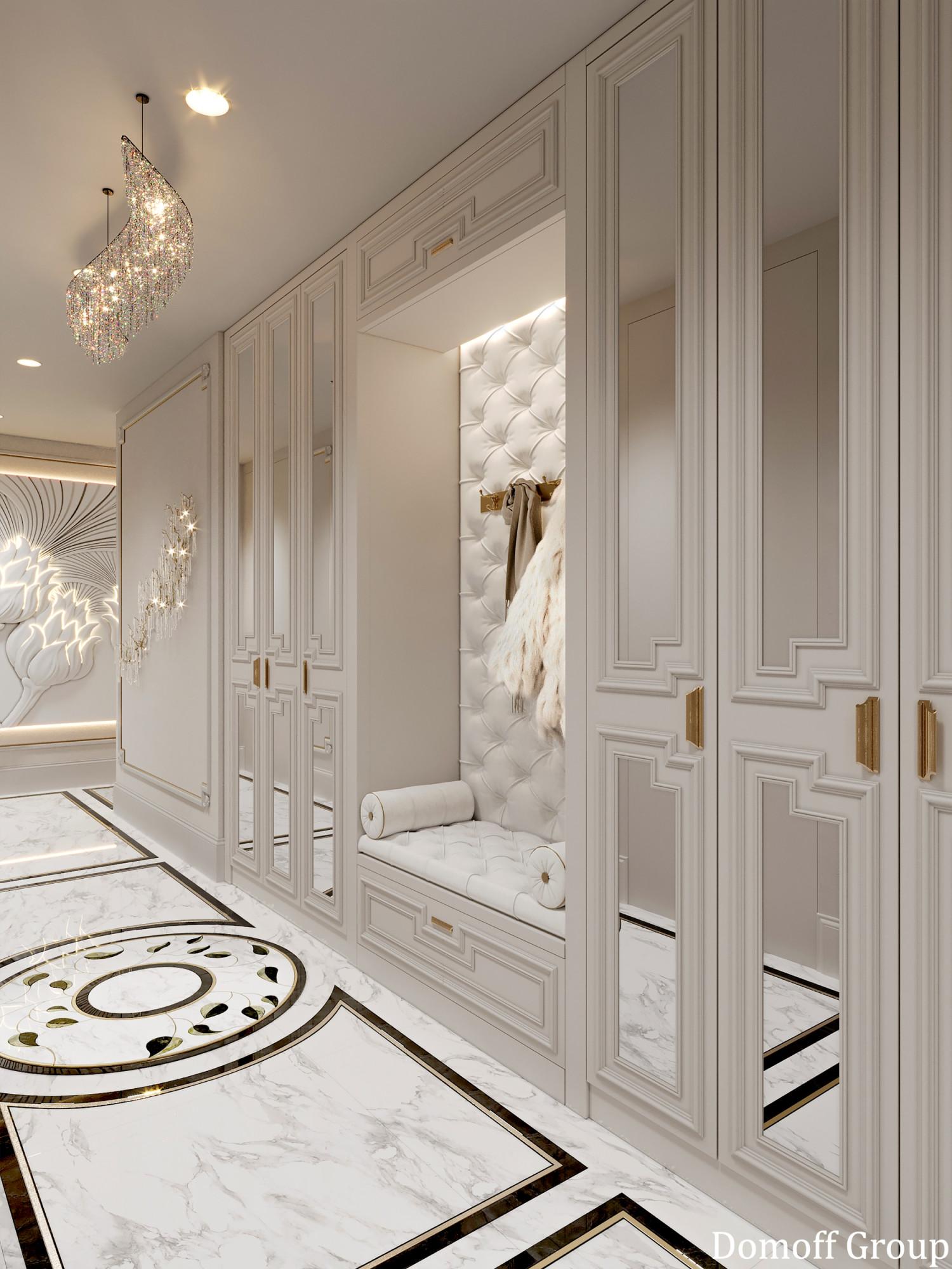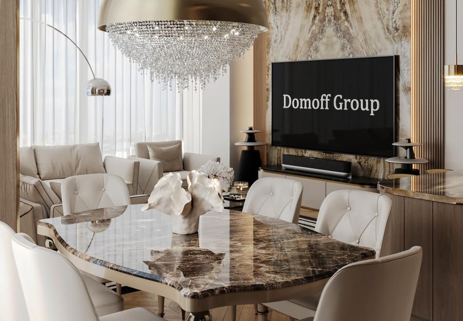 Интерьер выполнен в современном стиле с элементами классики. Минималистичный подход к декору с акцентом на натуральные материалы и текстуры делает его стильным и функциональным. Использование мрамора на стенах и в декоре придает элегантность. Светлые тона визуально расширяют пространство, а лаконичные формы мебели подчеркивают принадлежность стилю “вне времени”.