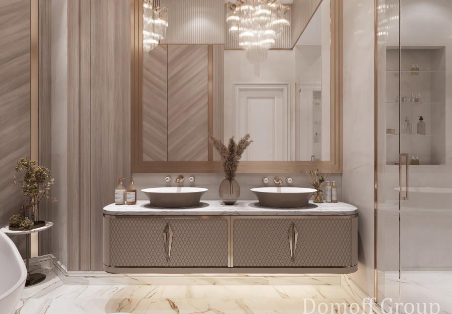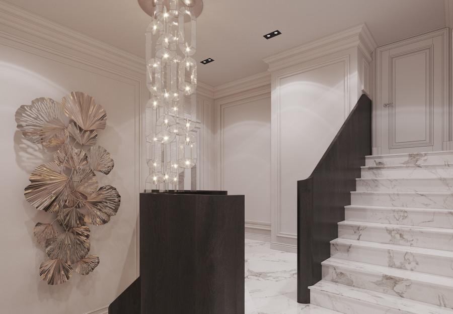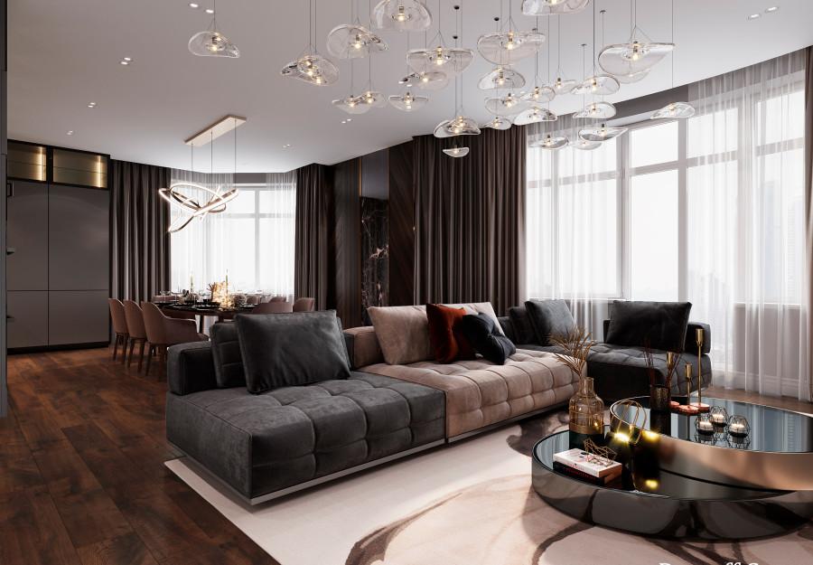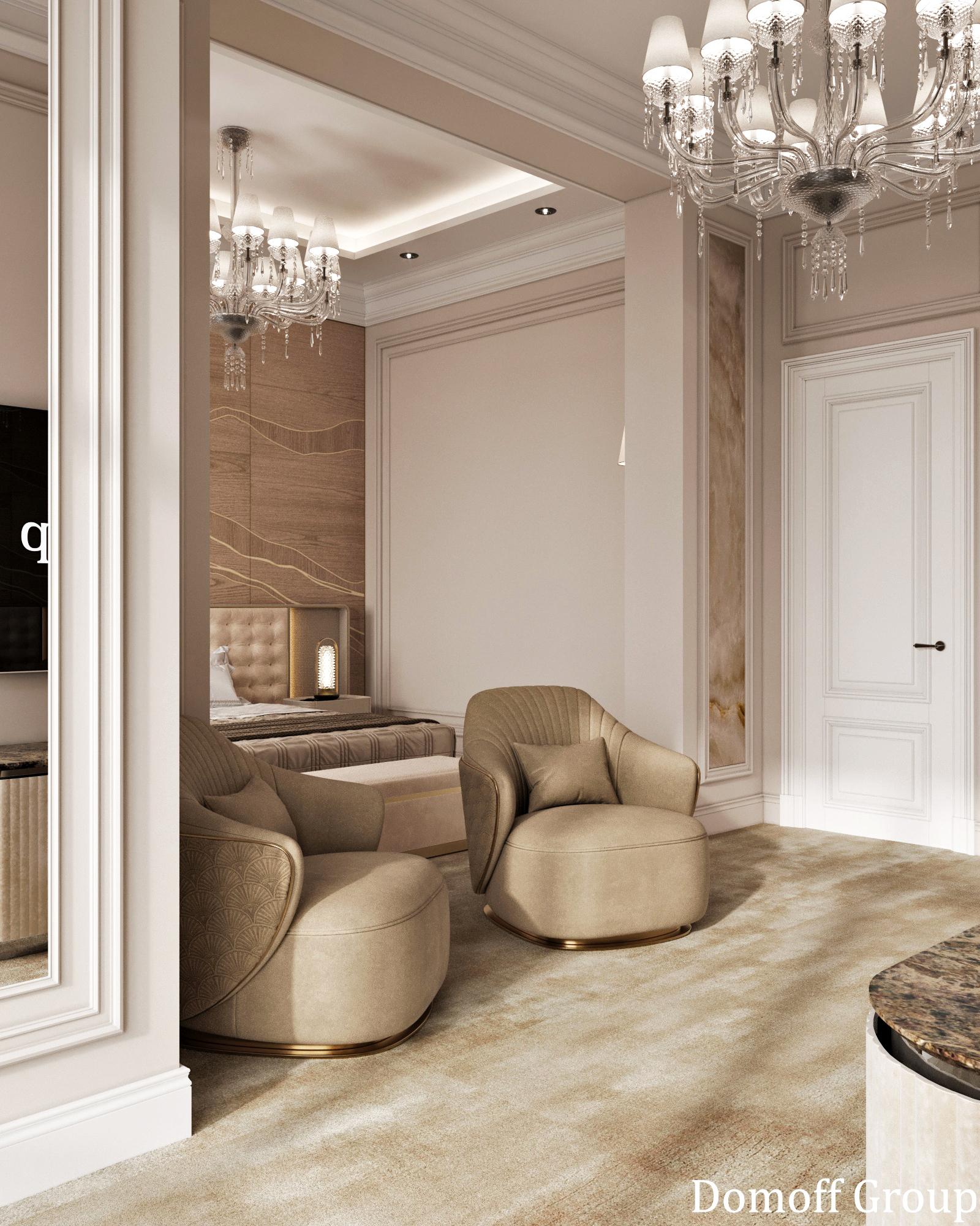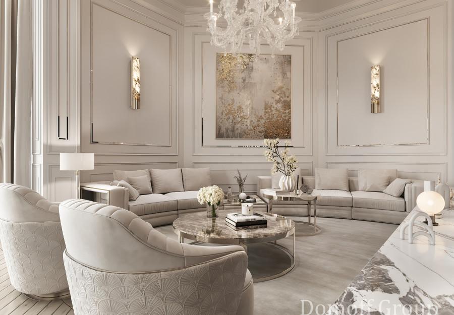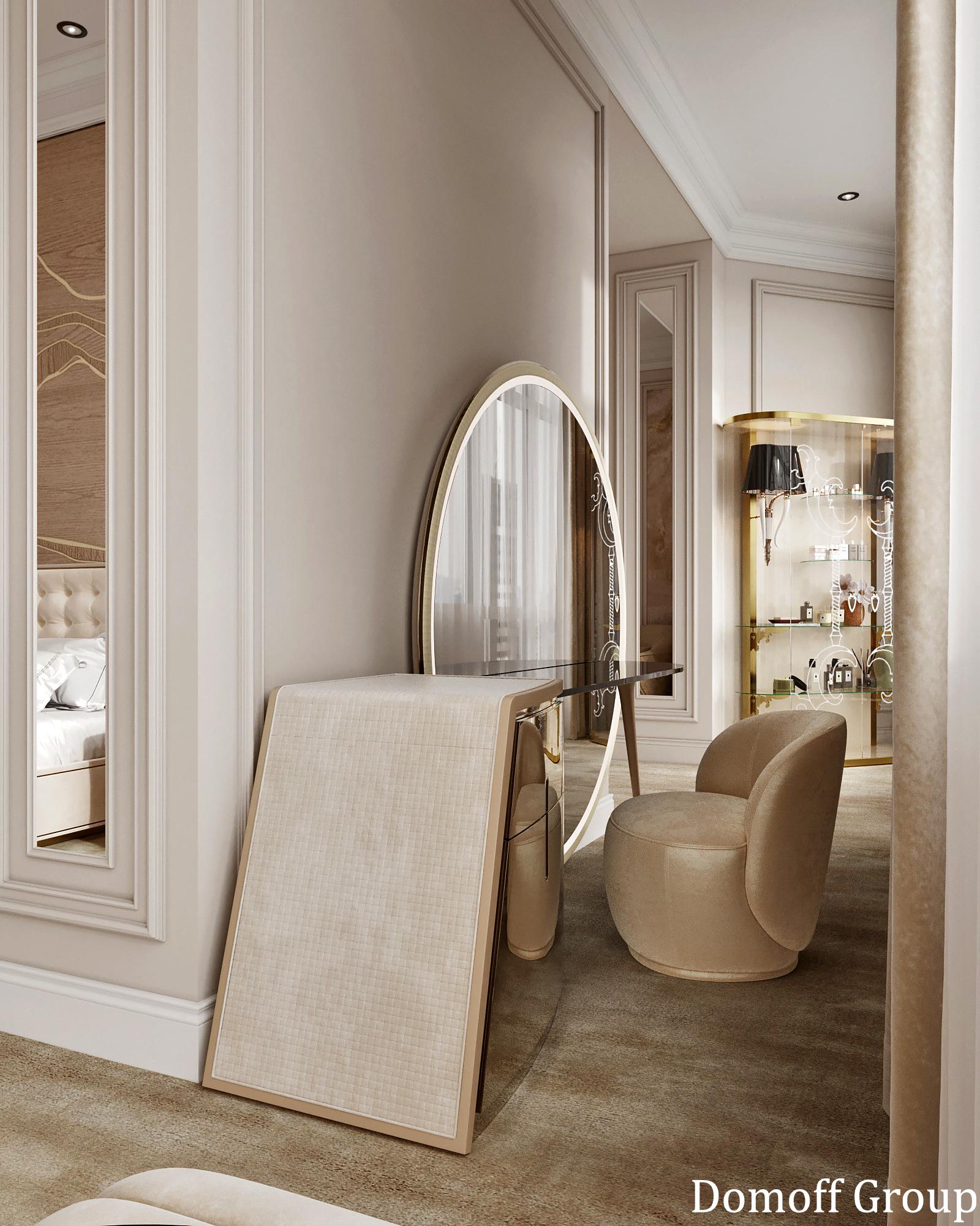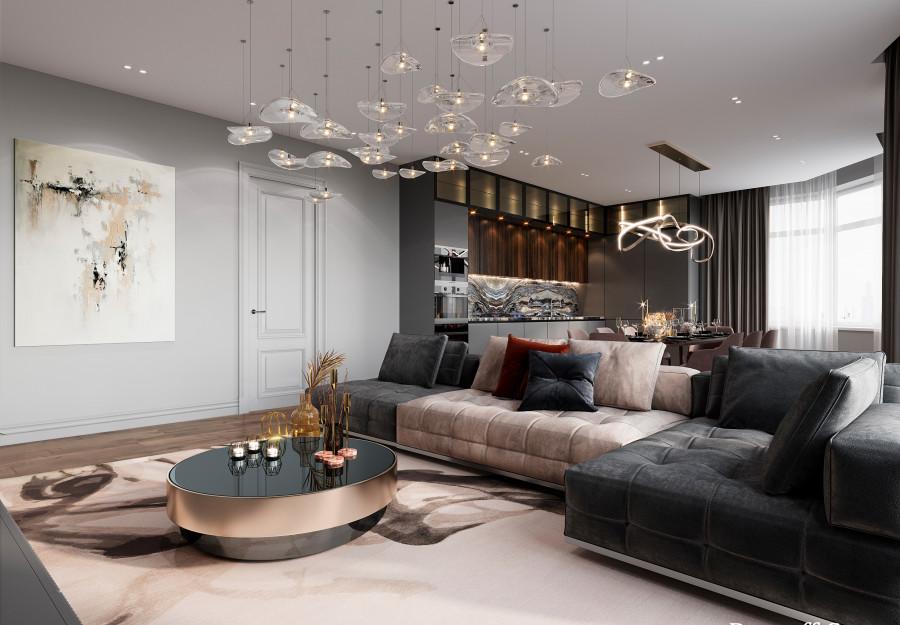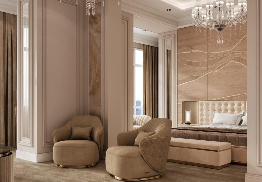 Интерьер выполнен в современном стиле с элементами минимализма и роскоши. Удачное сочетание нейтральных оттенков и металлических акцентов делает пространство элегантным и утонченным. Благородные бежевые, серые и коричневые тона, которые создают уютную атмосферу. Золотые элементы, такие как отделка мебели и декоративные детали, добавляют интерьеру тепла. Мягкая мебель бархатной обивкой и изысканные предметы освещения, подчеркивают стиль и статусность пространства.