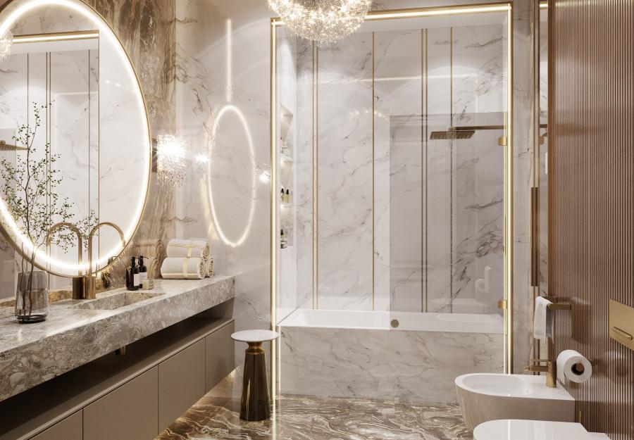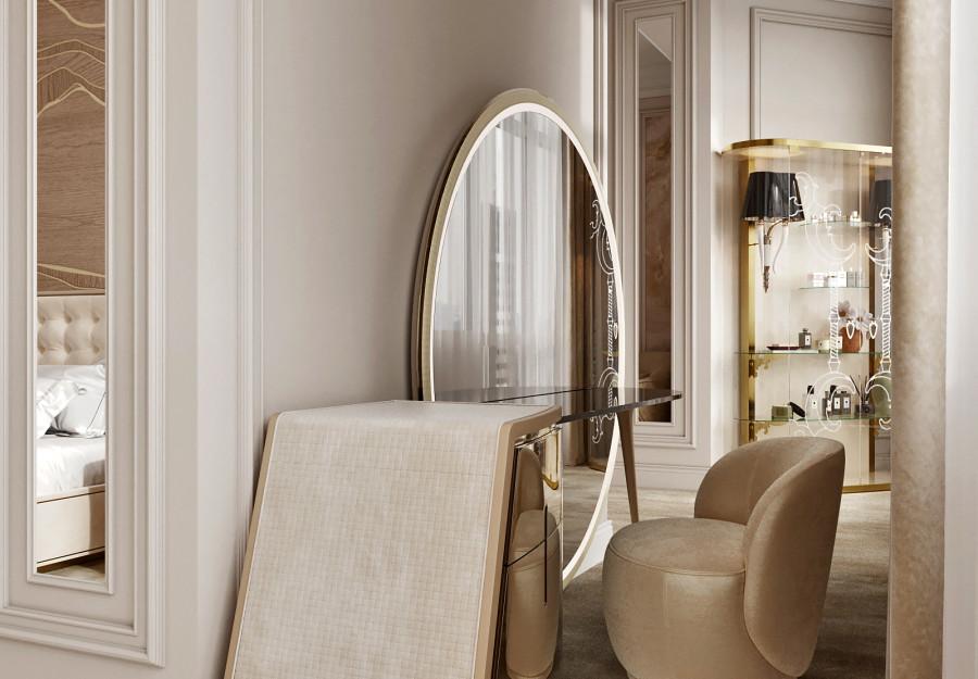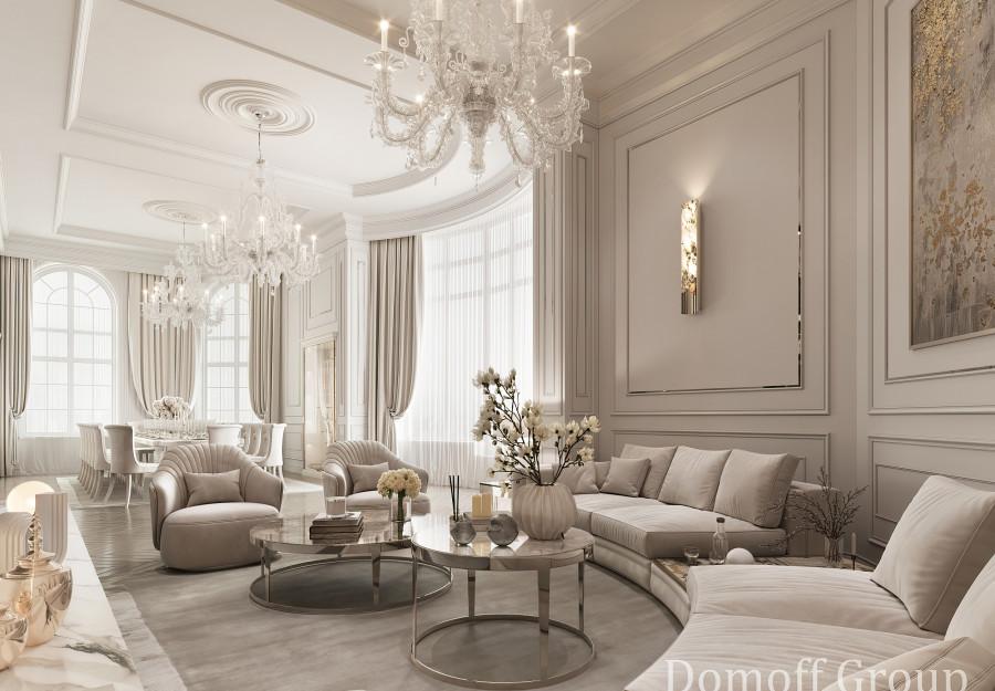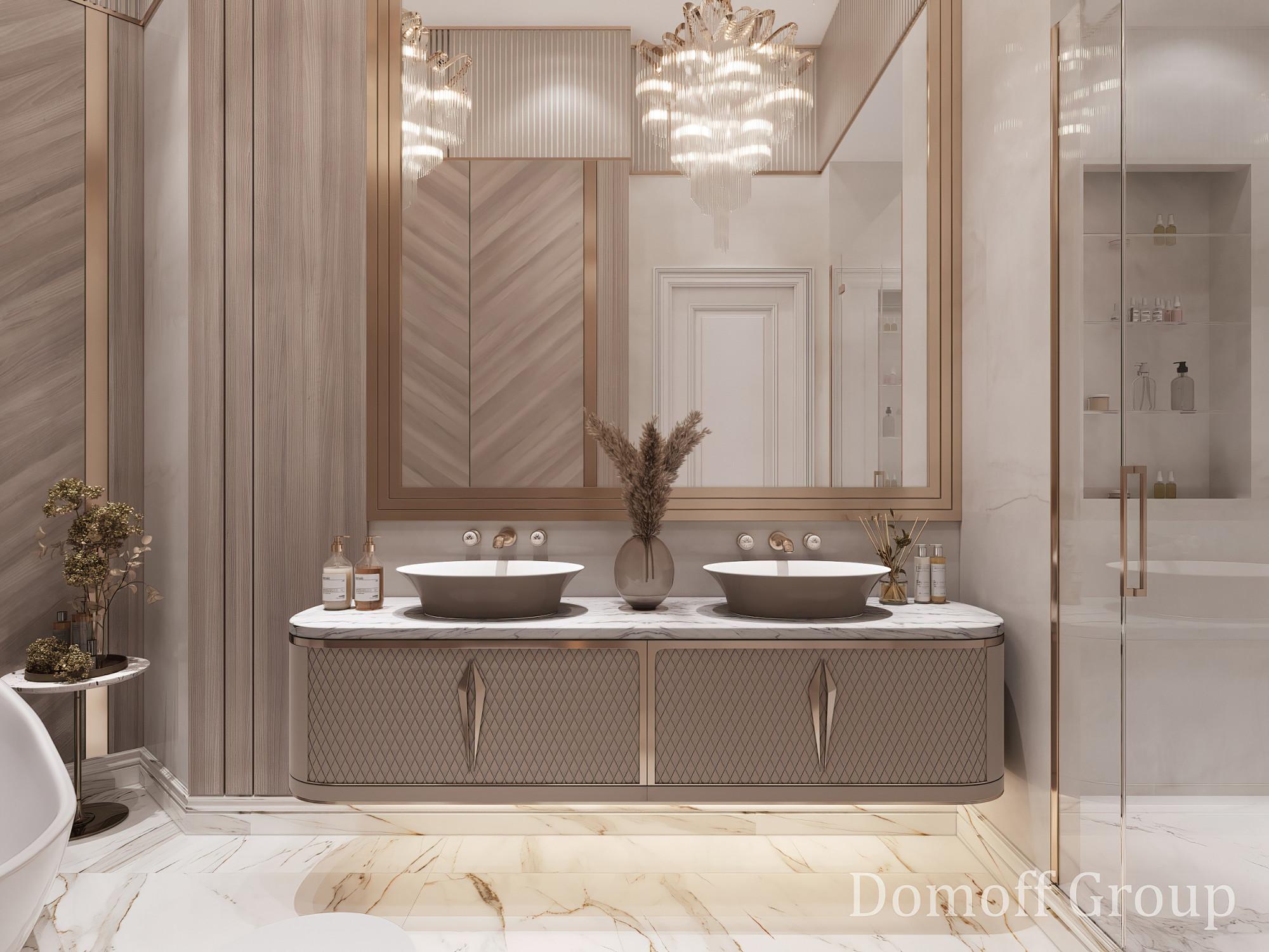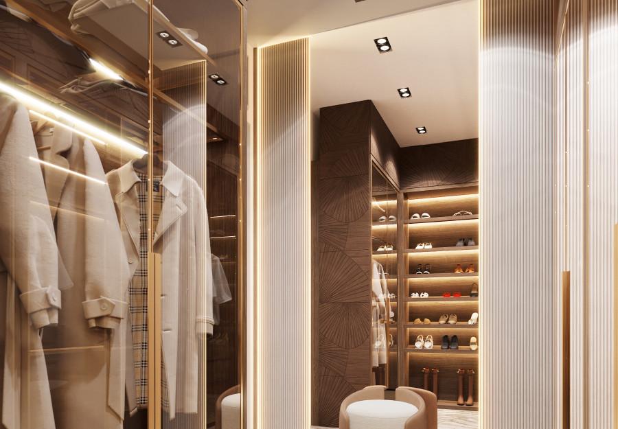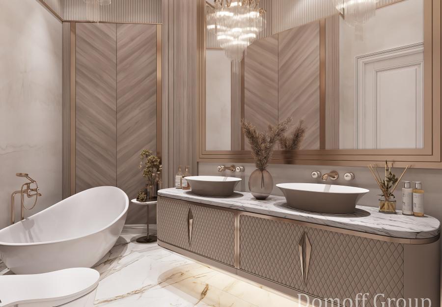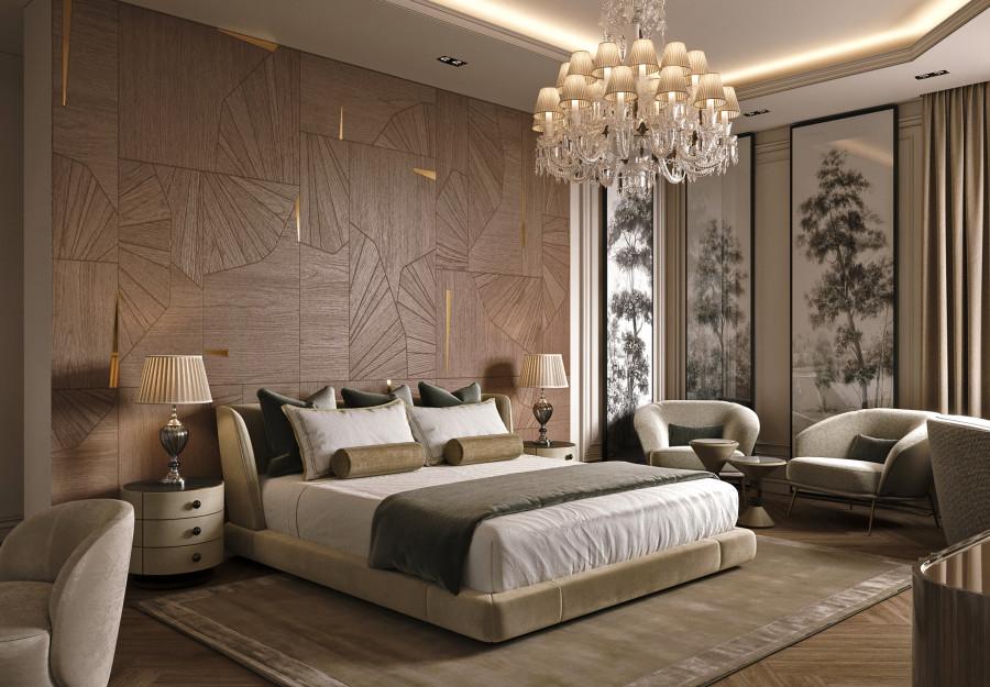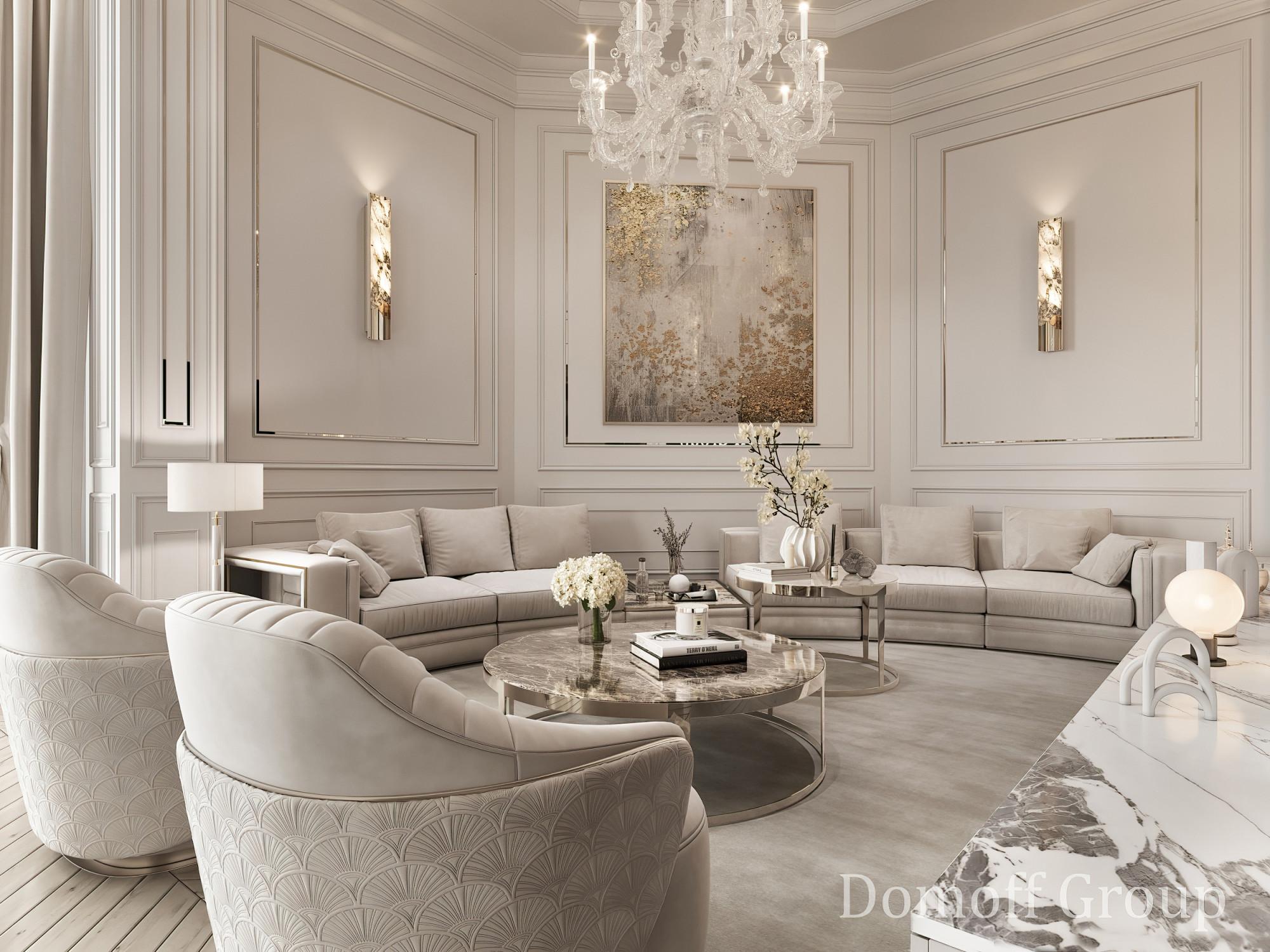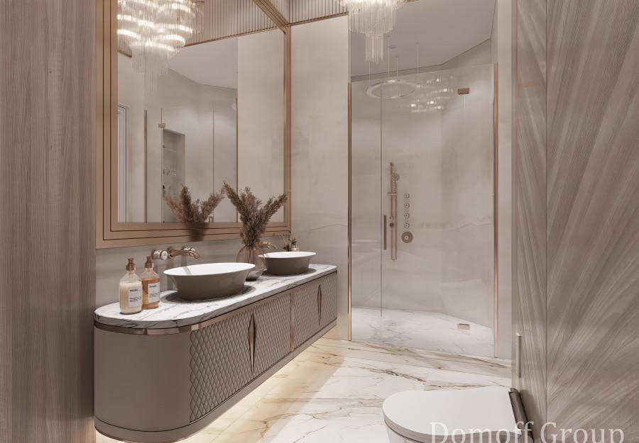 Интерьер выполнен в современном стиле с элементами минимализма и роскоши. Удачное сочетание нейтральных оттенков и металлических акцентов делает пространство элегантным и утонченным. Благородные бежевые, серые и коричневые тона, которые создают уютную атмосферу. Золотые элементы, такие как отделка мебели и декоративные детали, добавляют интерьеру тепла. Мягкая мебель бархатной обивкой и изысканные предметы освещения, подчеркивают стиль и статусность пространства.
