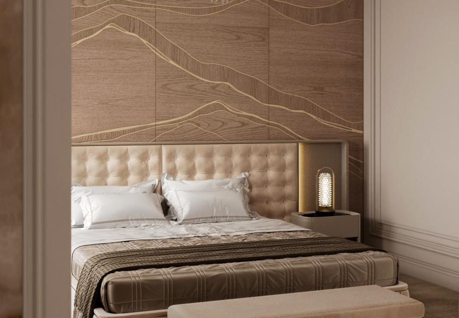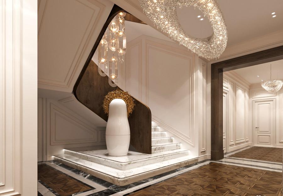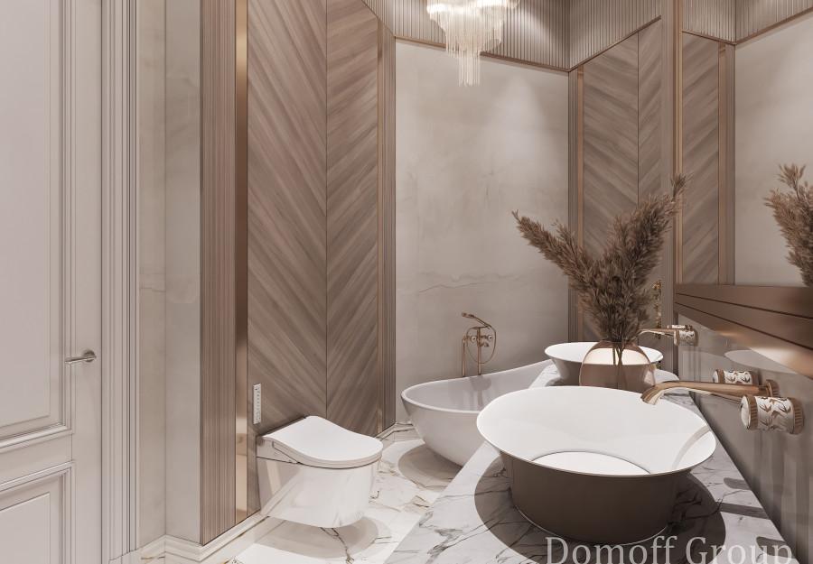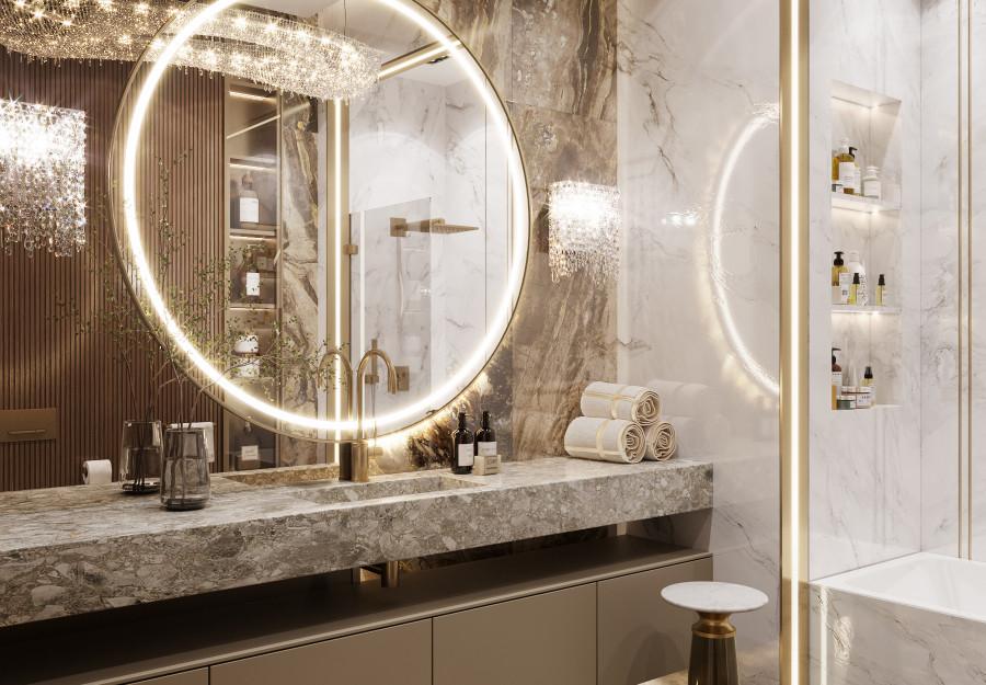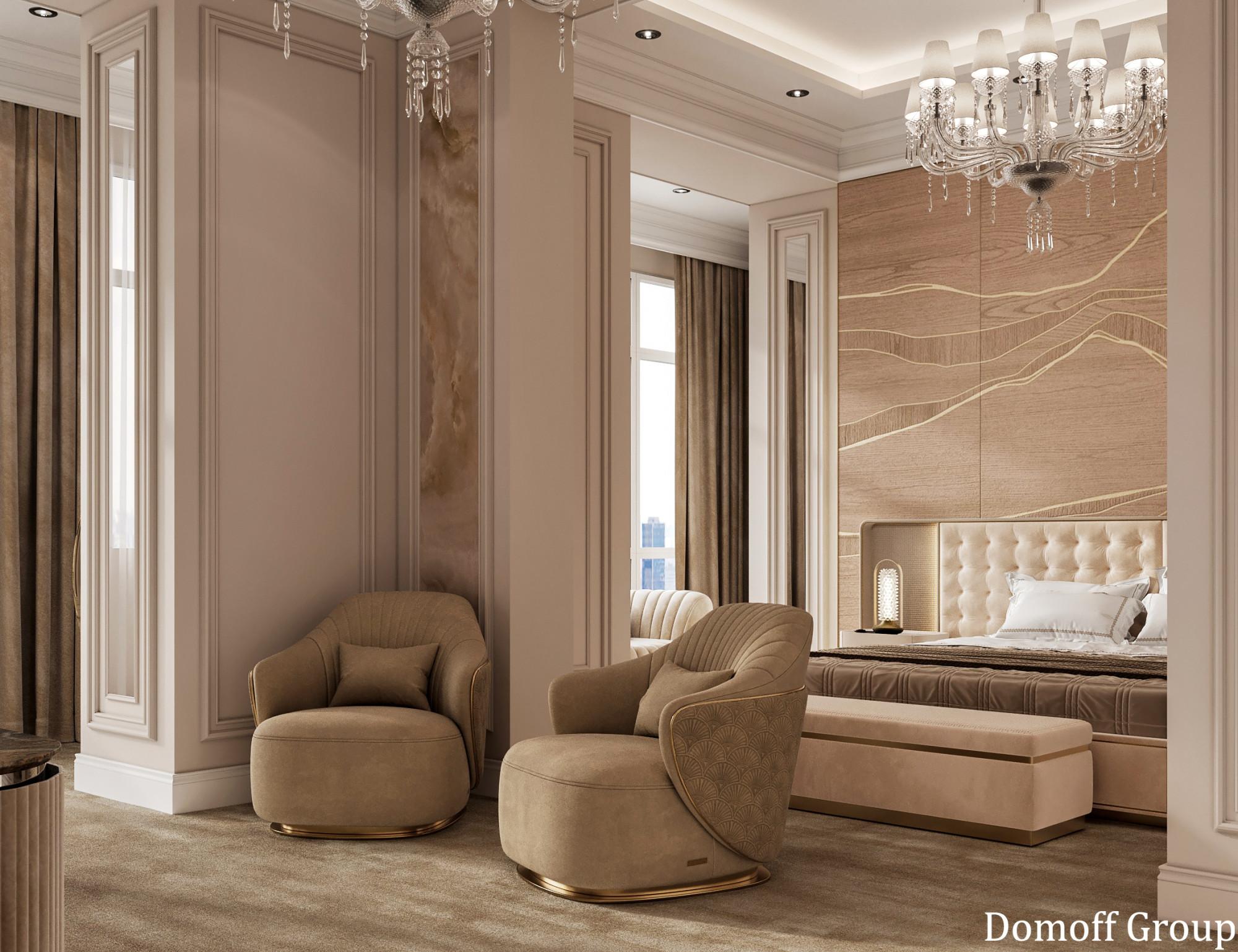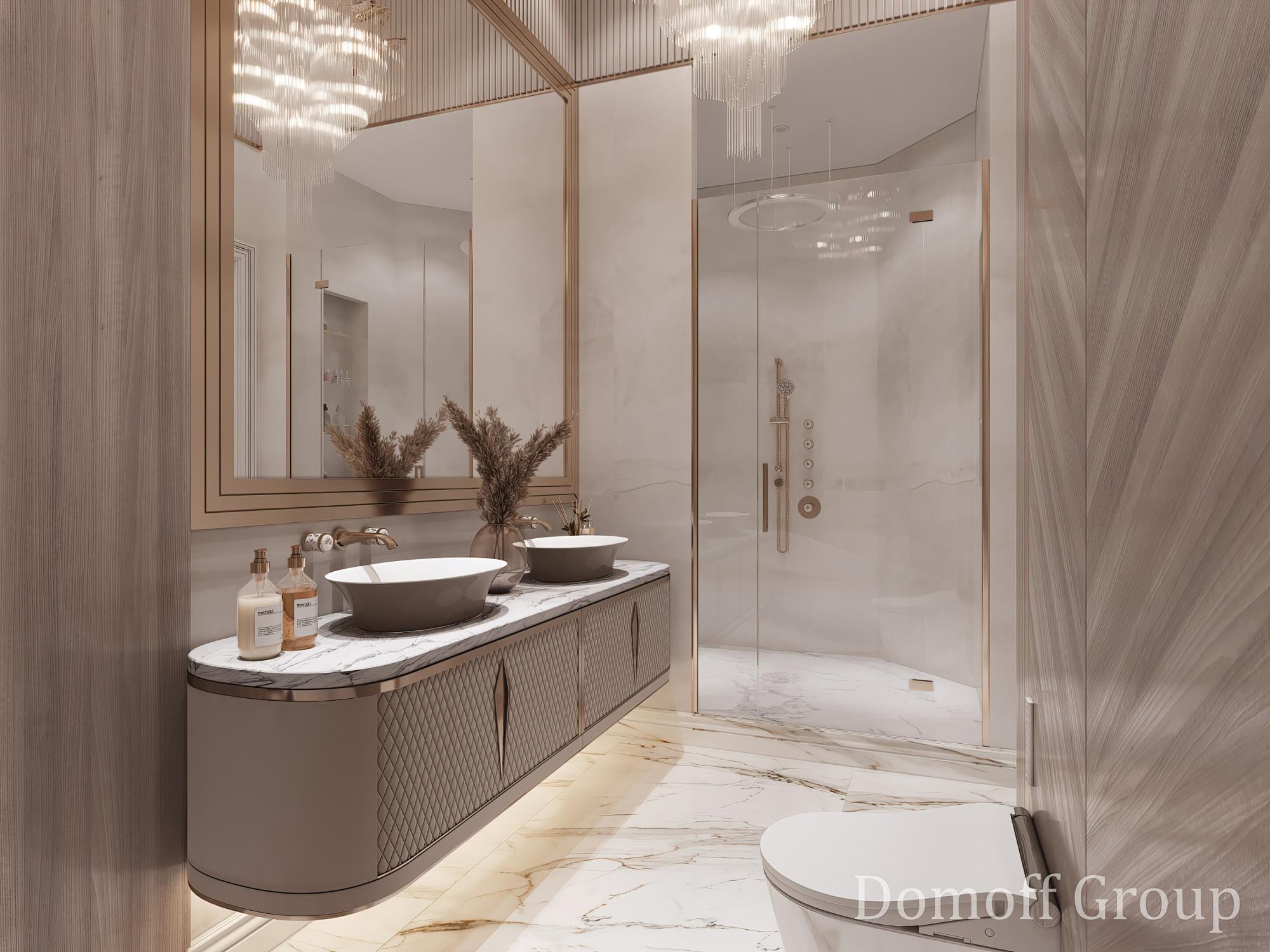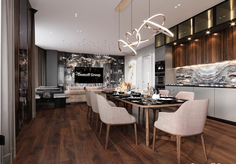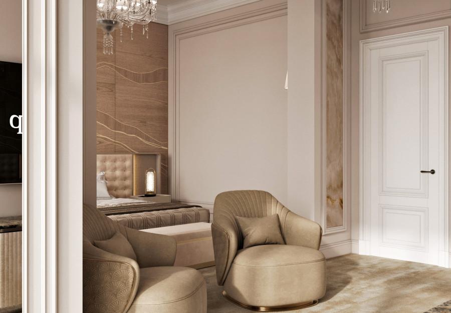 Интерьер выполнен в современном стиле с элементами минимализма и роскоши. Удачное сочетание нейтральных оттенков и металлических акцентов делает пространство элегантным и утонченным. Благородные бежевые, серые и коричневые тона, которые создают уютную атмосферу. Золотые элементы, такие как отделка мебели и декоративные детали, добавляют интерьеру тепла. Мягкая мебель бархатной обивкой и изысканные предметы освещения, подчеркивают стиль и статусность пространства.