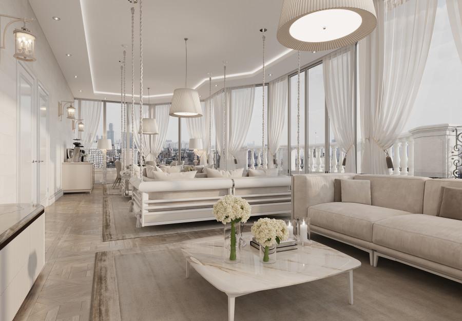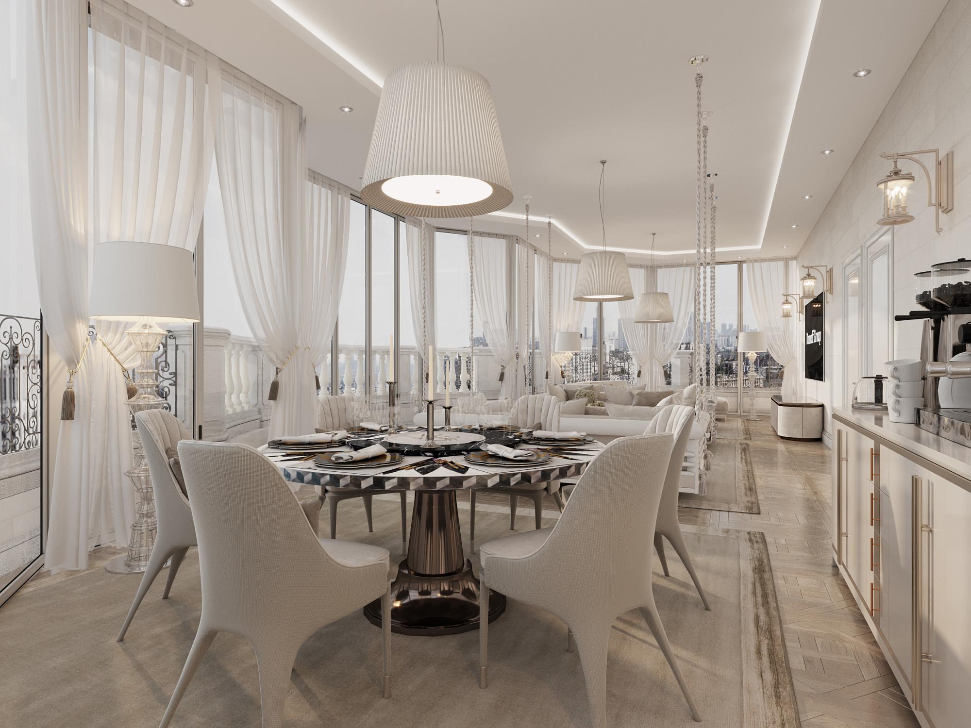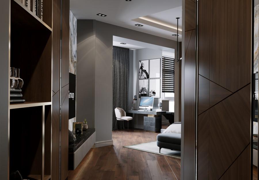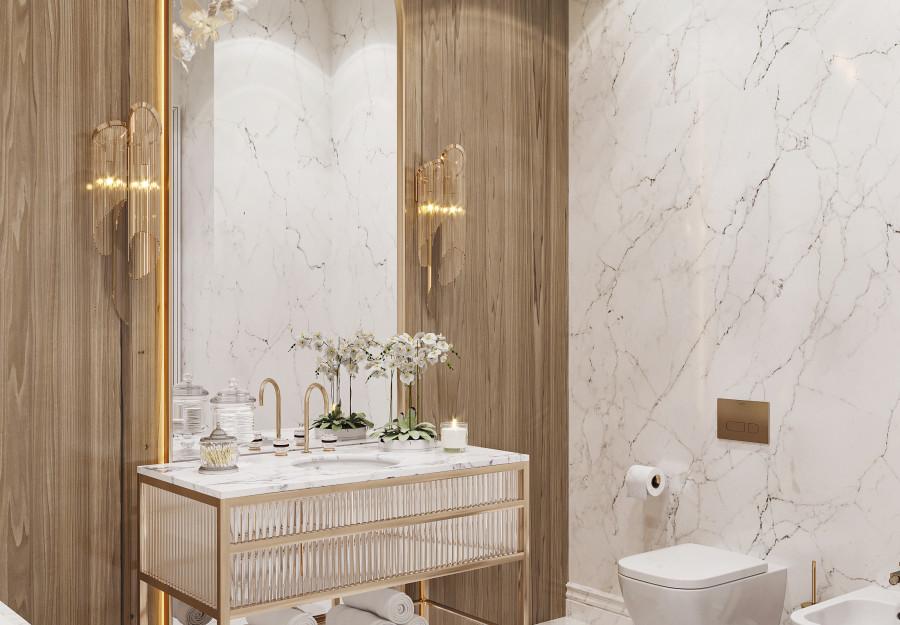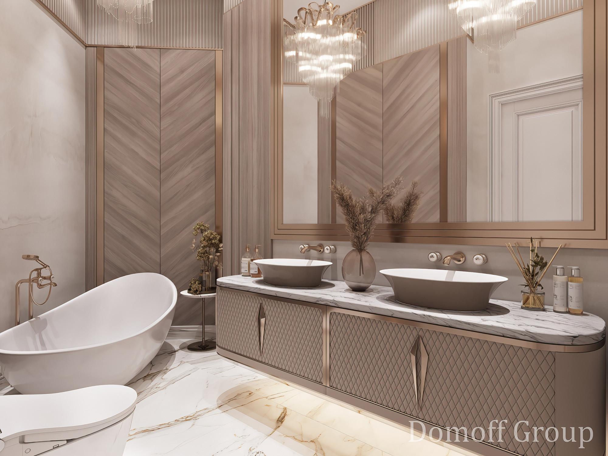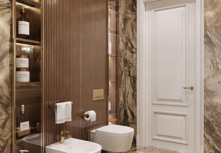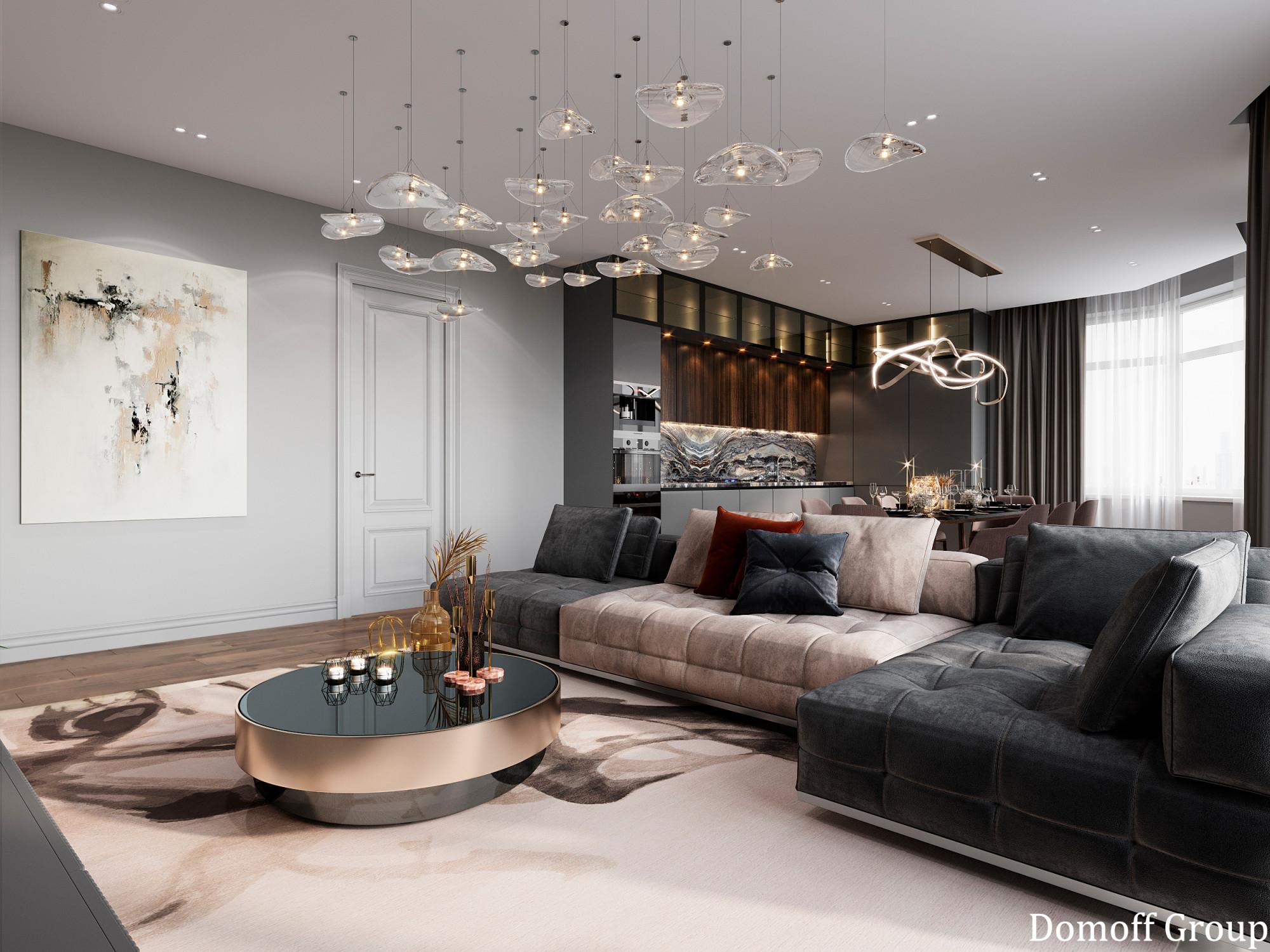 Интерьер выполнен в современном стиле с элементами минимализма и роскоши. Удачное сочетание нейтральных оттенков и металлических акцентов делает пространство элегантным и утонченным. Благородные бежевые, серые и коричневые тона, которые создают уютную атмосферу. Золотые элементы, такие как отделка мебели и декоративные детали, добавляют интерьеру тепла. Мягкая мебель бархатной обивкой и изысканные предметы освещения, подчеркивают стиль и статусность пространства.