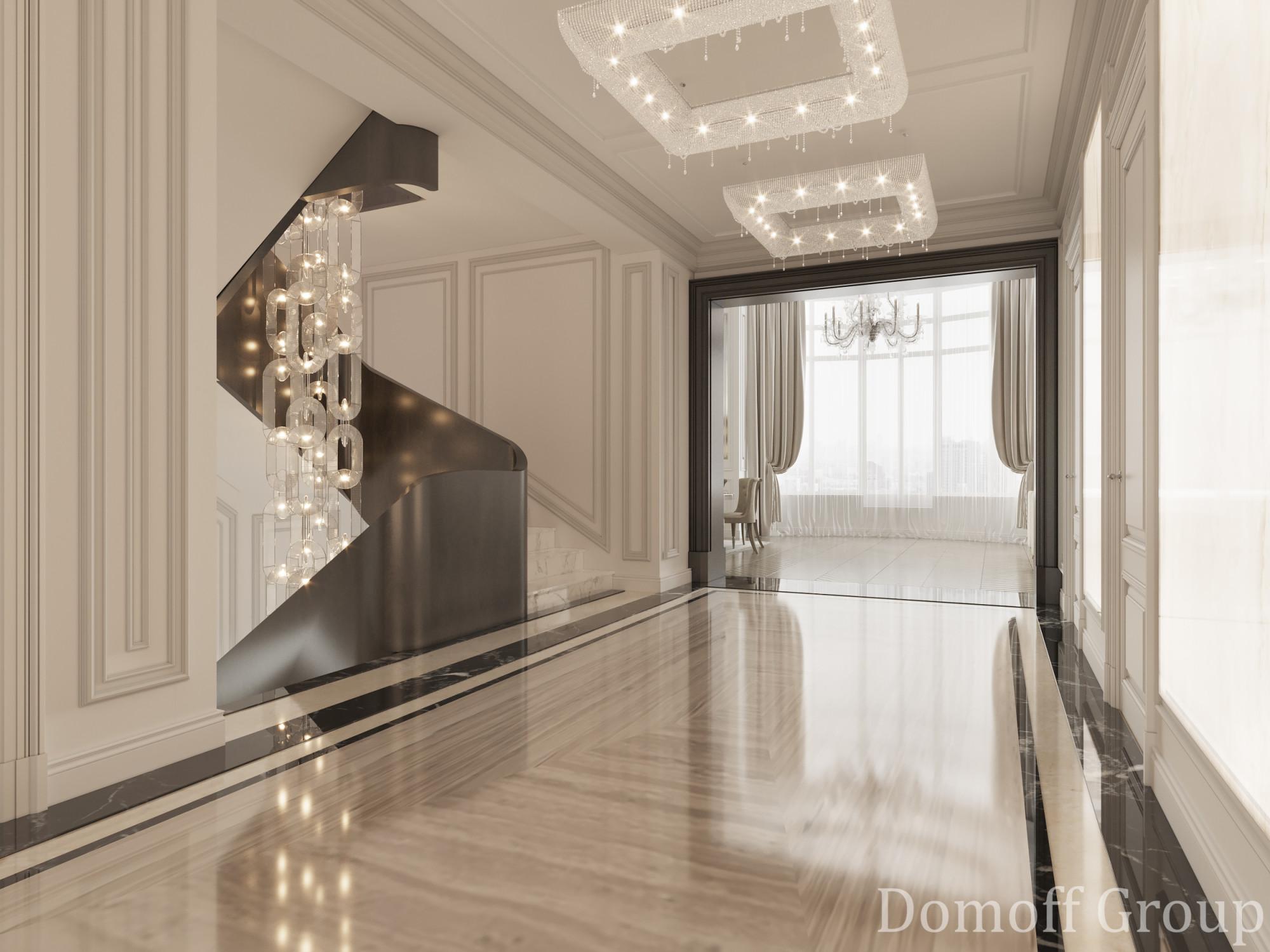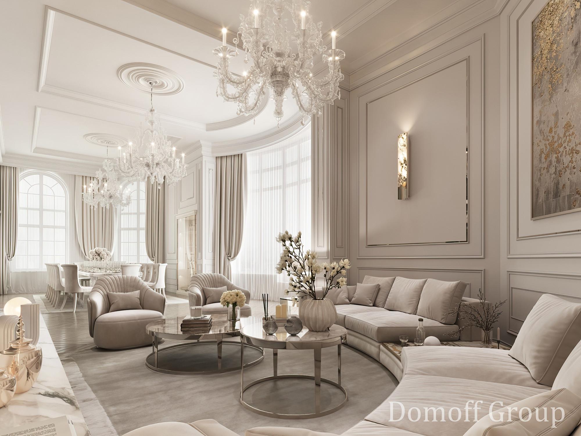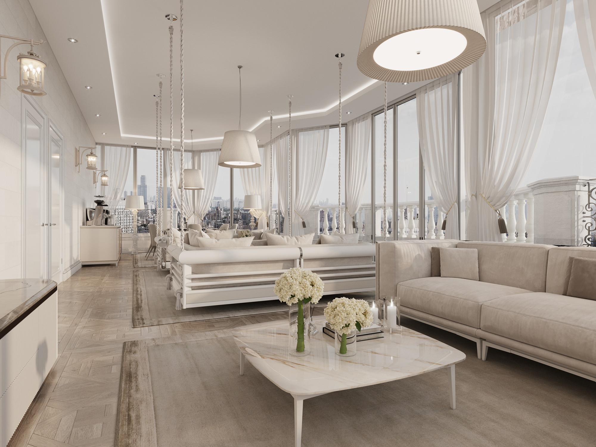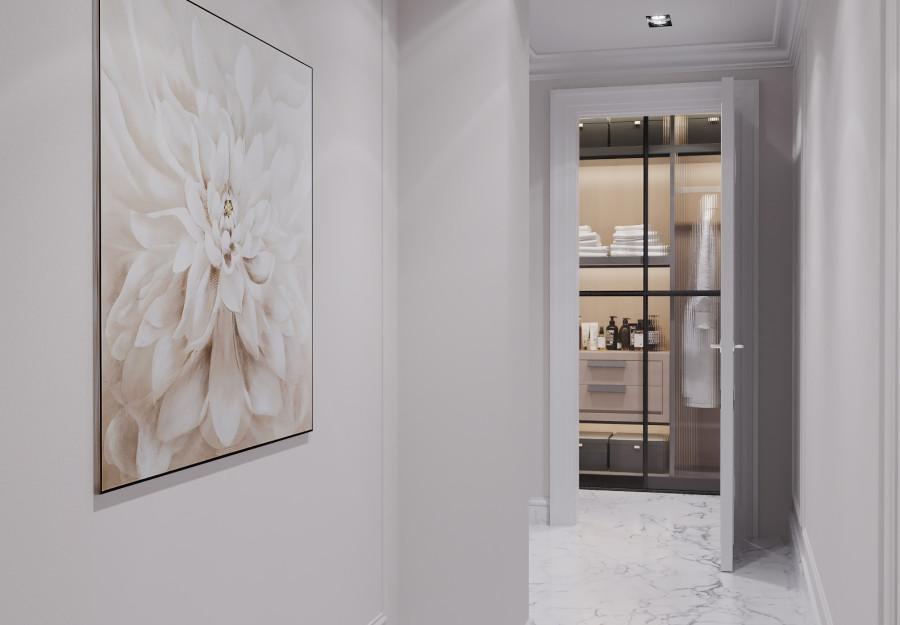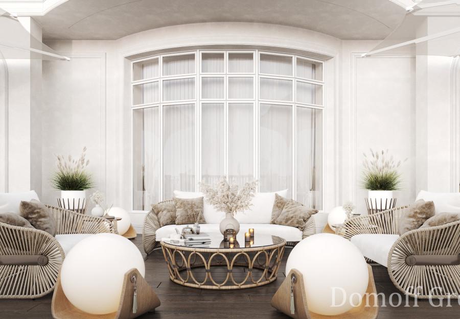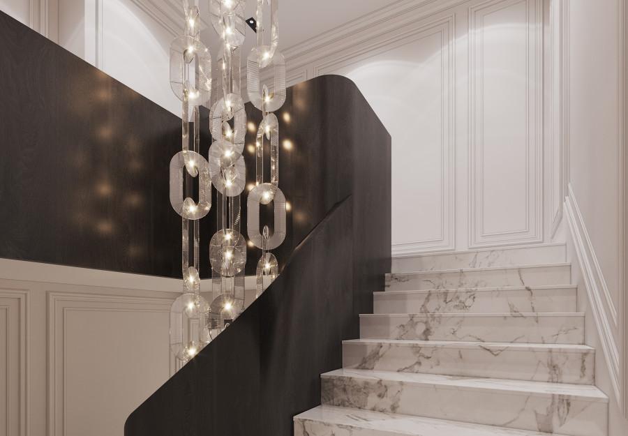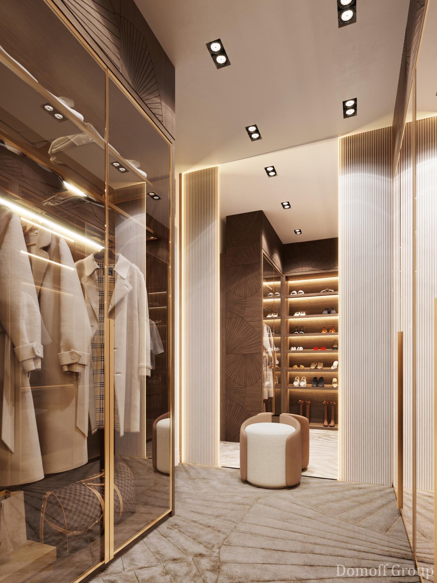 Интерьер выполнен в современном стиле с элементами минимализма и роскоши. Удачное сочетание нейтральных оттенков и металлических акцентов делает пространство элегантным и утонченным. Благородные бежевые, серые и коричневые тона, которые создают уютную атмосферу. Золотые элементы, такие как отделка мебели и декоративные детали, добавляют интерьеру тепла. Мягкая мебель бархатной обивкой и изысканные предметы освещения, подчеркивают стиль и статусность пространства.