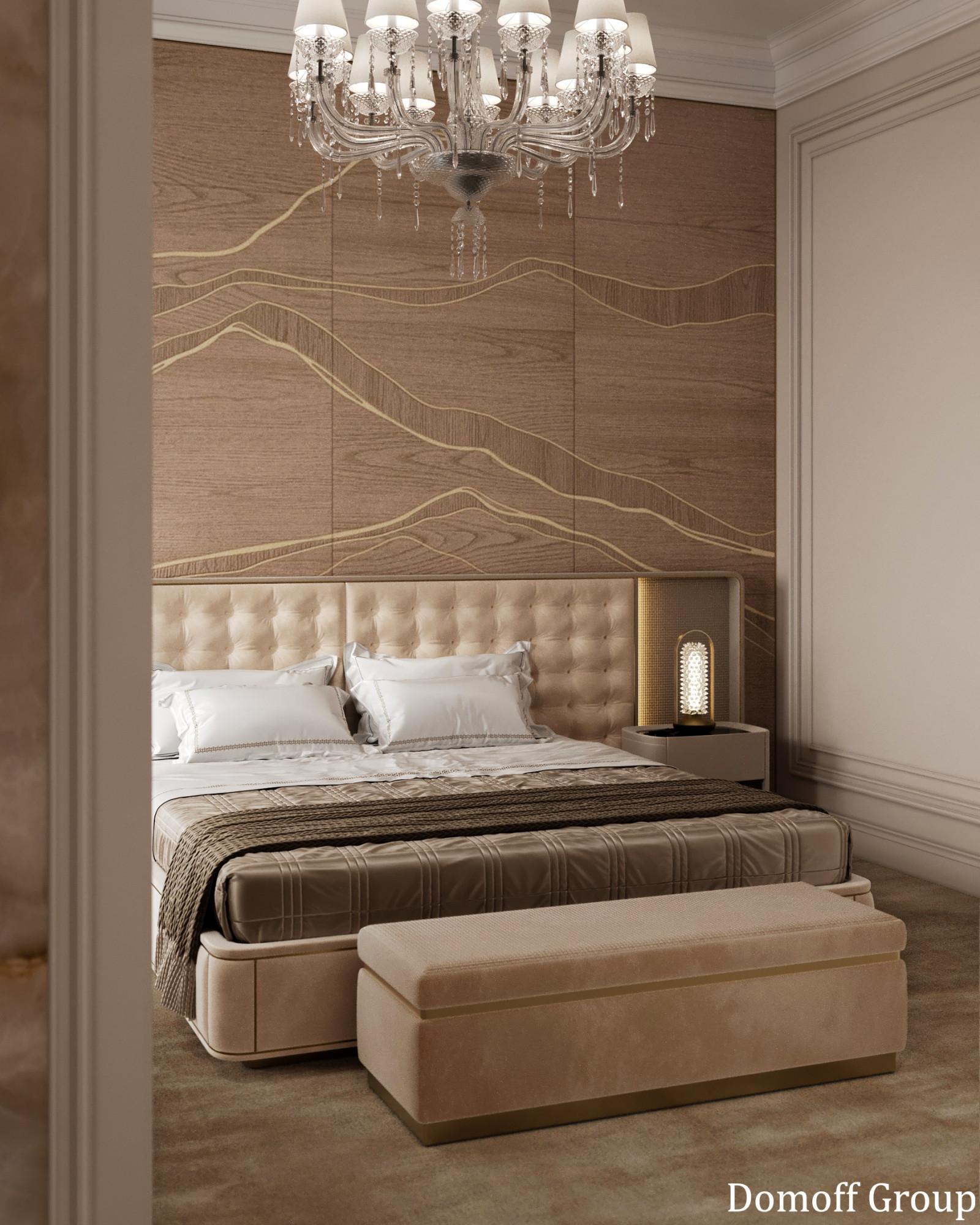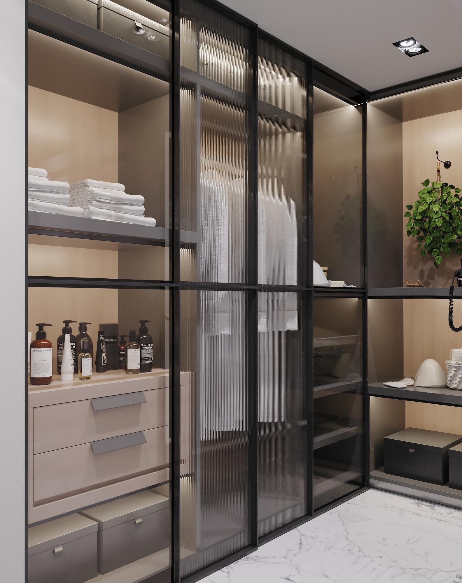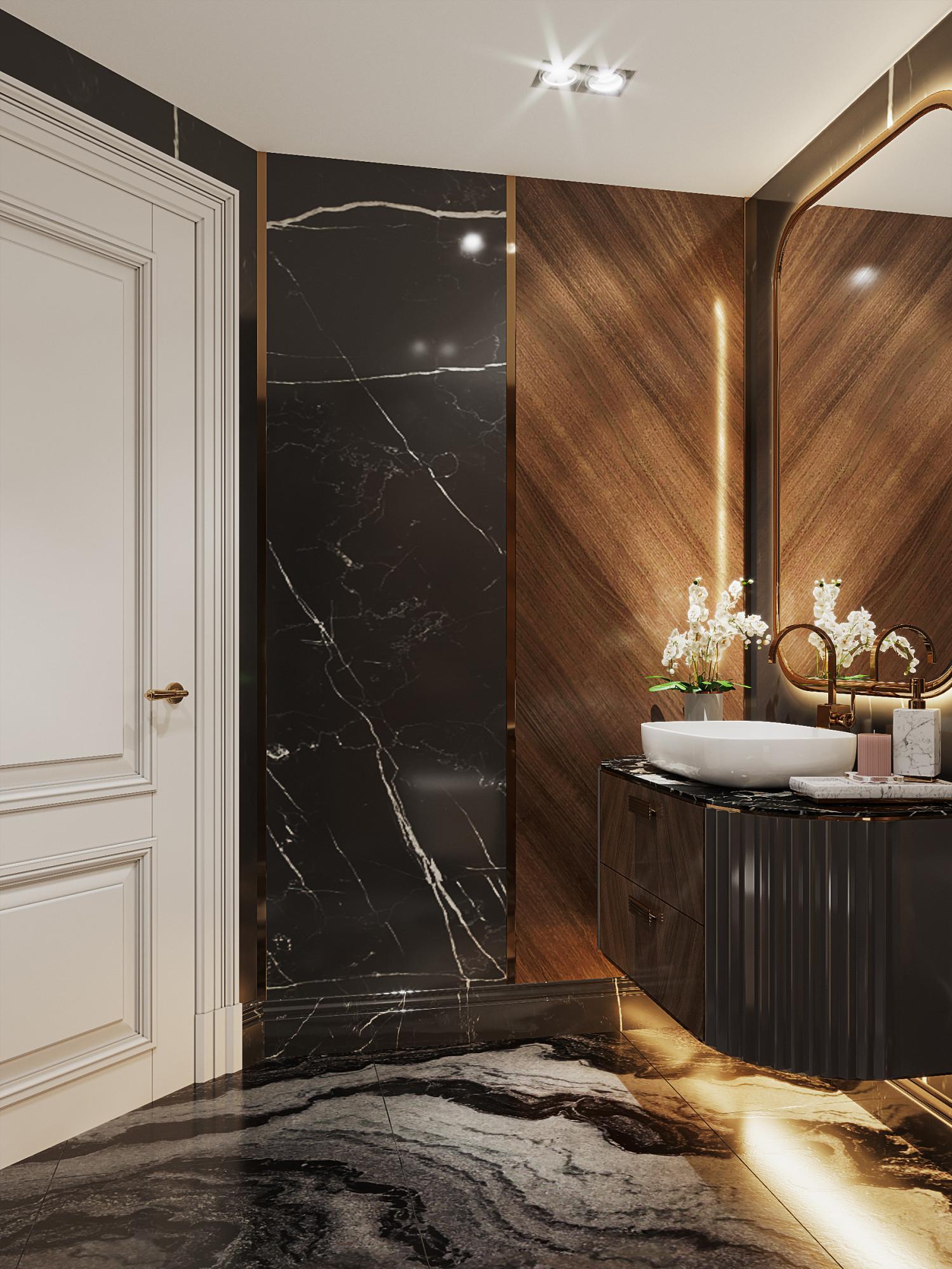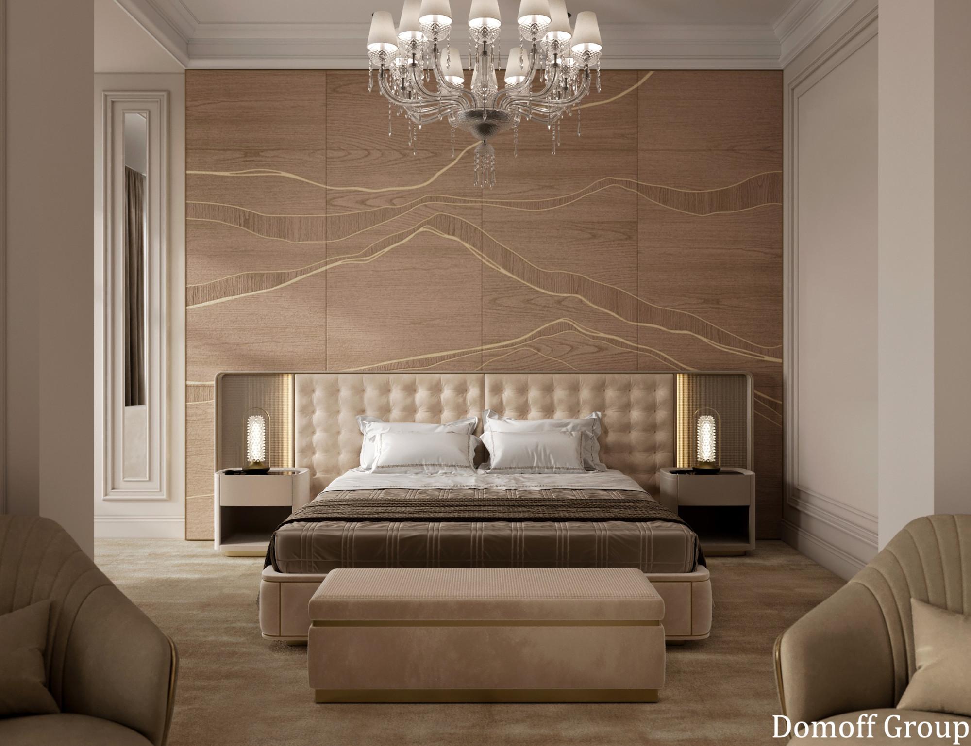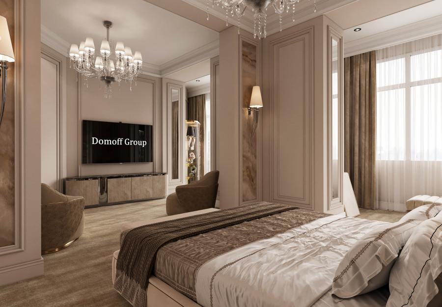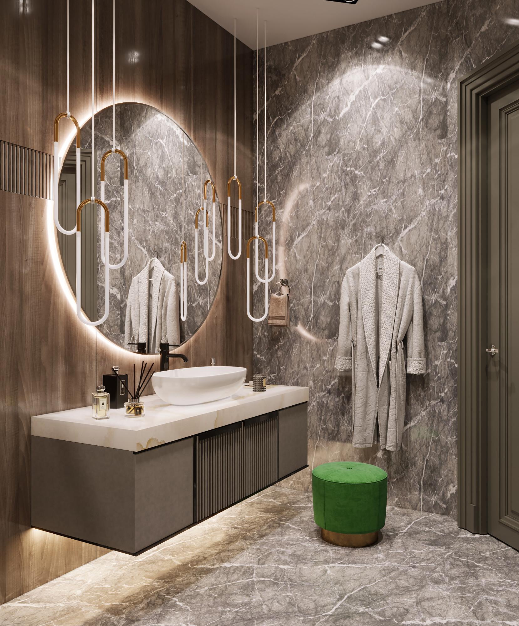 Интерьер выполнен в современном стиле с элементами минимализма и роскоши. Удачное сочетание нейтральных оттенков и металлических акцентов делает пространство элегантным и утонченным. Благородные бежевые, серые и коричневые тона, которые создают уютную атмосферу. Золотые элементы, такие как отделка мебели и декоративные детали, добавляют интерьеру тепла. Мягкая мебель бархатной обивкой и изысканные предметы освещения, подчеркивают стиль и статусность пространства.